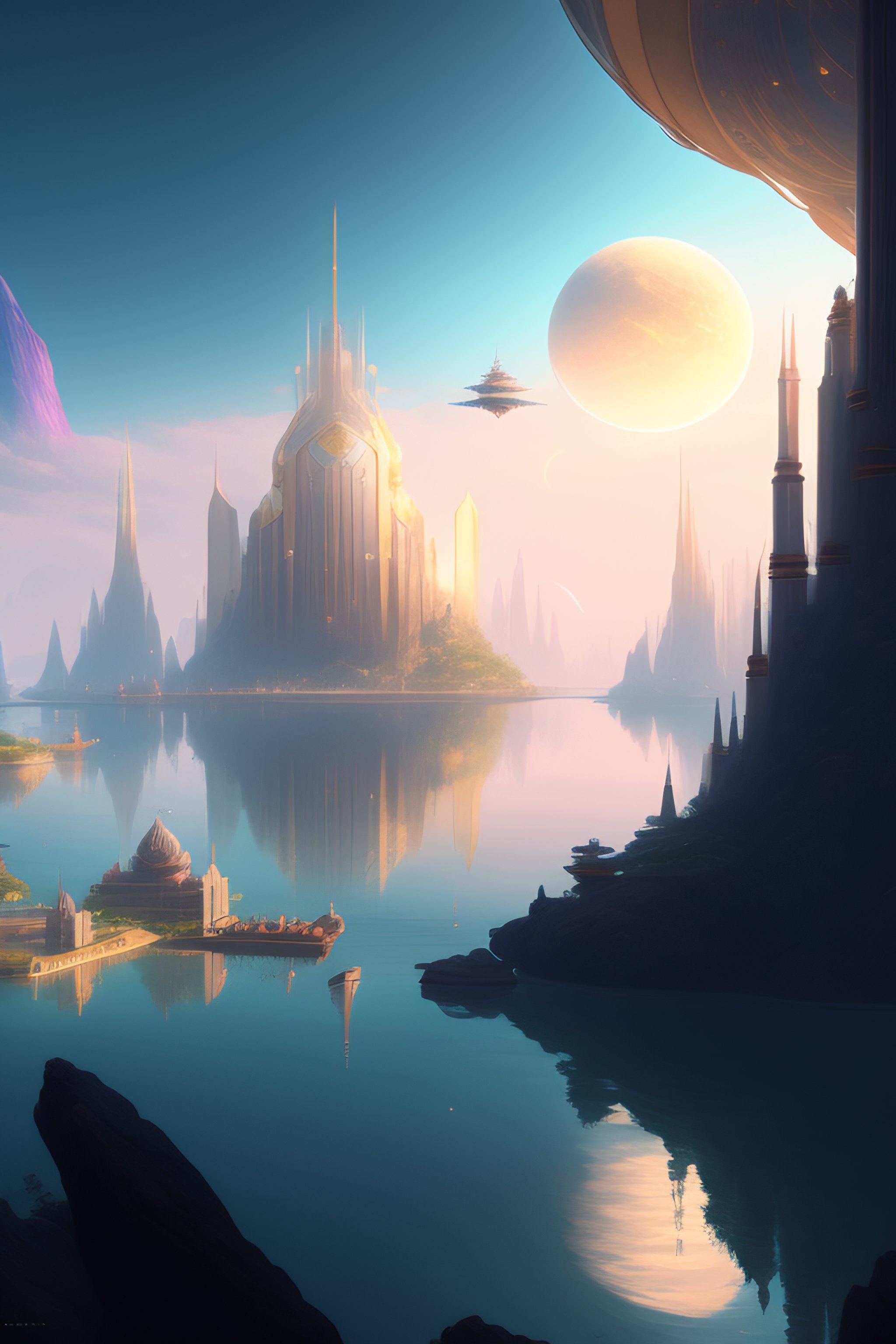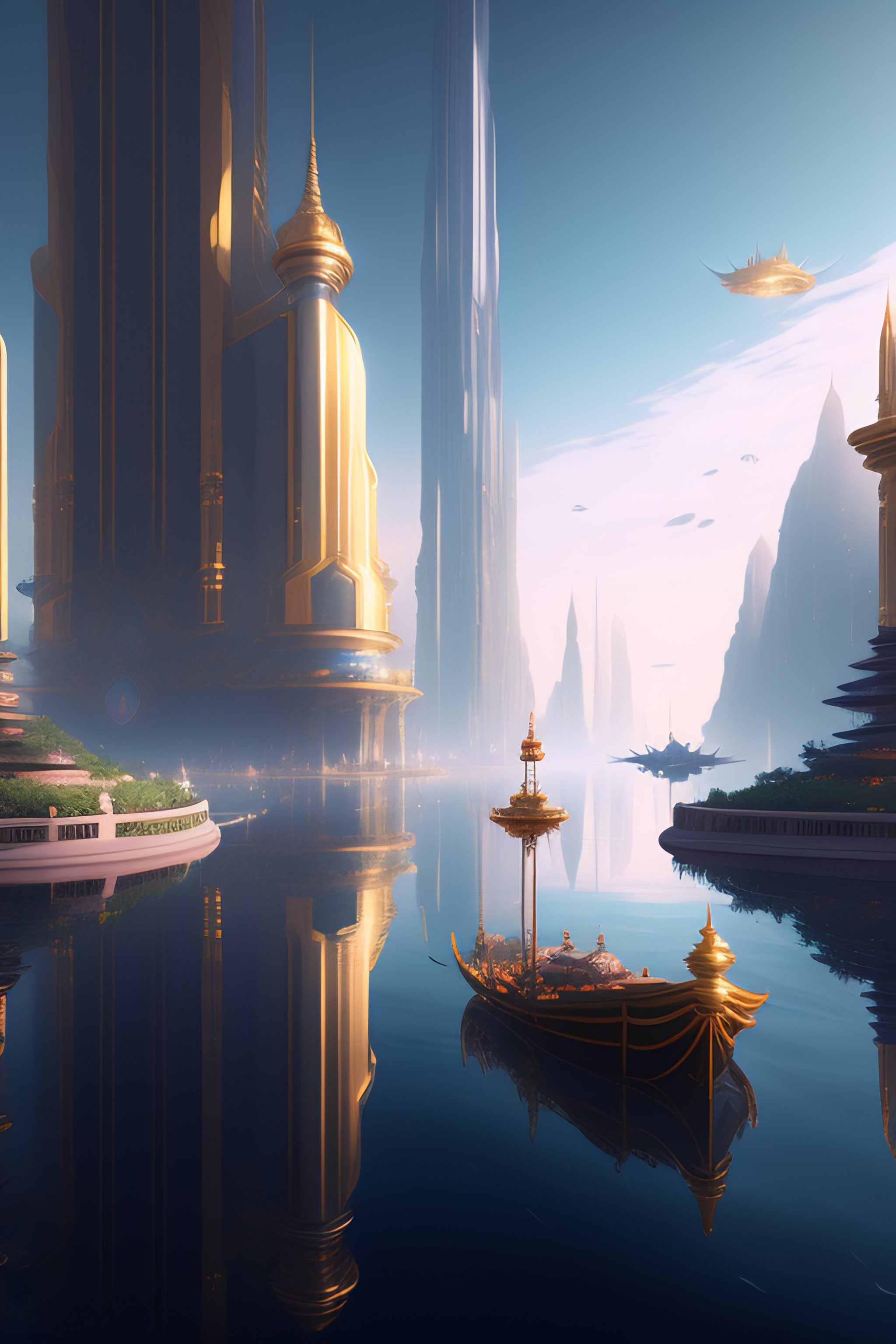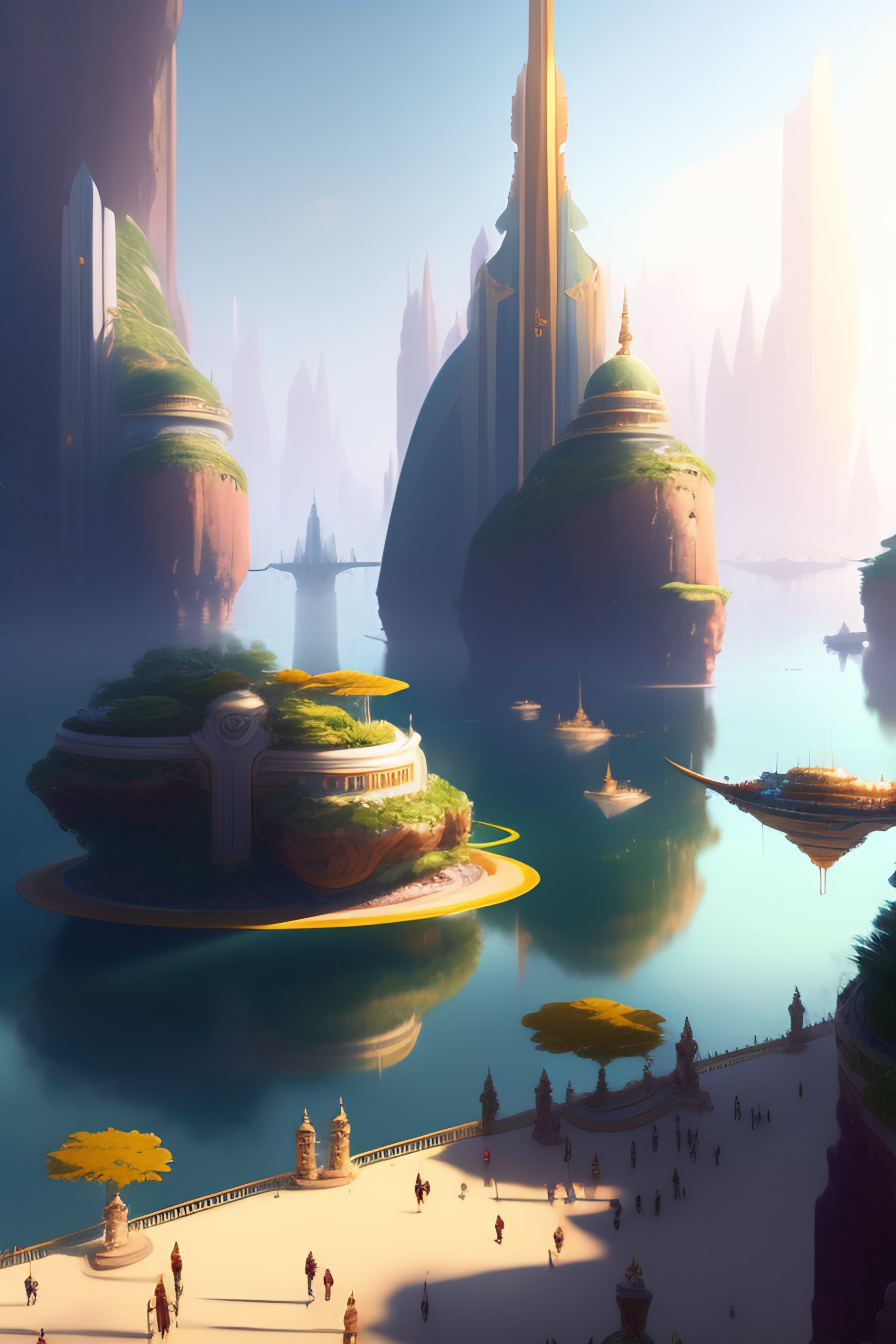 A central floating island city with many other floating islands in the distance by stanley artgerm lau, greg rutkowski, alphonse mucha, concept art, character design, trending on artstation, rey tracing, epic fantasy, 8 k, 4 k, beautiful lighting, painting, rule of thirds
