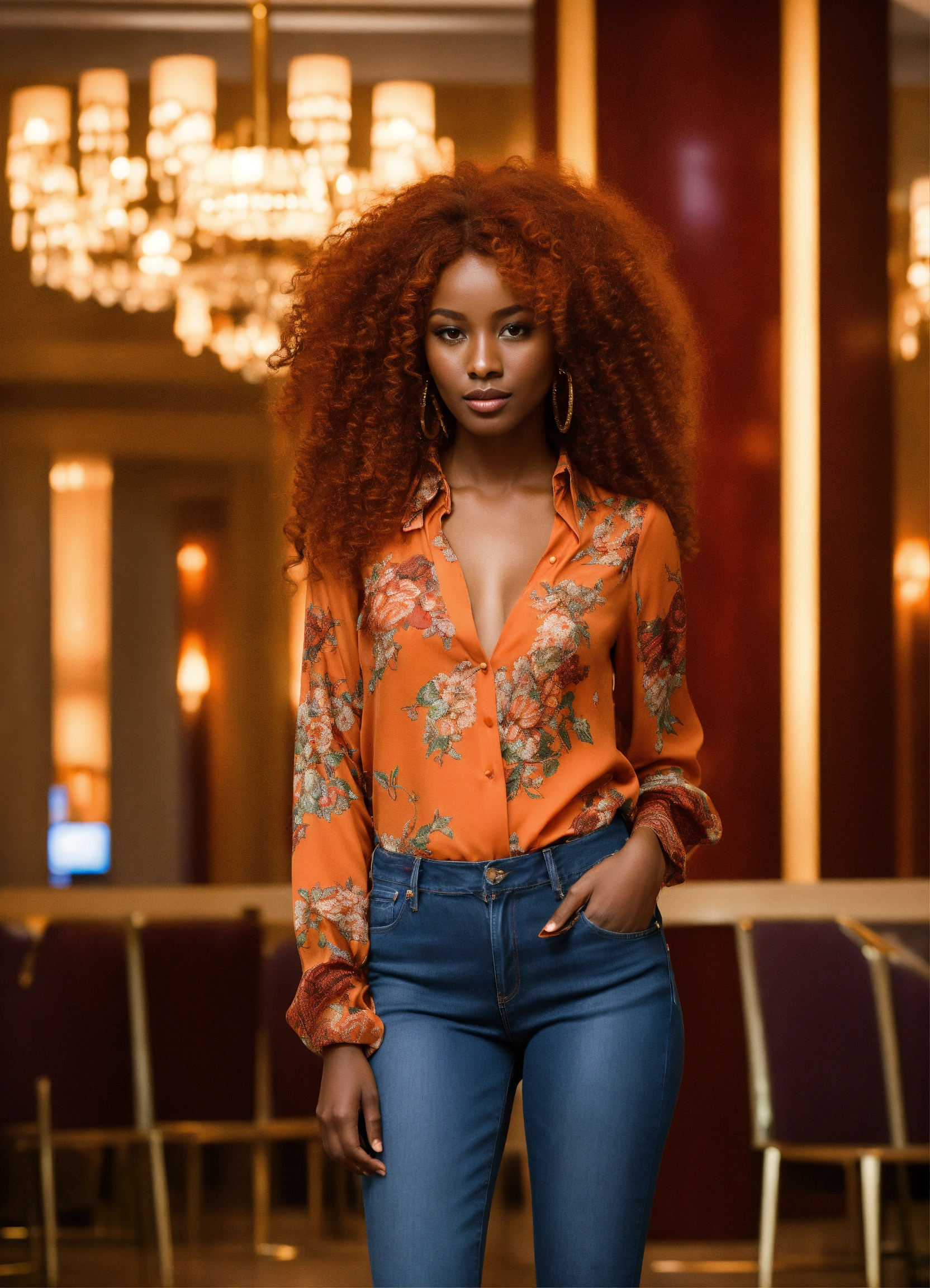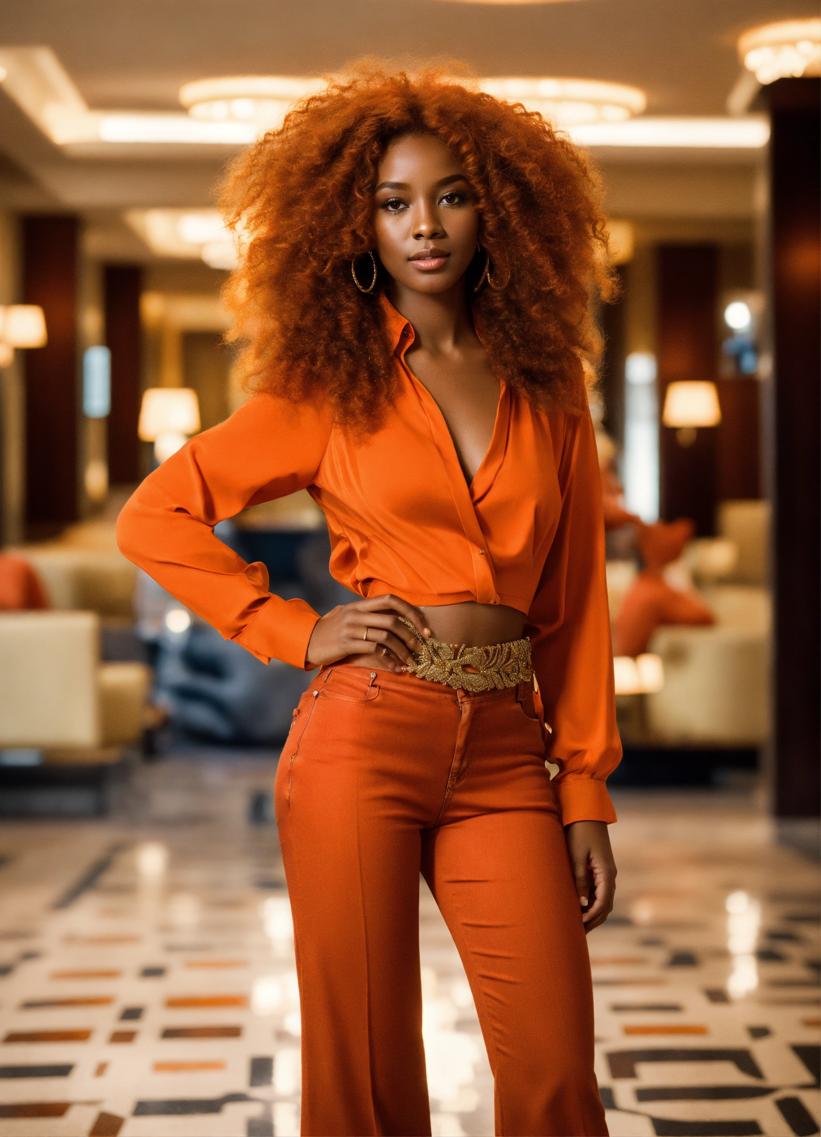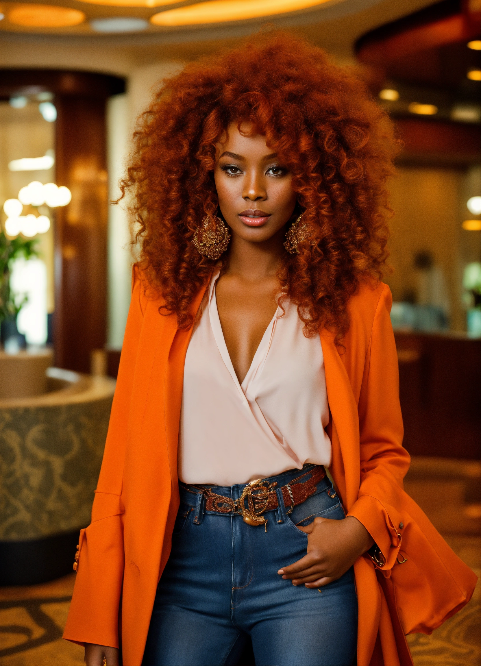 Pretty human looking alien with dark orange skin, big reddish orange curly hair, african features, medium size, dressed in haute couture blouse, jeans and heels in hotel lobby