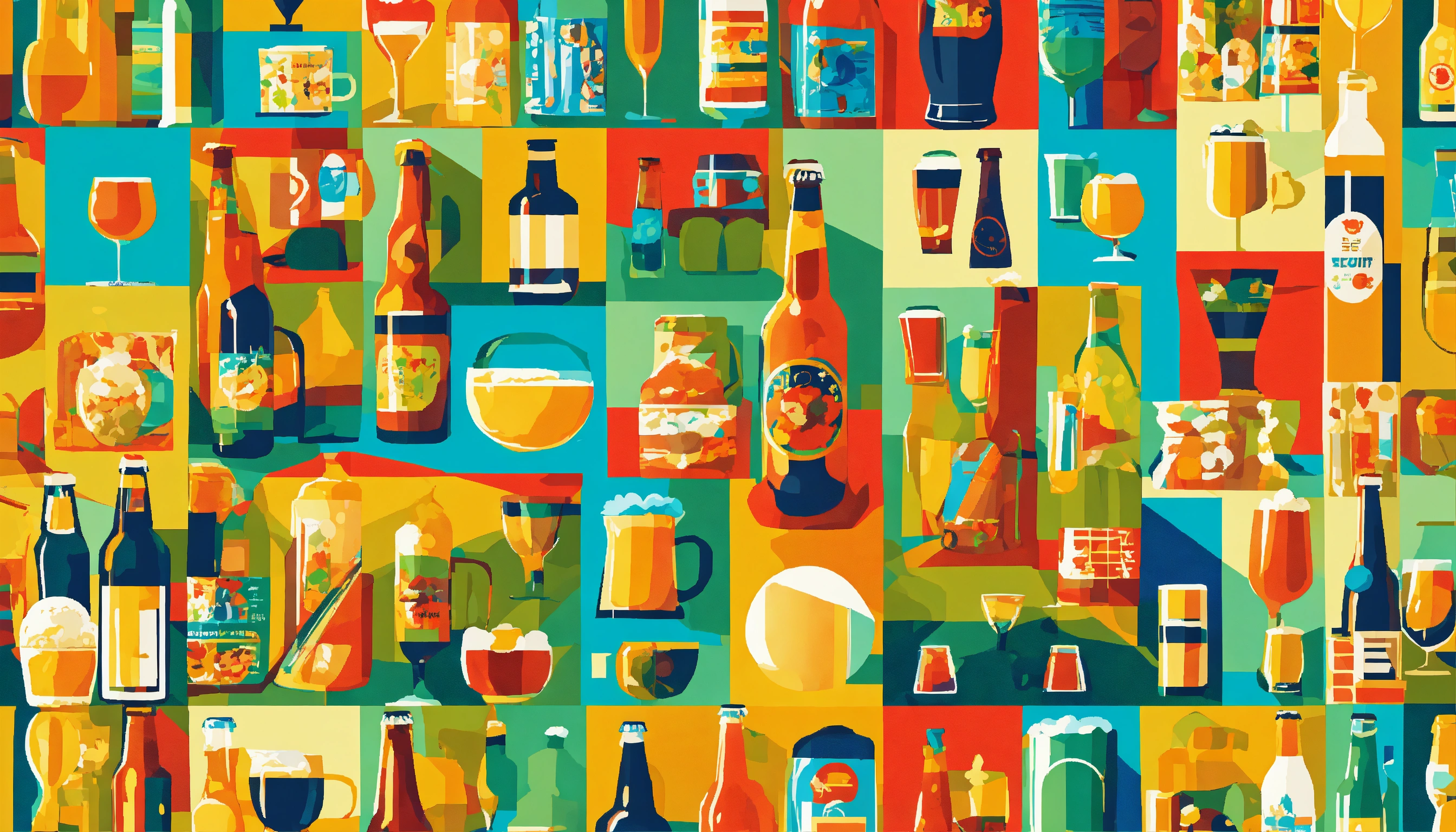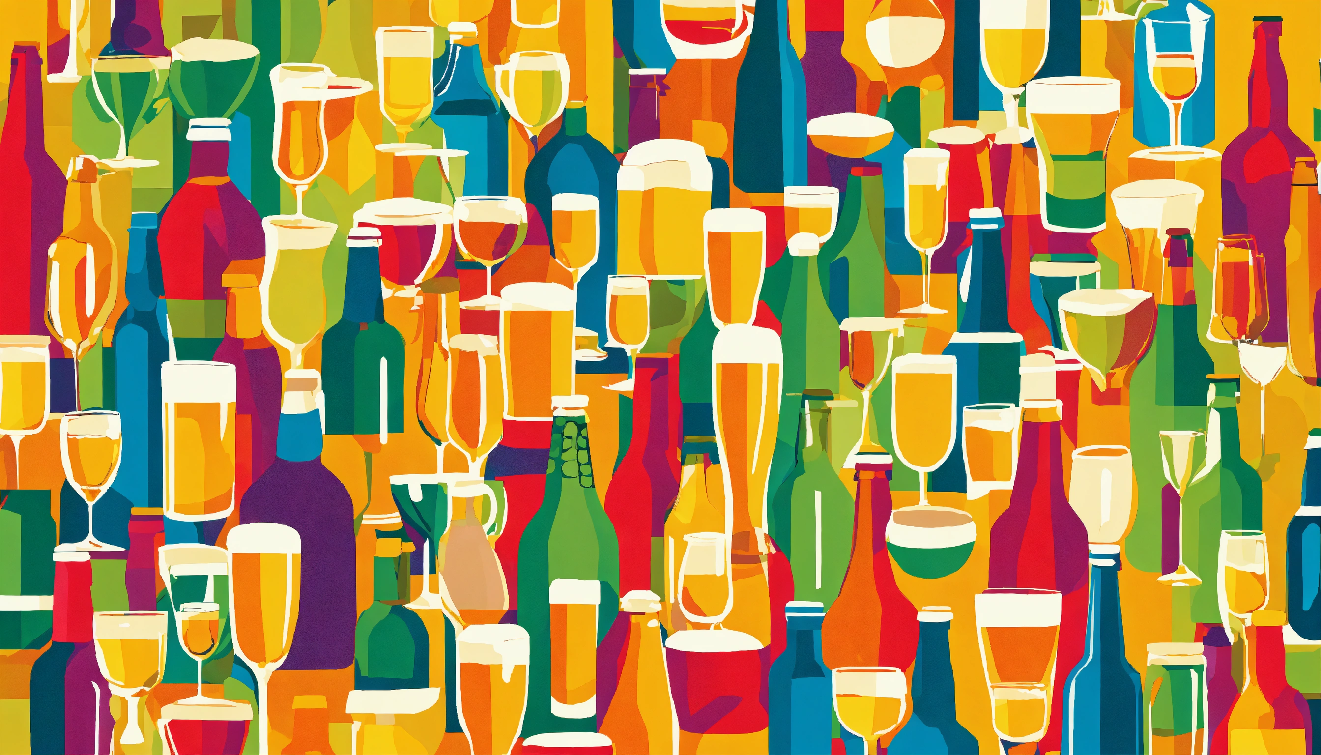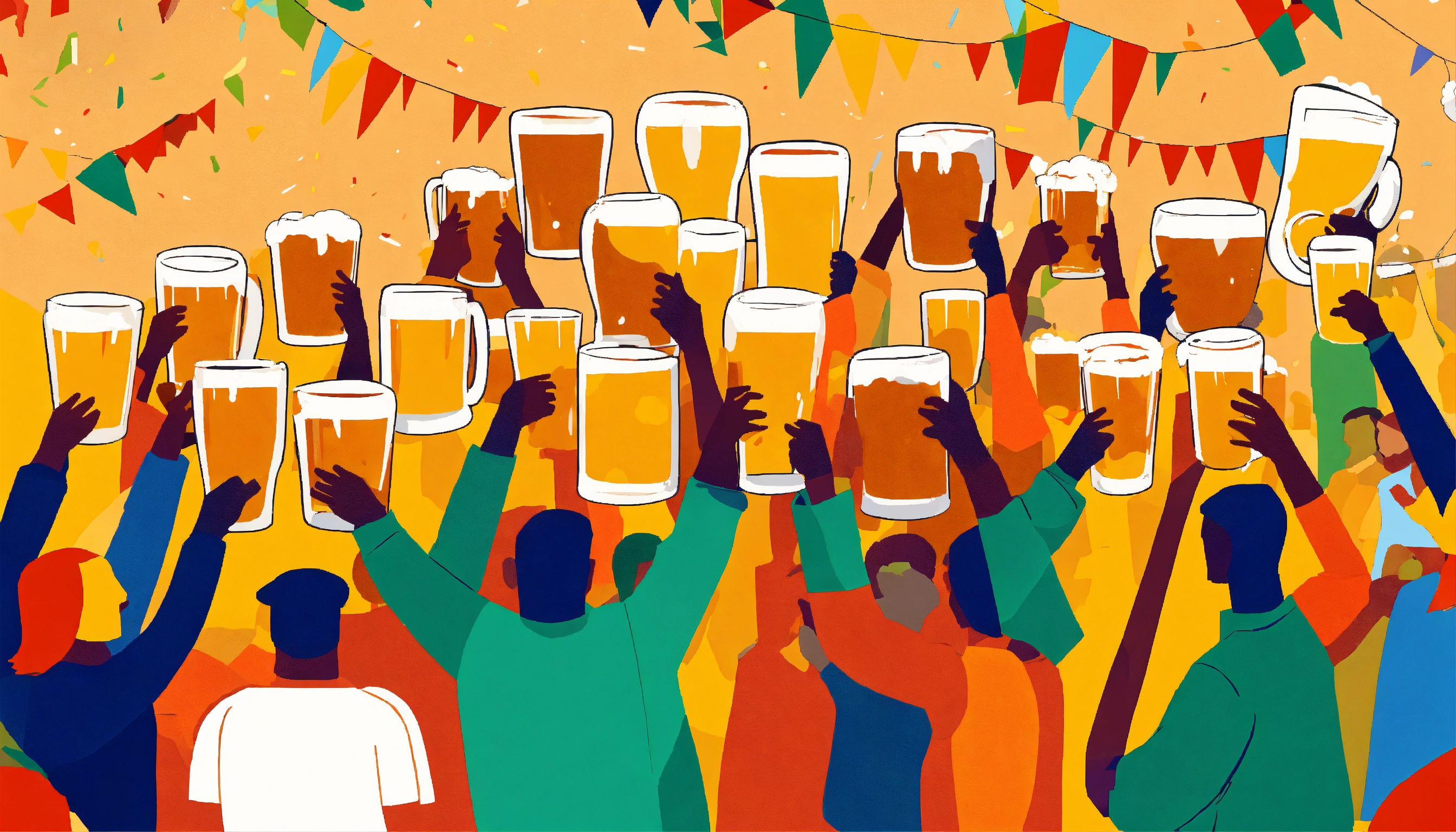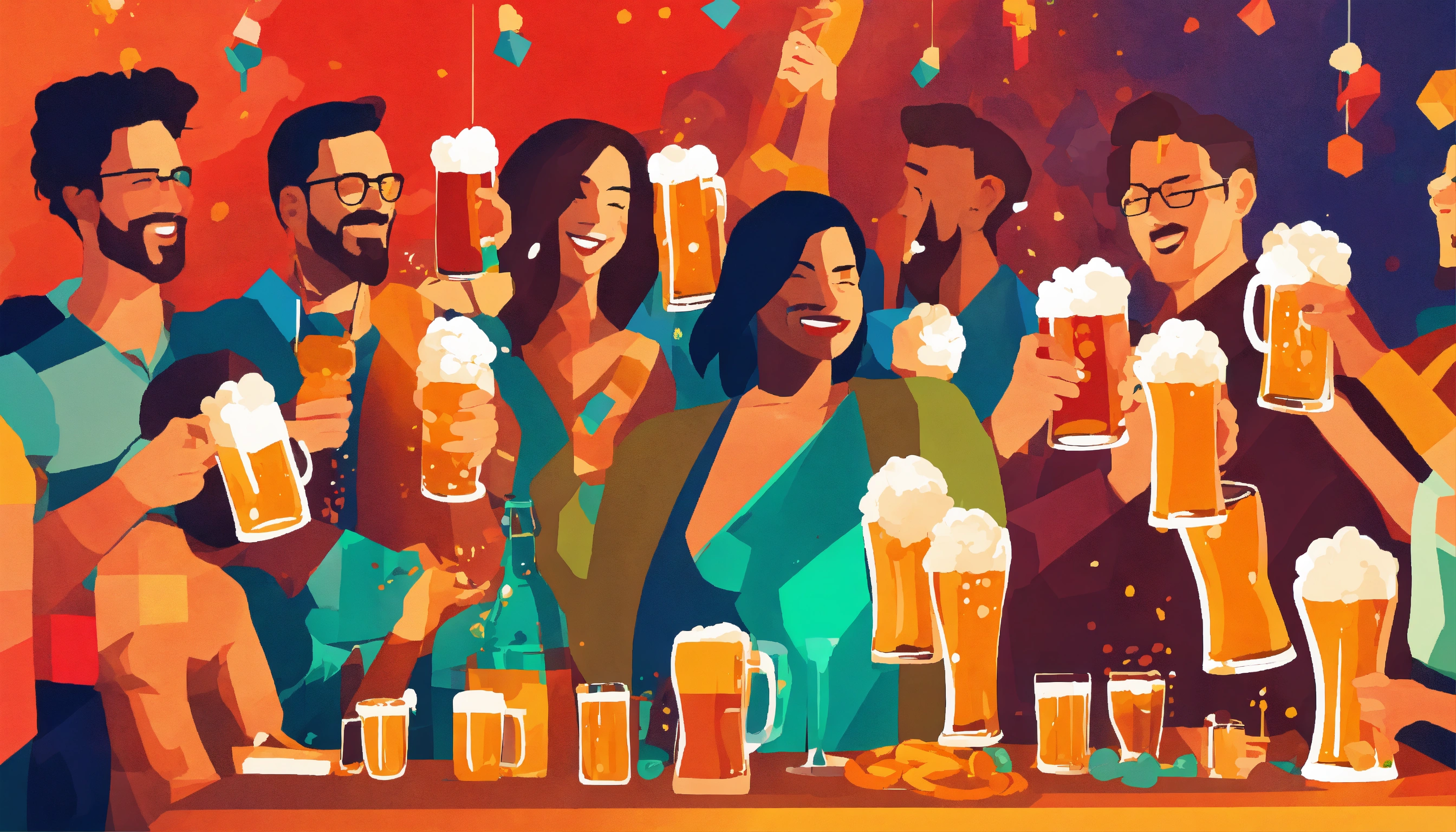 A beer party motif, flat colors, many colors, beer glasses, happy people, vector illustration, flat and clean, minimalist, geometric, pop art, many people celebrating, party, festival, beer