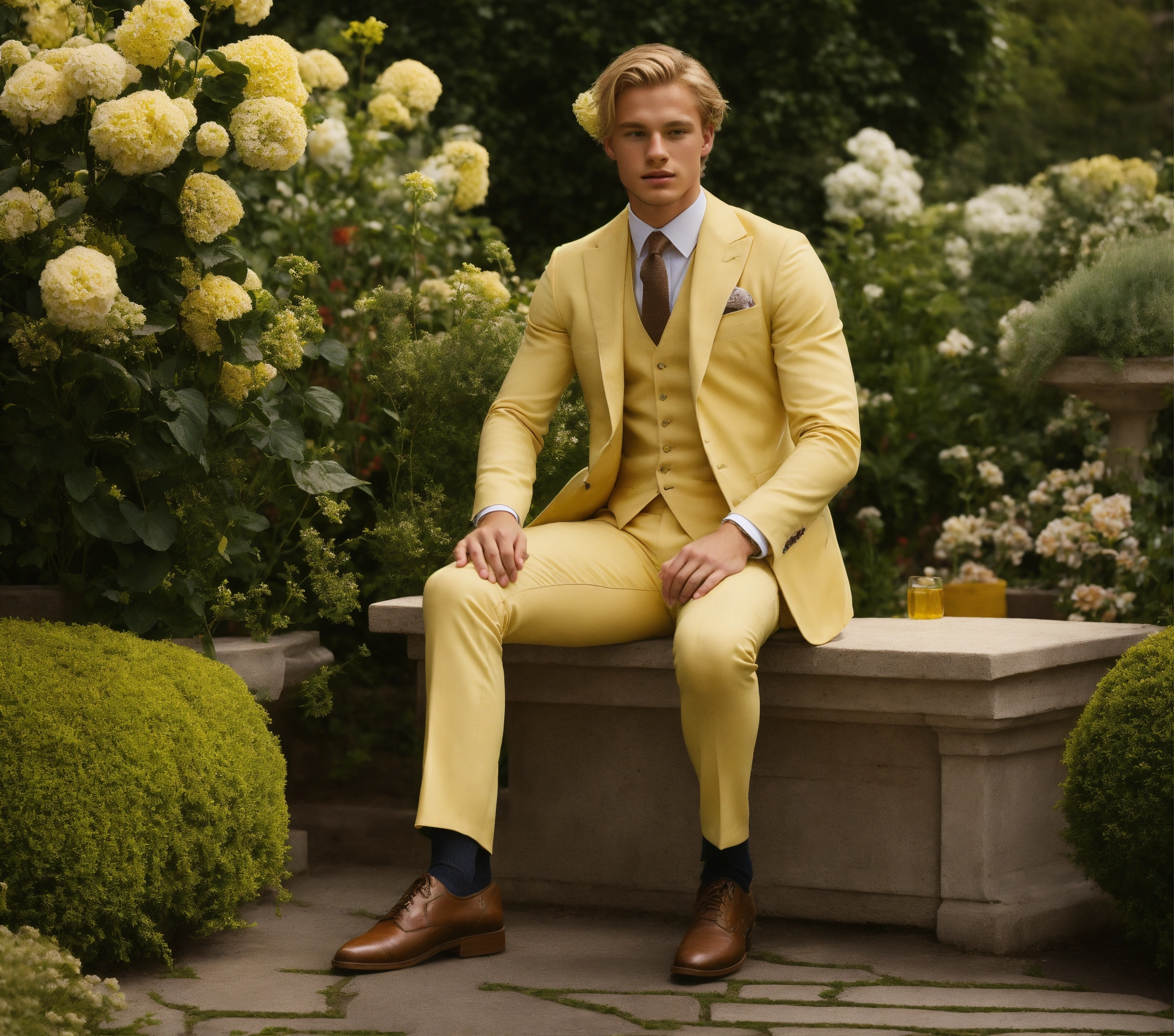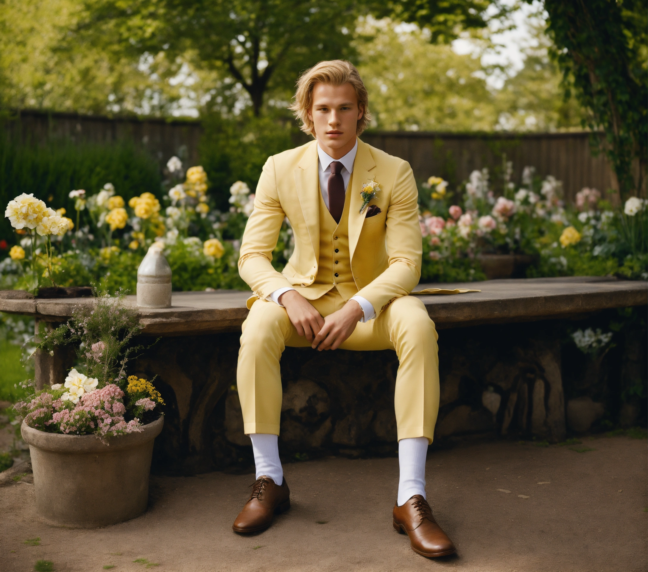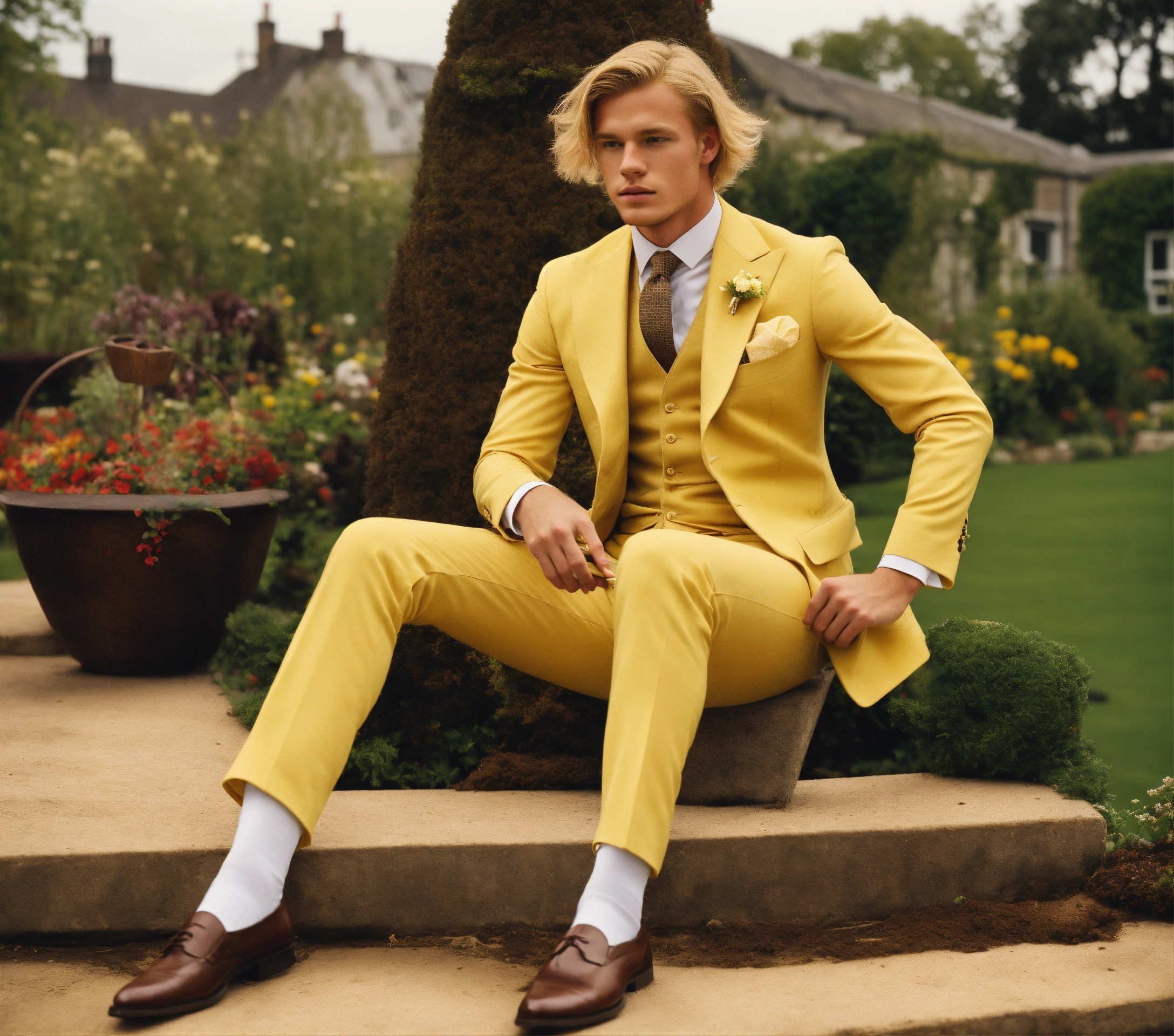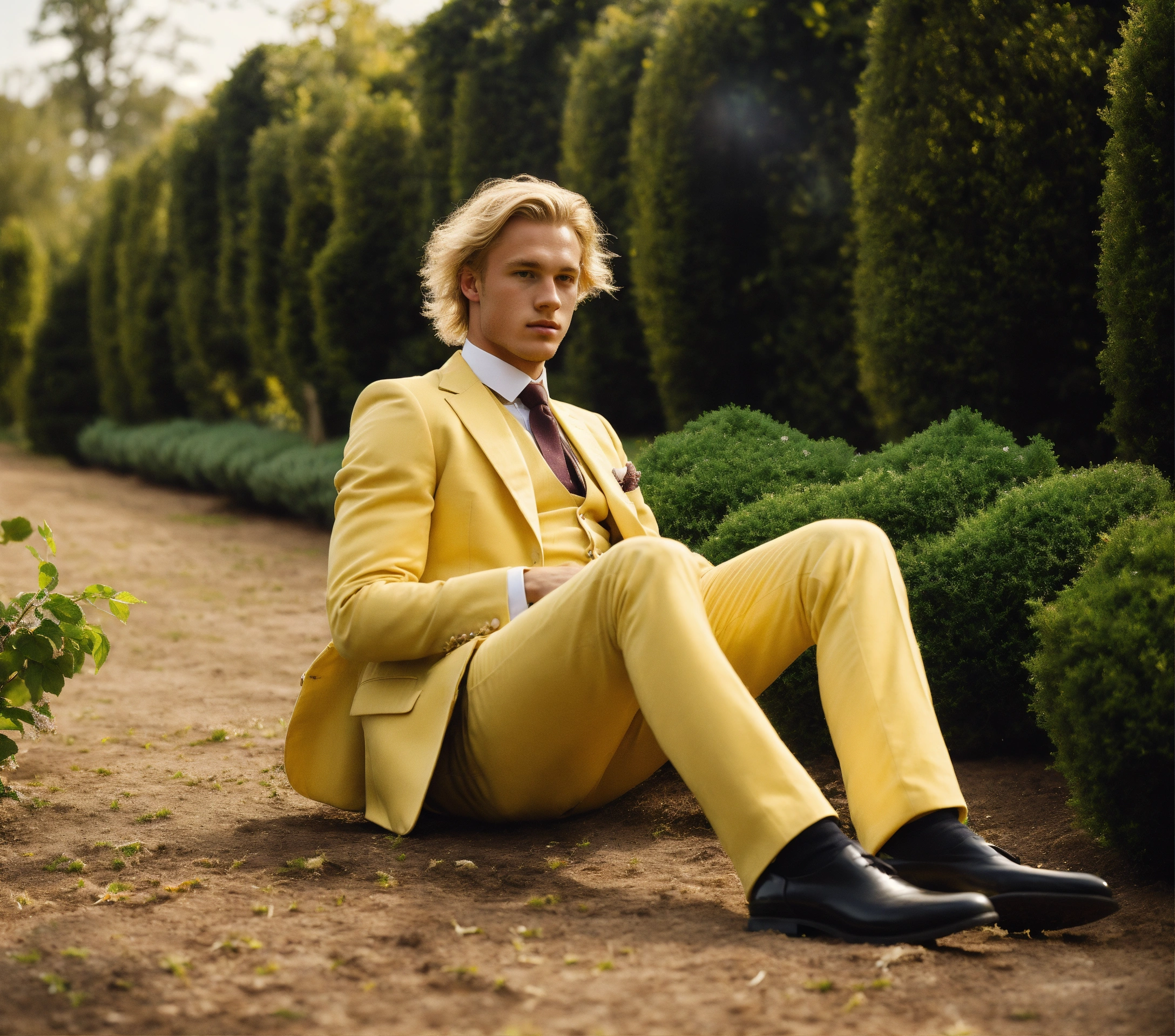 A young swedish sportsman in pale yellow vested suit, brown tie, blonde brushed hair, seating on a milestone in a garden, stretched legs