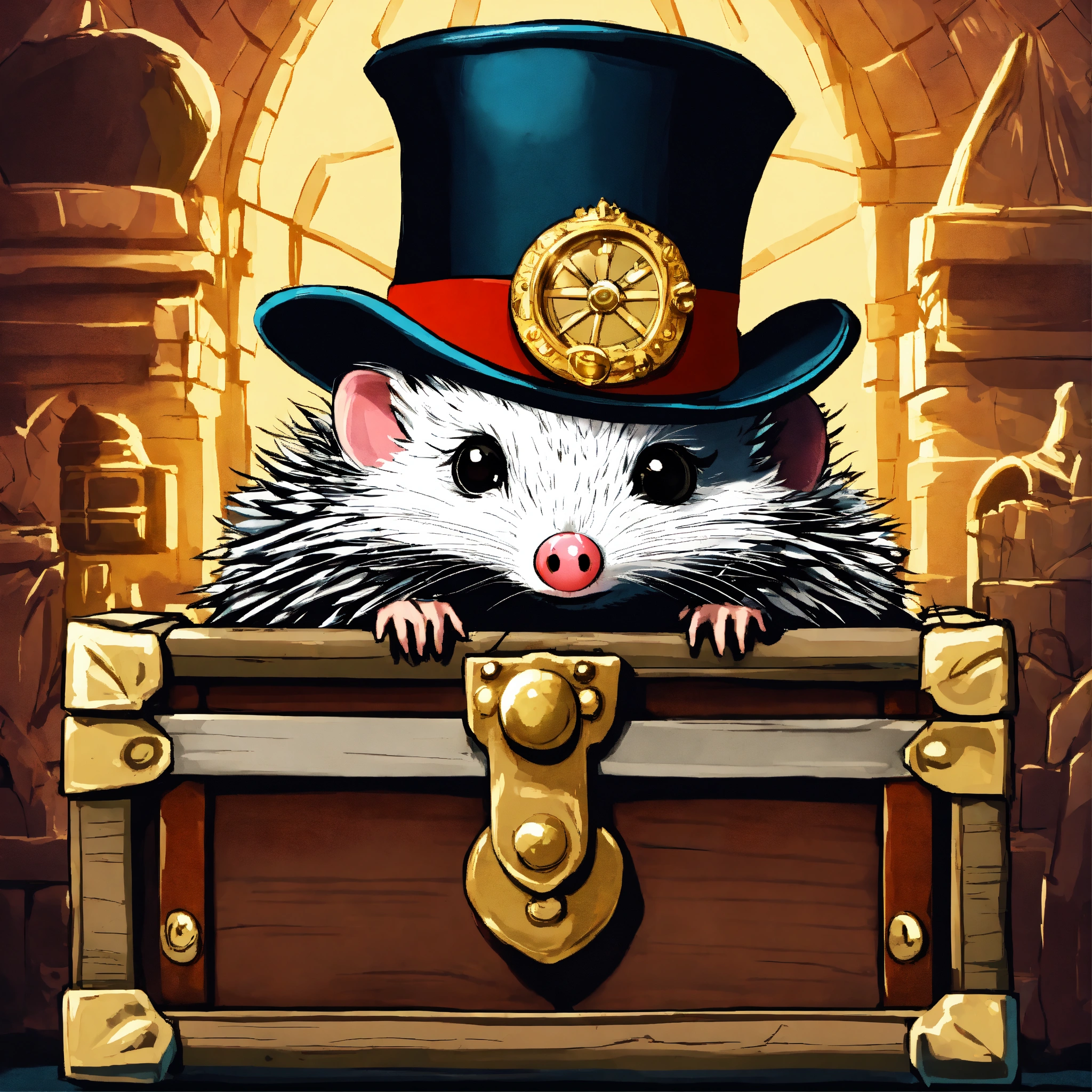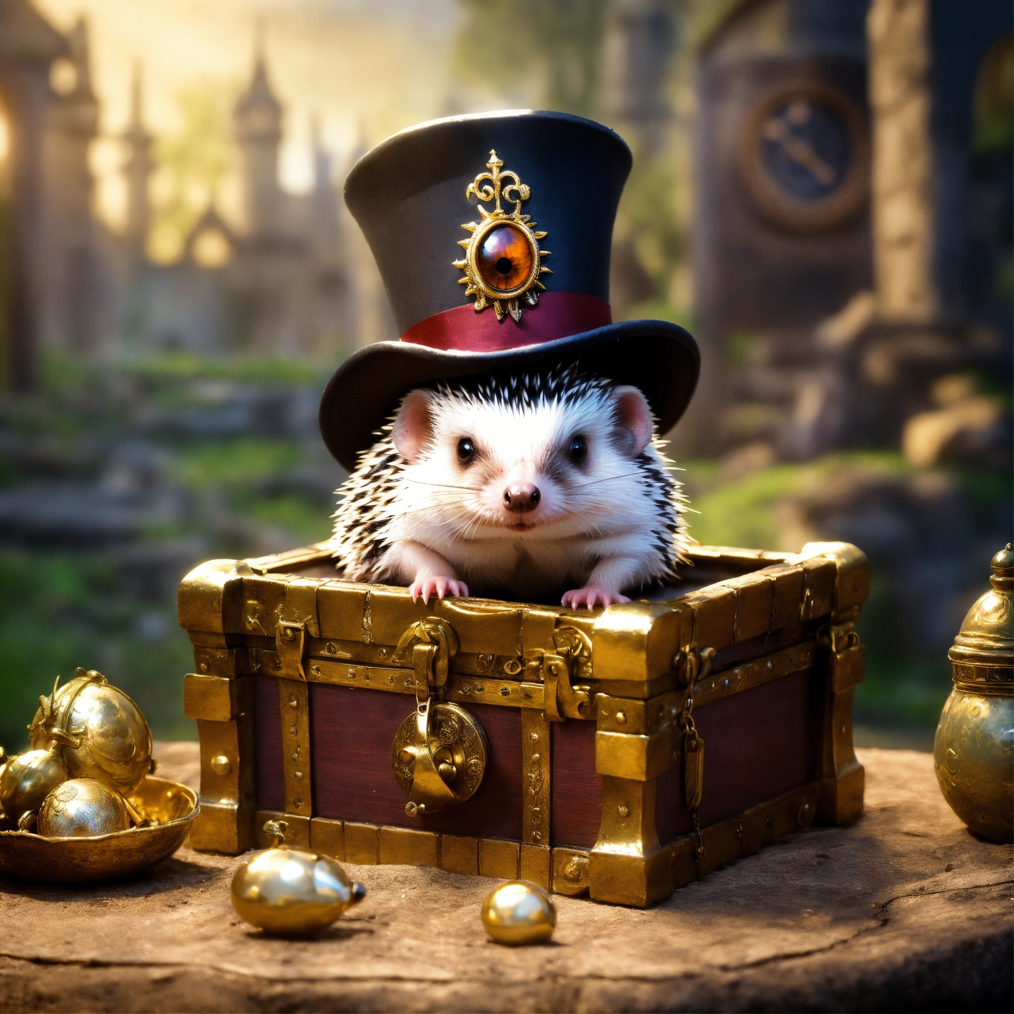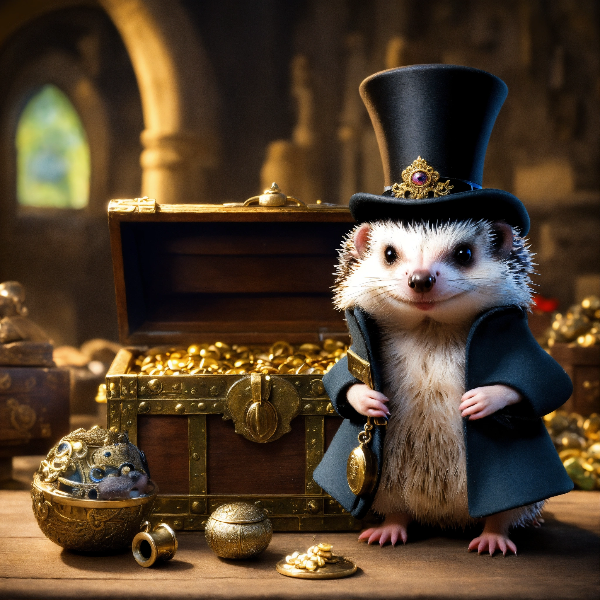 Pygmy hedgehog monster eye monocle who is wearing a top hat while guarding a medieval treasure chest