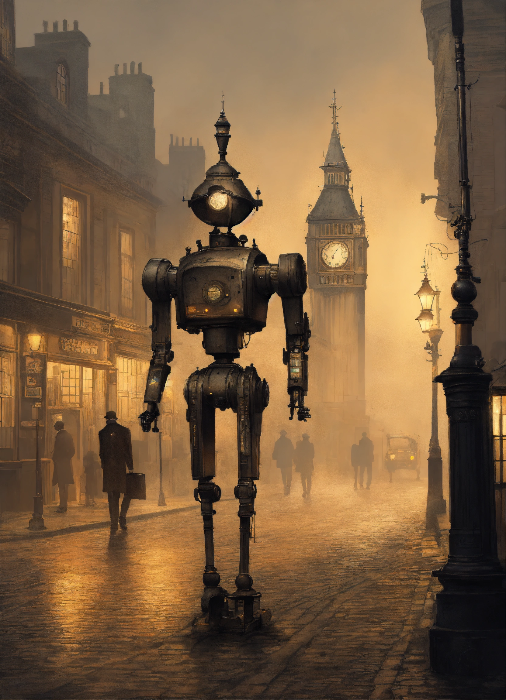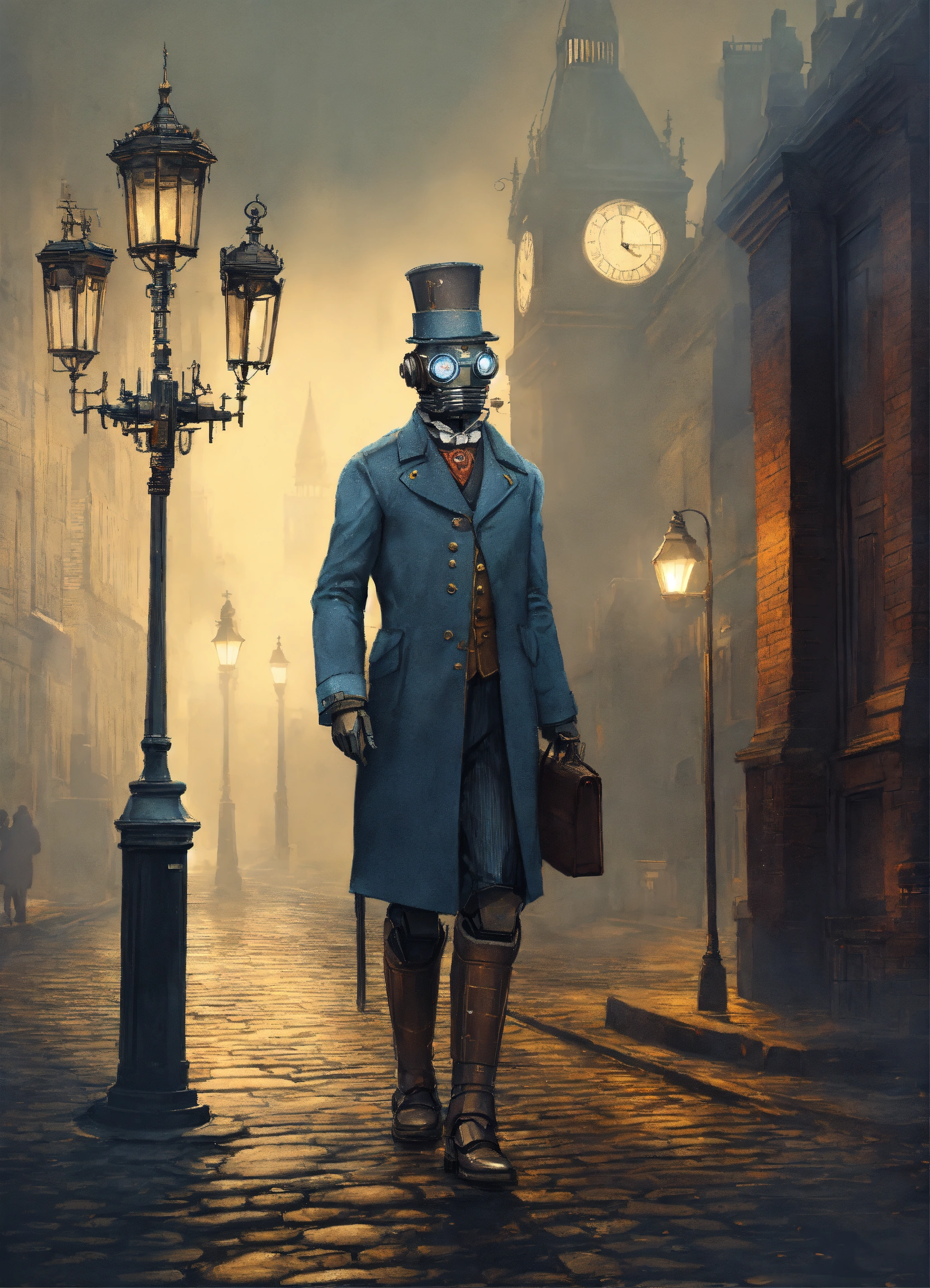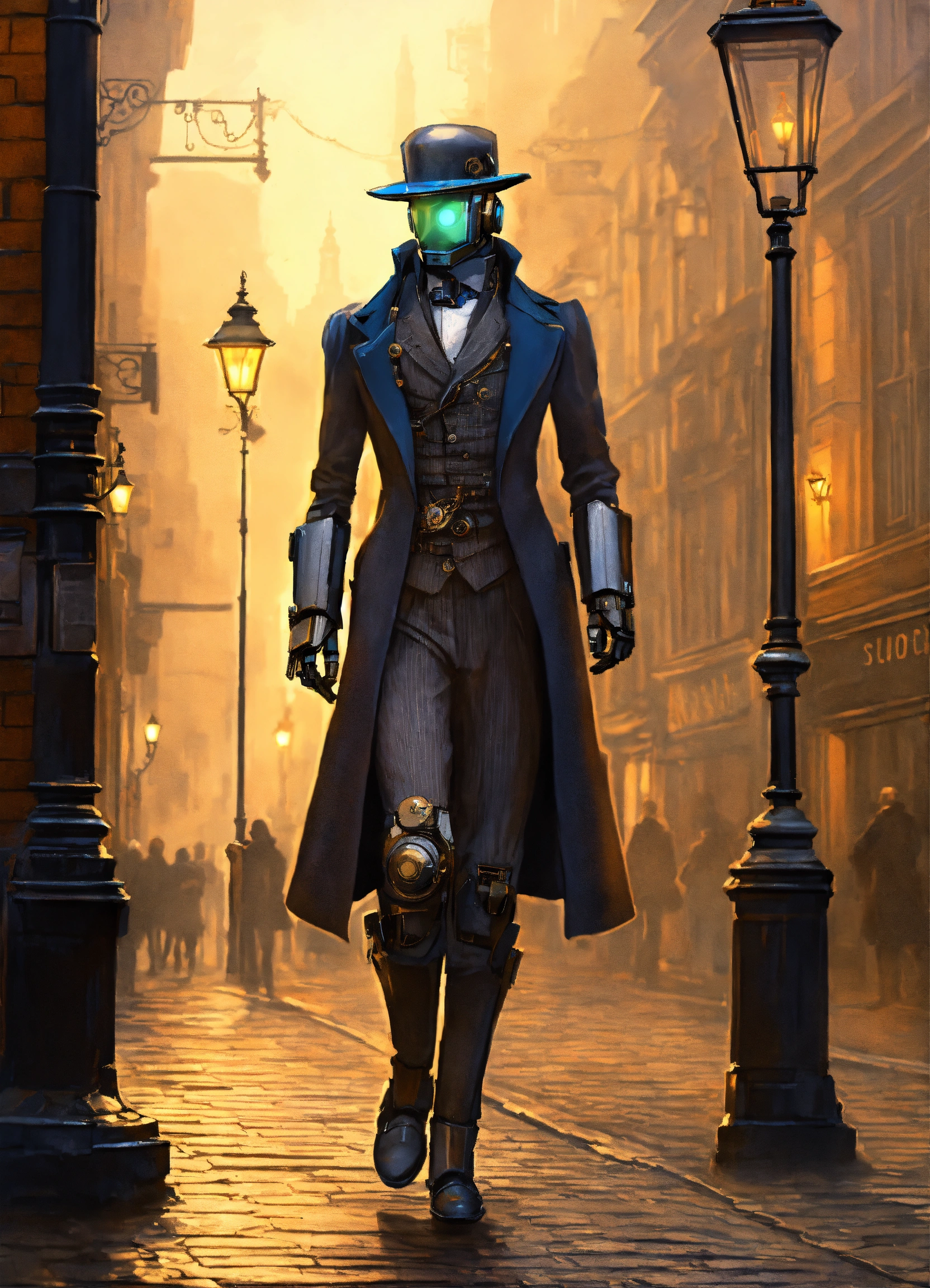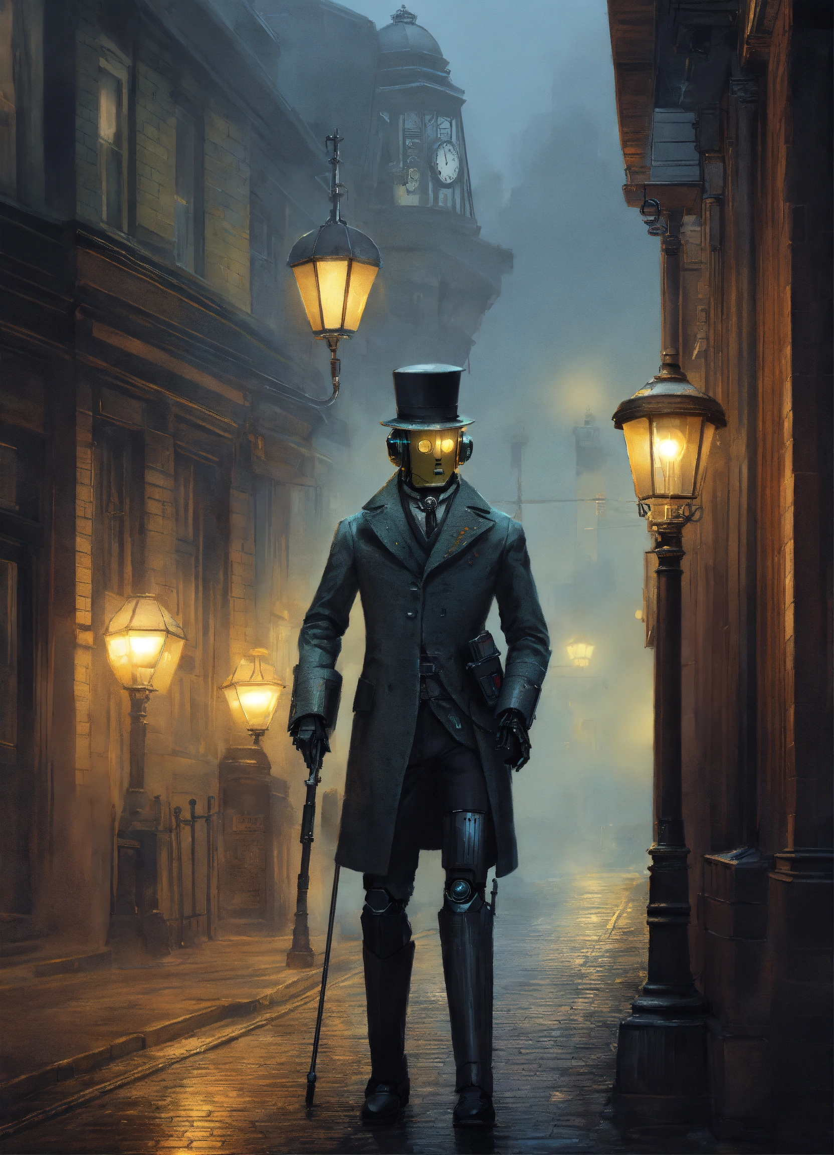 Victorian futuristic robot android detective, robotic suite, foggy futuristic london streets, gas lamps, cobblestones, detailed pencil sketch