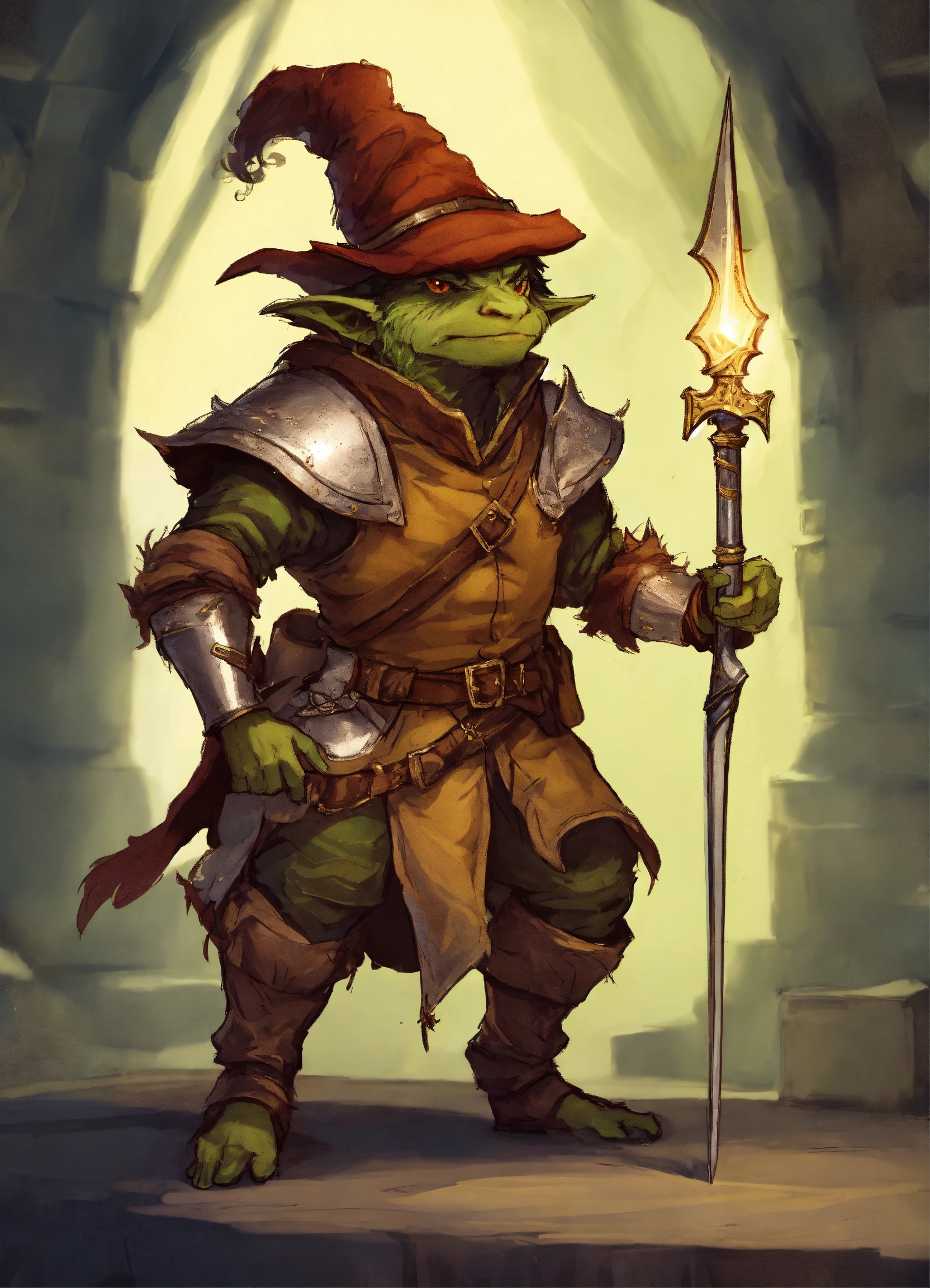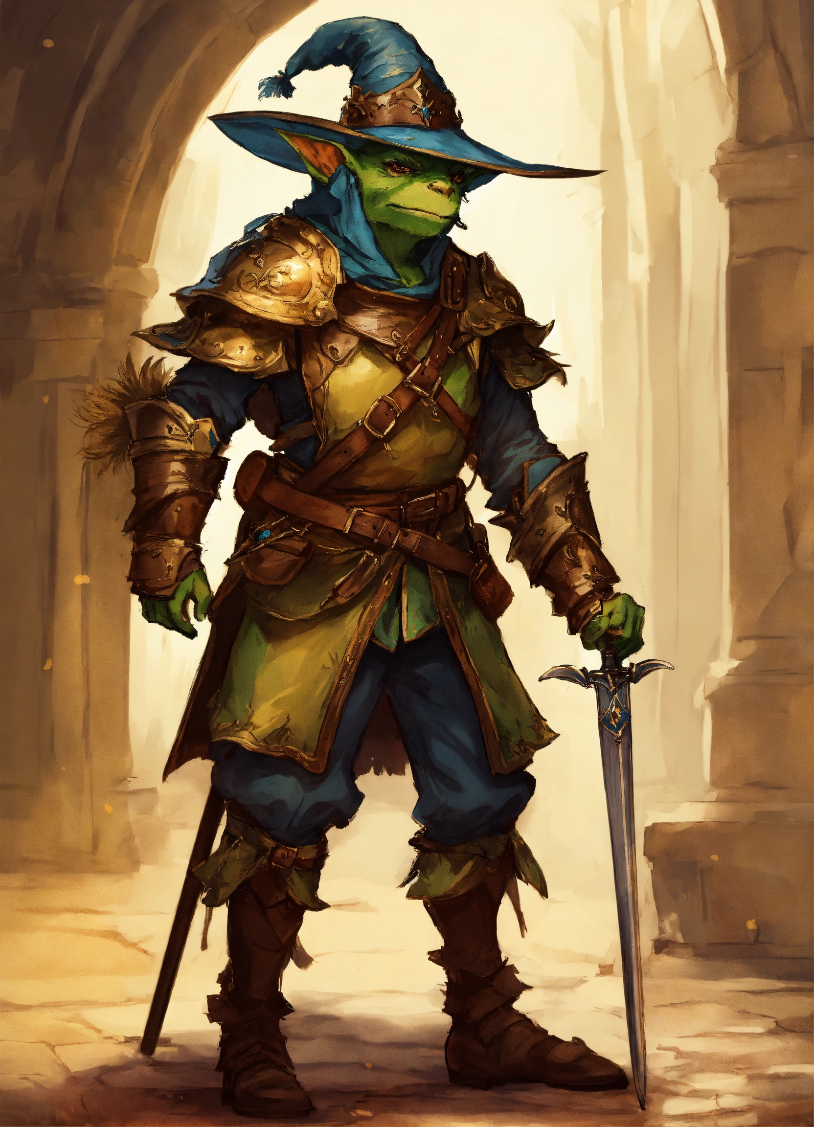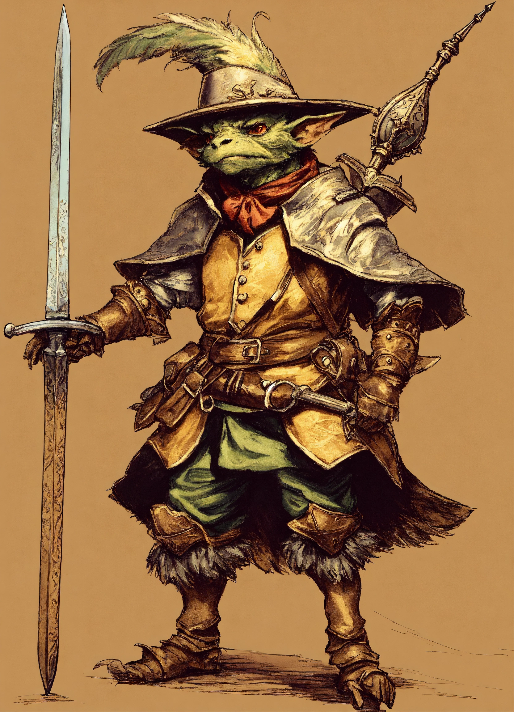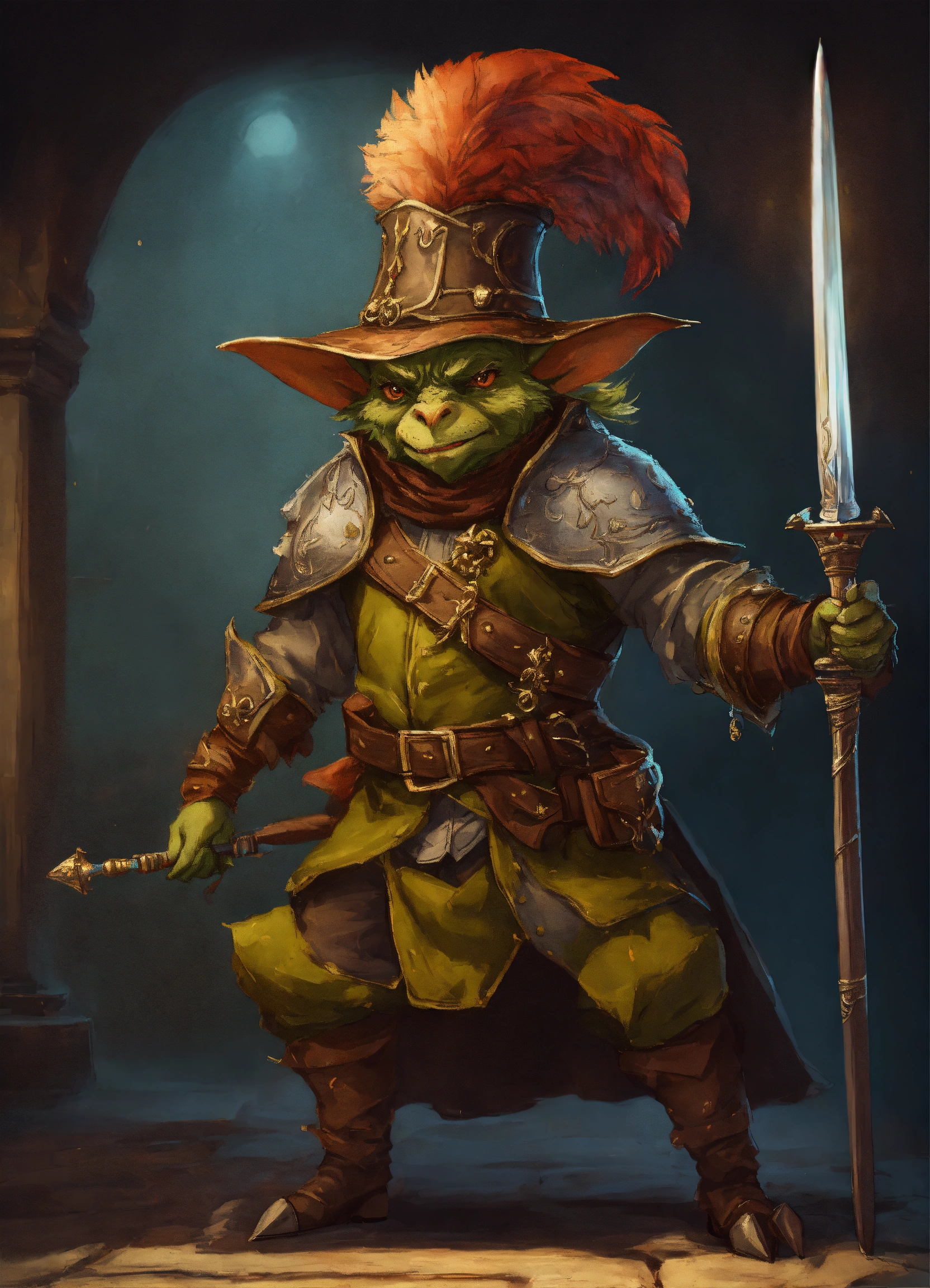Drawing of a fantasy goblin dressed fancy medieval royalty clothes wearing a rakish feathered hat and holding a rapier in a defensive stance
