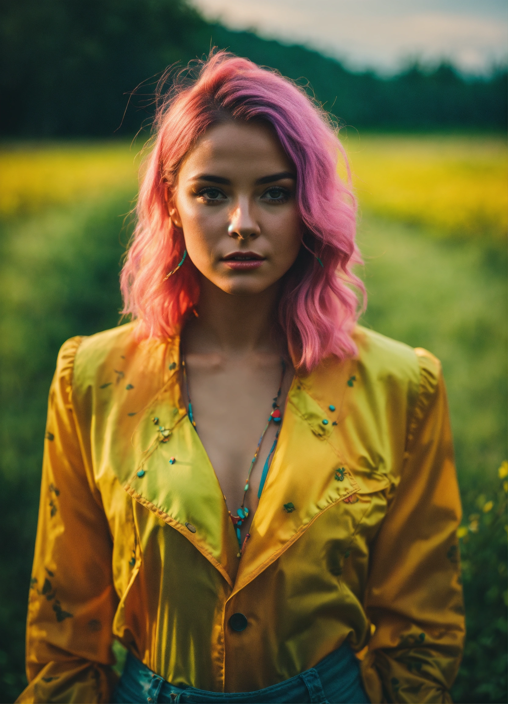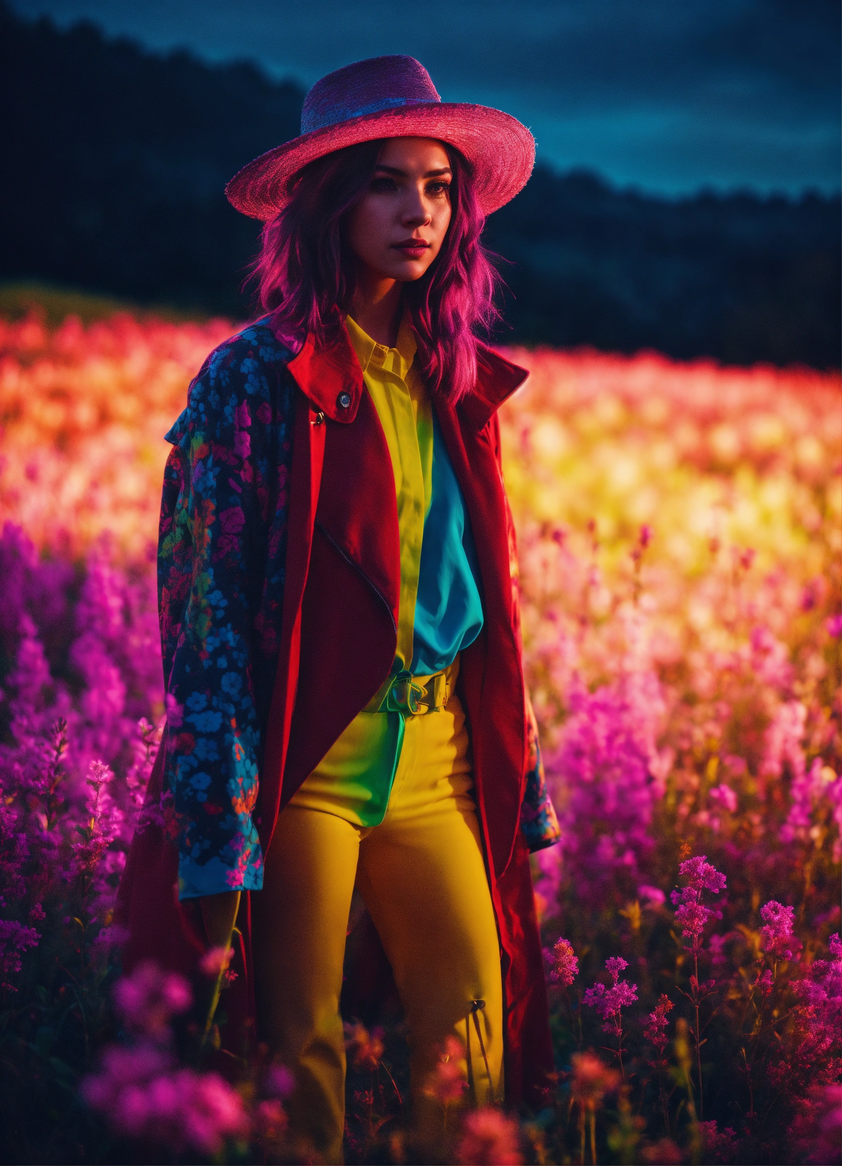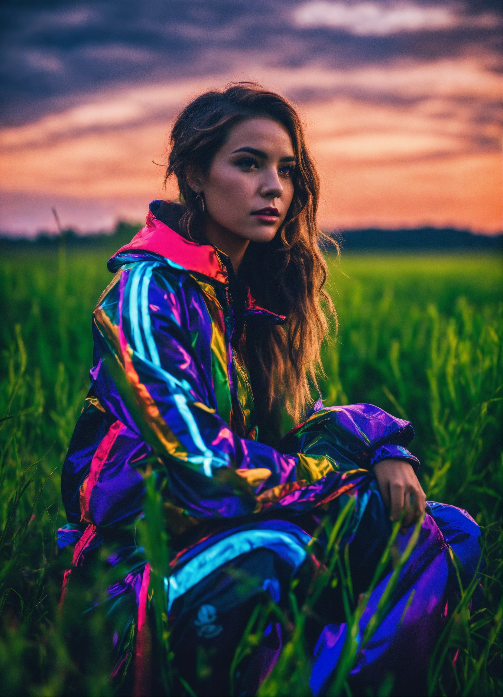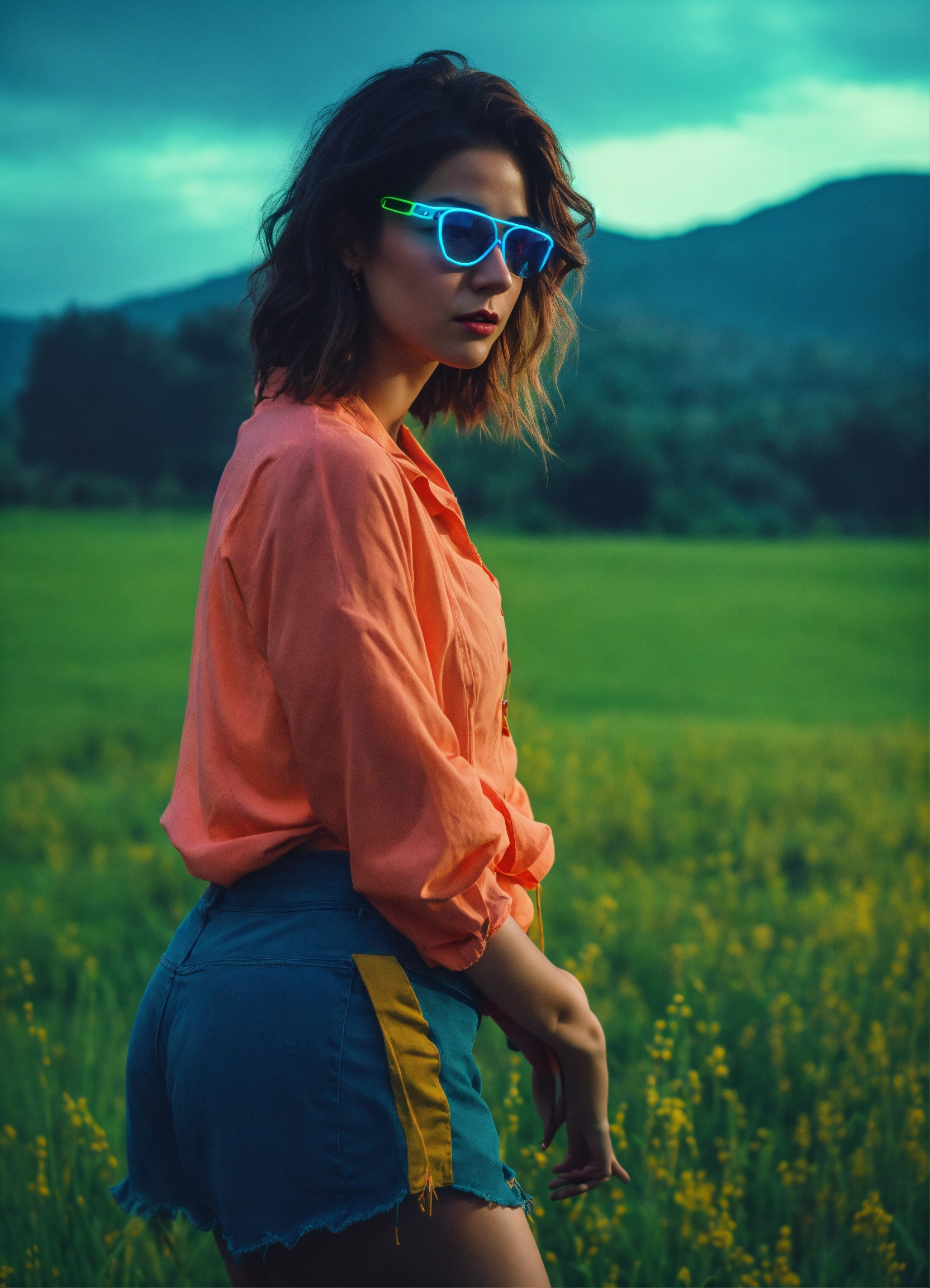Cinematic photography, modern, female trickster in a pasture, proportionate, neon colors, realistic details, ultra 8k resolution