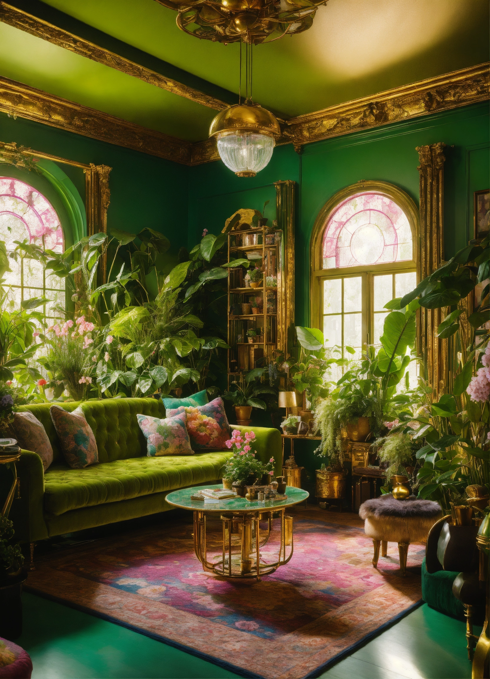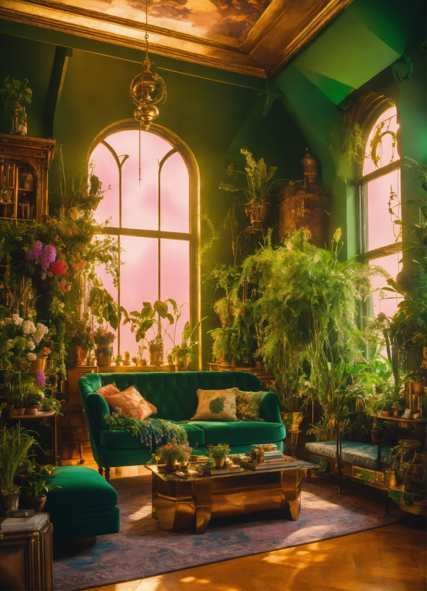 Architectural digest photo of a maximalist green {vaporwave/steampunk/solarpunk} living room with lots of flowers and plants, golden light, hyperrealistic surrealism, award winning masterpiece with incredible details, epic stunning