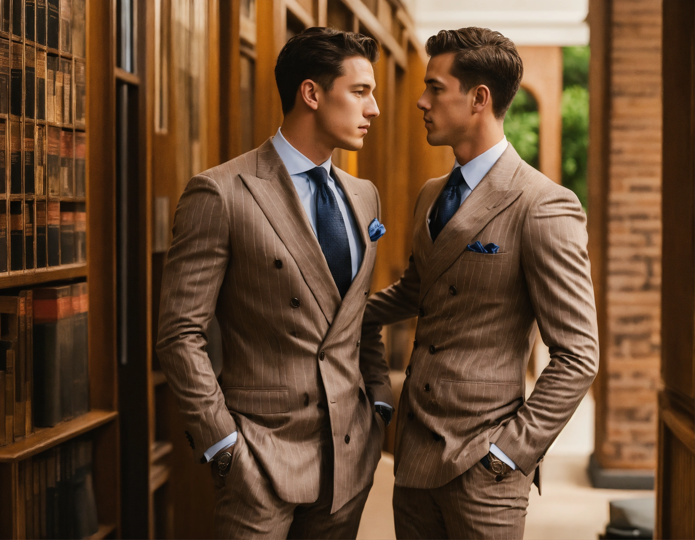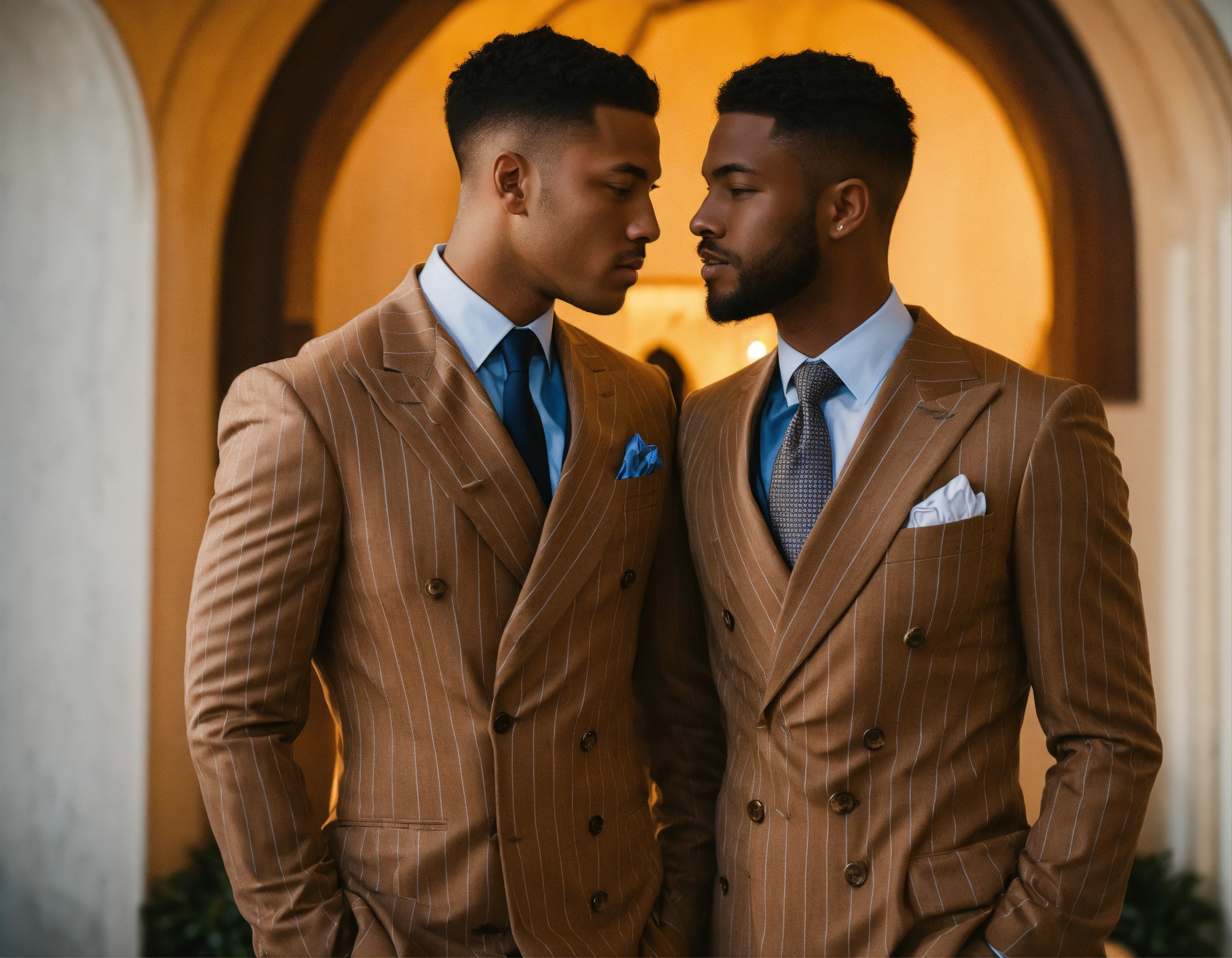 Two young american male lawyers in light brown pinstripe double breasted suit embracing