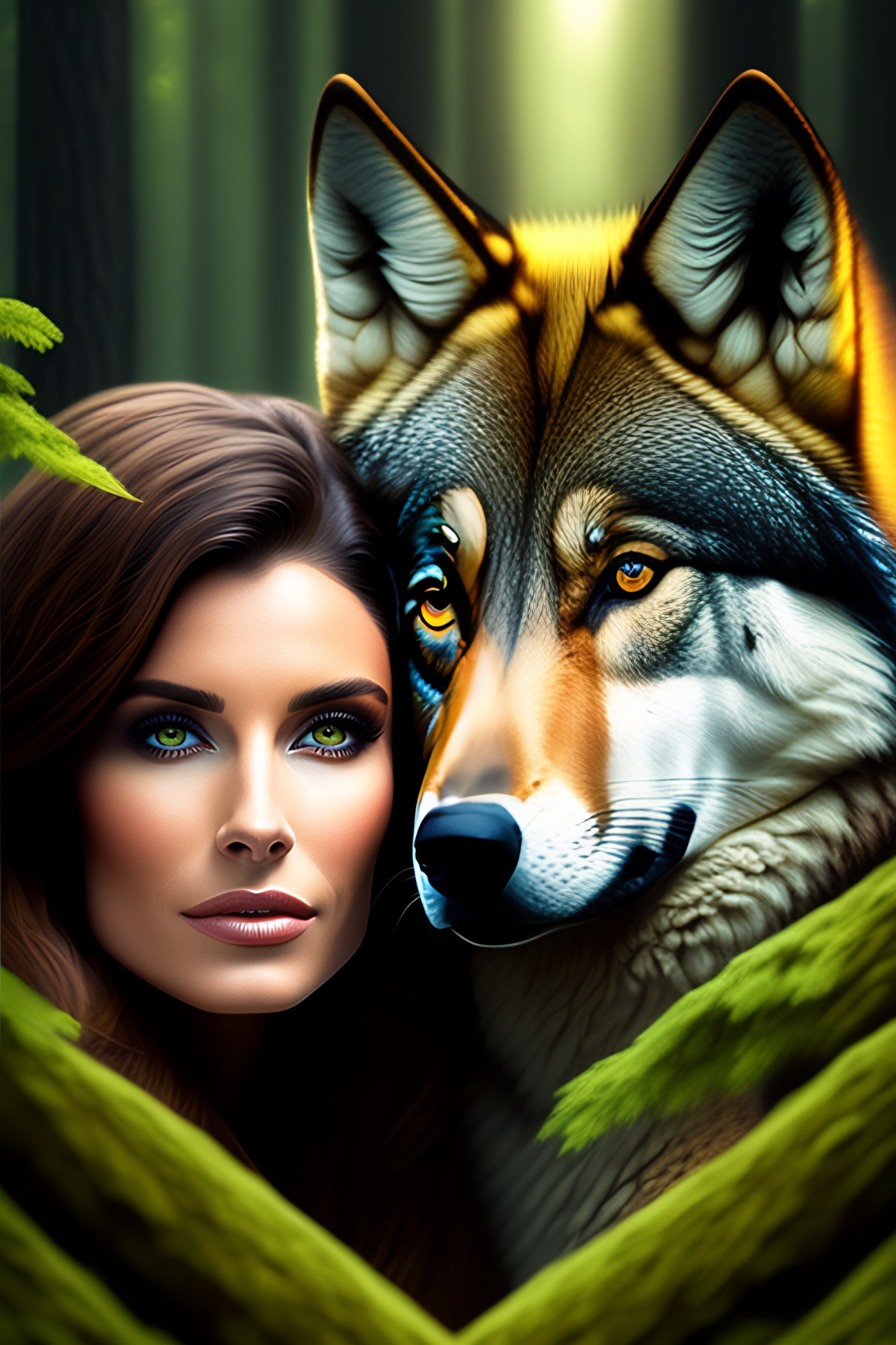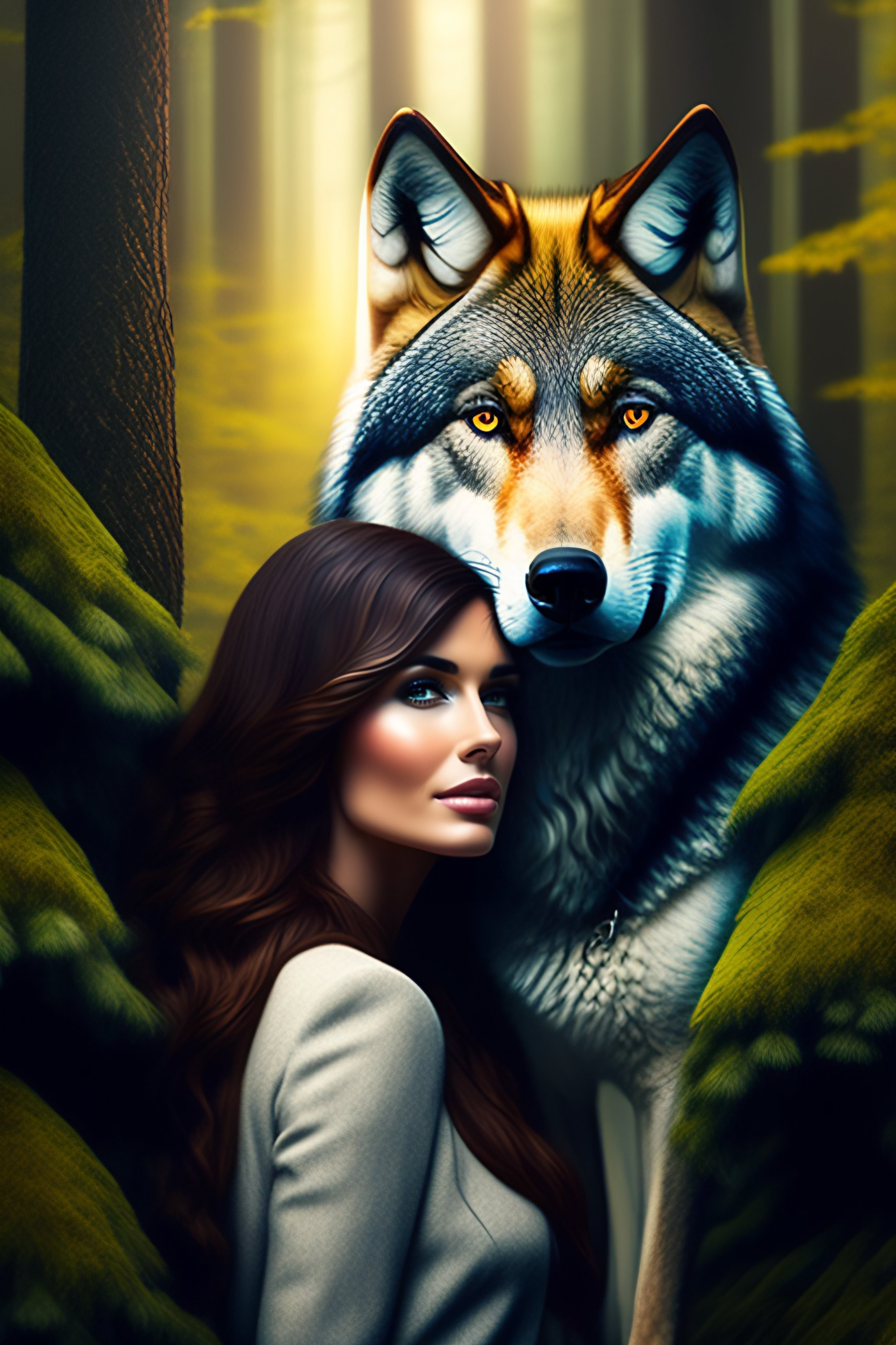 Wolf and brown haired woman in forest