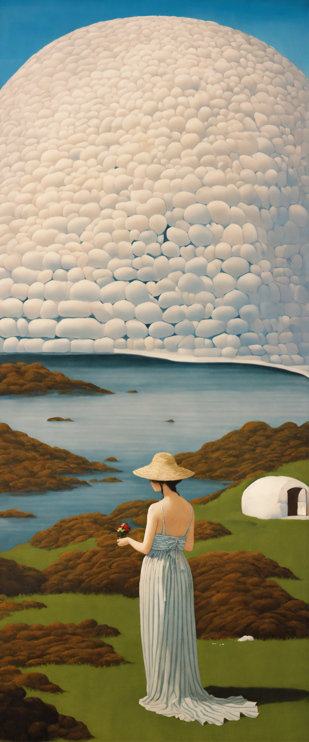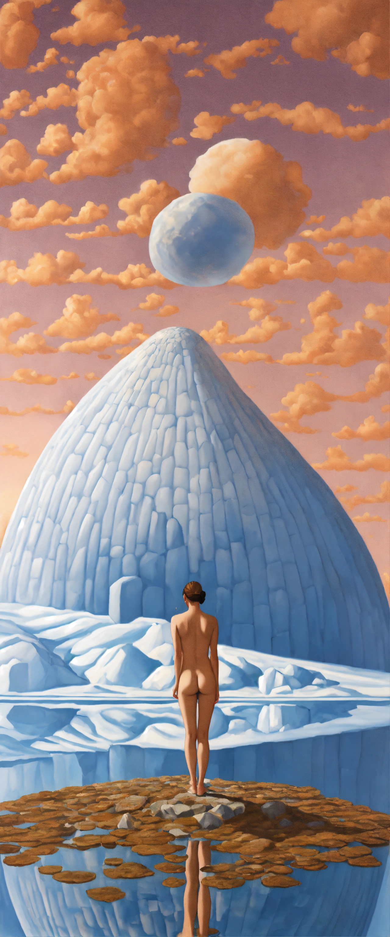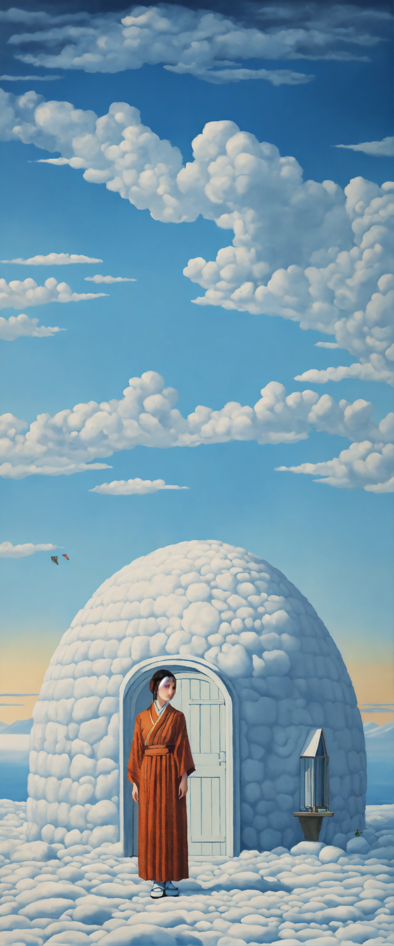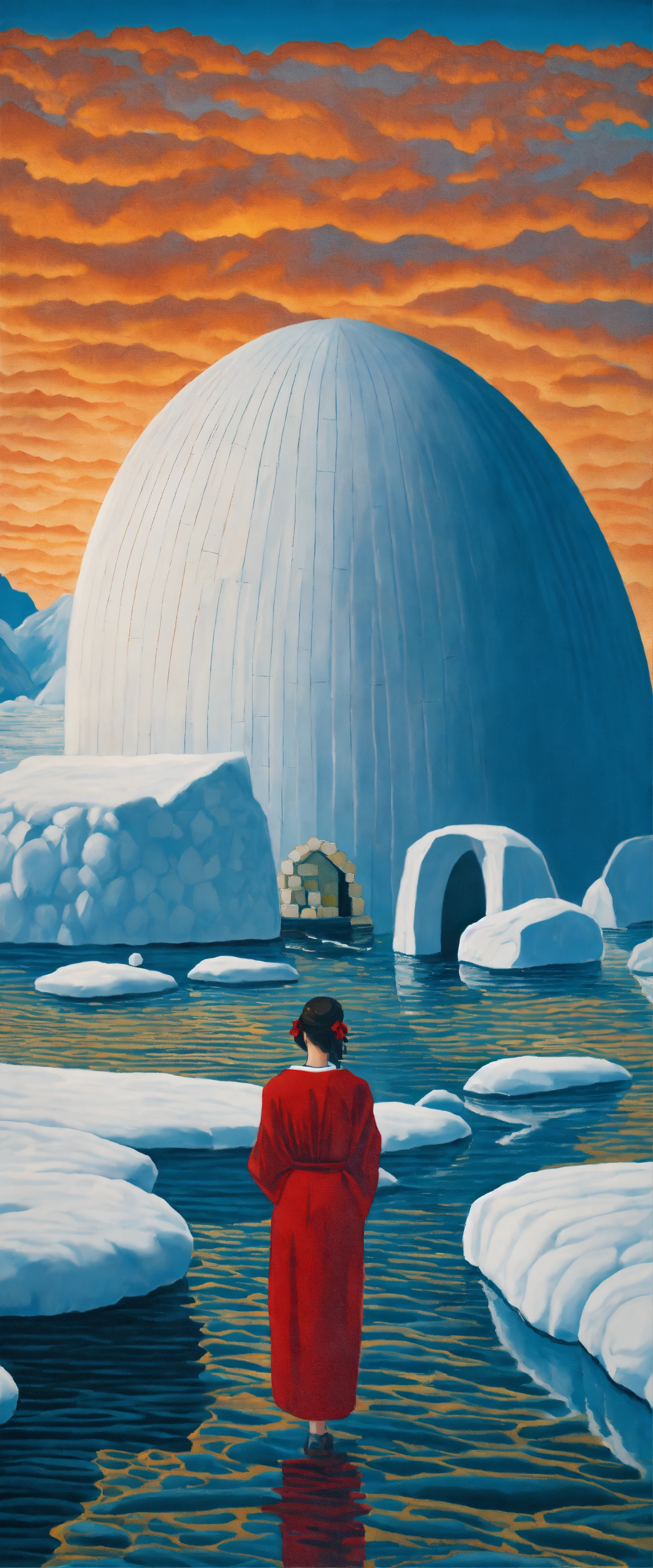 "a japanese aphrodite standing in front of an igloo in greenland" in a painting by rene magritte, surrealistic, 64k resolution, highly detailed, sharp image.