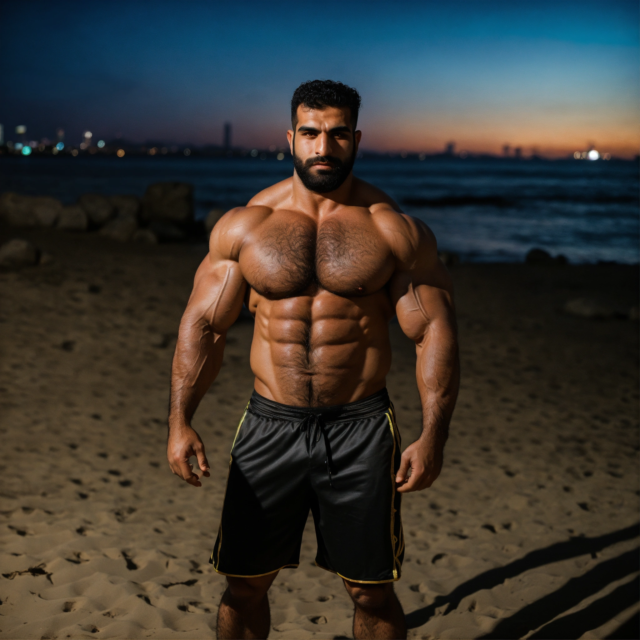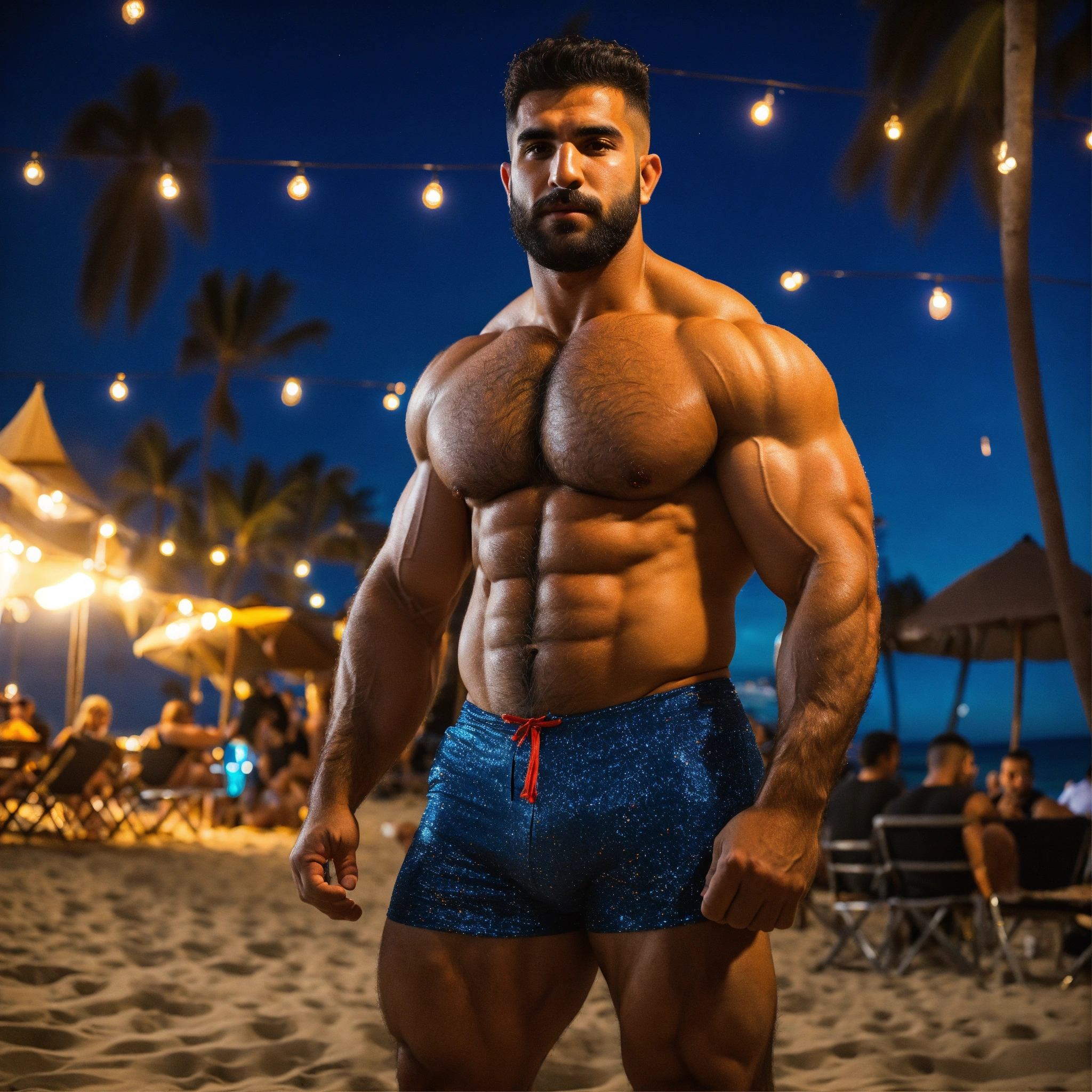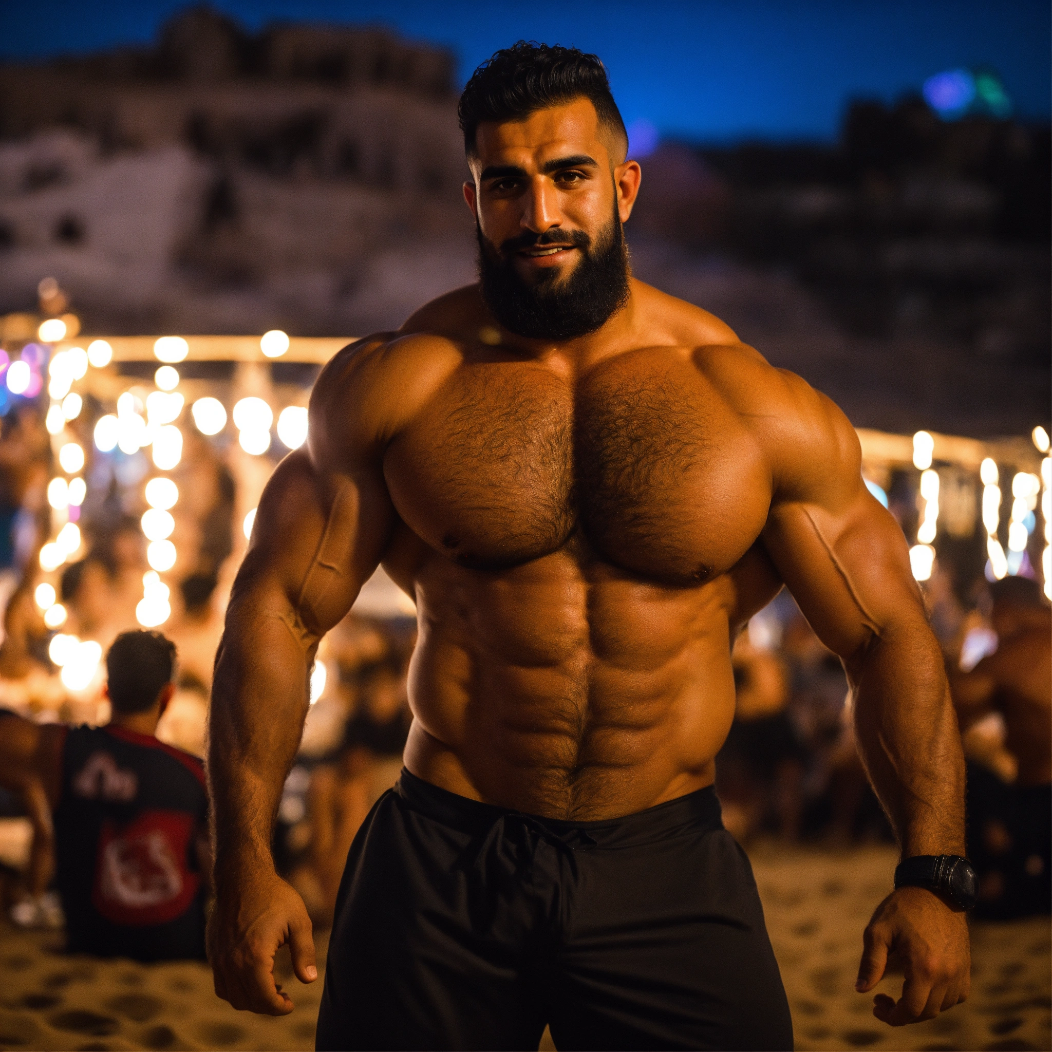 30-year-old hairy palestinian man with big muscles, big bodybuilder, body like a wrestler, at a party on the beach at night