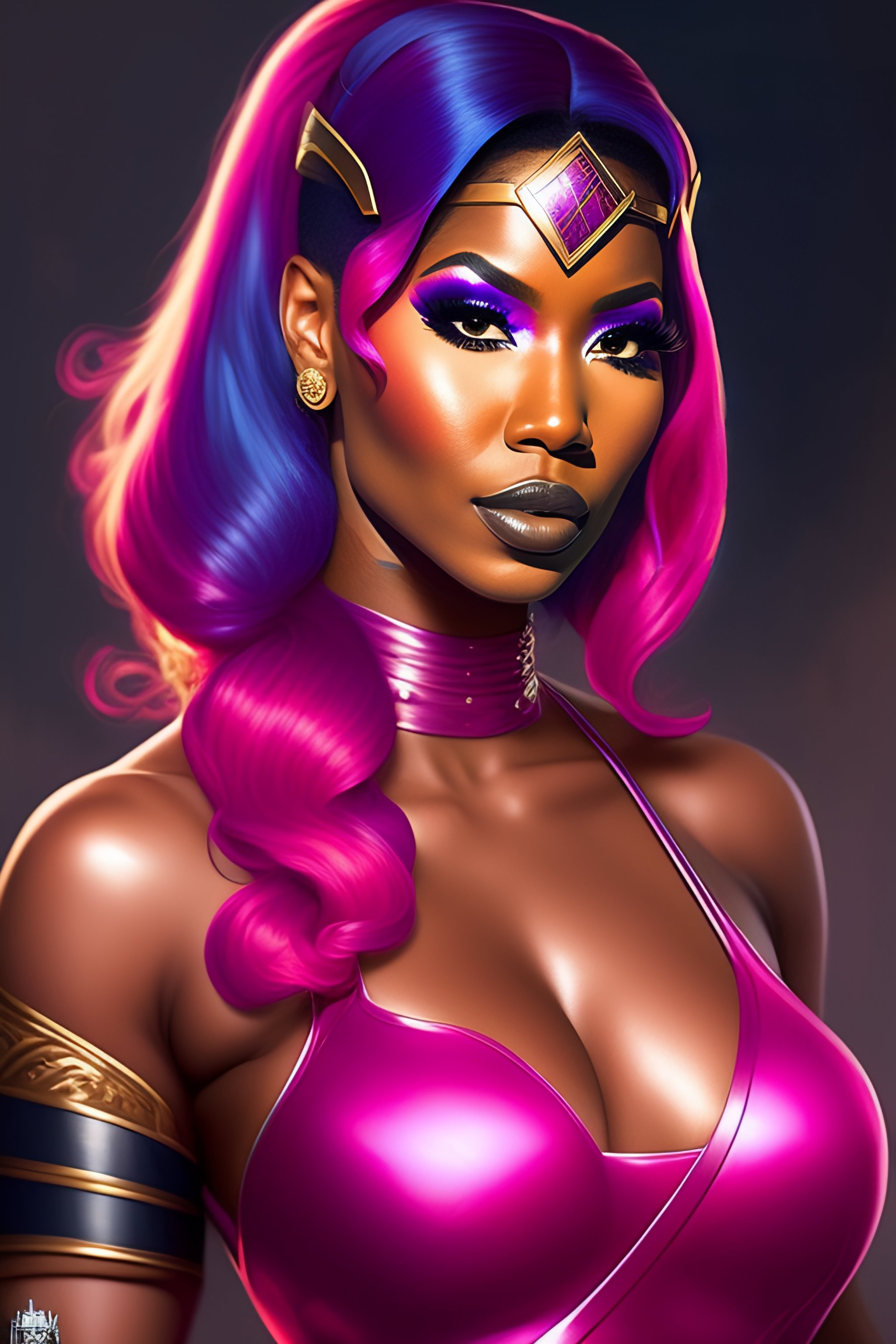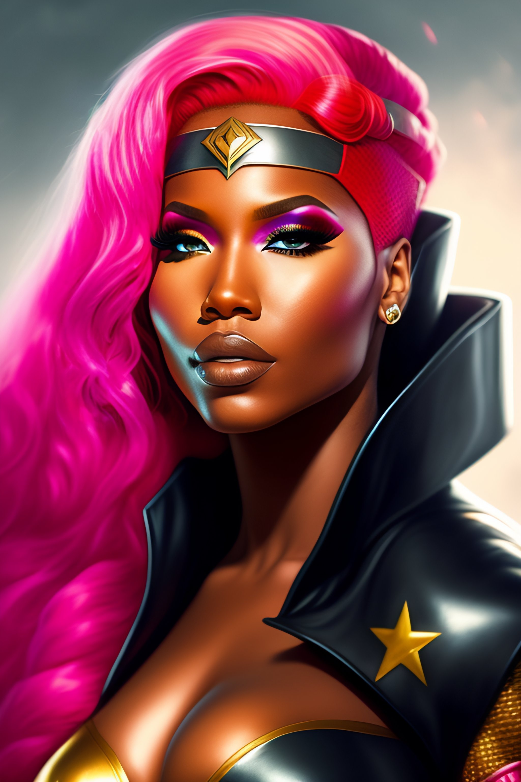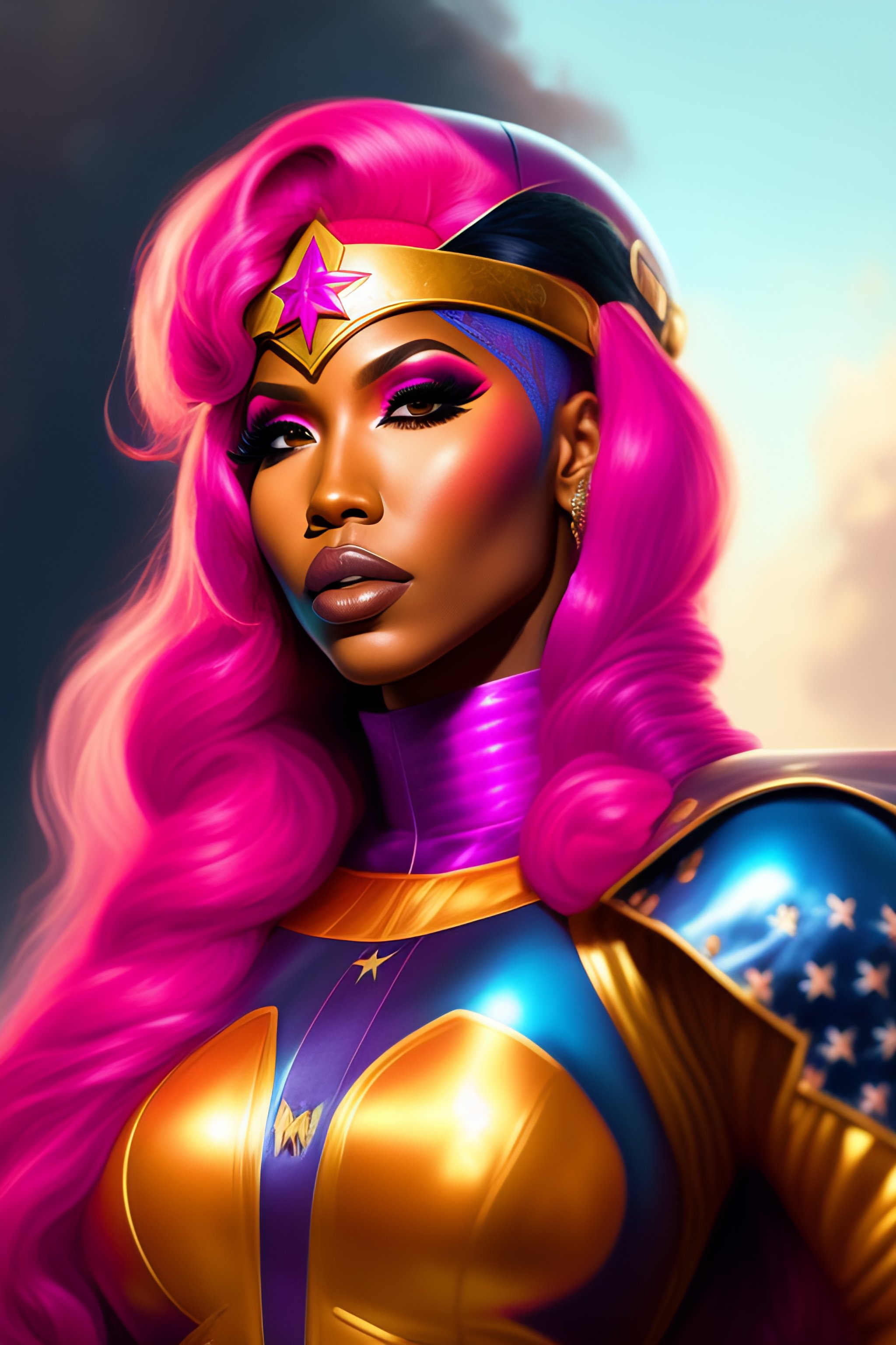 Portrait of rapper nicki minaj, pink hair, dressed as superhero wonder woman, epic, tragic, military art, fantasy, dieselpunk, hd shot, digital portrait, beautiful, artstation, comic style, by artgerm, guy denning, jakub rozalski, magali villeneuve and charlie bowater, comic book, superhero costume