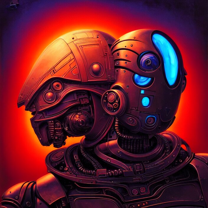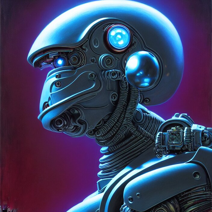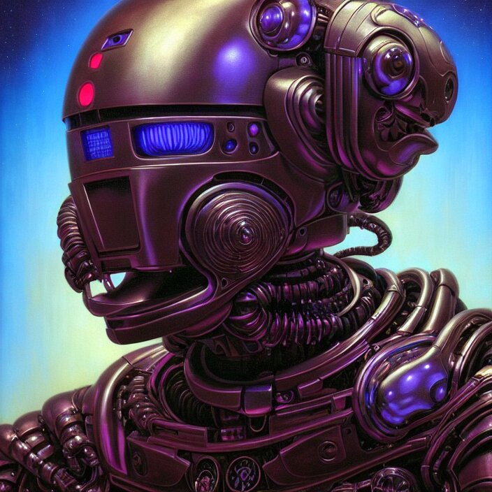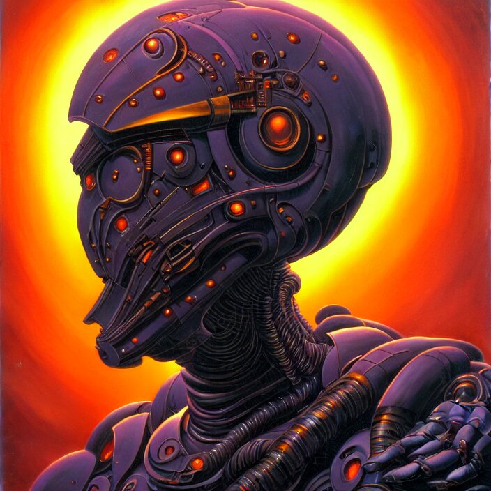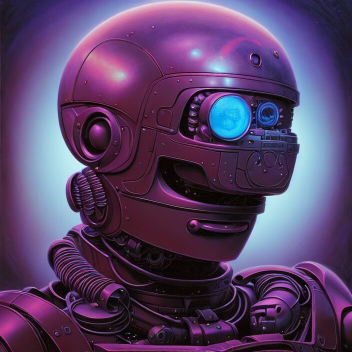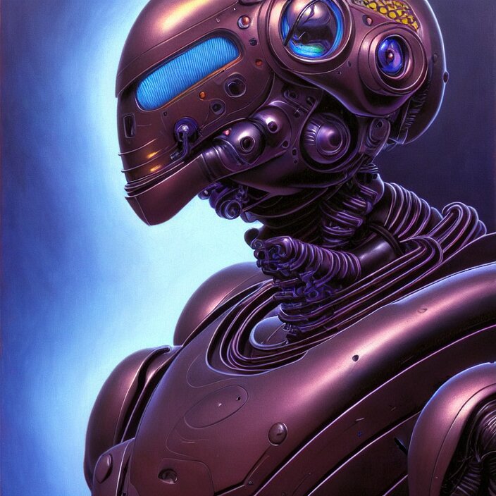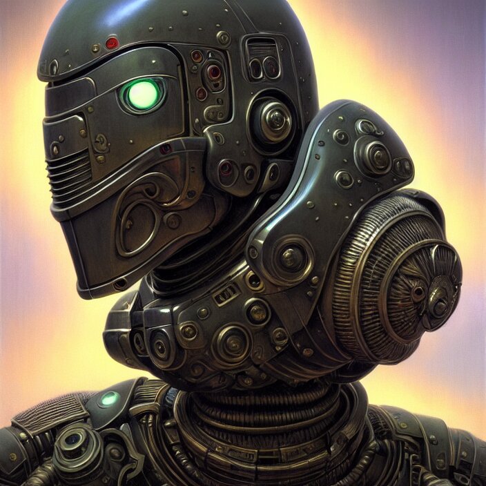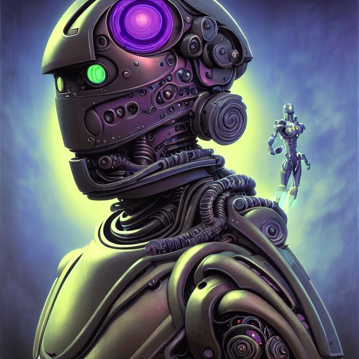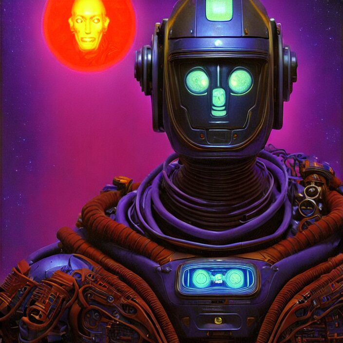 Cinematic bust portrait of psychedelic robot from left, head and chest only, exotic alien features, robotic enhancements, desaturated, tim hildebrandt, wayne barlowe, bruce pennington, donato giancola, larry elmore, oil on canvas, masterpiece, trending on artstation, featured on pixiv, cinematic composition, dramatic pose, beautiful lighting, sharp, details, hyper - detailed, hd, hdr, 4 k, 8 k