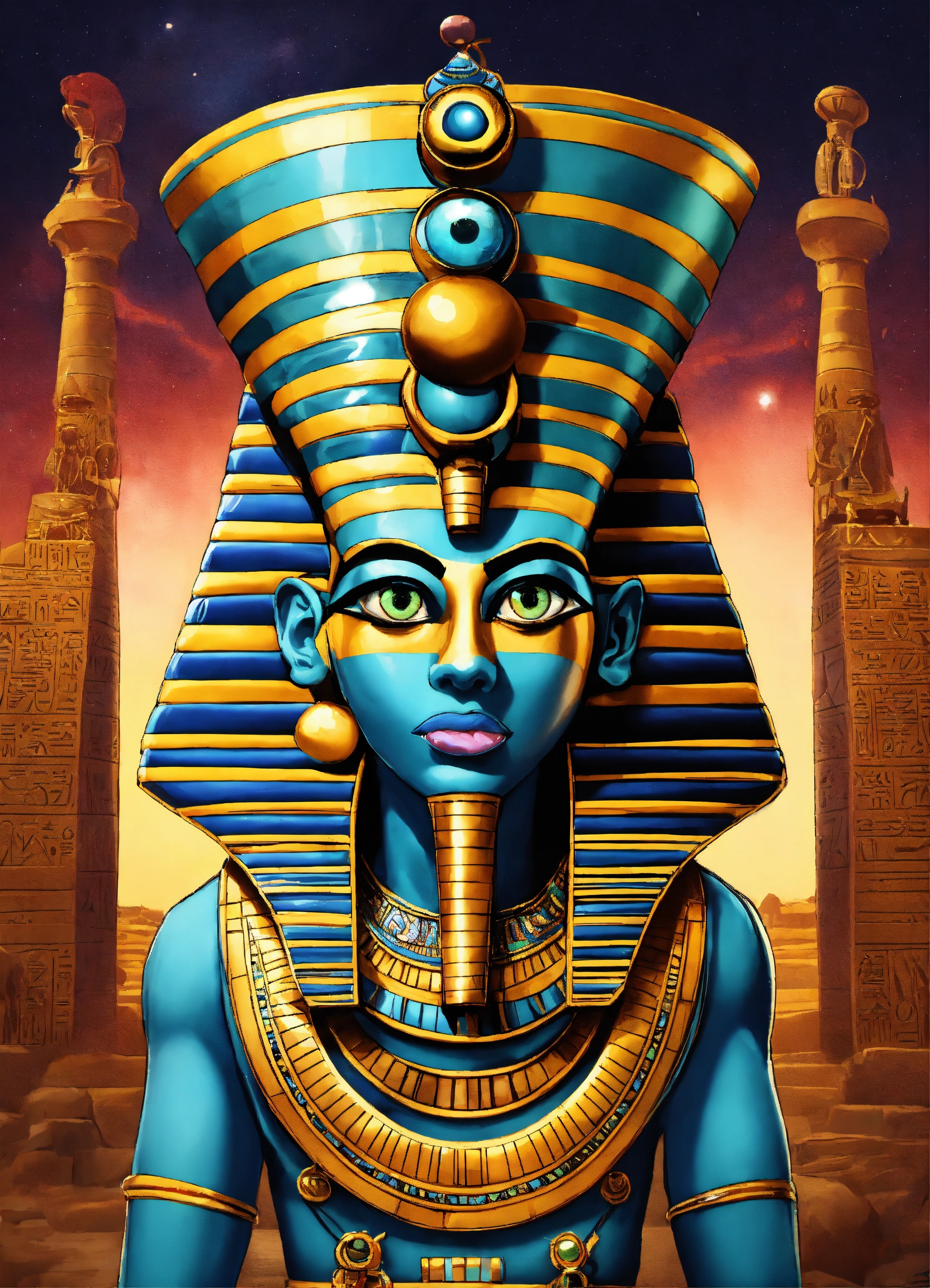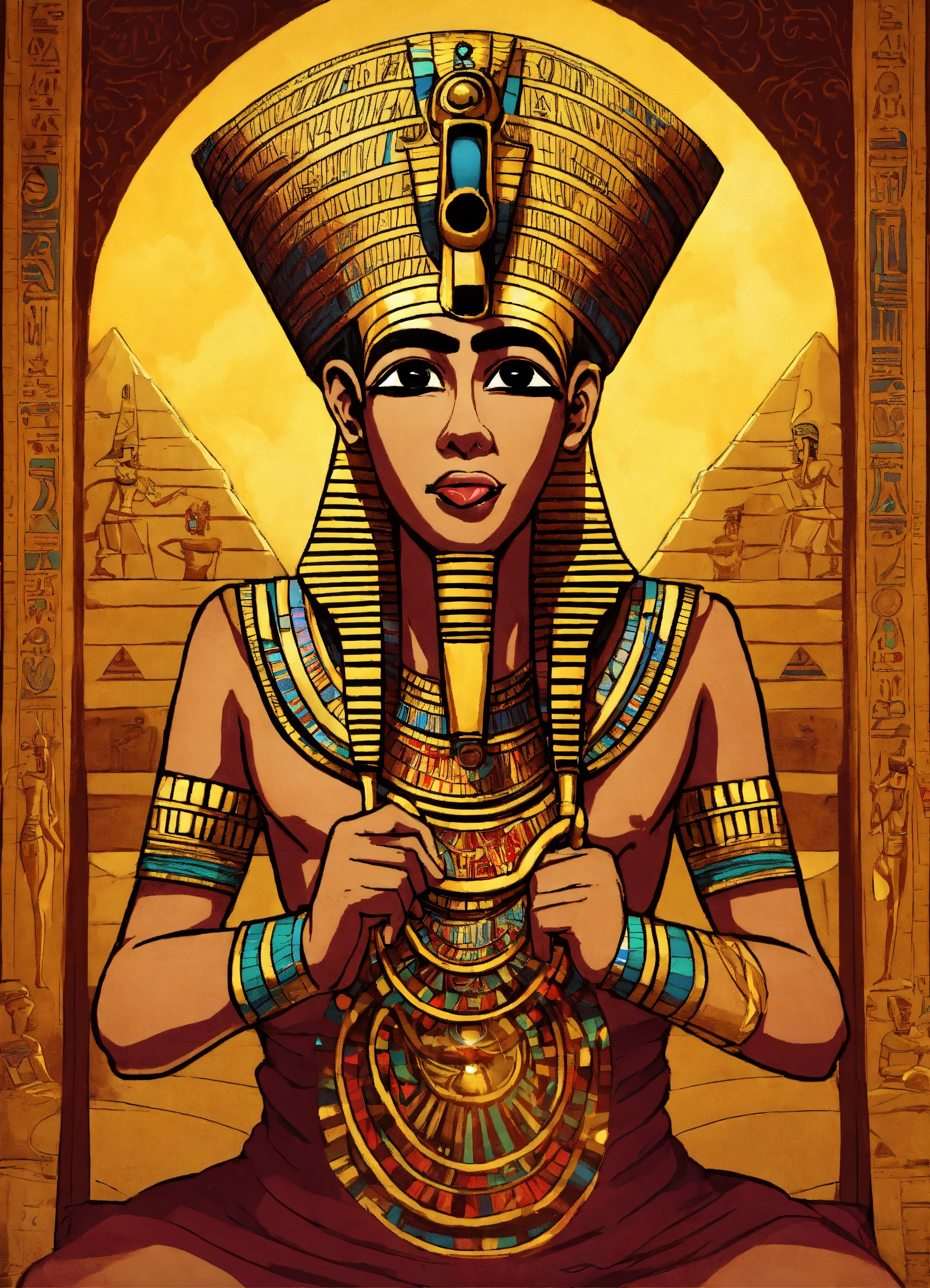 Hypnotized egyptian pharaoh dancing, brainwashed, mind controlled, with large cartoon spiral eyes, tongue sticking from their mouth, photo from the neck up, cartoon-styled.