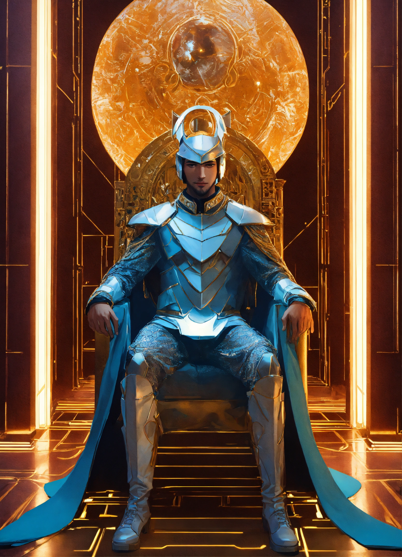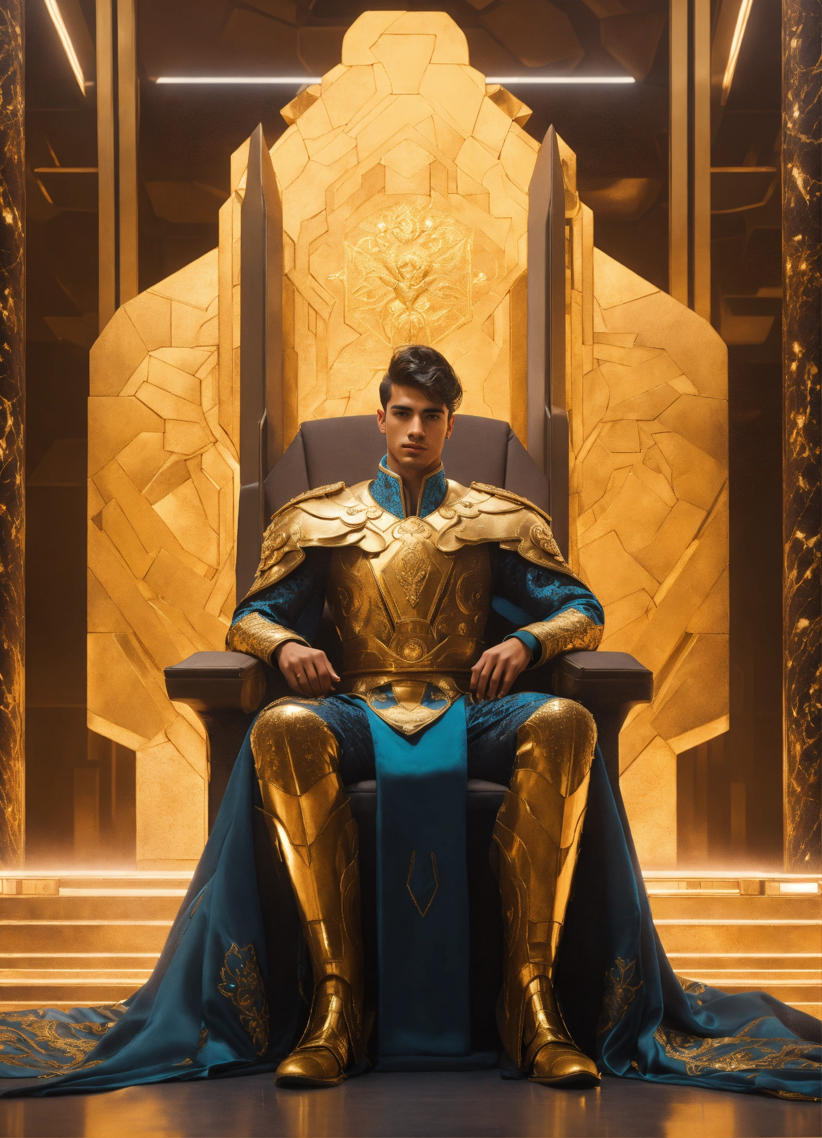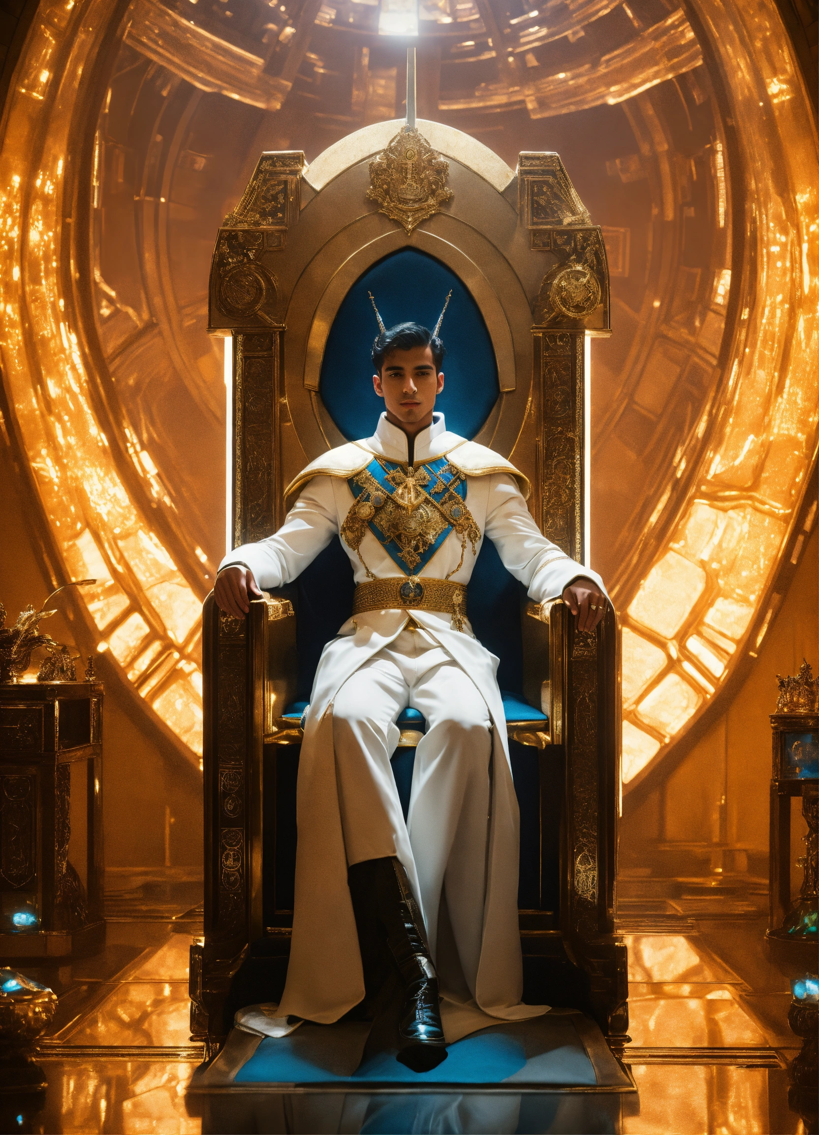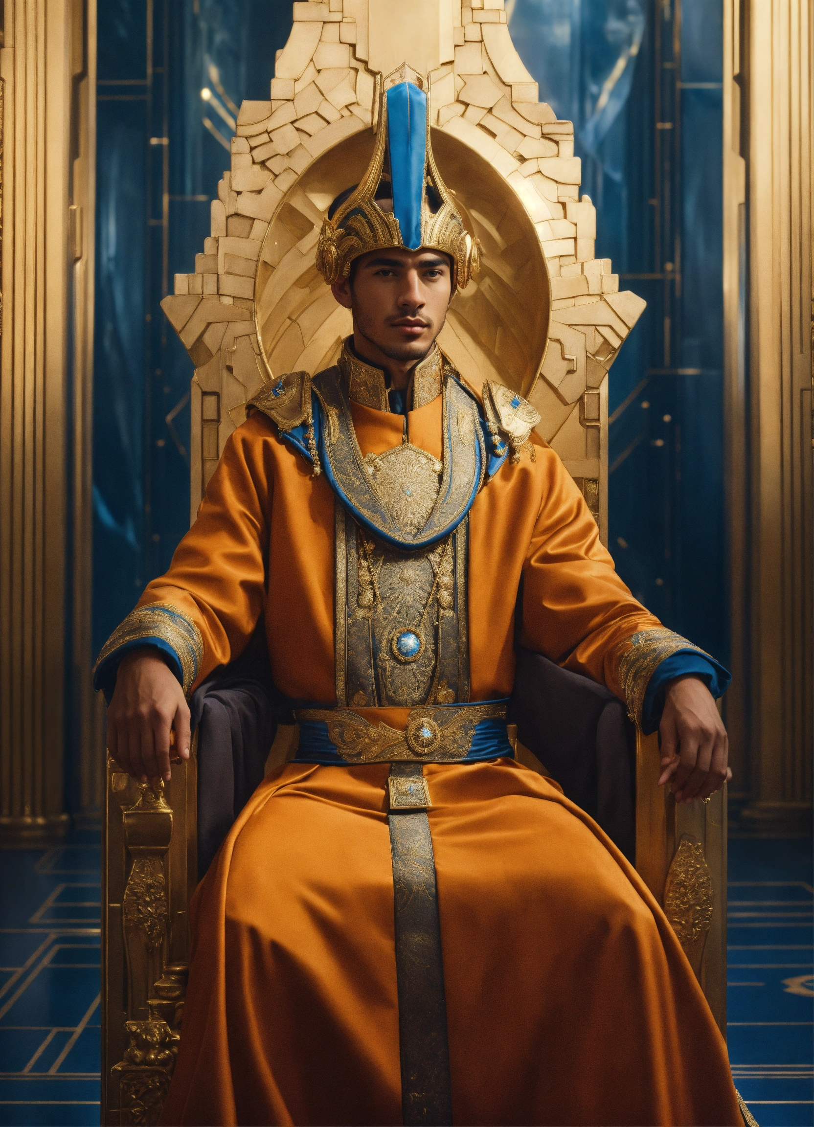 Portrait of a young handsome ruler of the earth, dressed in futuristic ceremonial robes, sitting in a futuristic throne room