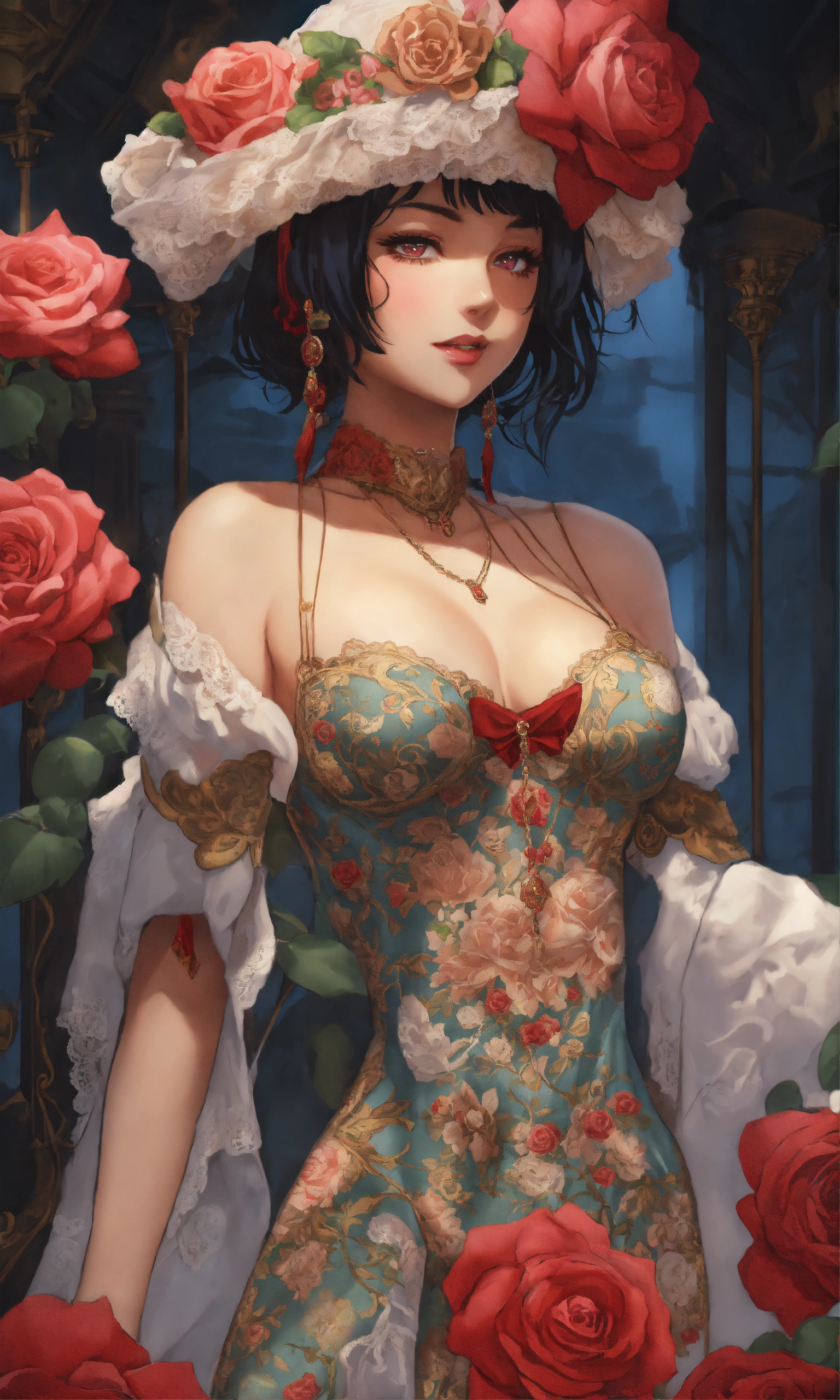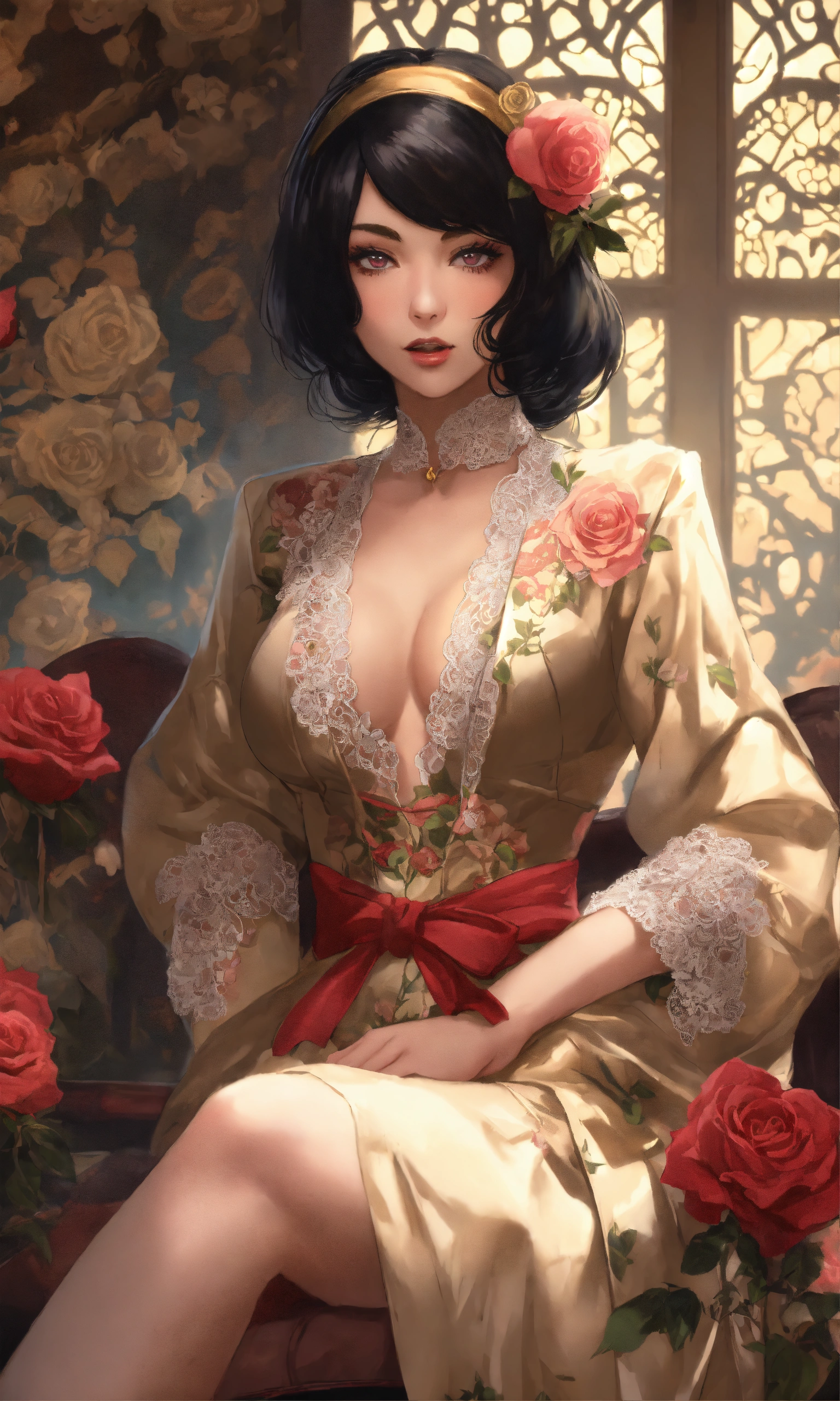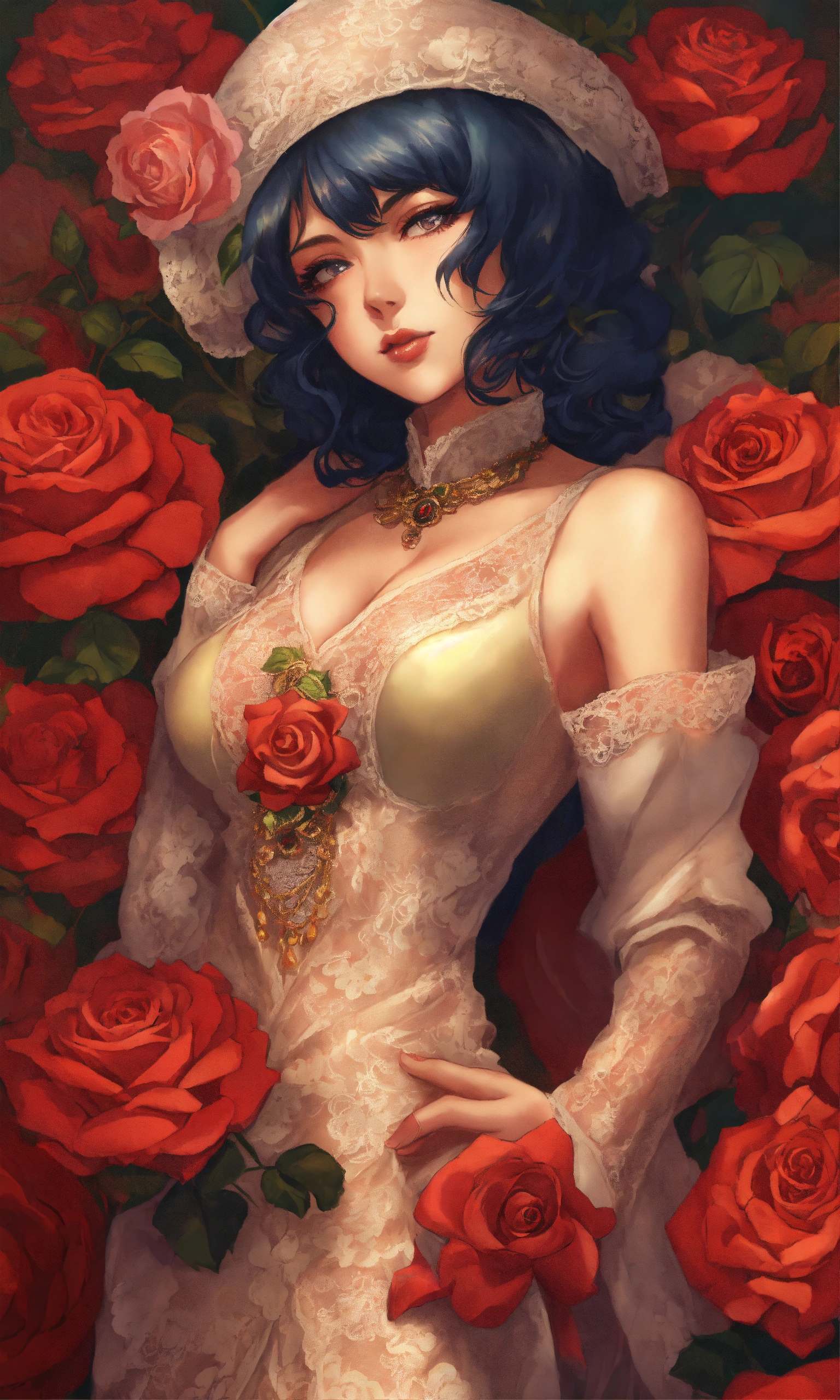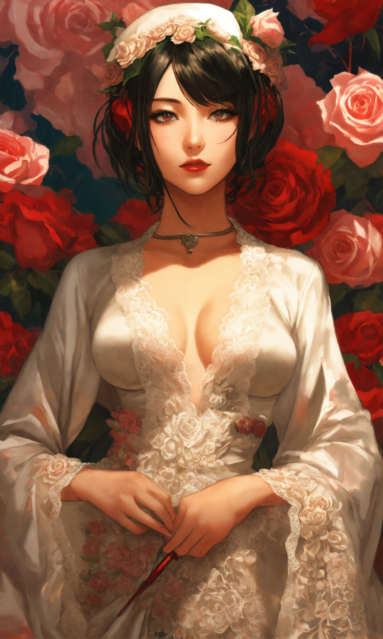 2000s dieselpunk alluring seductress with lace robe and roses, full detailed eyes, toriyama, miyazaki