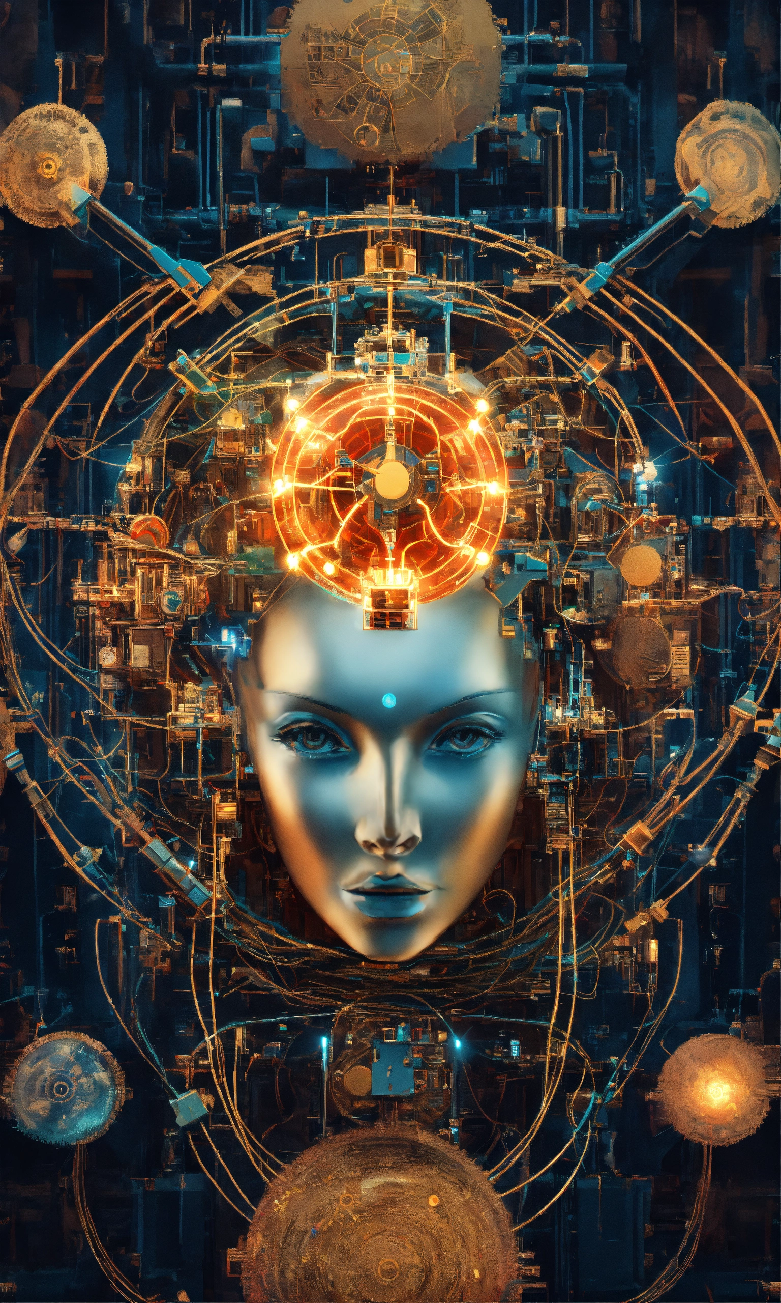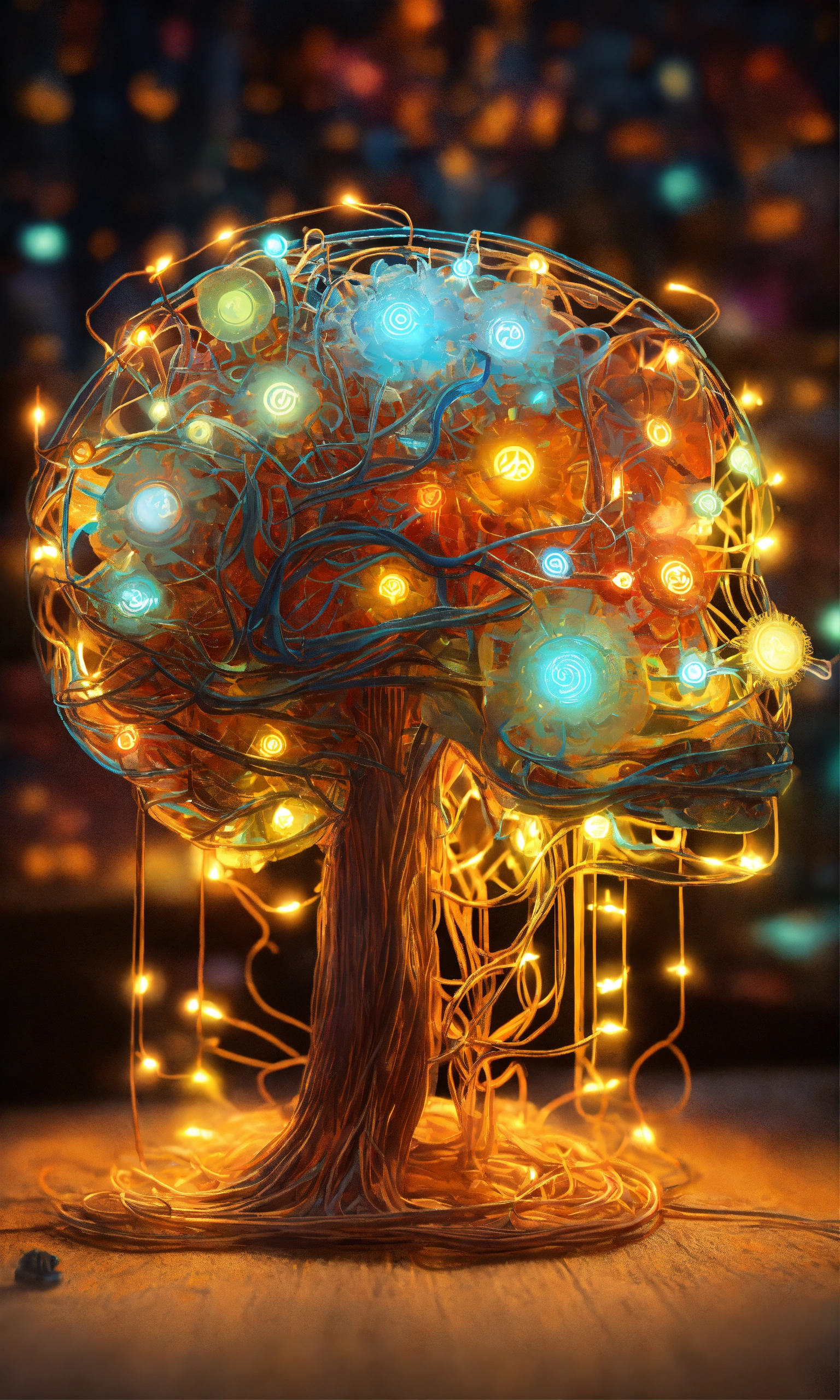 Un cerveau luminescent entouré de différents engrenages en mouvement