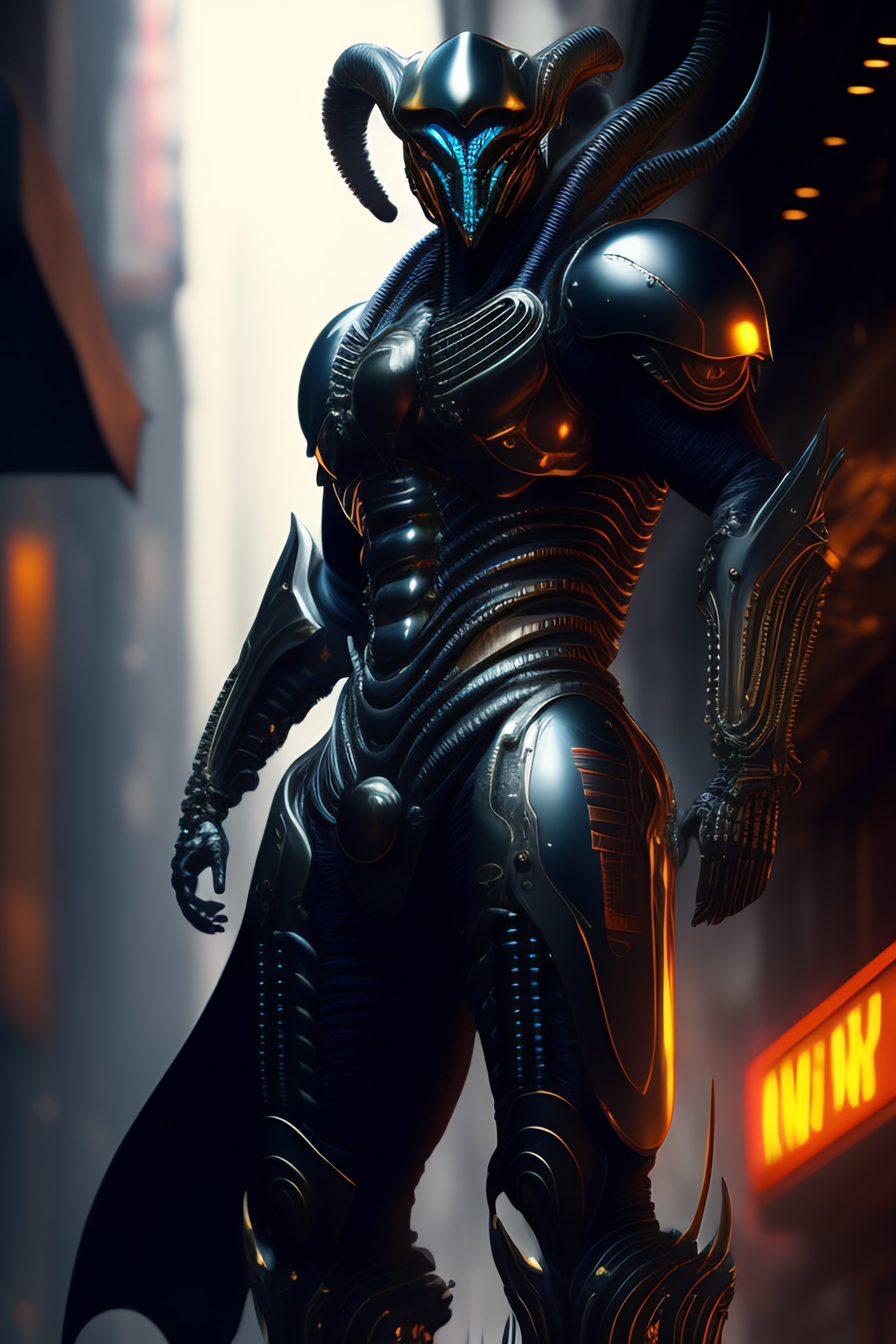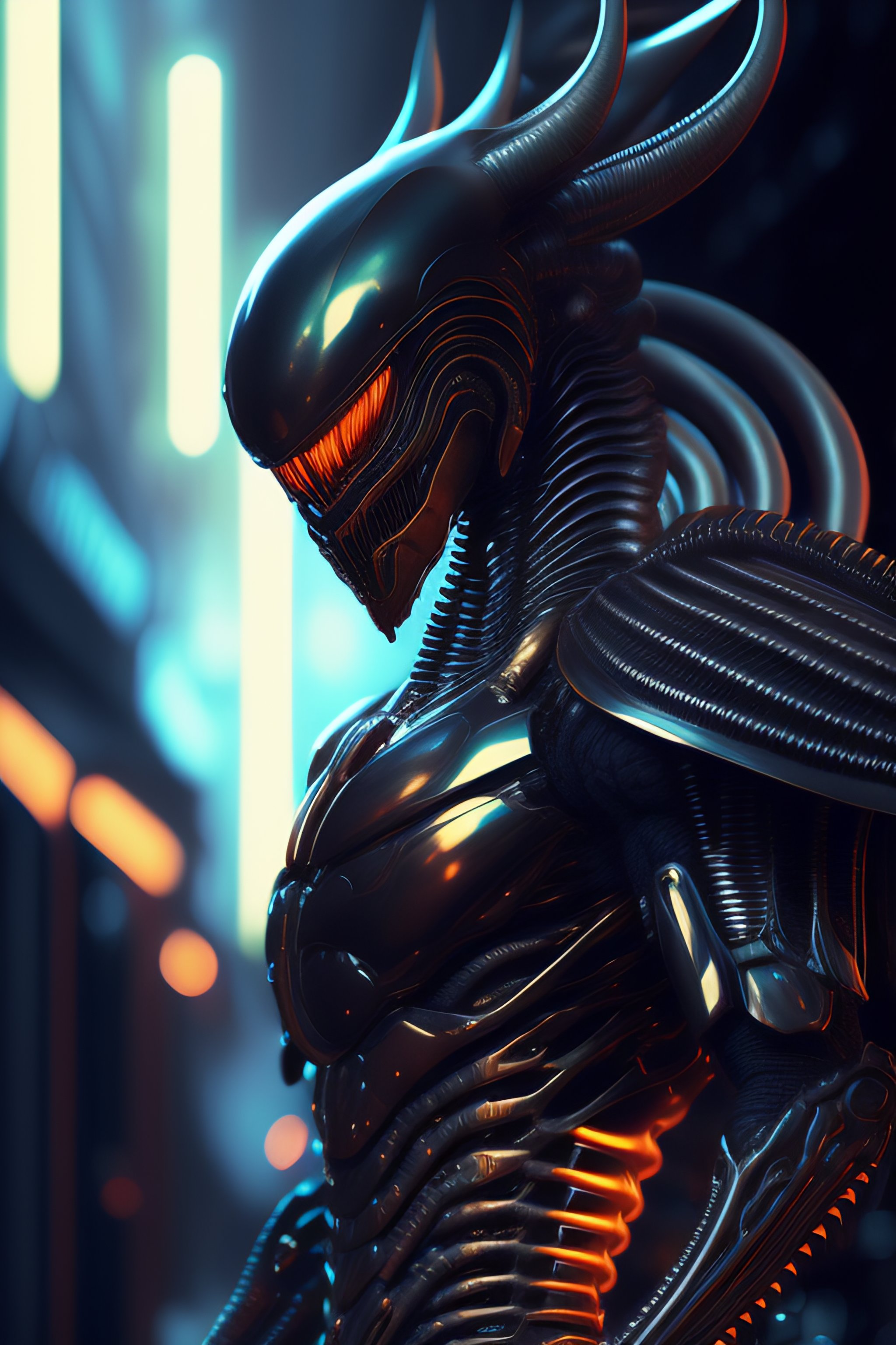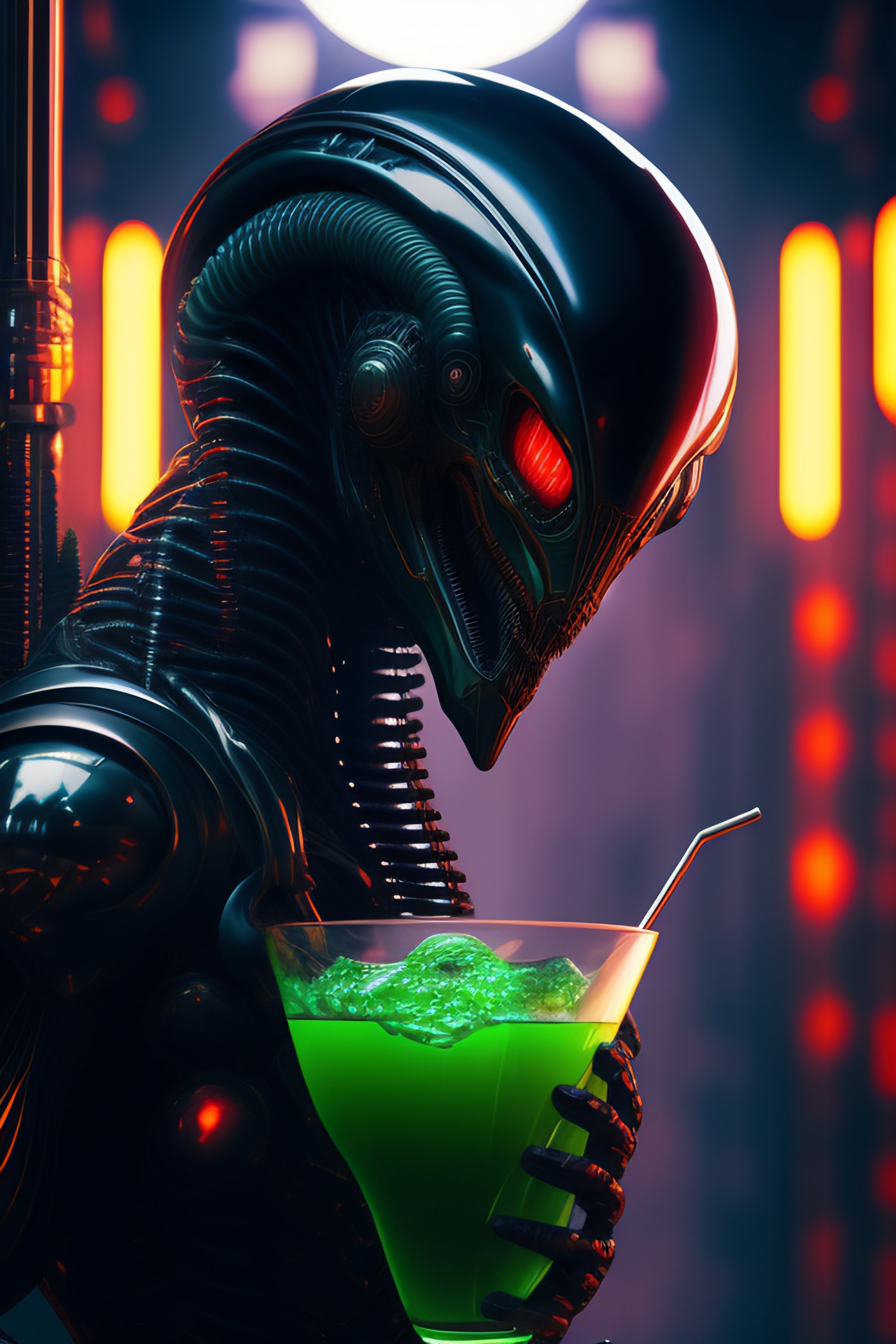 Alien xenomorph male biomechanical, full body cinematic style digital art render with mechanical and futuristic details in a cyberpunk underworld, (((drinking a bloody cocktail))), moody atmospheric lighting, bizarre, dangerous, art by yoshiyuki sadamoto and giger
