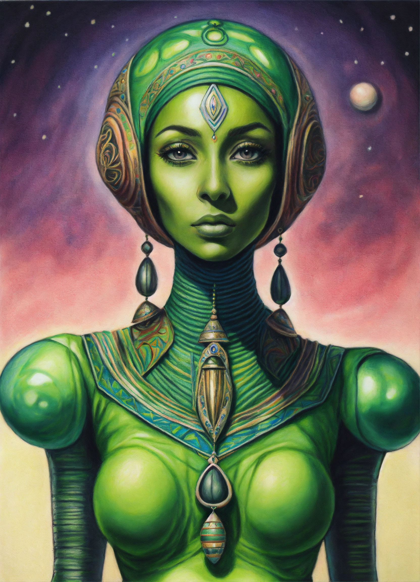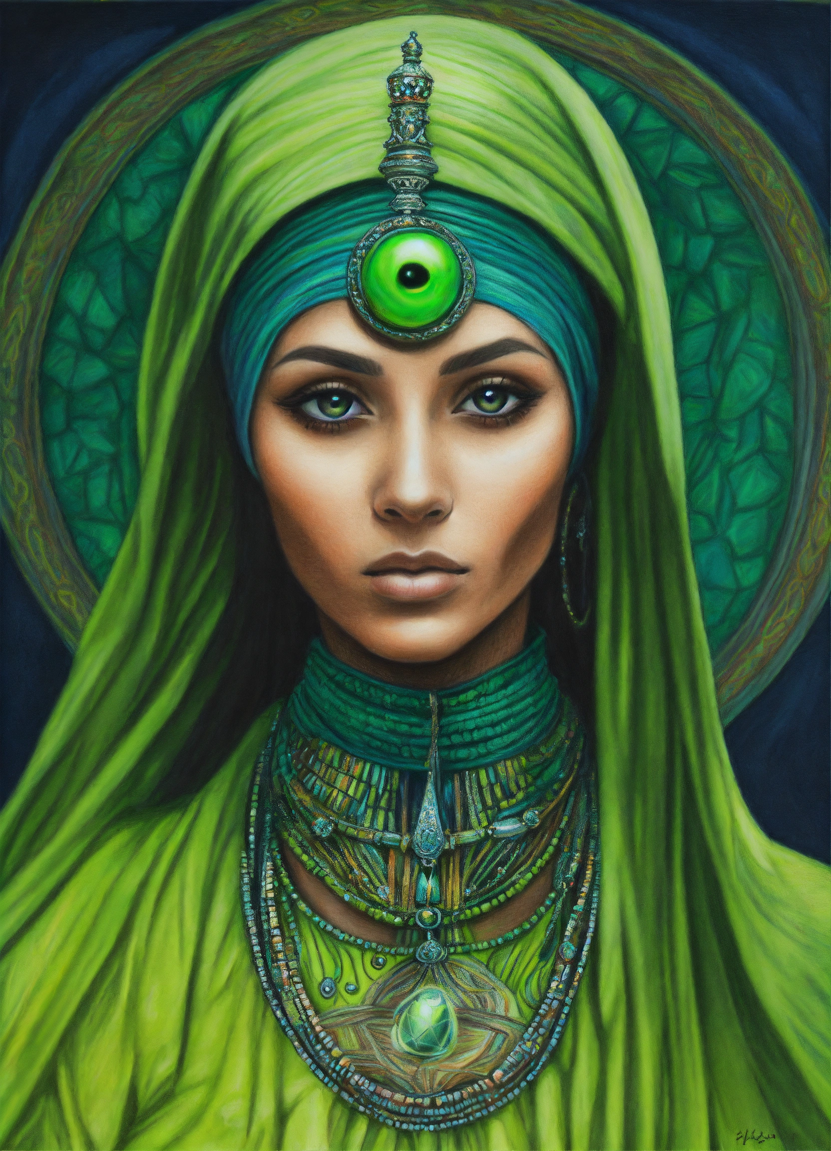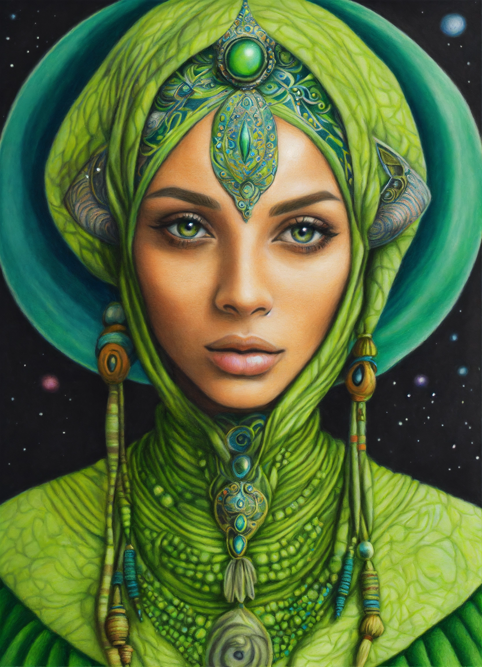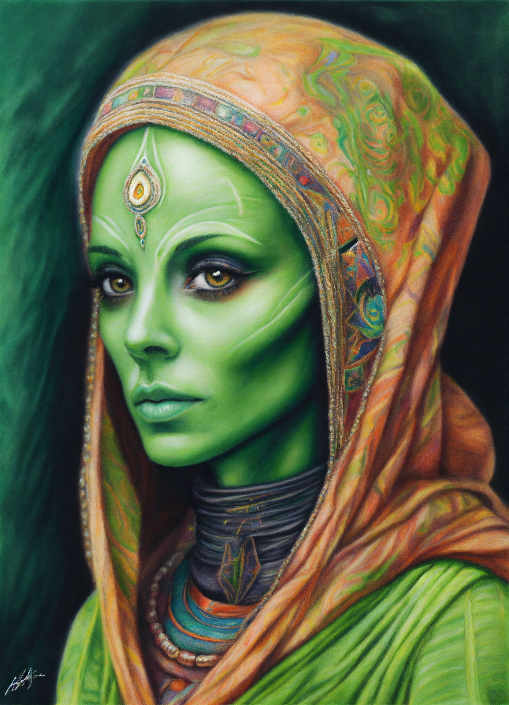 Colored pencil drawing of portrait of a female alien spiritual mentor, with large black eyes, extraterrestrial very small exotic nose, wearing green middle eastern style clothing. looks like an extraterrestrial.