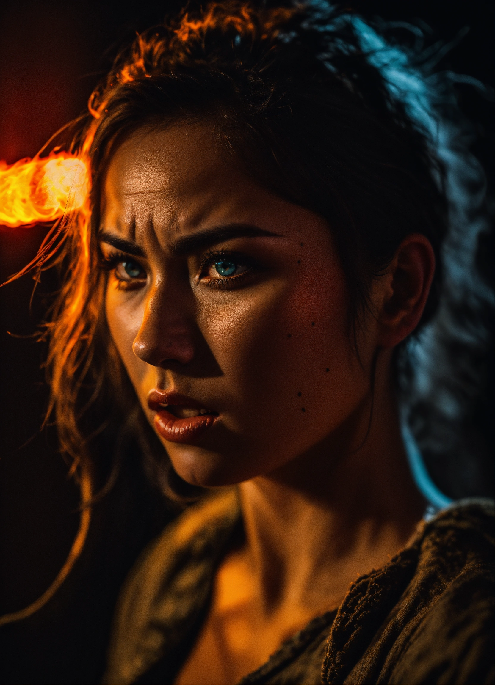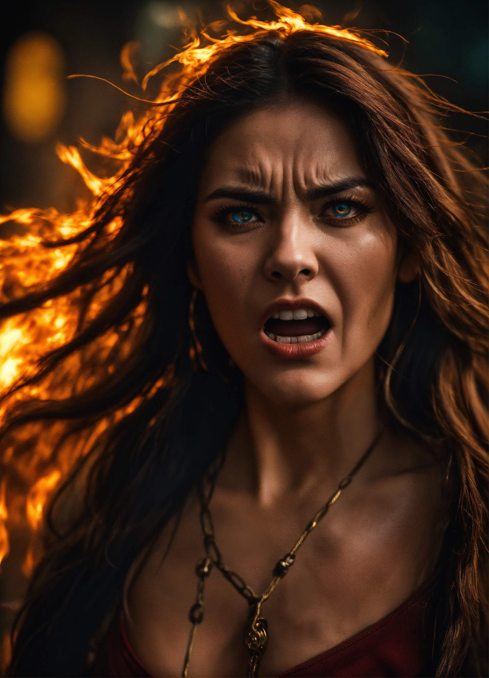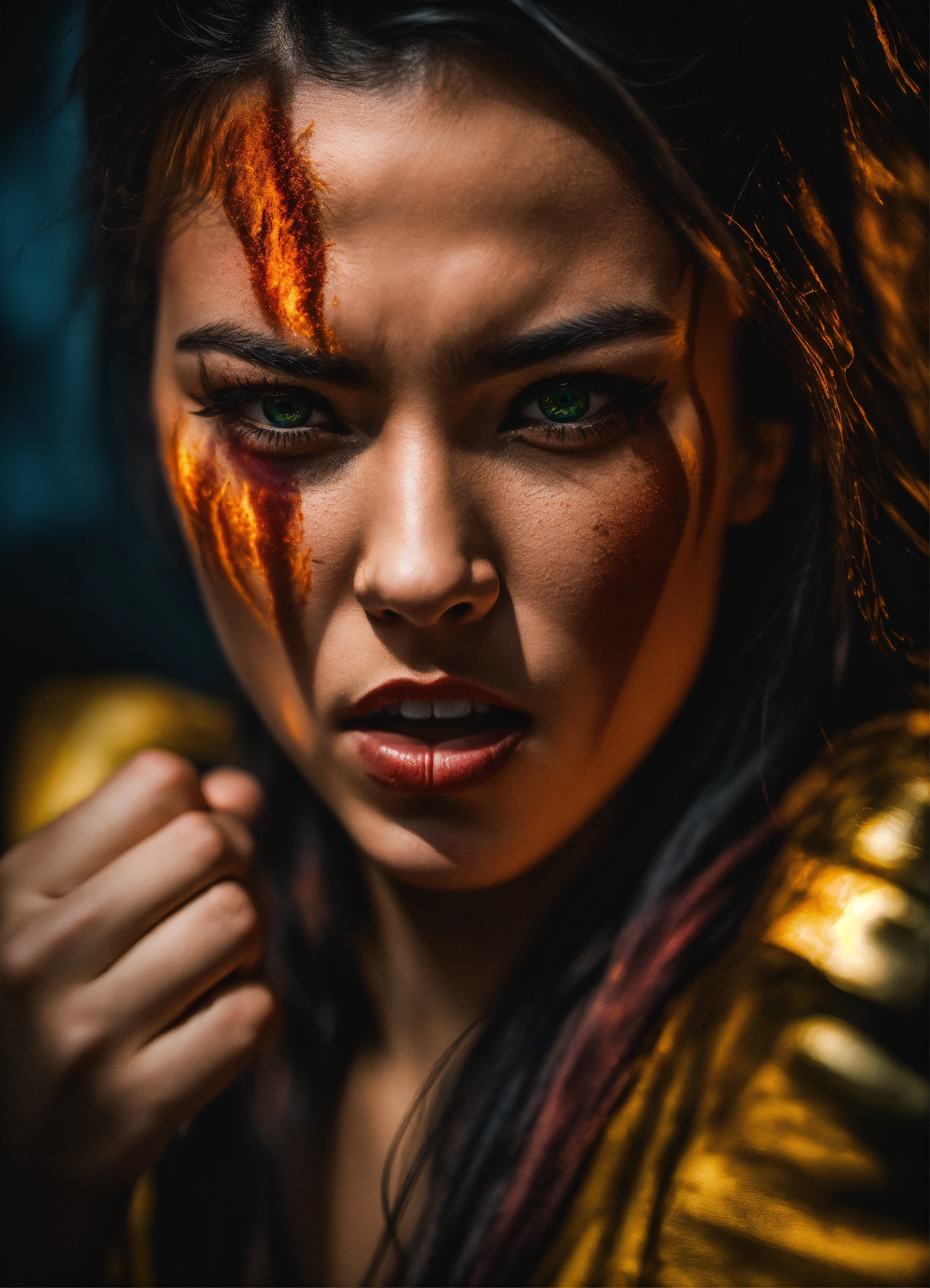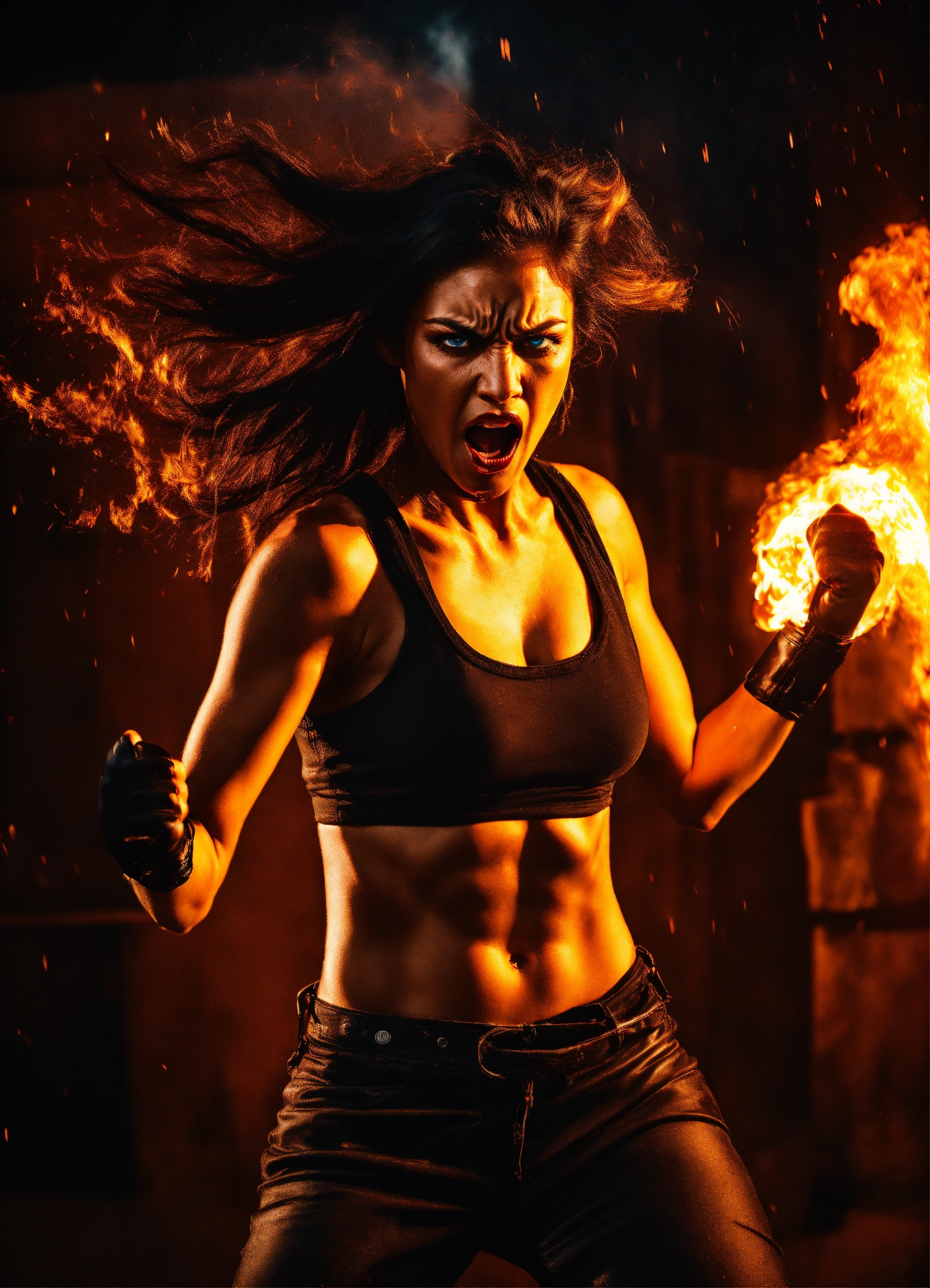"unyielding fury woman channeling intense rage and determination", fiery eyes, clenched fists, nikon z6 ii, dramatic shadow play, raw emotional intensity realism style.