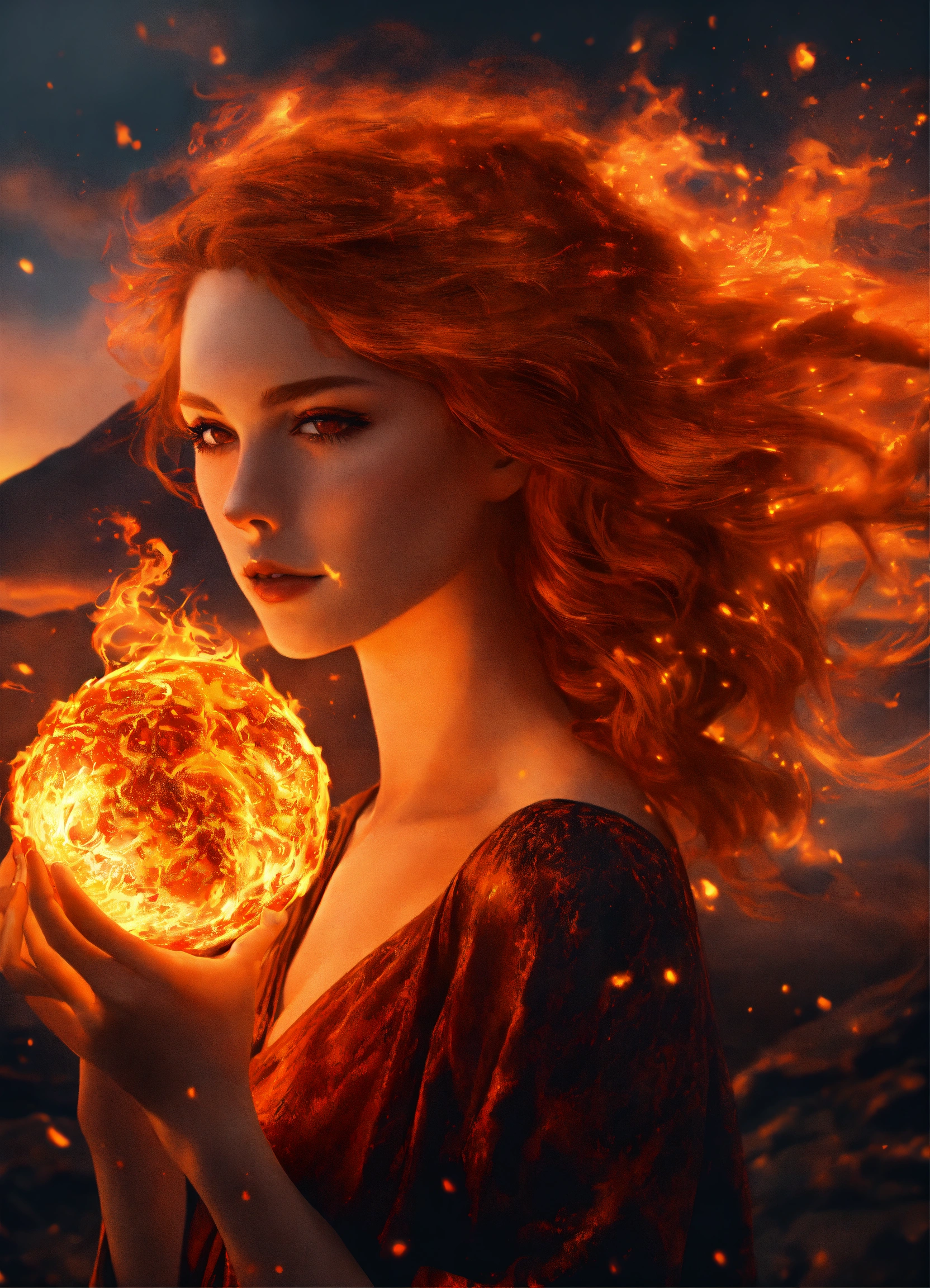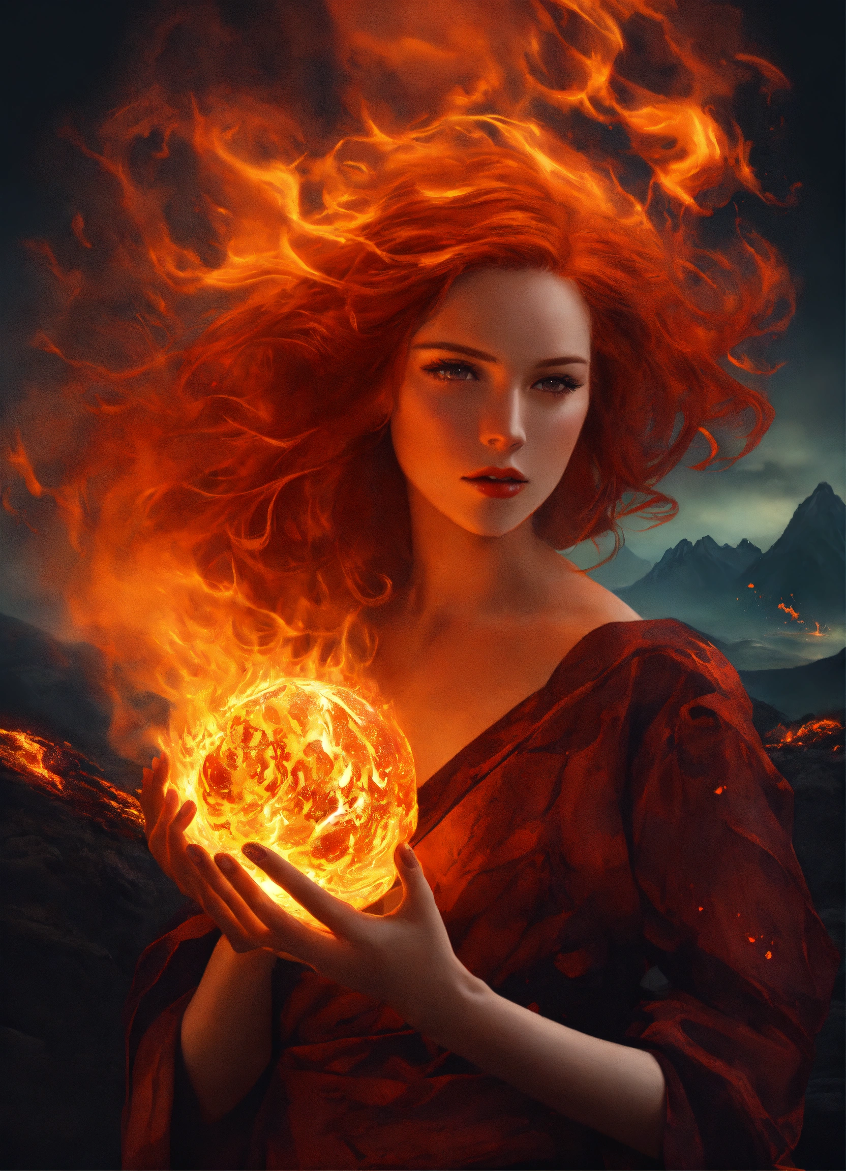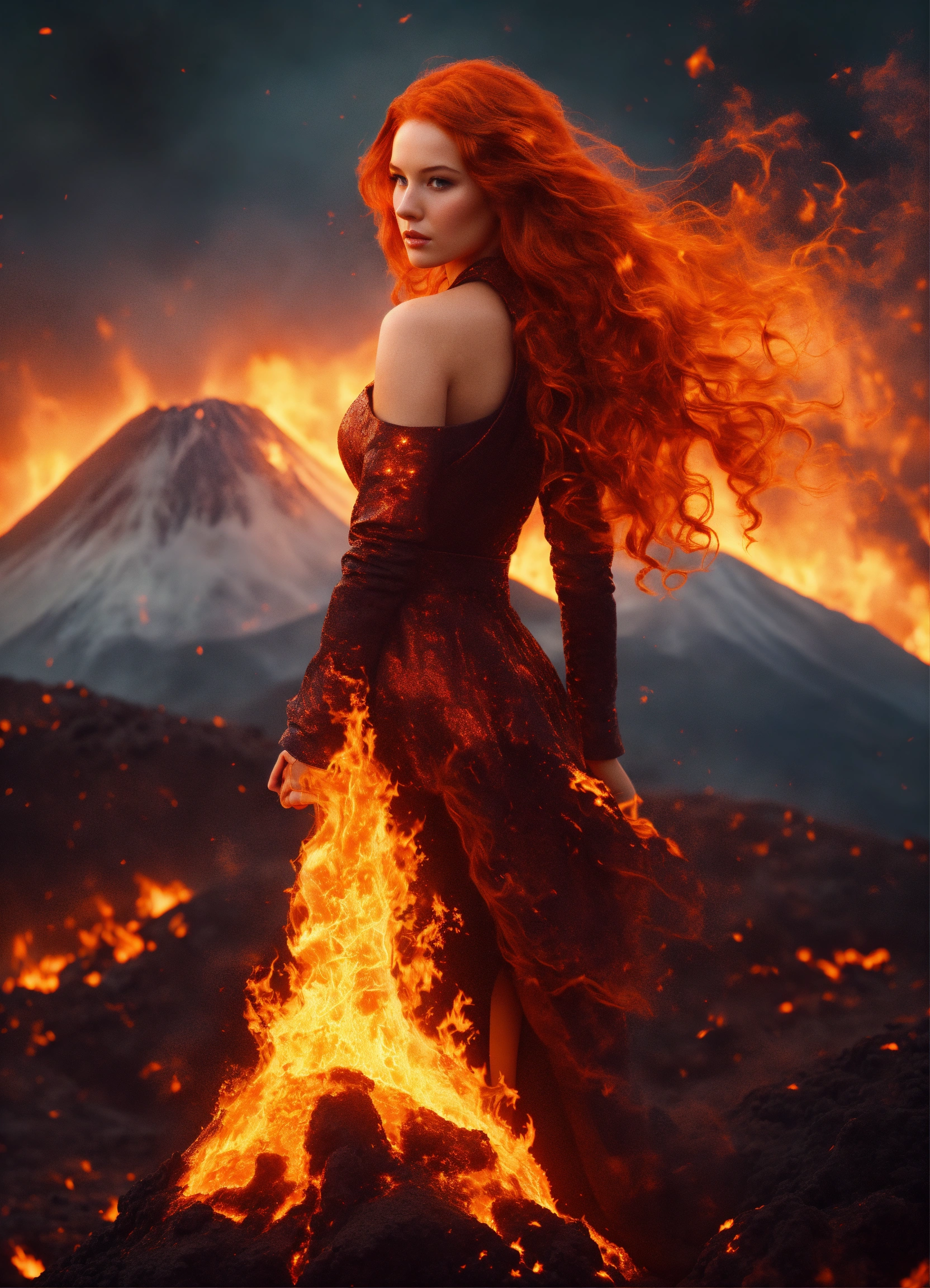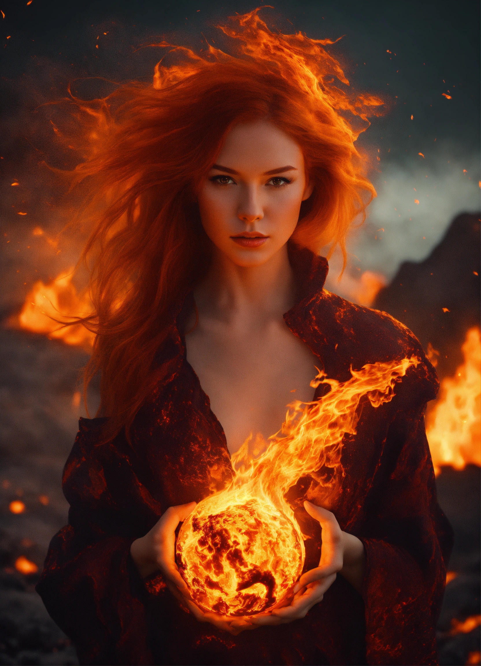 A woman made out of fire and she has hair made of flames, dark, magical, fantasy, digital art pale redhead holding fireball with a volcano and lava in background