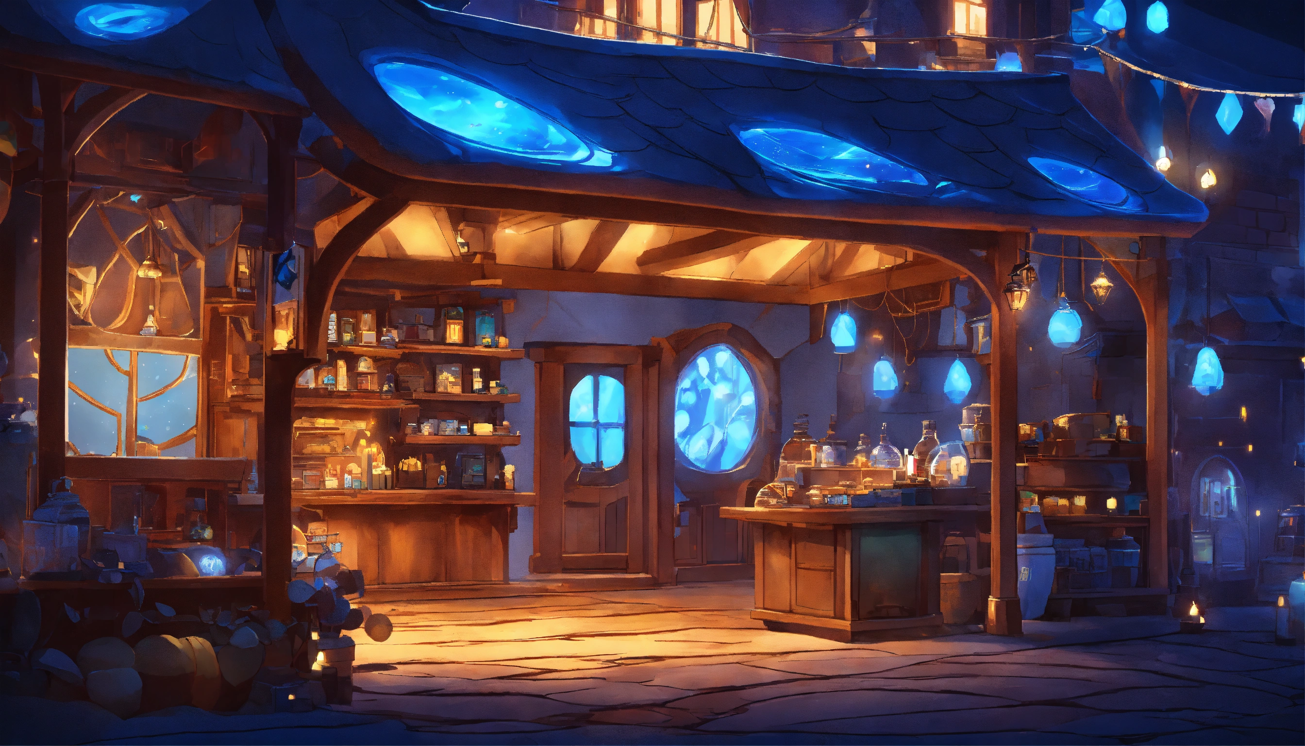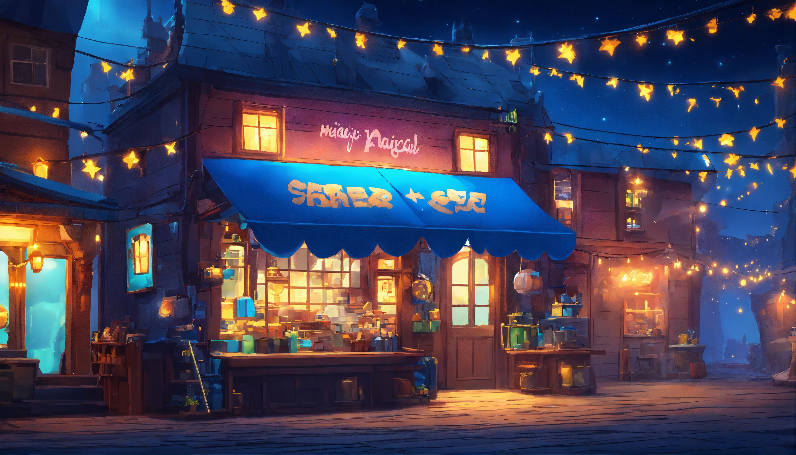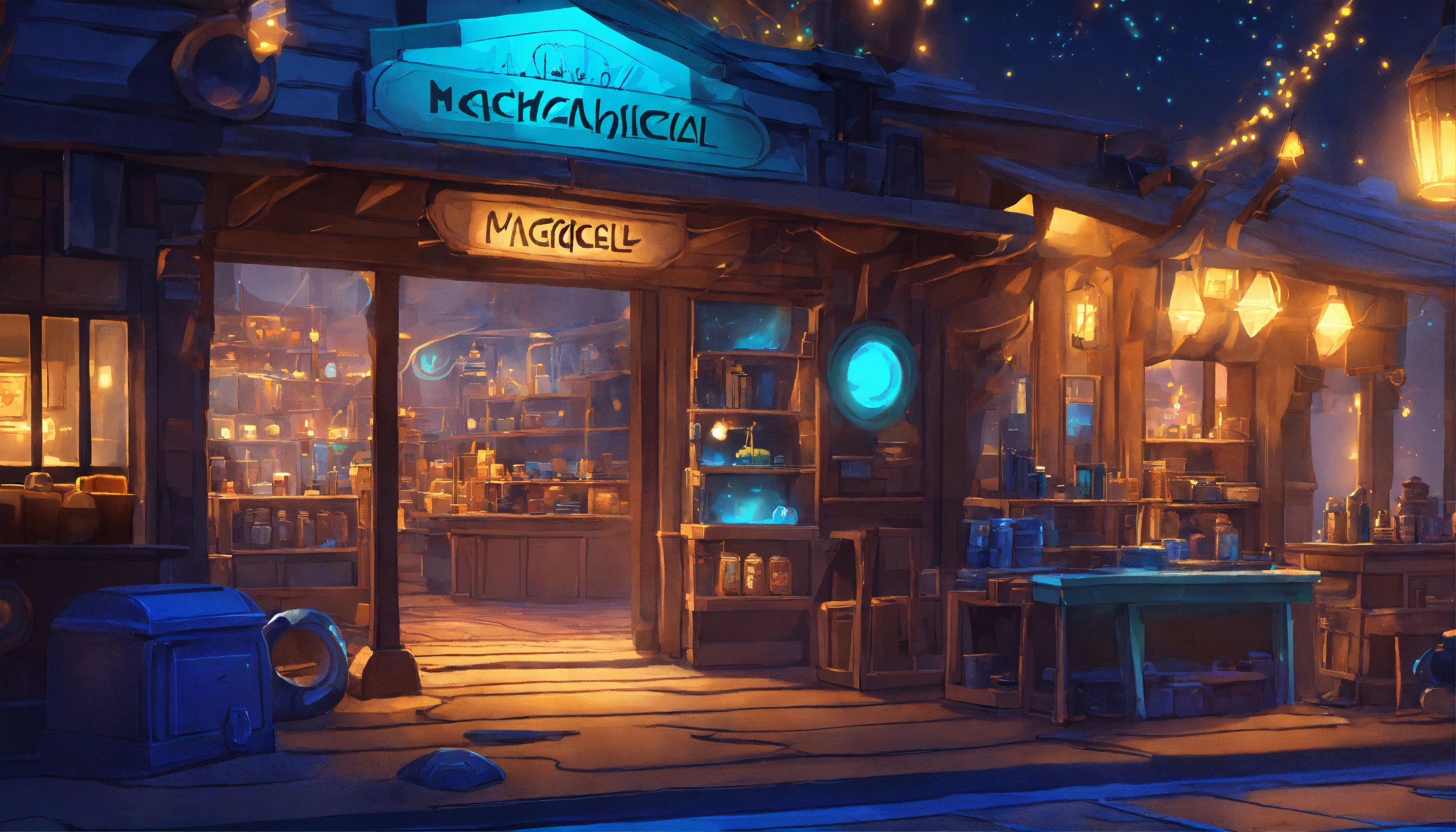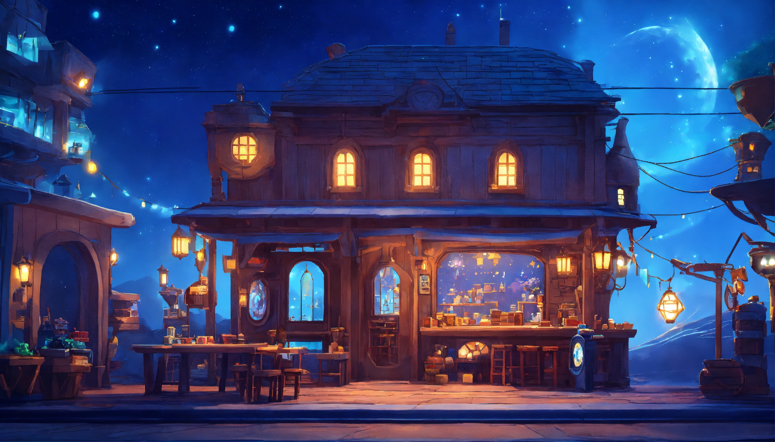 Magical cartoon sci-fi game environment. fantasy. blue, and light. night with stars, machanical shop, outside lights.