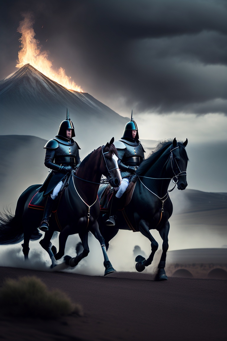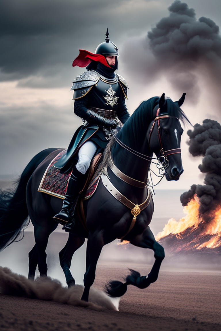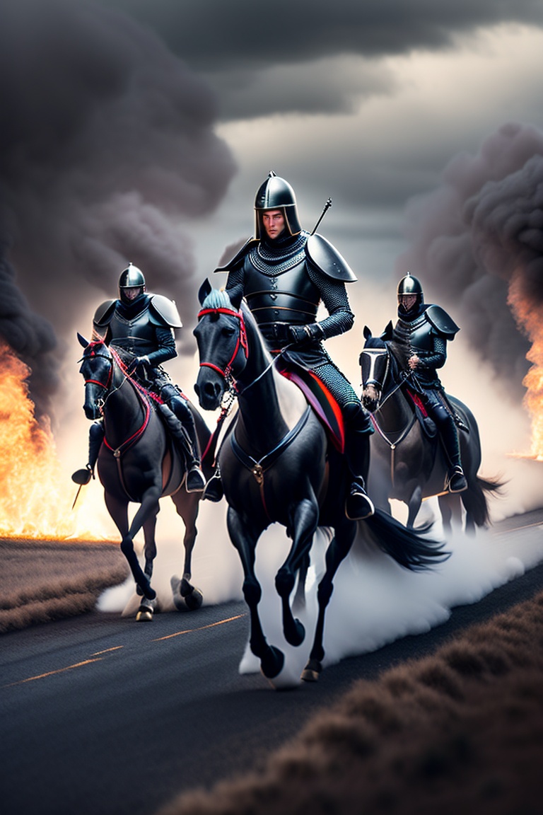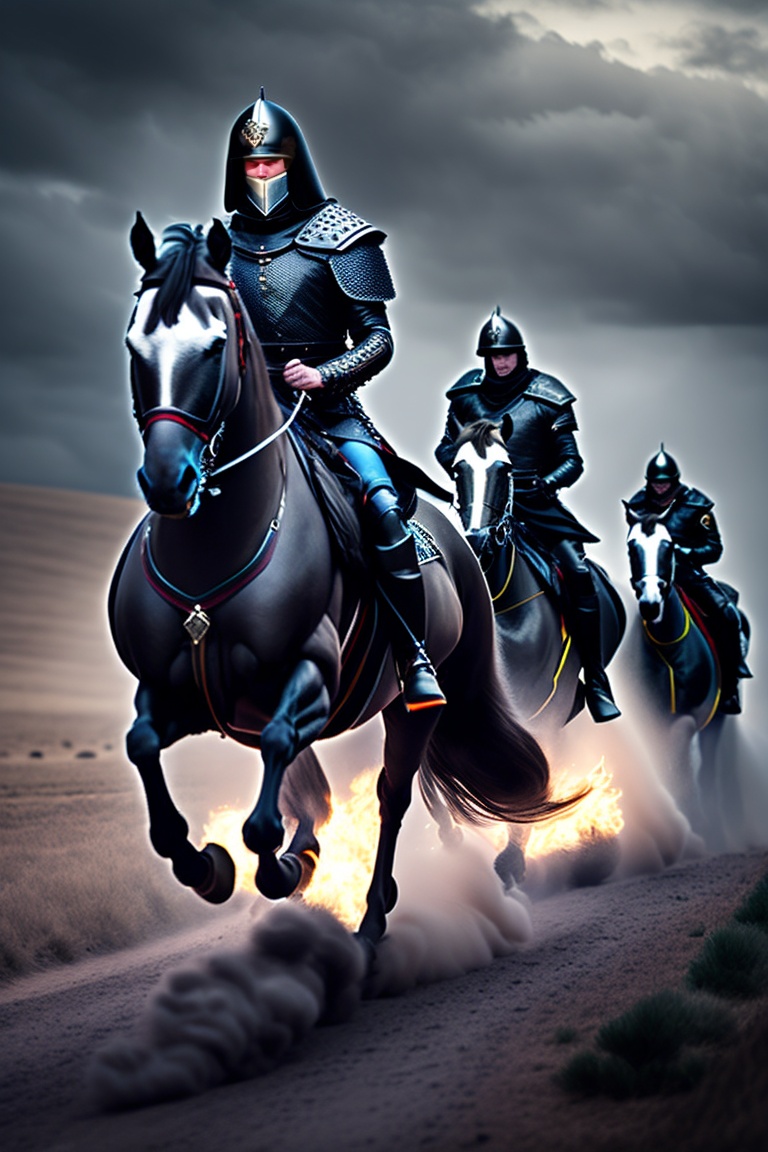Medieval knights with dark black armors riding away on their horses. on the horizon many kilometers away a burning tent camp which they have previously set on fire. it is a dark cloudy creepy day. they ride over a spooky area. dark colors, black horses, black armors
