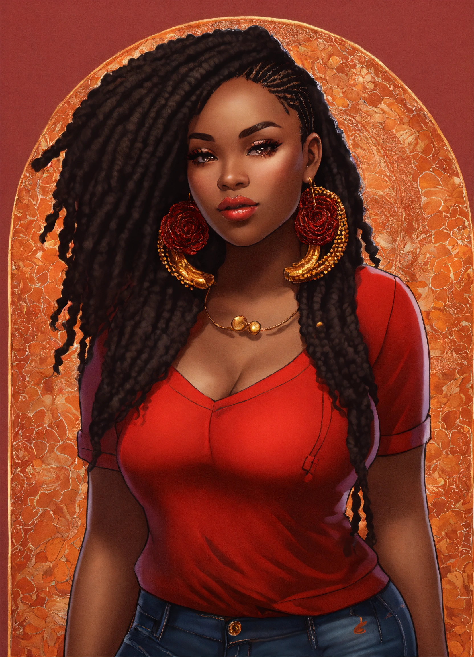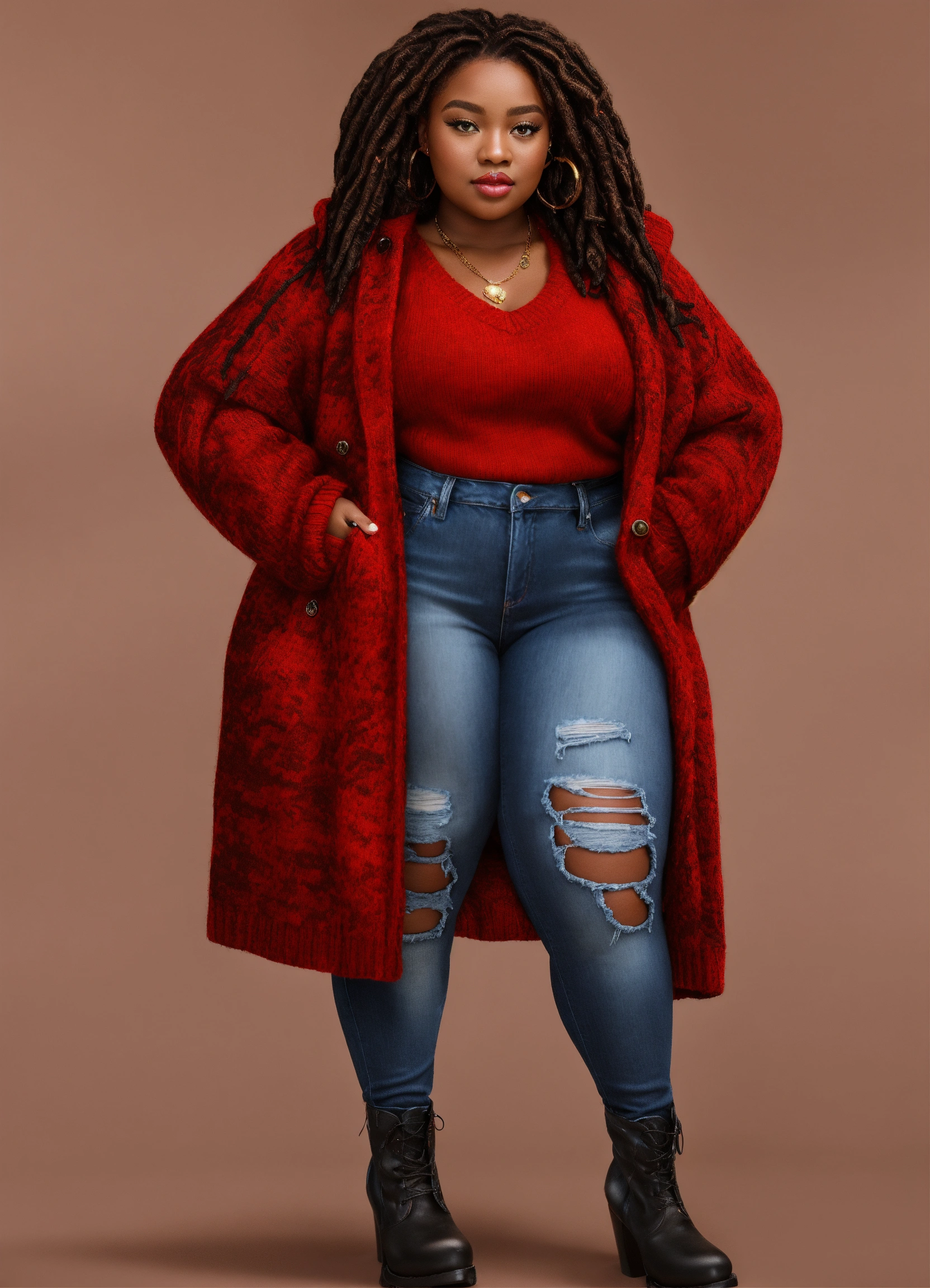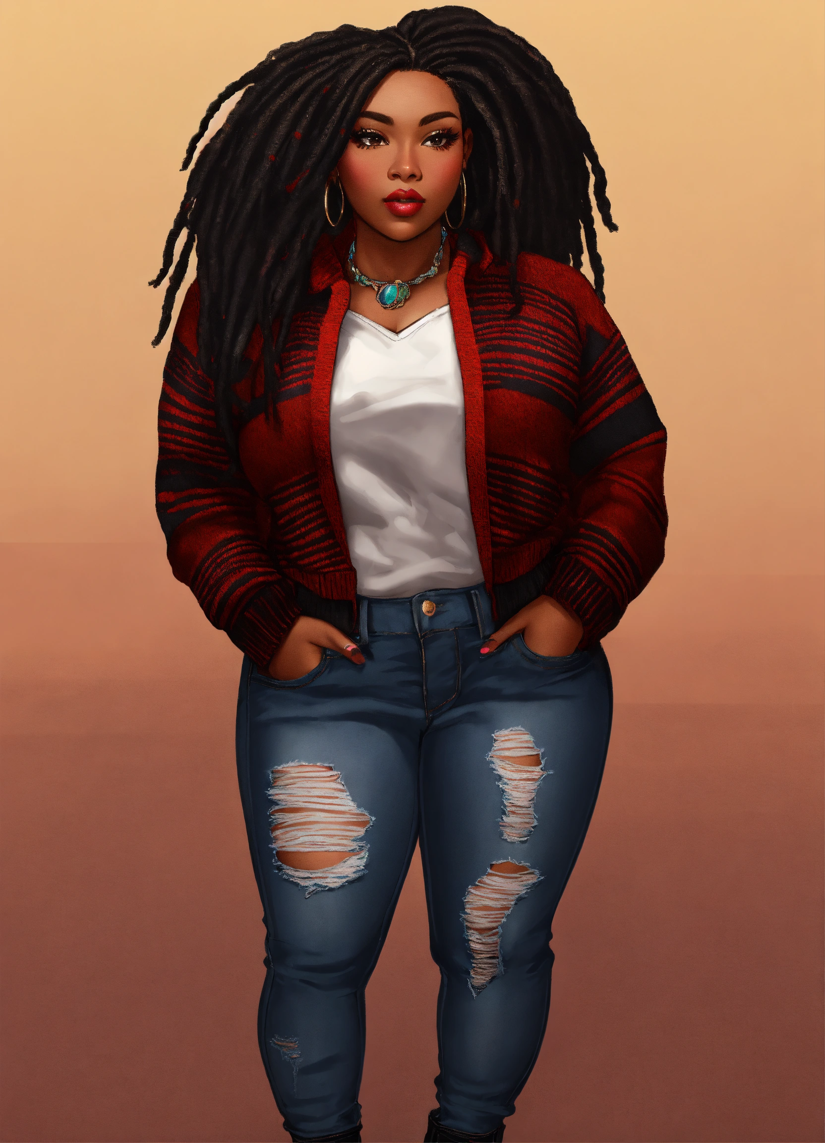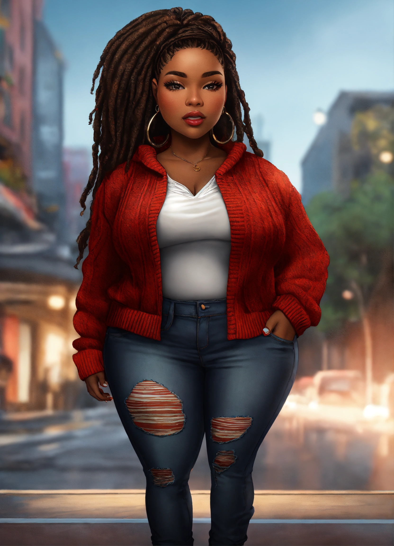 Photorealistic illustration of an exquisite full figured black woman with high cheekbones. in the style of chibi doll. she's attired in a red sweater with bold black patterns, ripped denim jeans, and chic black boots. her luscious dark brown hair is styled in colored dreadlocks, creating a stunning visual. the full-body image accentuates her poised stance and the harmonious blend of her outfit's colors.