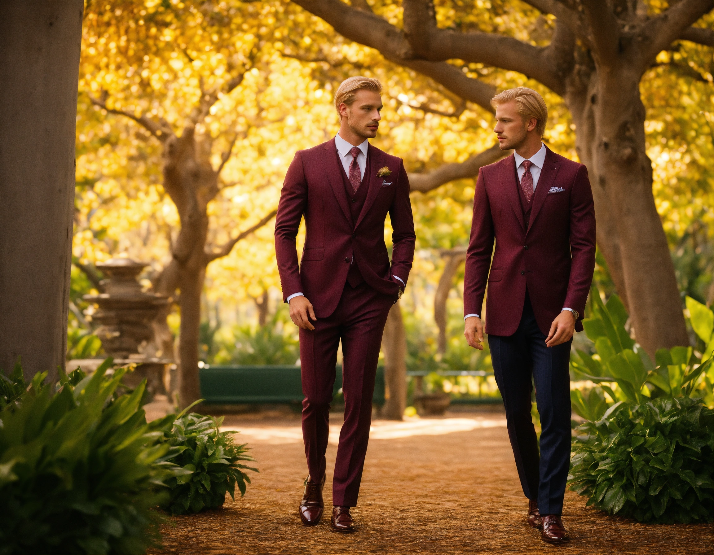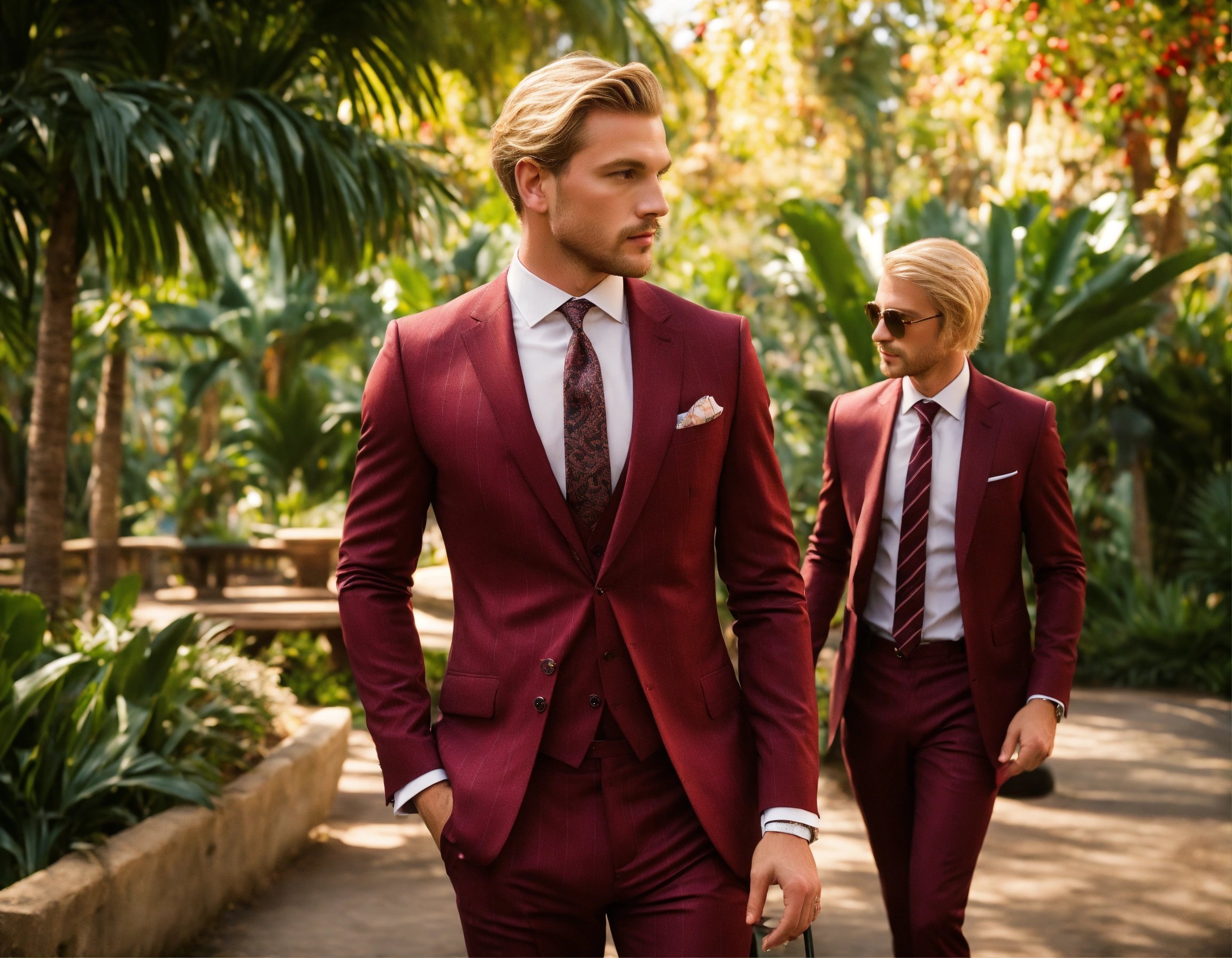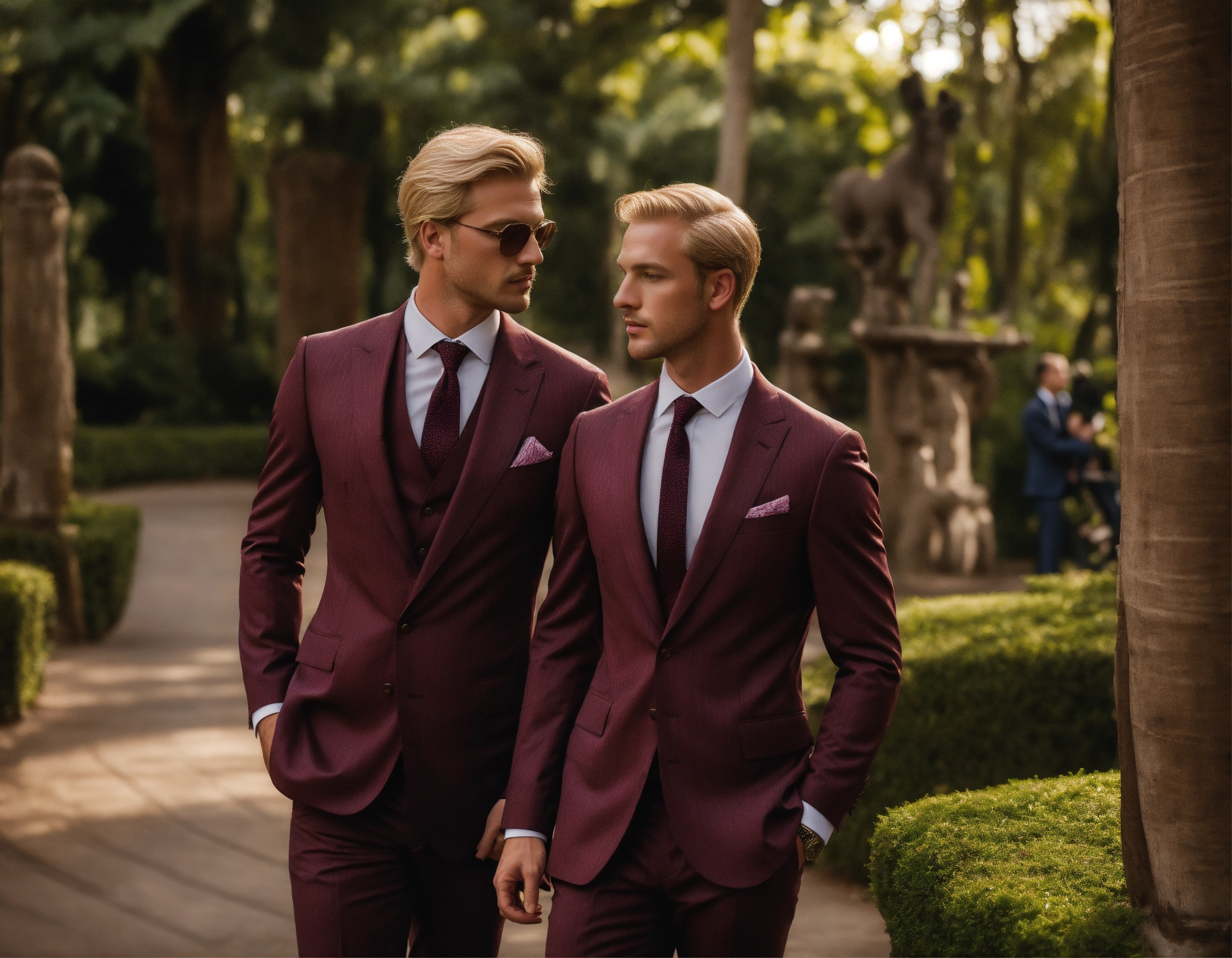 Two blonde gentlemen in dark burgundy pinstripe suit