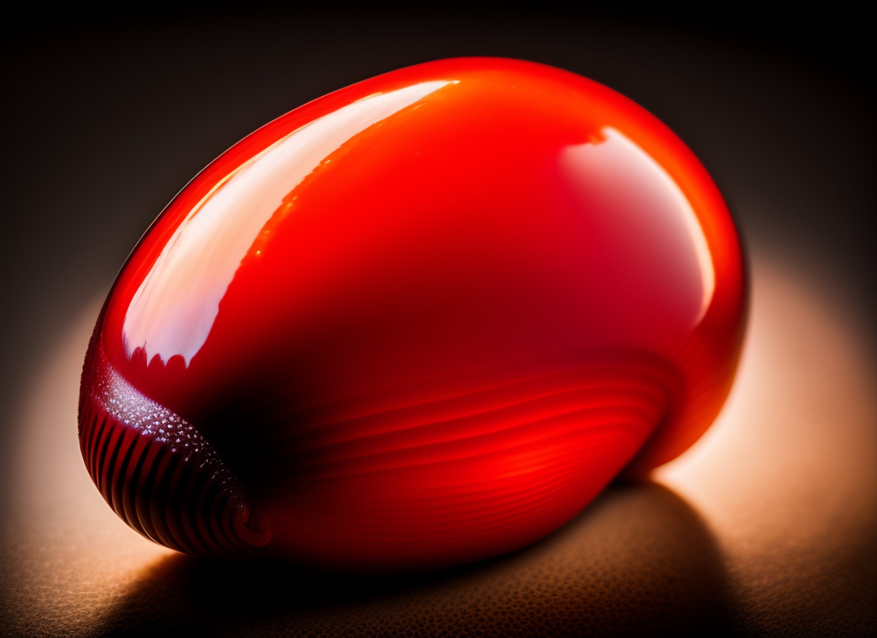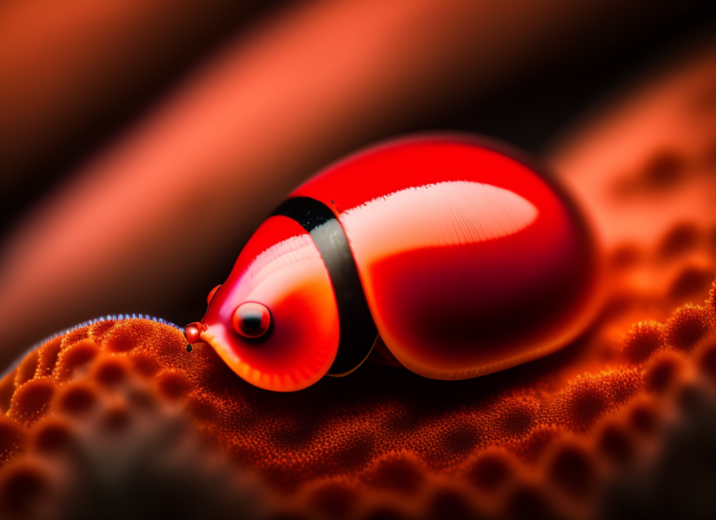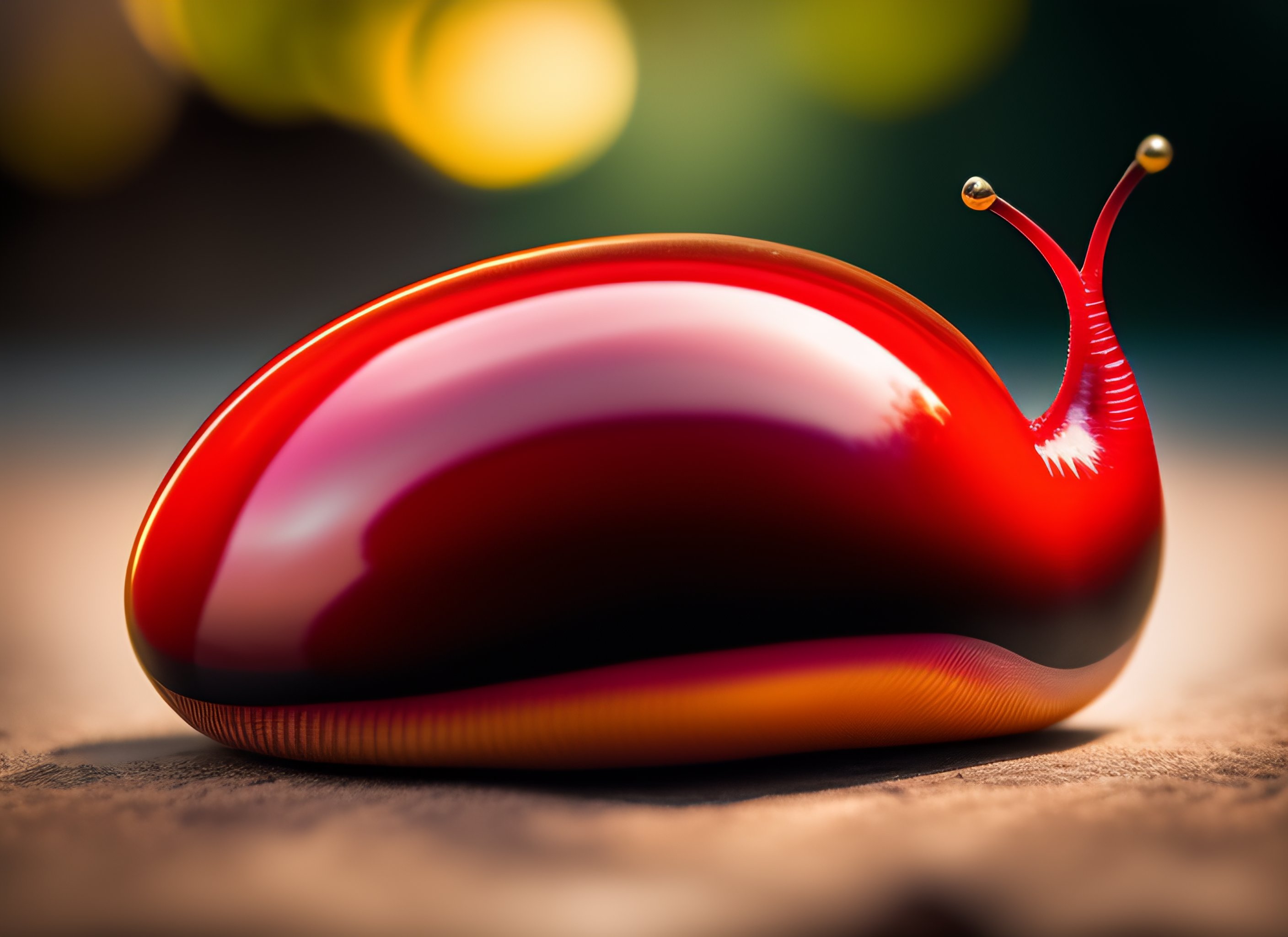 A photograph of a glossy red snail with huge black eyes, enormous, bumpy, low depth of field, rule of thirds, complex, 8k, highly detailed, canon 1.2f