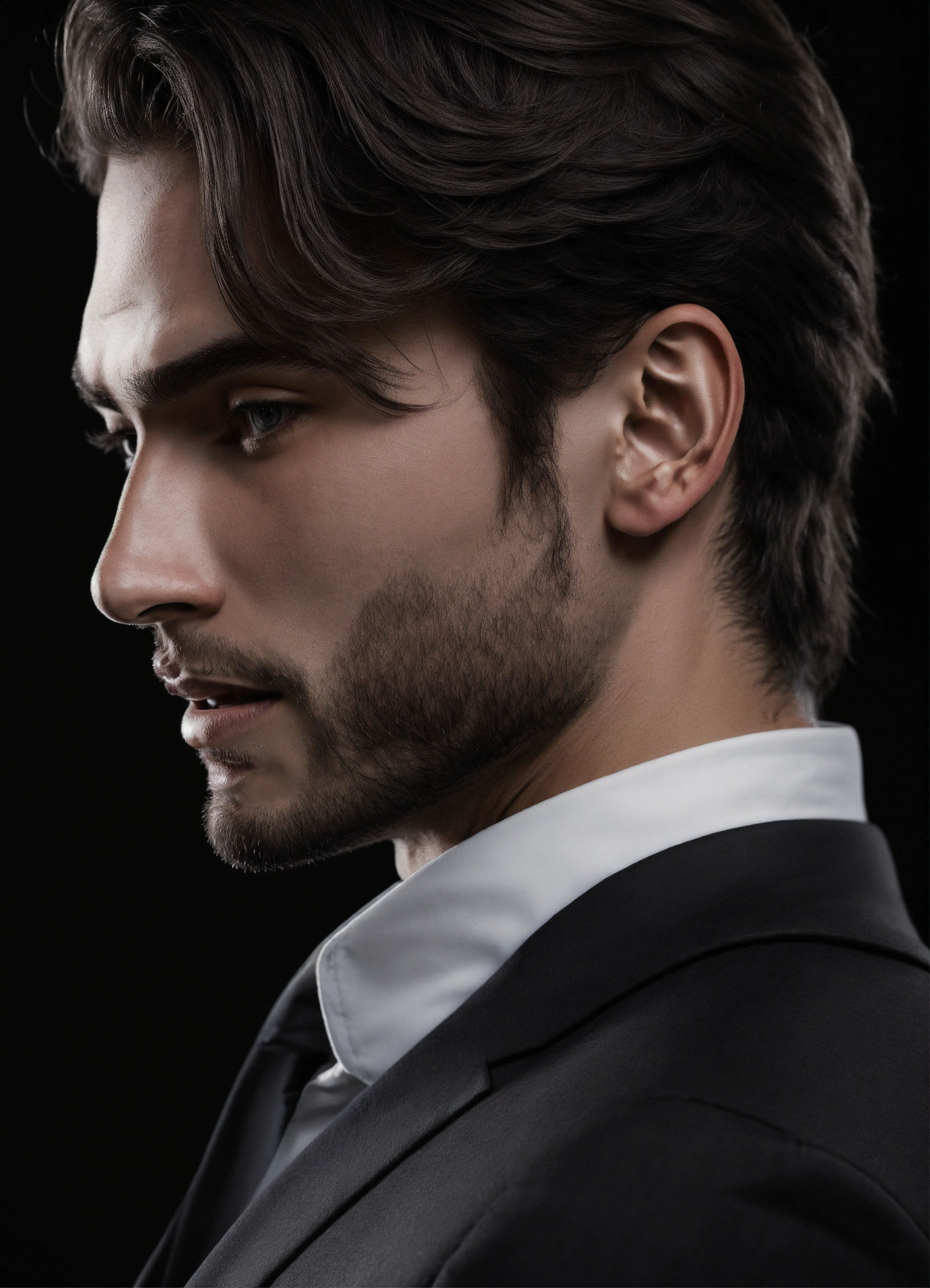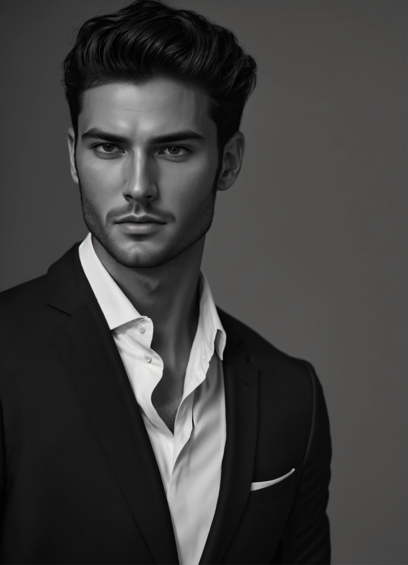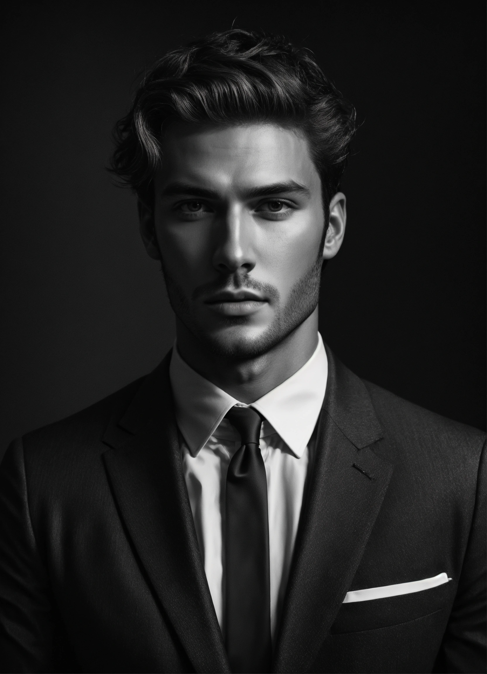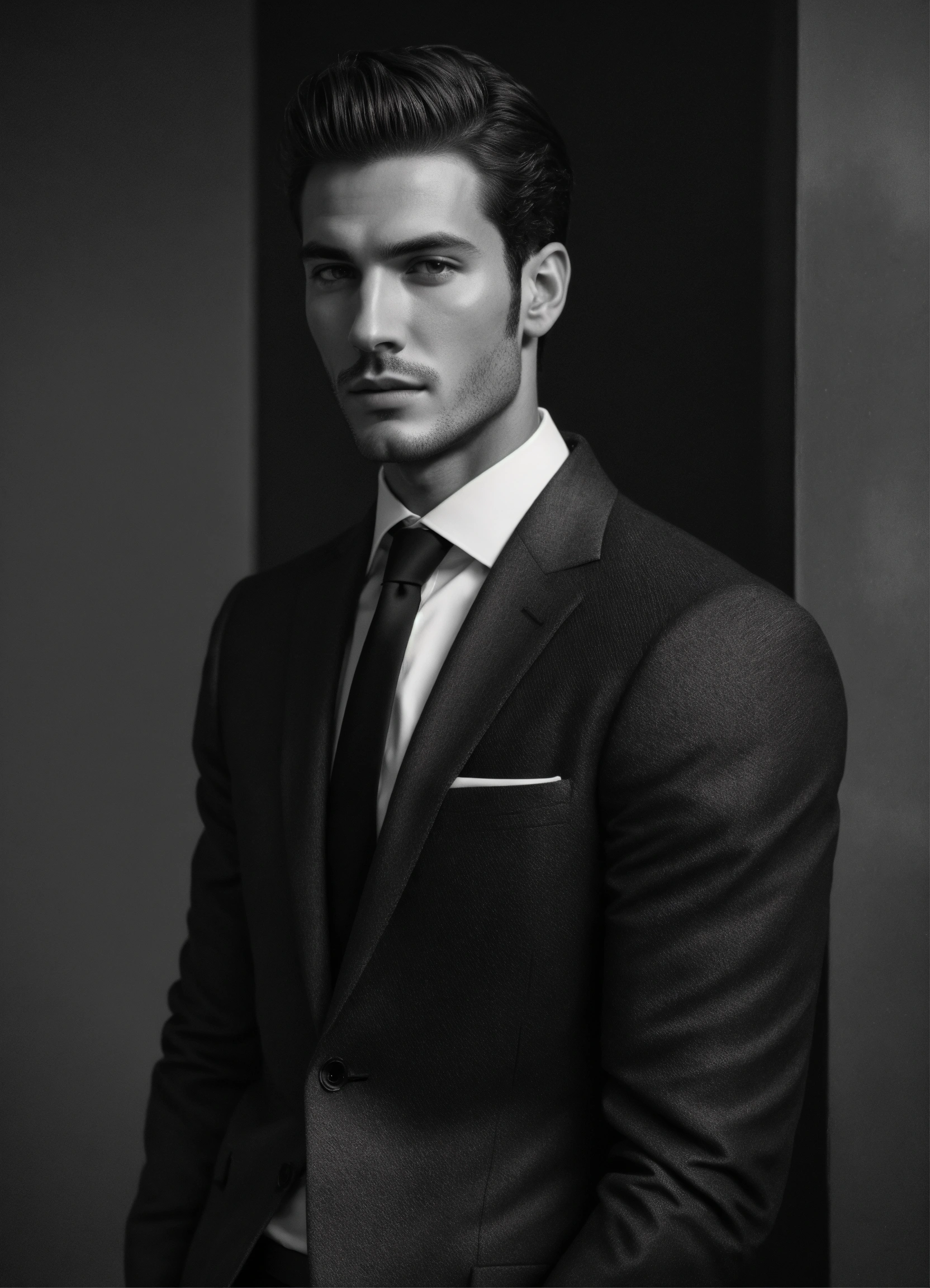 Photo of an italian male model, black and white, photorealistic, poster, not painted, very detailed faces, skin with pores, 4 k, position from left to right, model looking from left to right over his shoulder, dark suit, black plain background, skin not smoothed, face from left to right