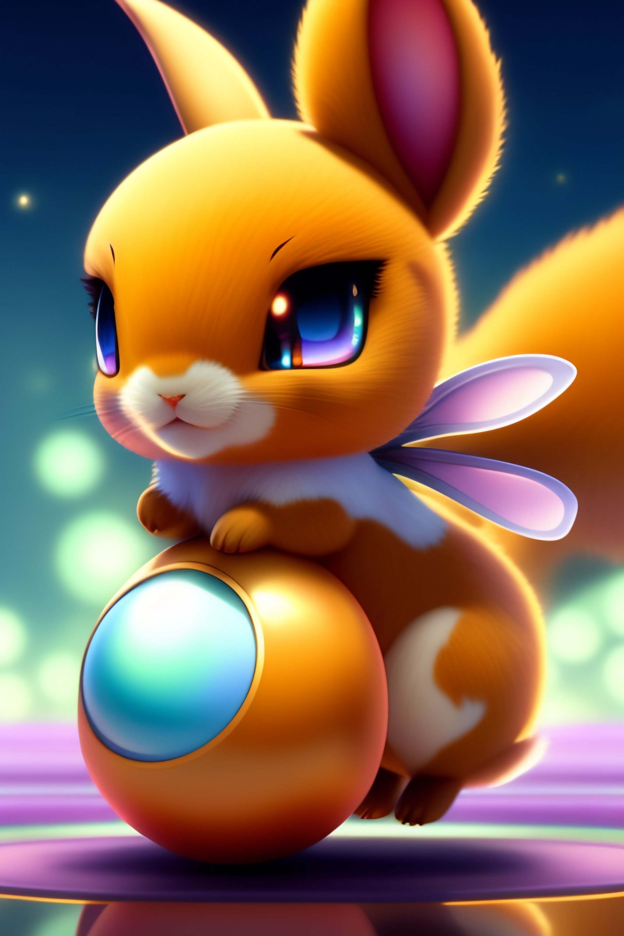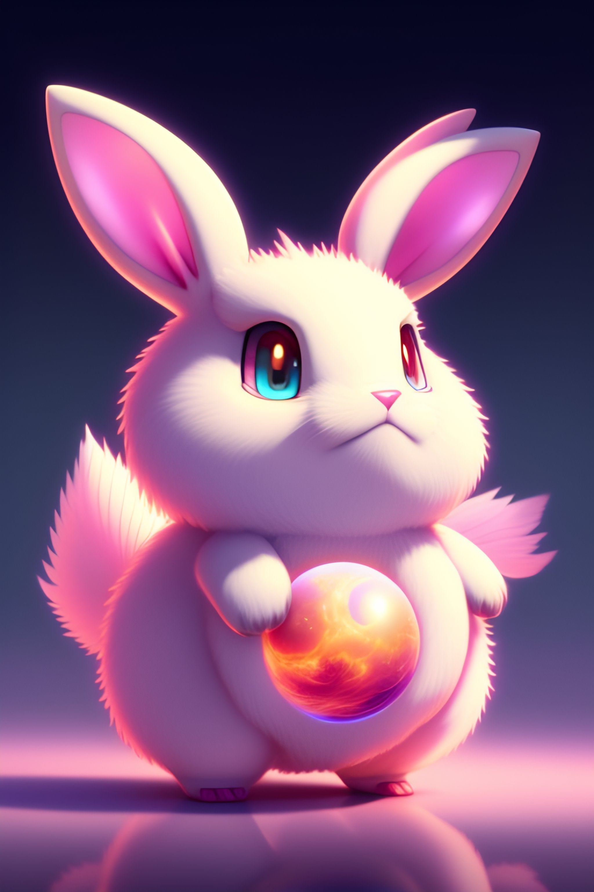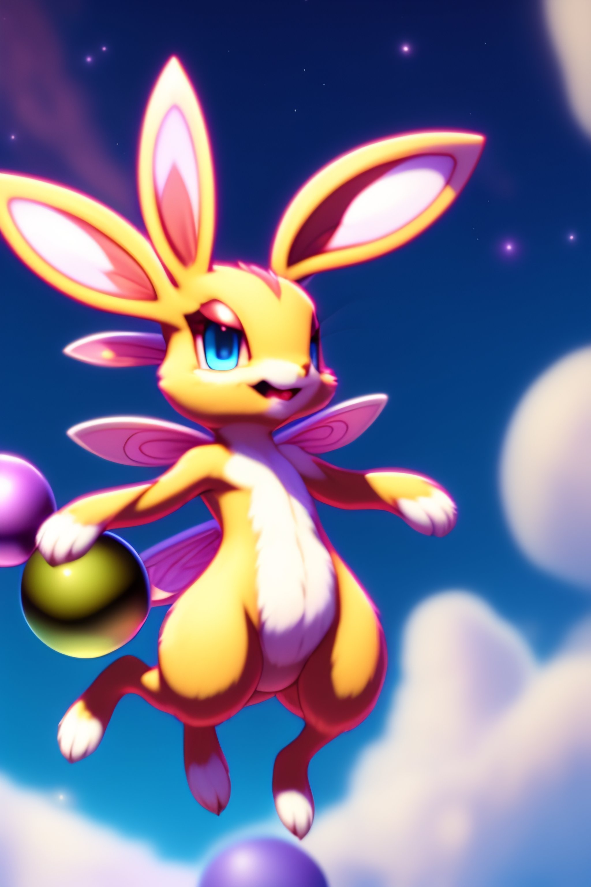 A fairy type legendary pokémon resembling a bipedal, floating rabbit that is cartoony with planets orbiting it’s head, award winning manga pokemon