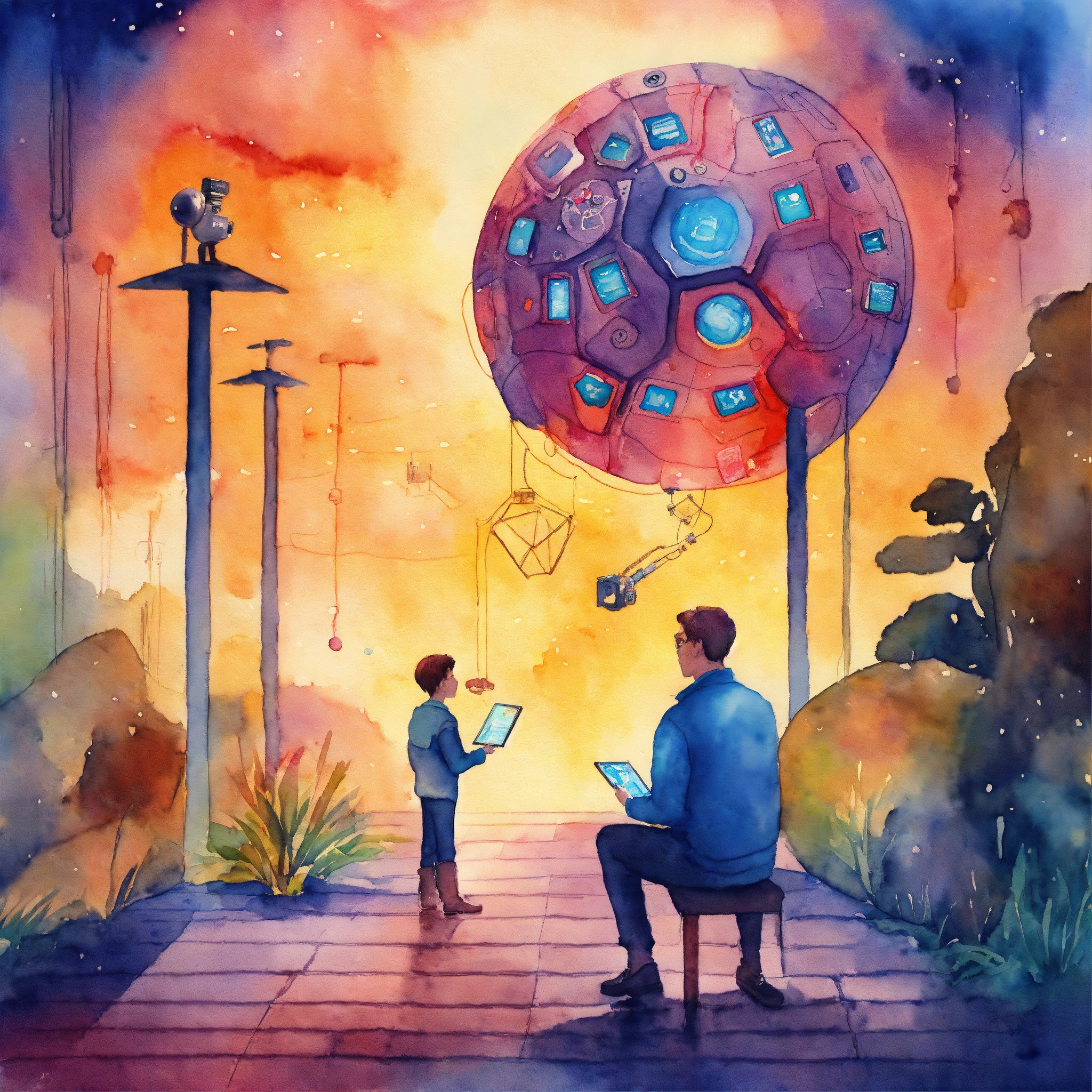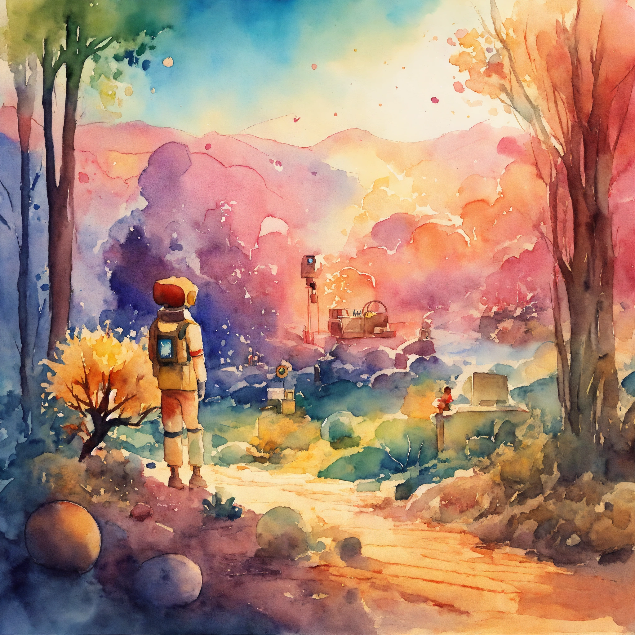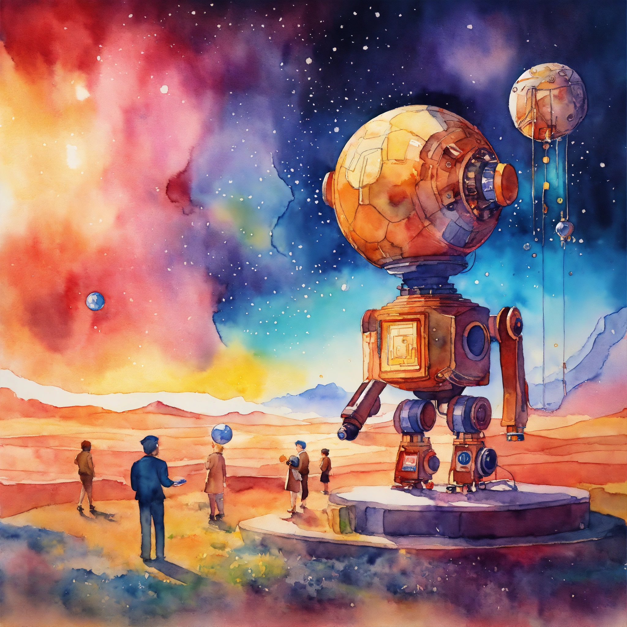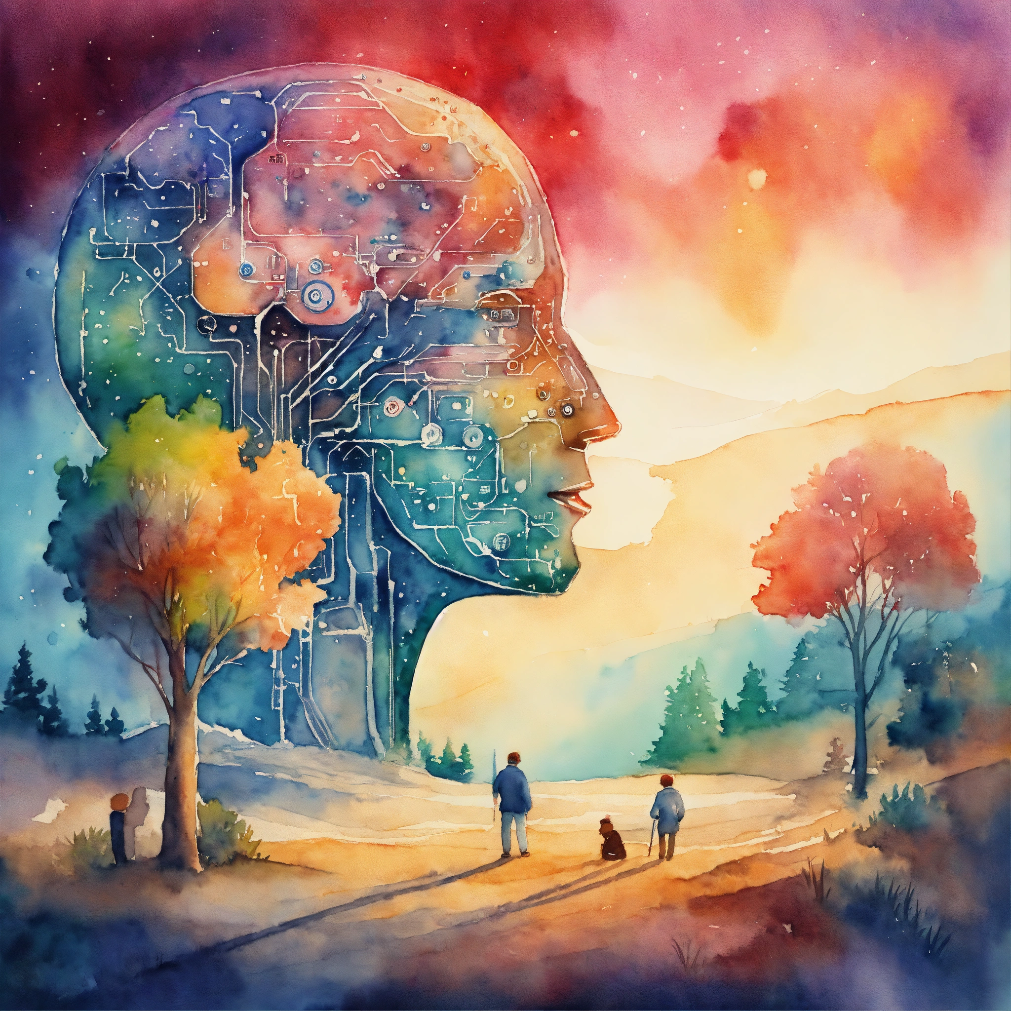 Watercolor art illustration of a scene depicting the discovery of artificial intelligence, vibrant colors, educational poster design, watercolor