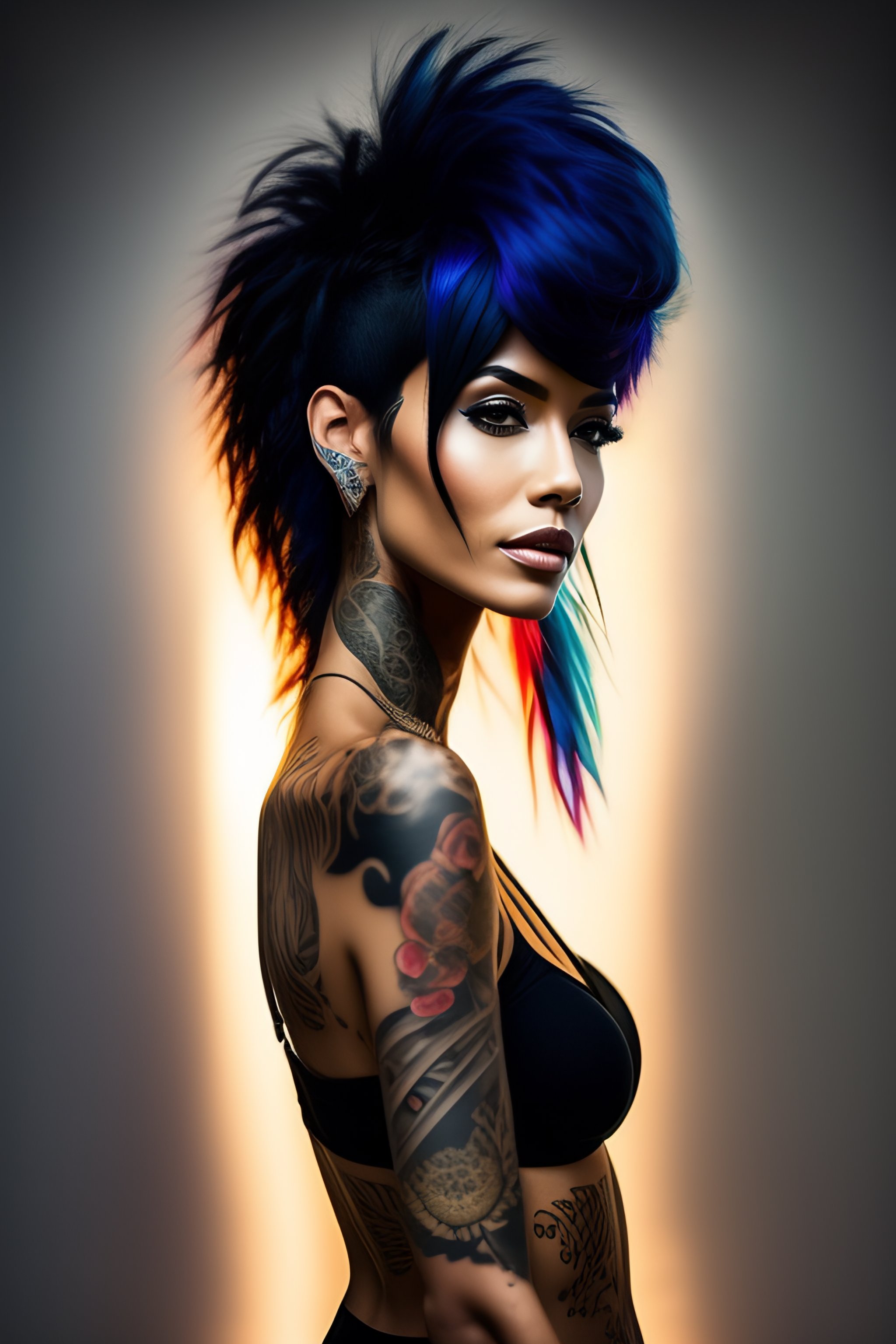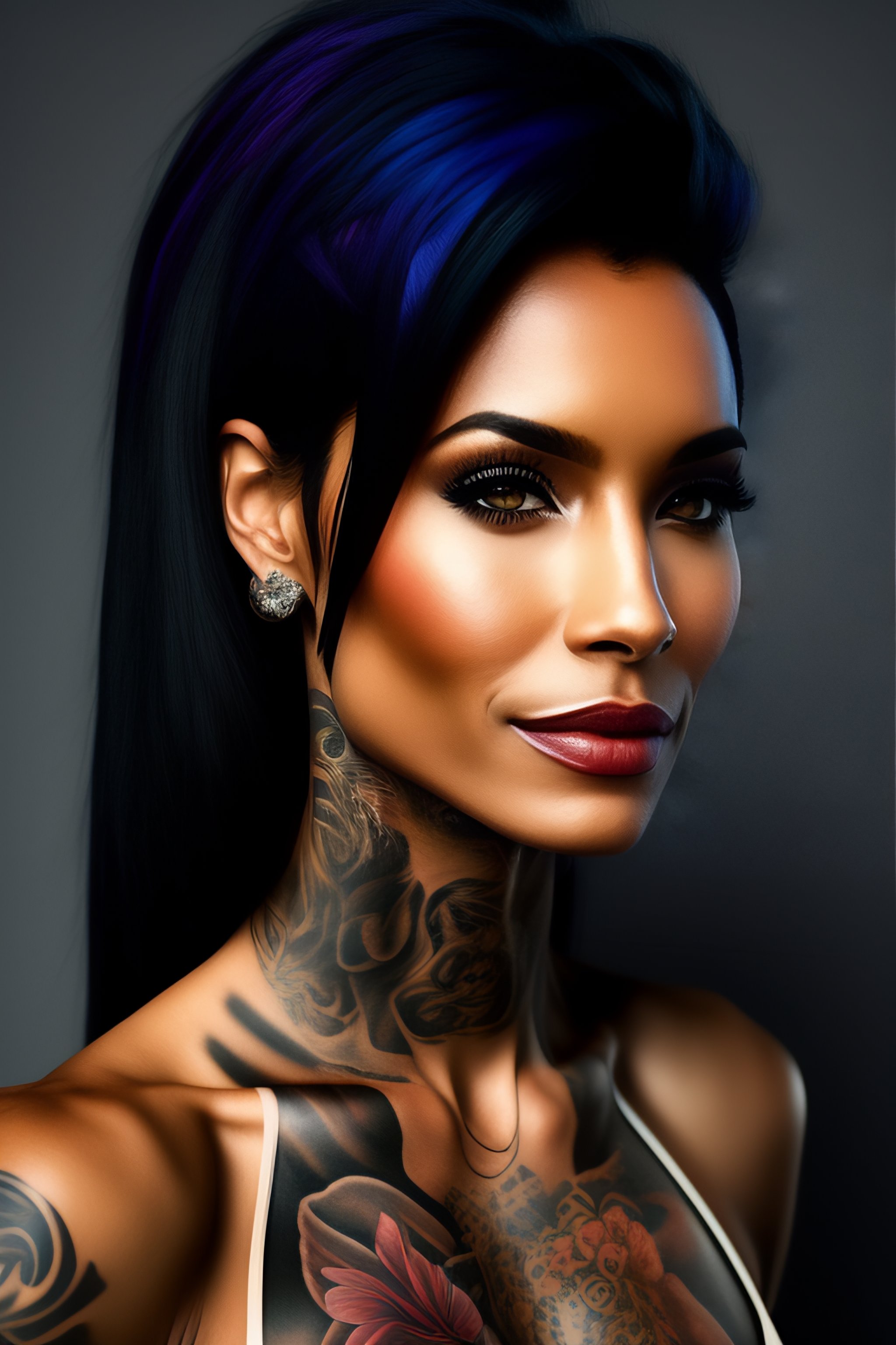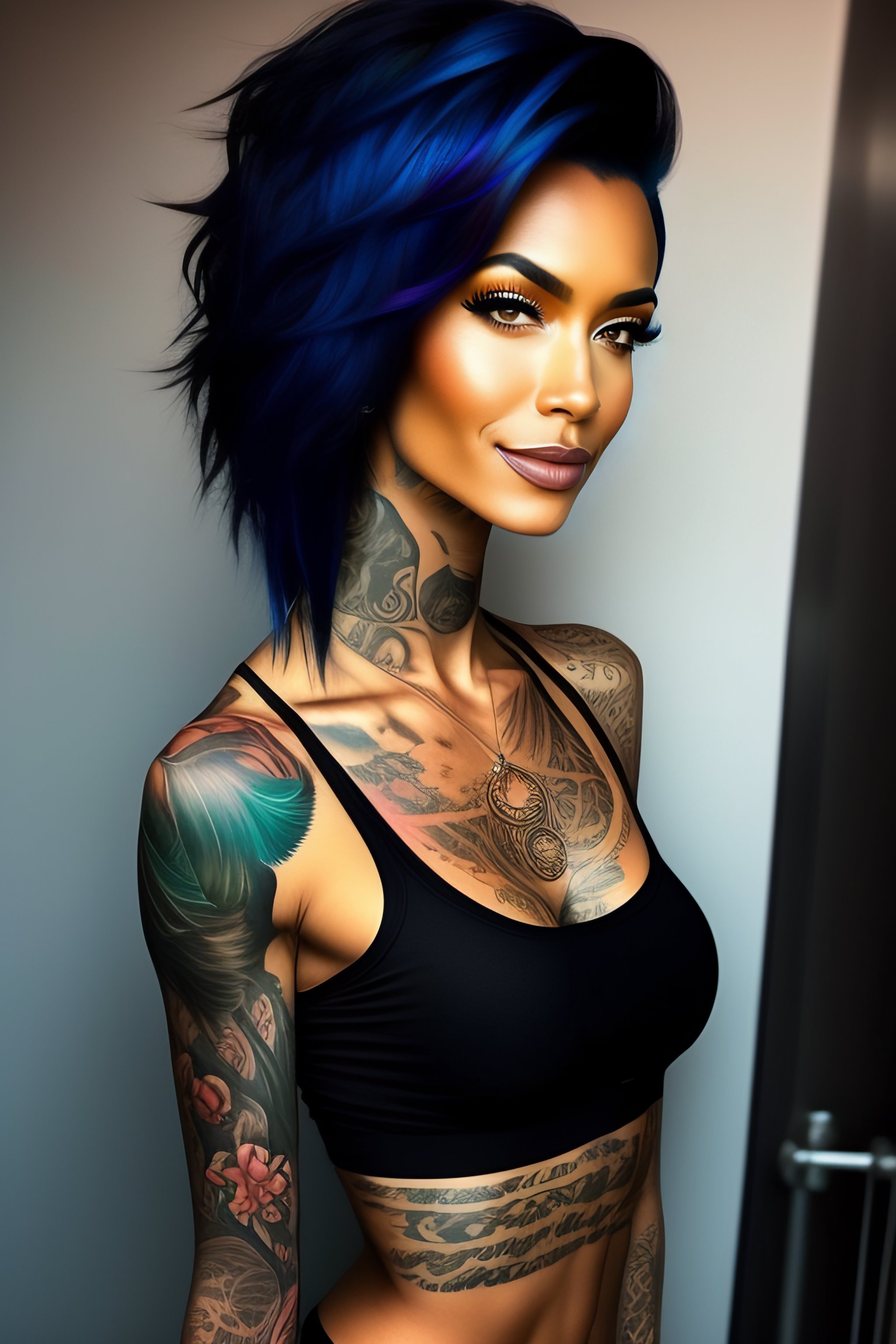 Skinny tattooed female with fit body and black hair with minimal blue streaks