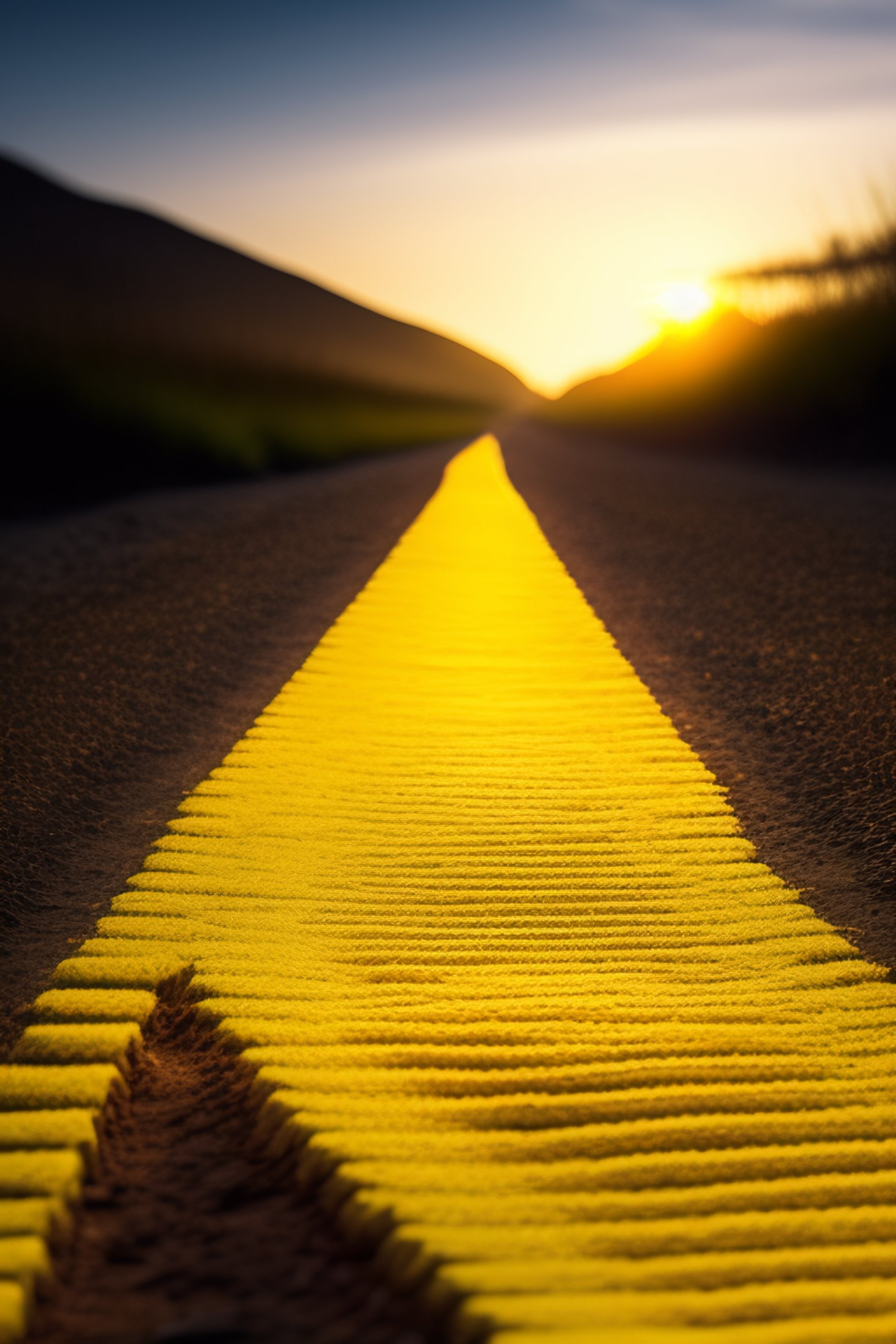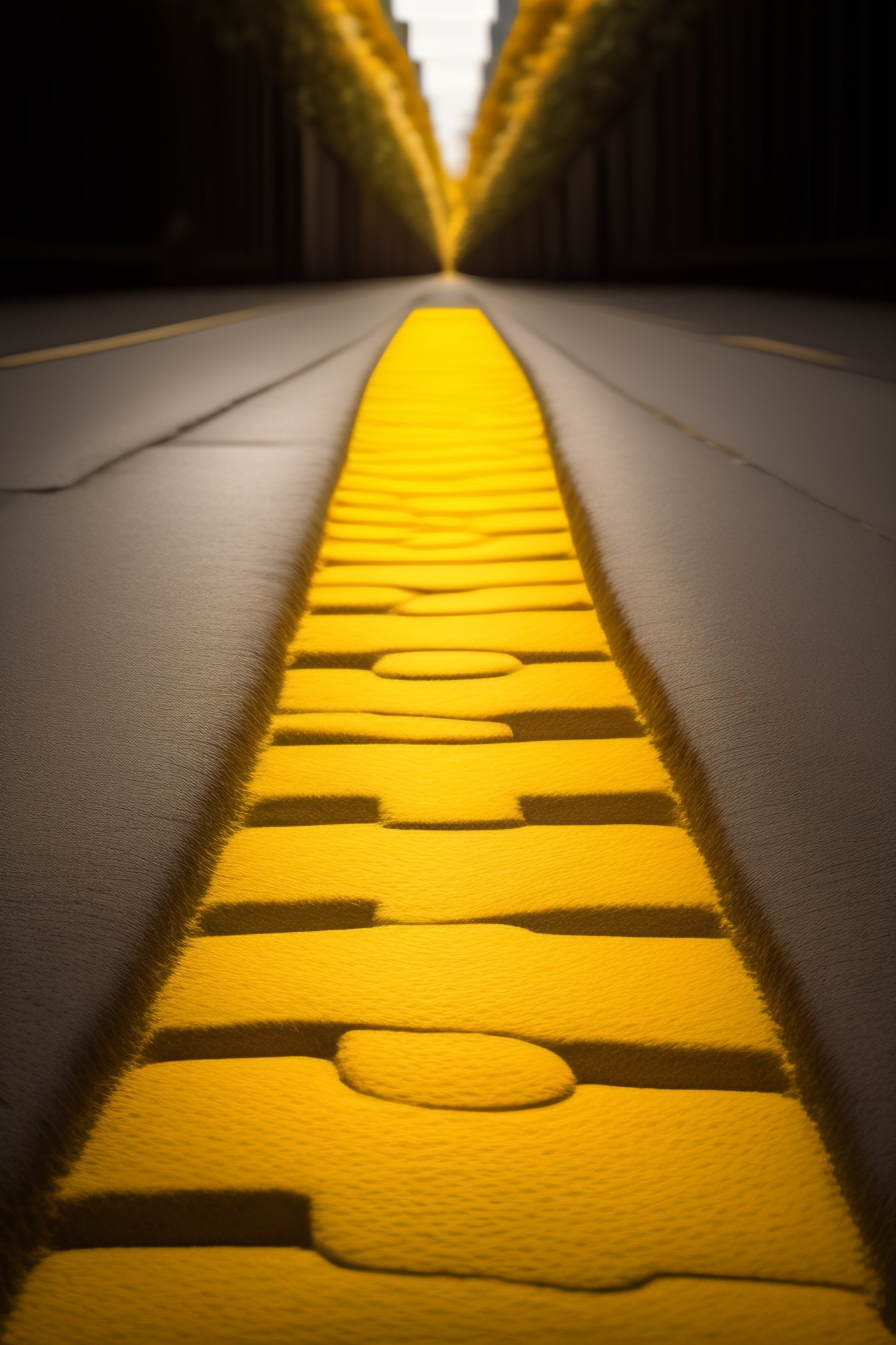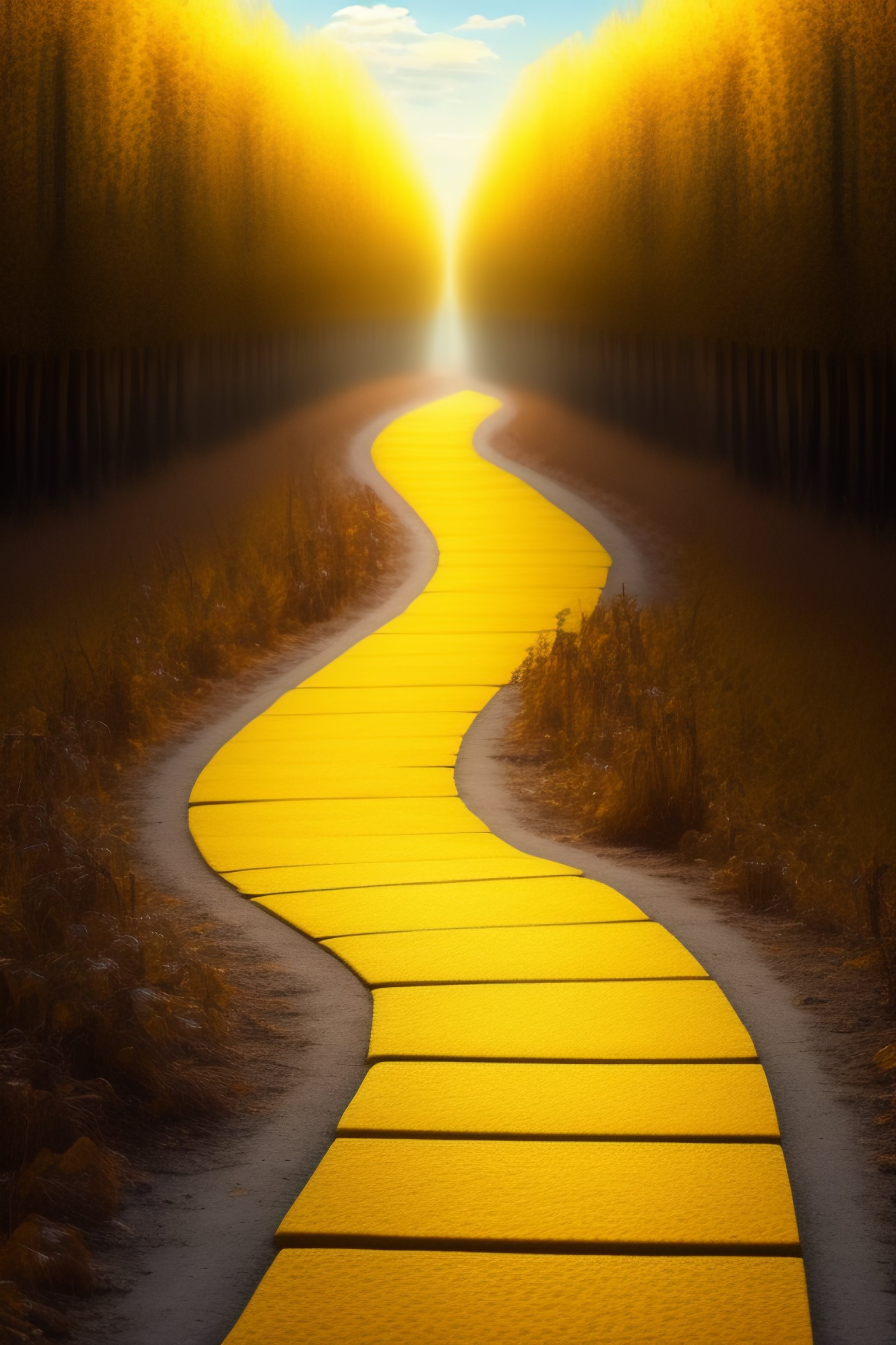 A yellow brick road stretches out before the viewer, its path leading to unknown destinations. yellow journalism can be seen in the background, its sensational headlines grabbing the attention of those who pass by. the image is a metaphor for the many different facets of life, with each object representing something deeper and more meaningful.