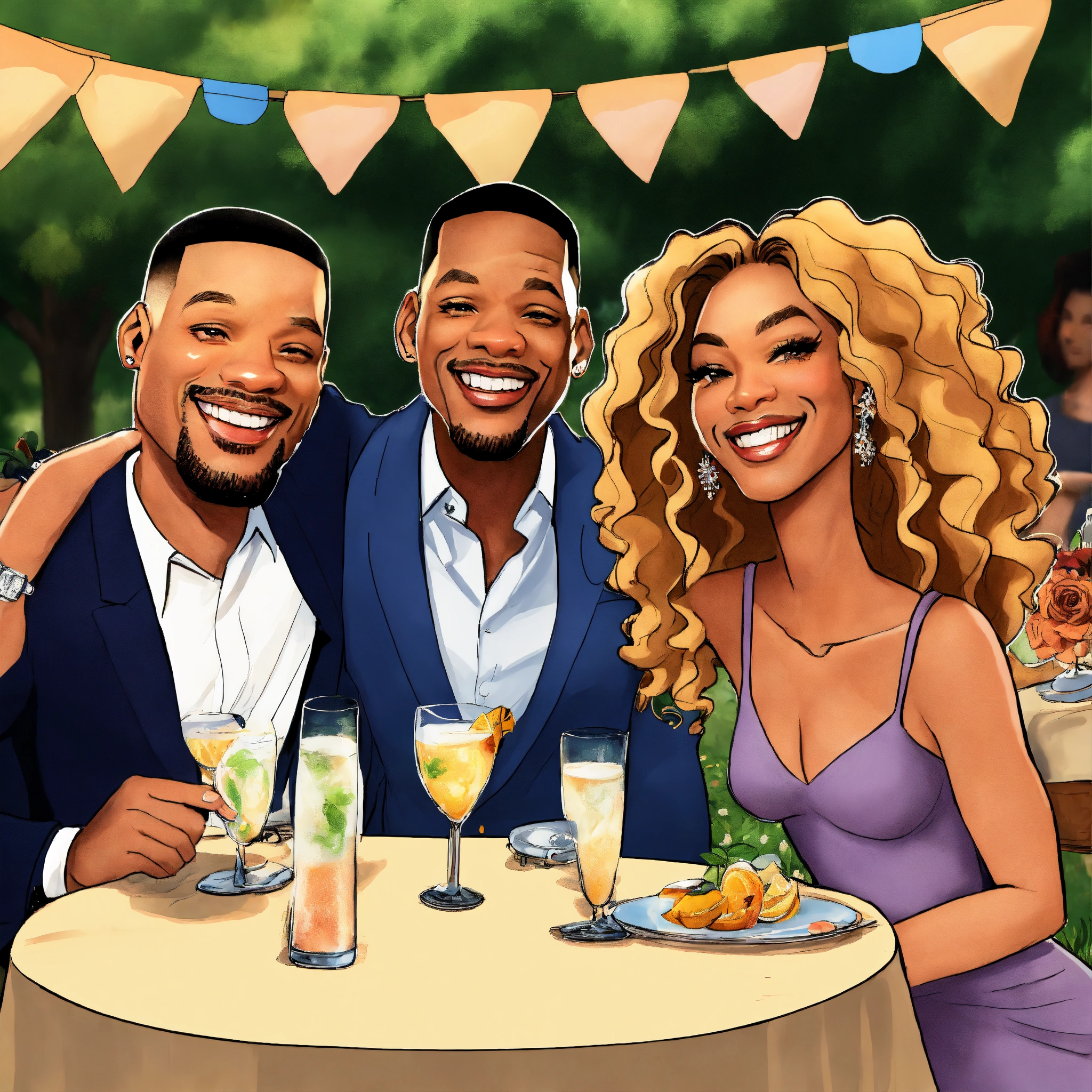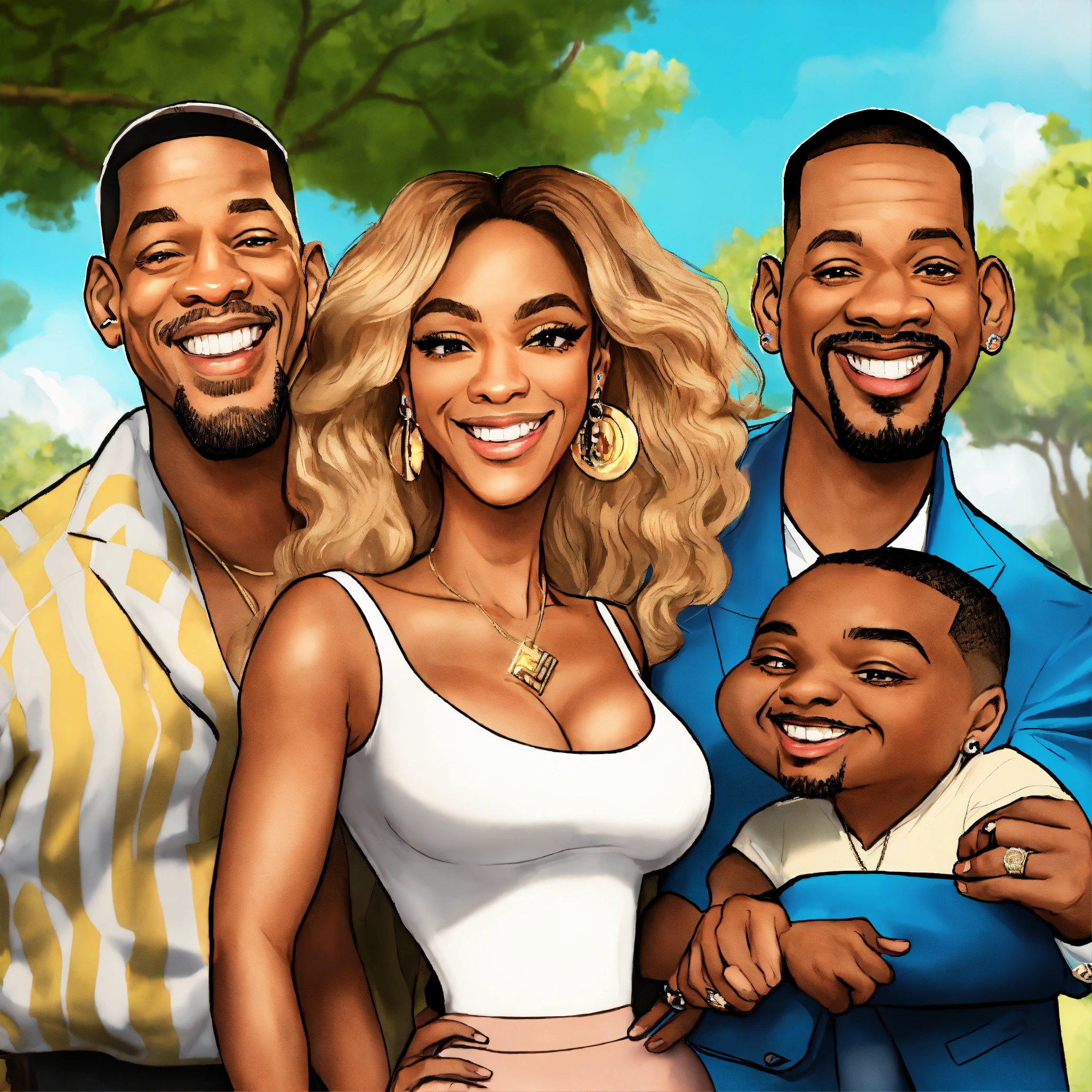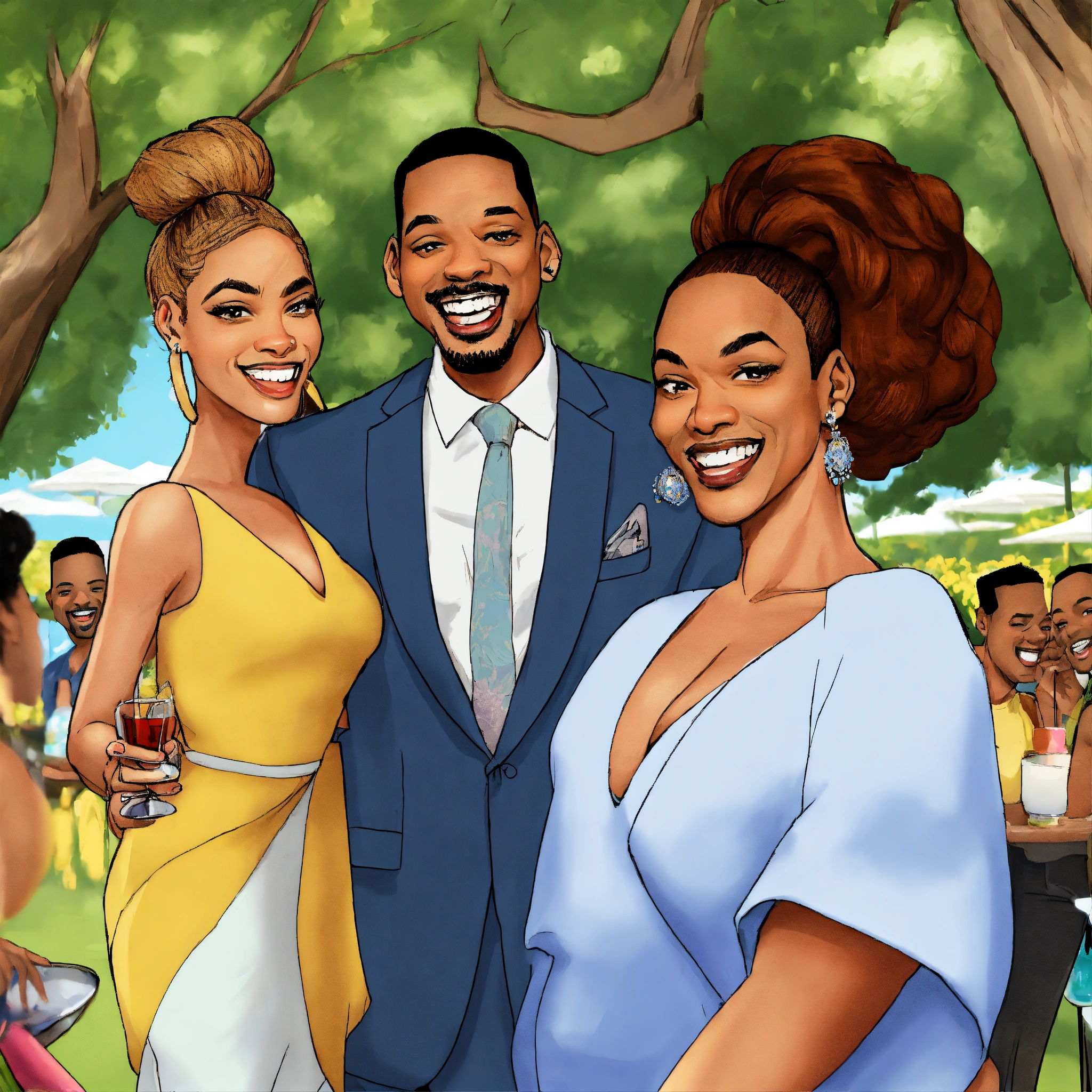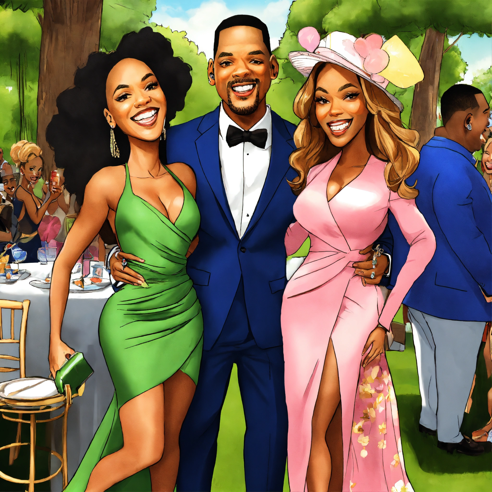 Beyonce jay-z will smith jada pinkett cartoon caricatures at outdoor party laughing cartoon background