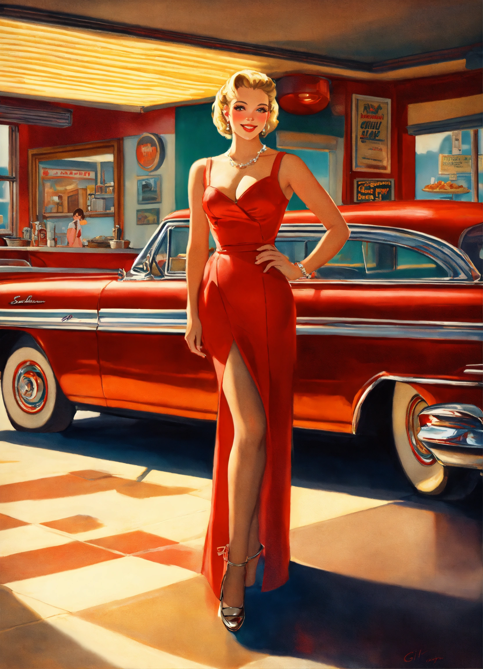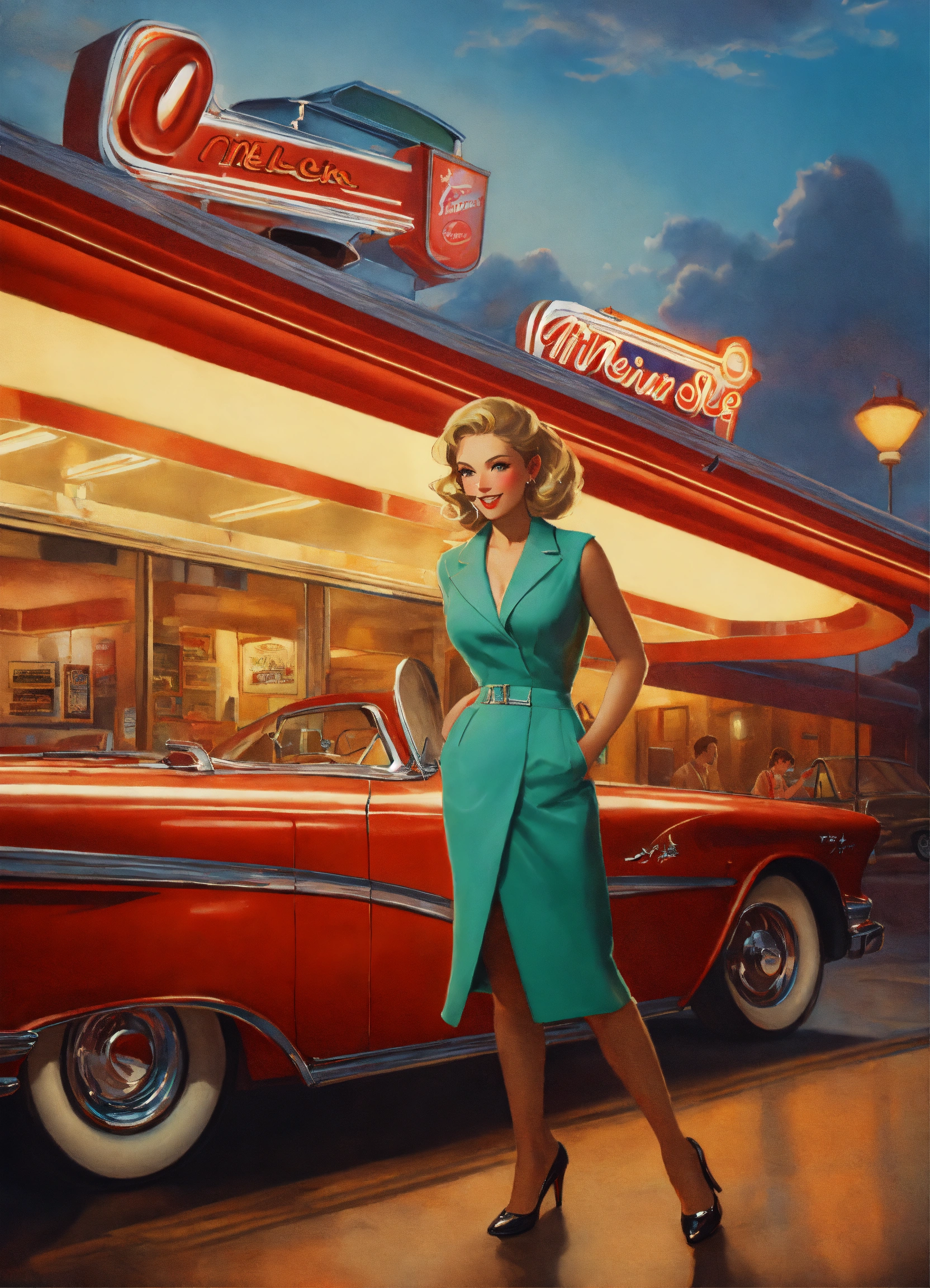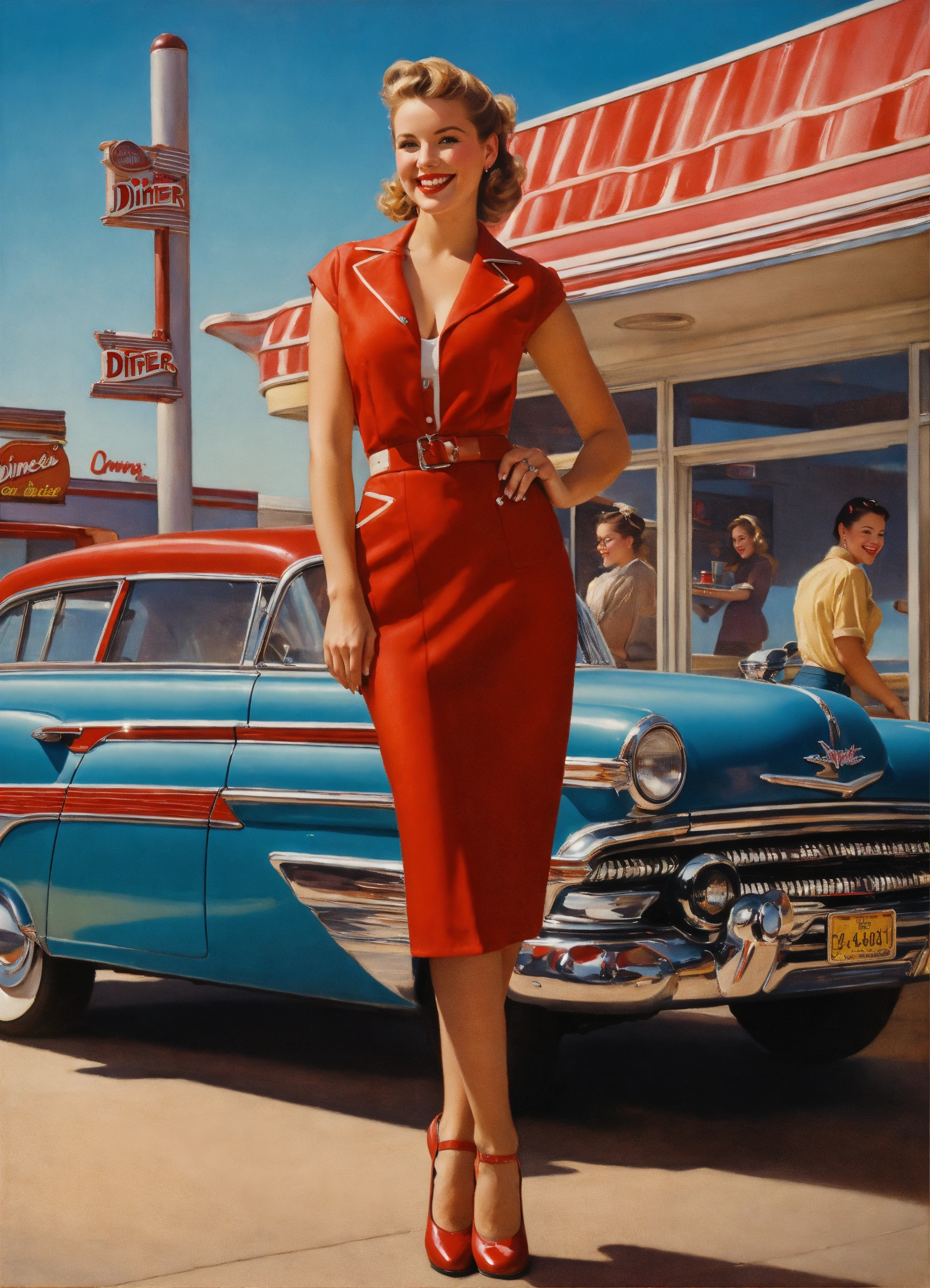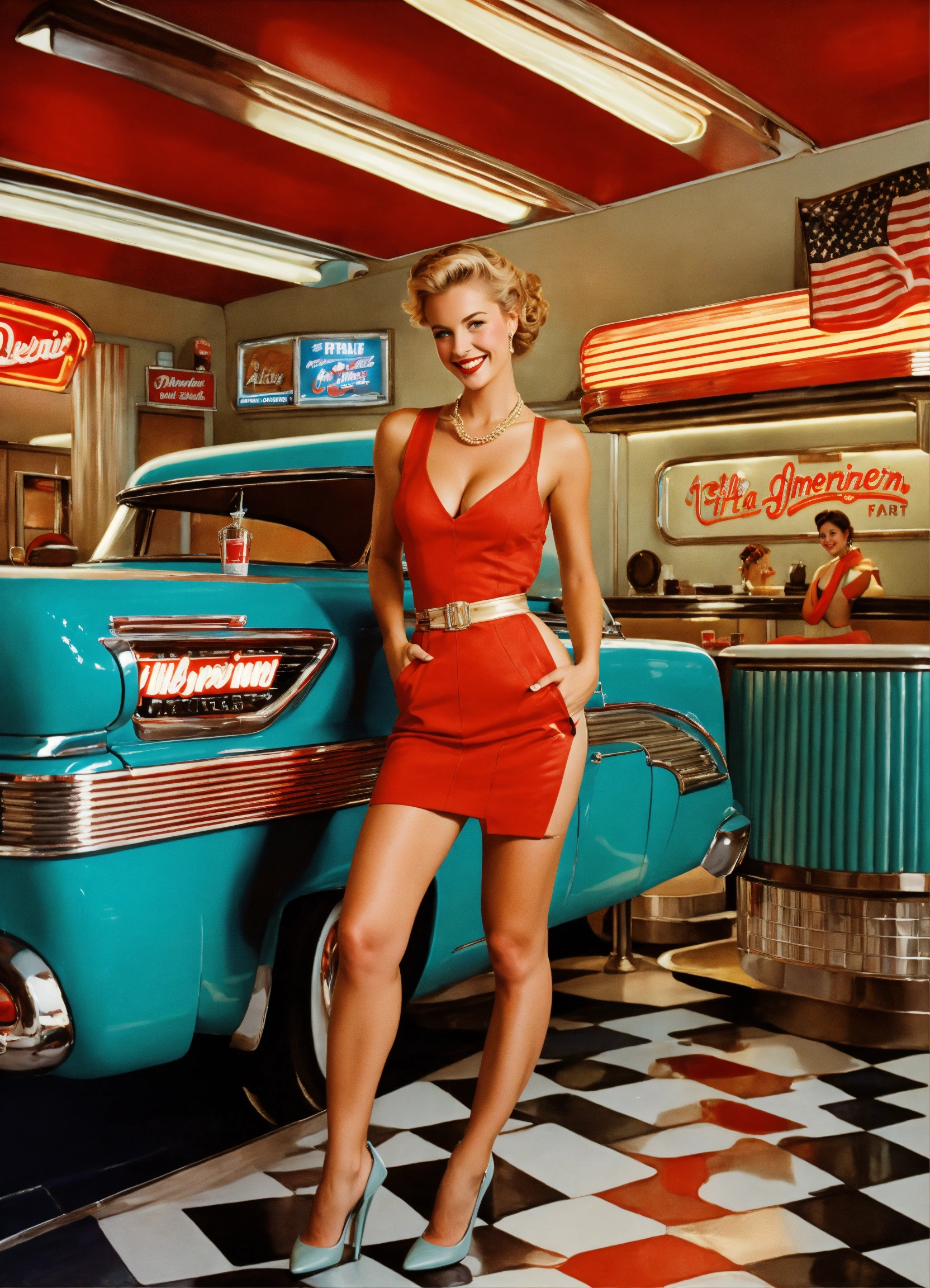 Ultra realistic full body photo of american diner, with sarah johnson, smile, modern attire and classic cars, trending on art by gil elvgren