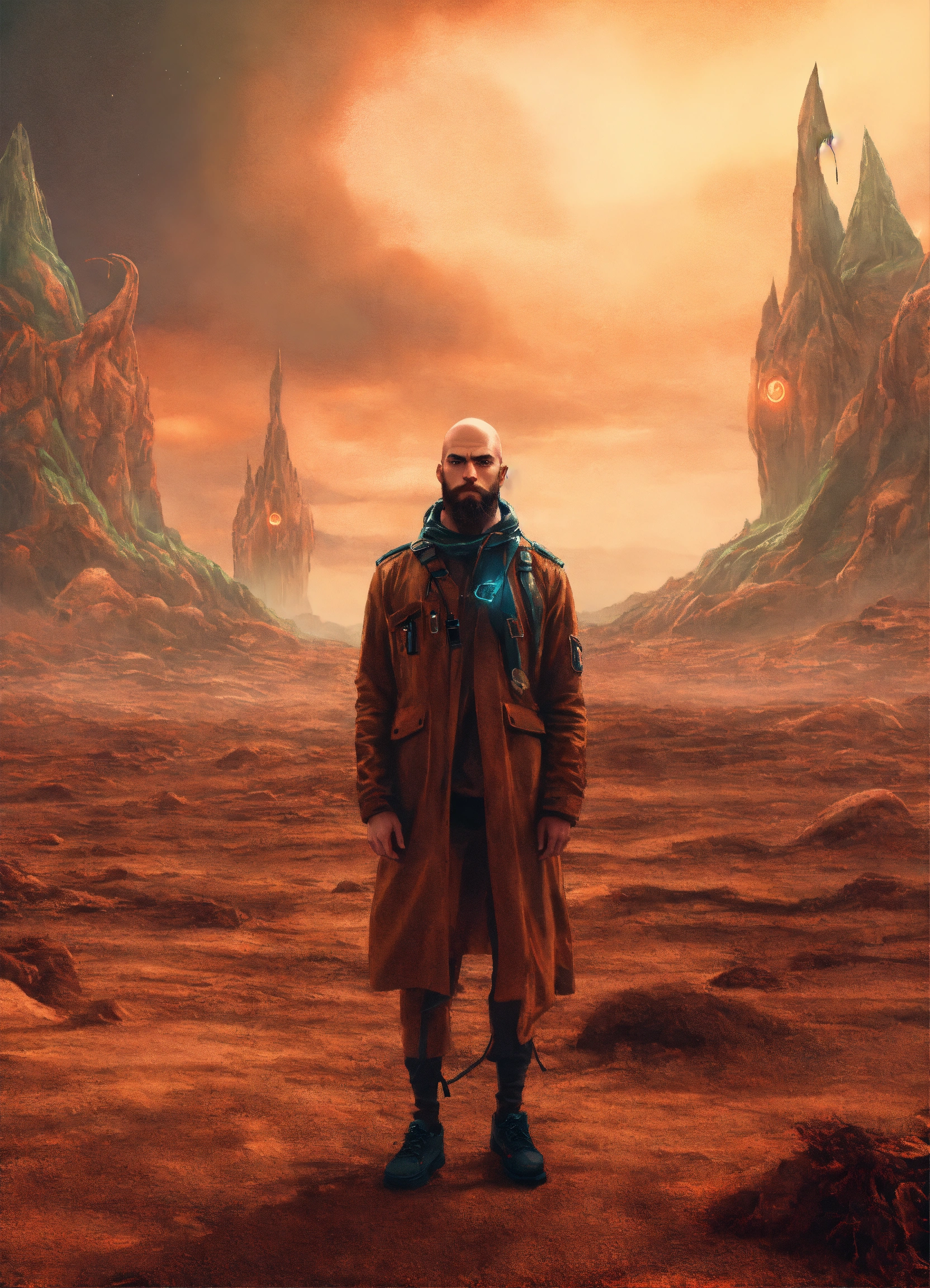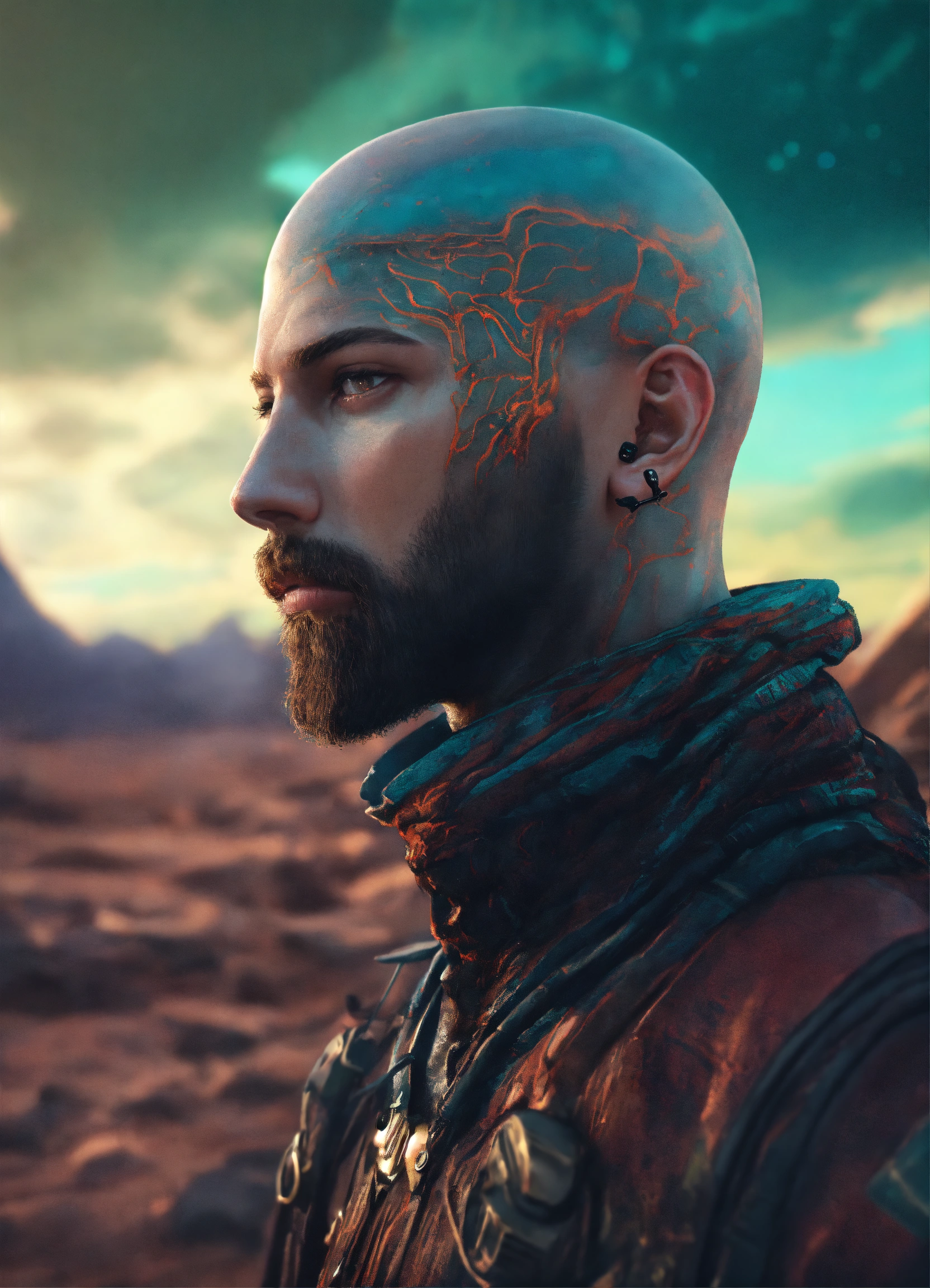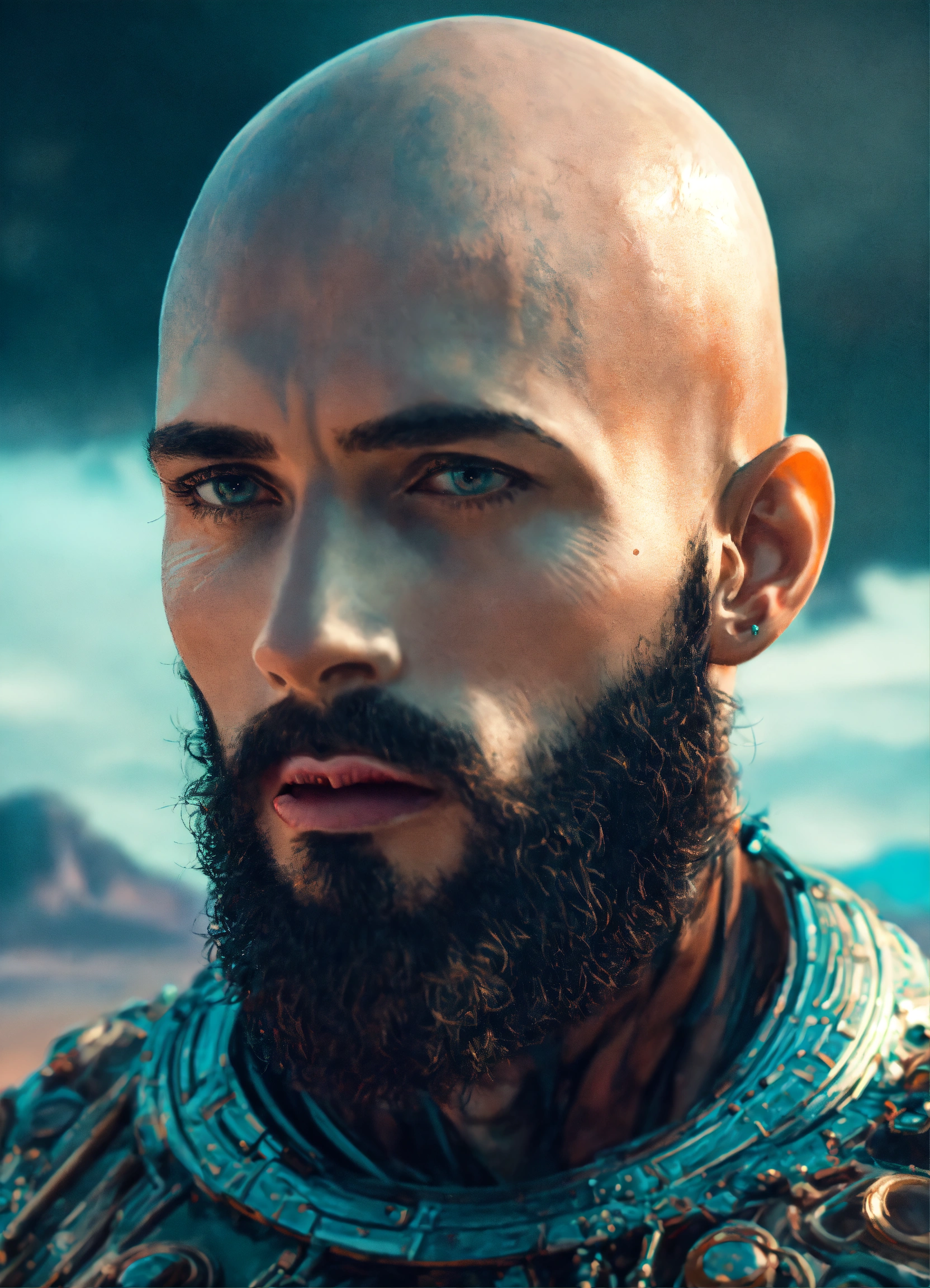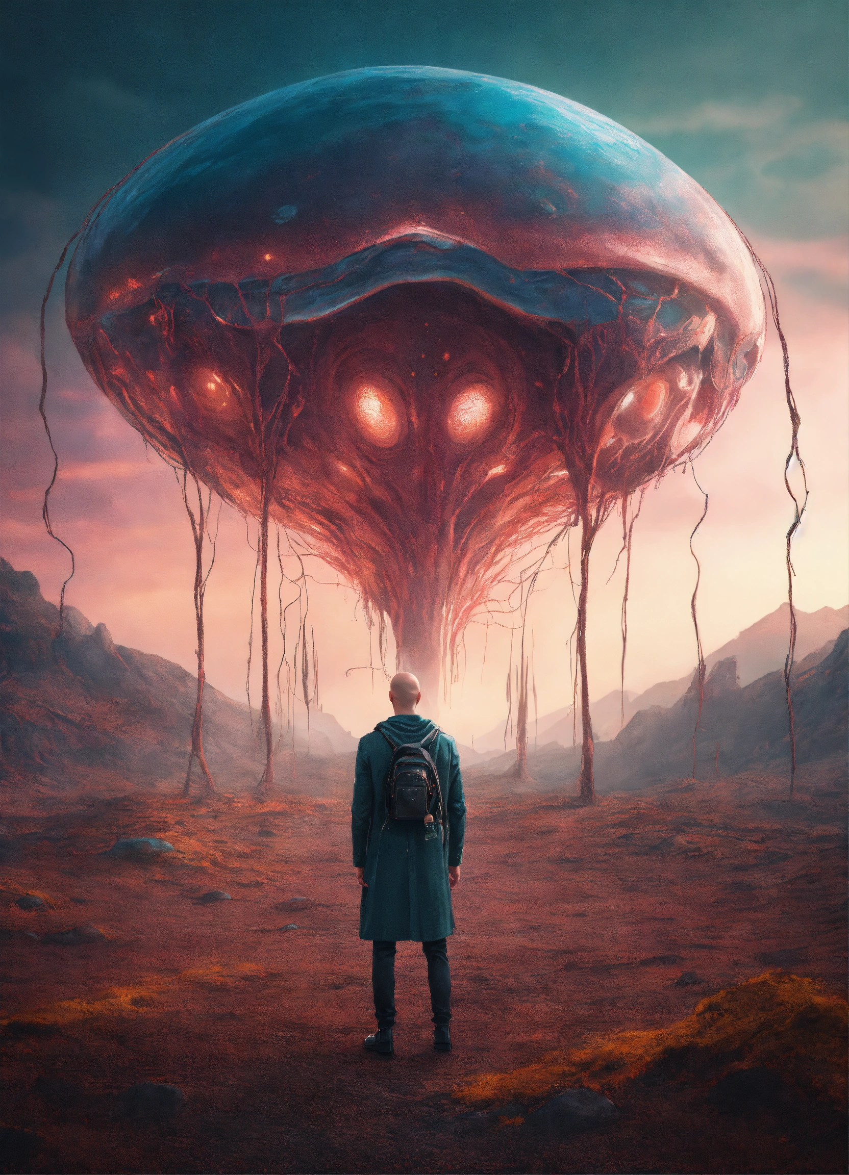 A young bald man with beard 8k surreal and otherworldly monster, with bizarre and abstract features, set in a dreamlike, alien landscape
