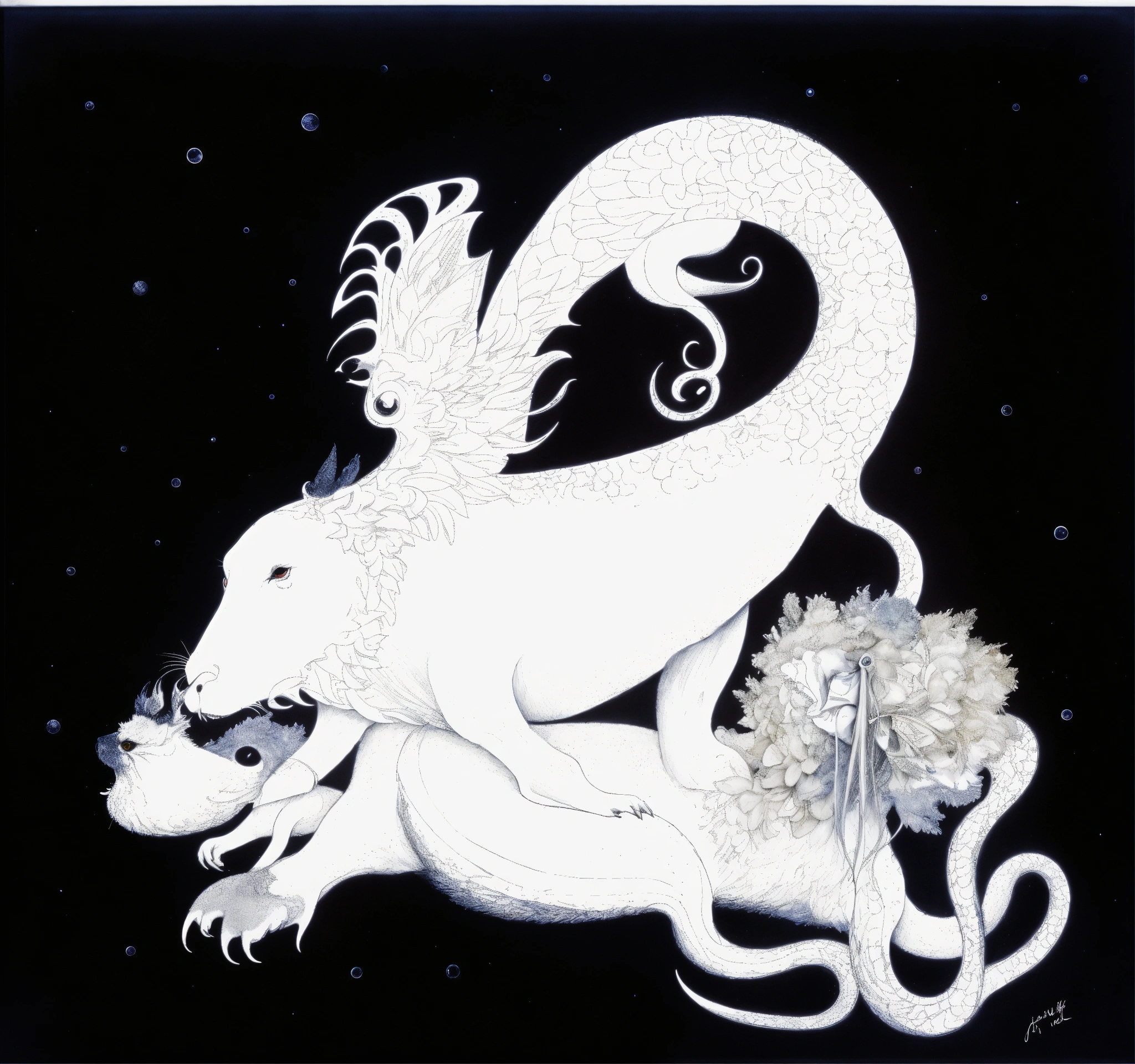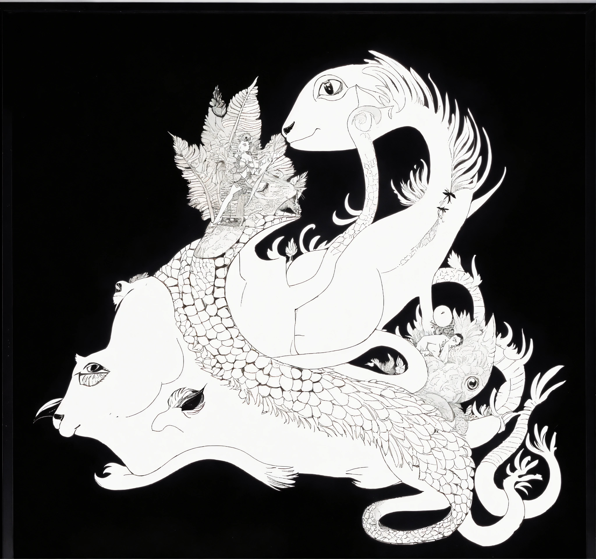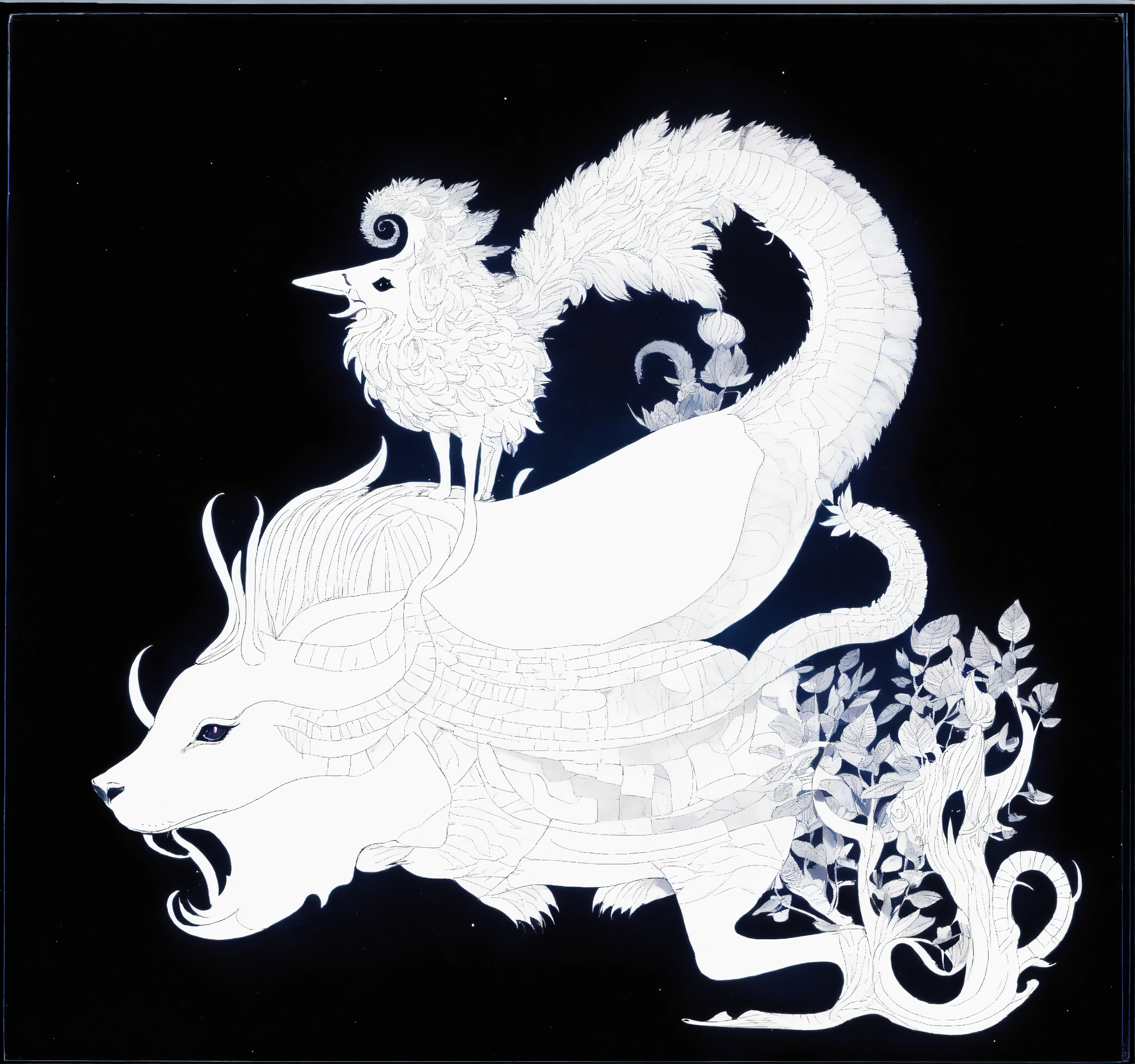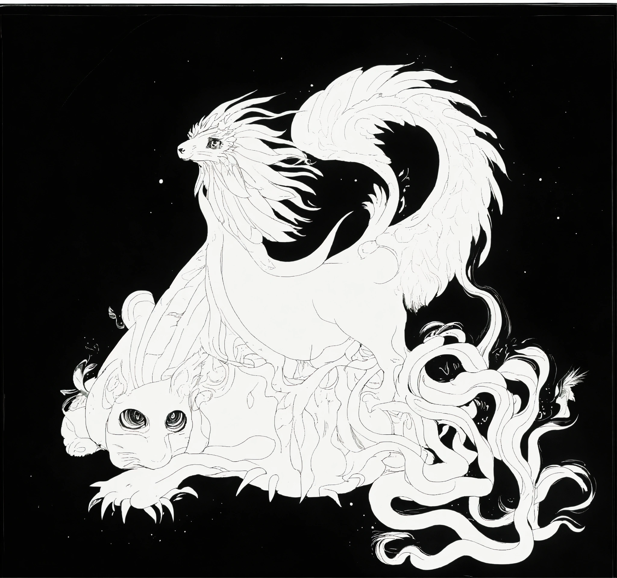 A surrealistic fantastical being composed of a mix of animal attributes, dwelling in a fusion of reality and surrealism, exploring fantastical realms.