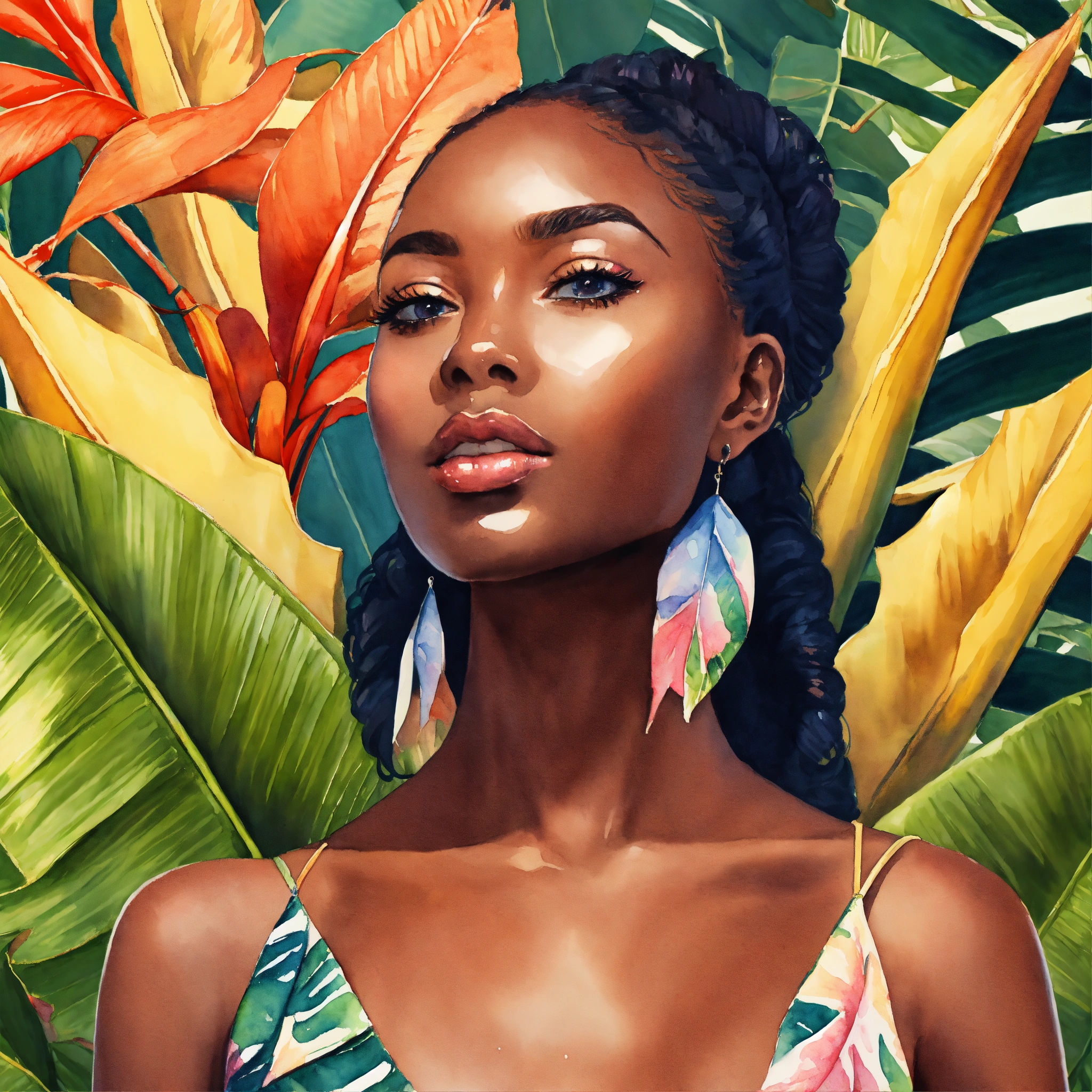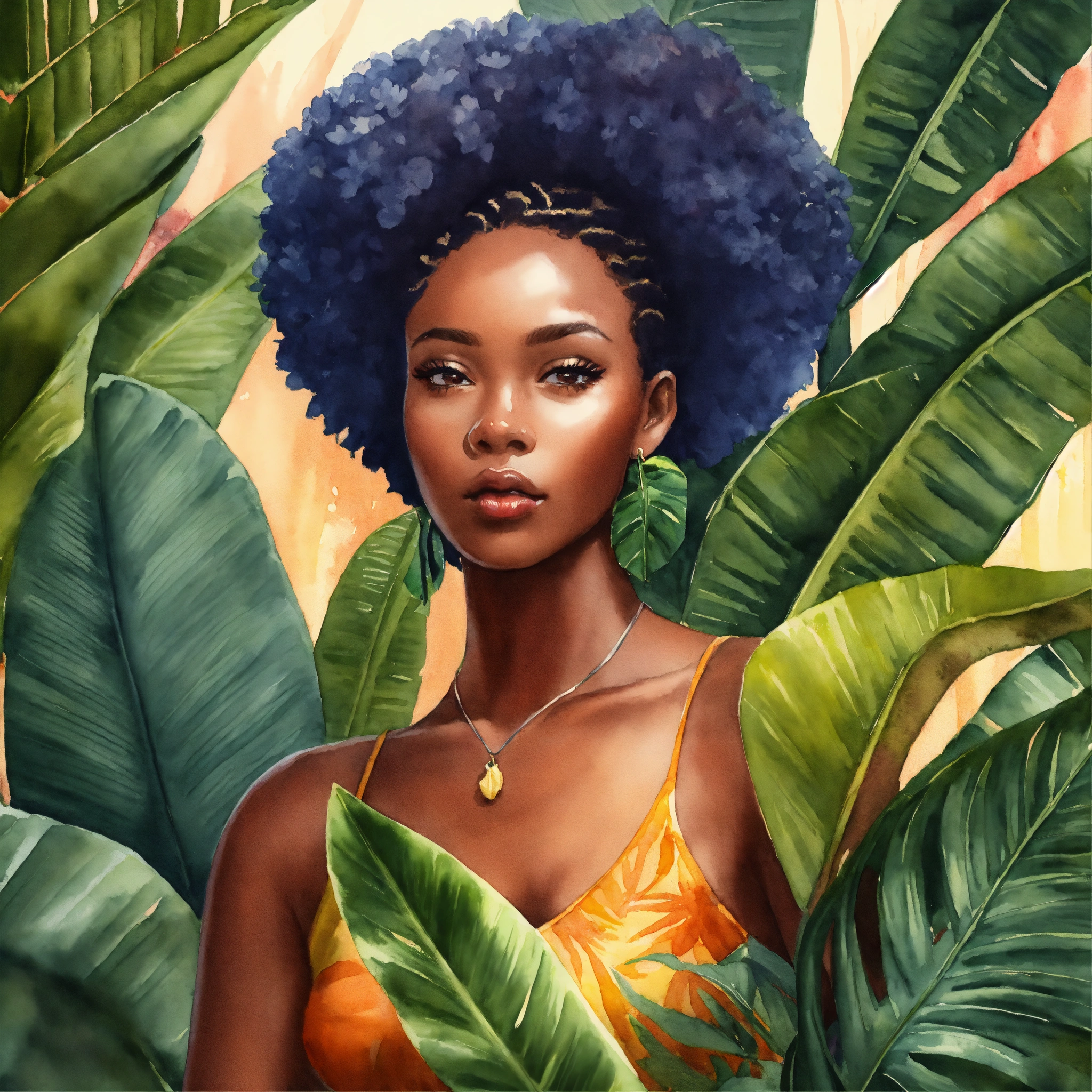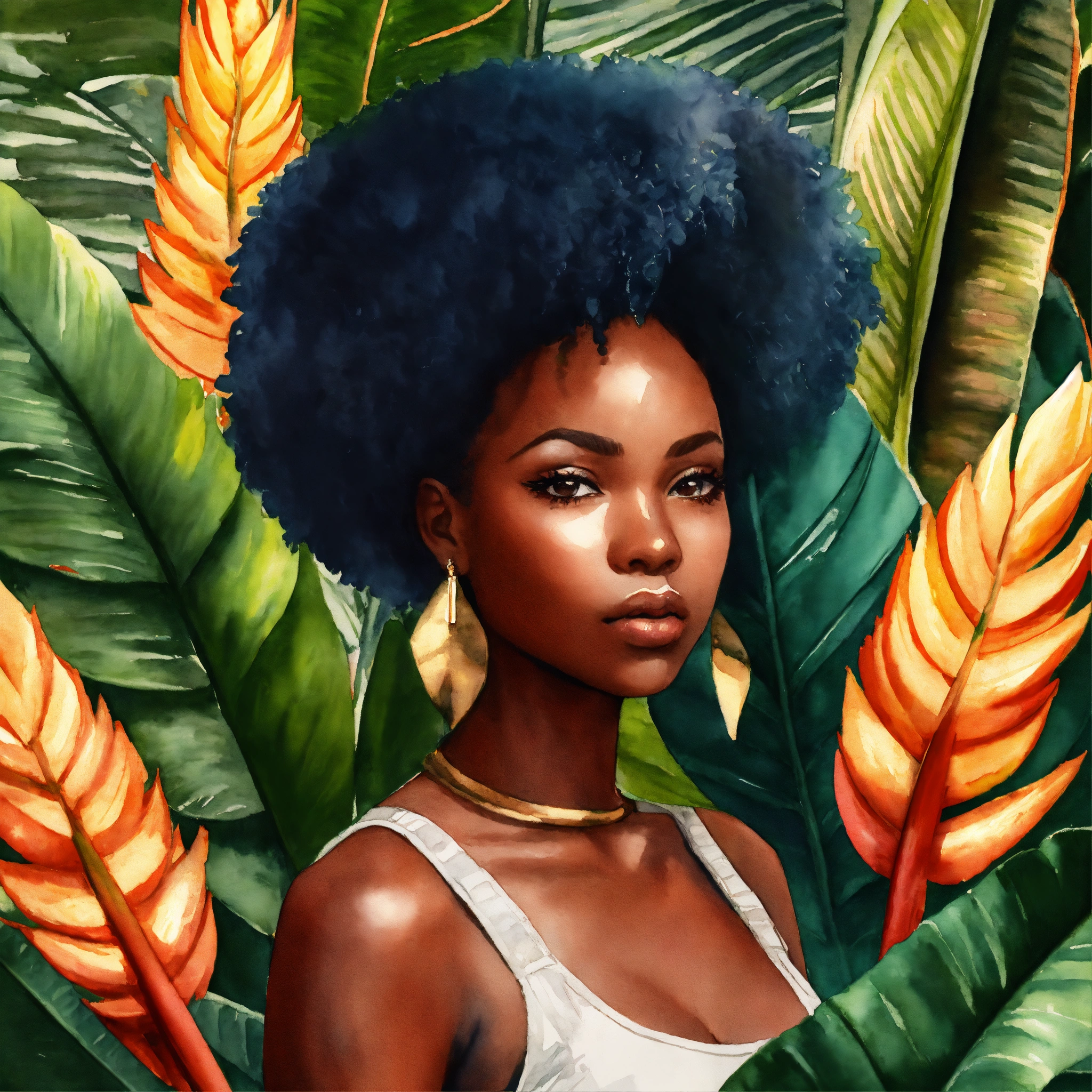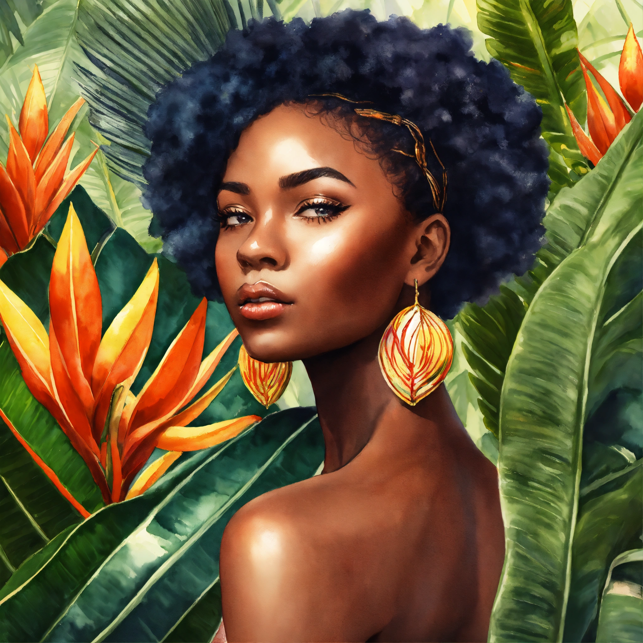 Beautiful young african woman with queen hairstyle in front of large subtropical leaves and tropical plants and flowers heliconia metallica and banana leaves watercolor illustration, photorealistic with warm and intense tones, high resolution 8k