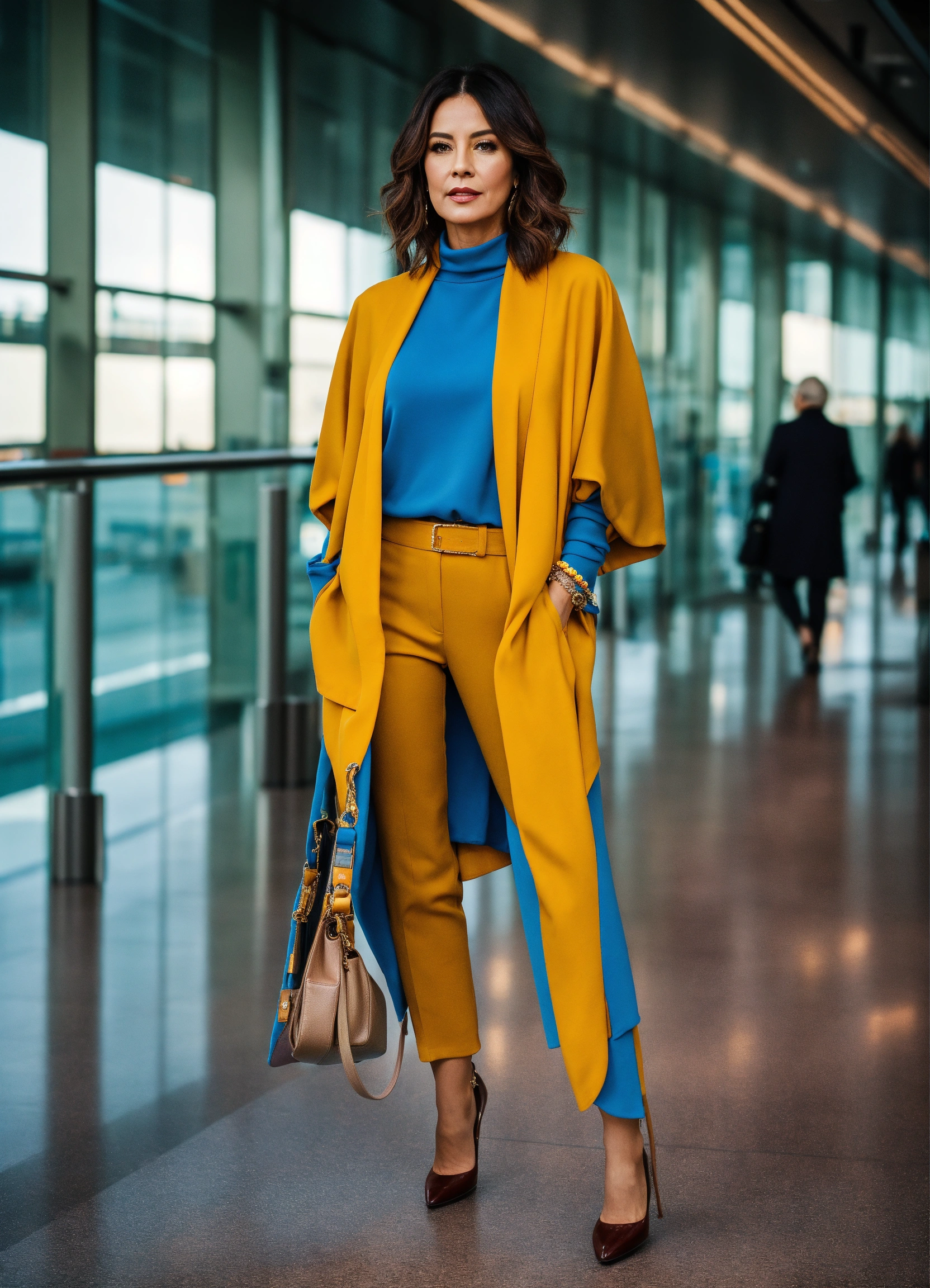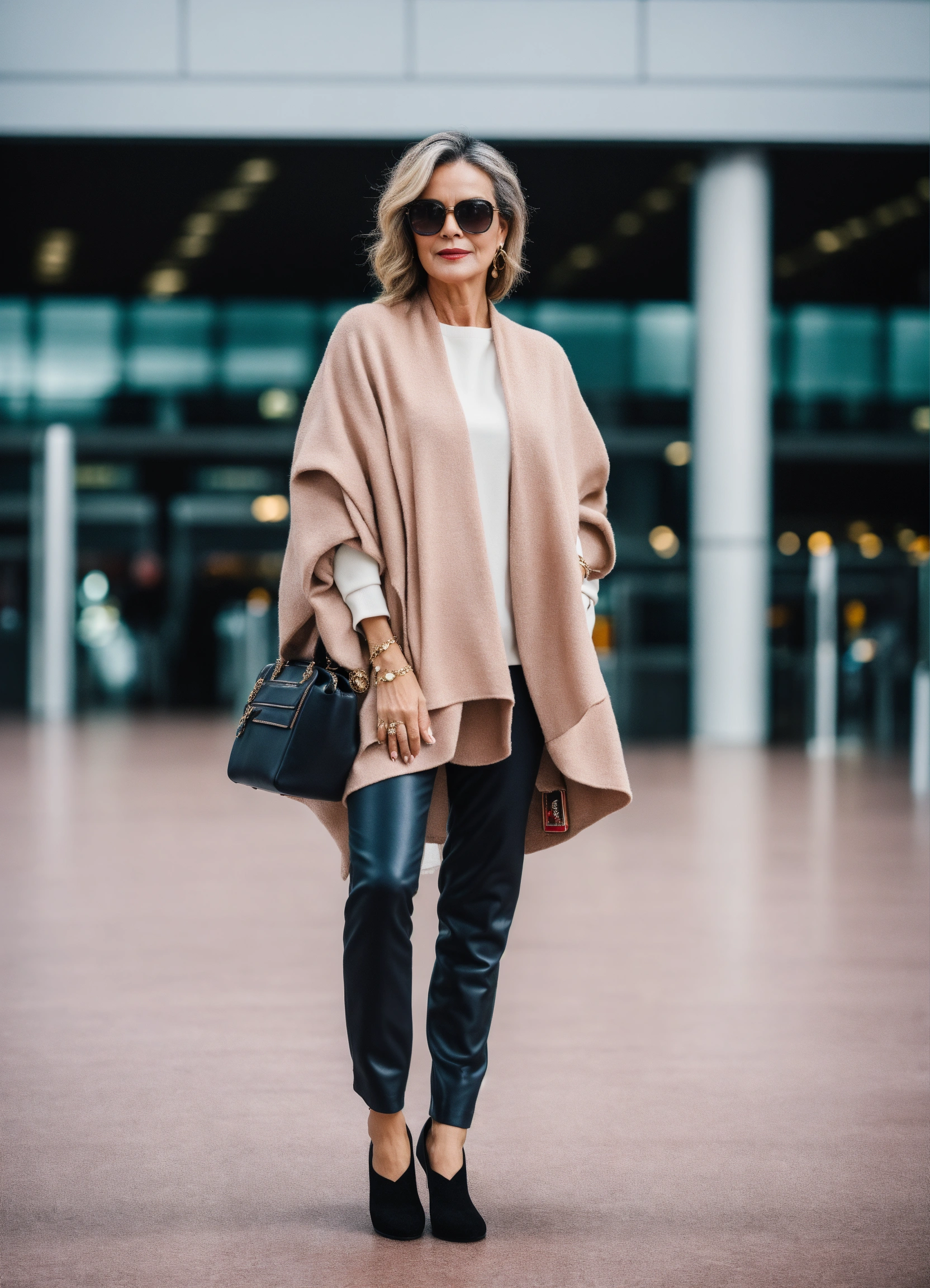 Ultra realistic full body photo of fancy 40 year old female trendy jet setter wearing layered interesting complex unusual upscale expensive rich dolman sleeve comfortable but stylish travel wear outfit at london airport