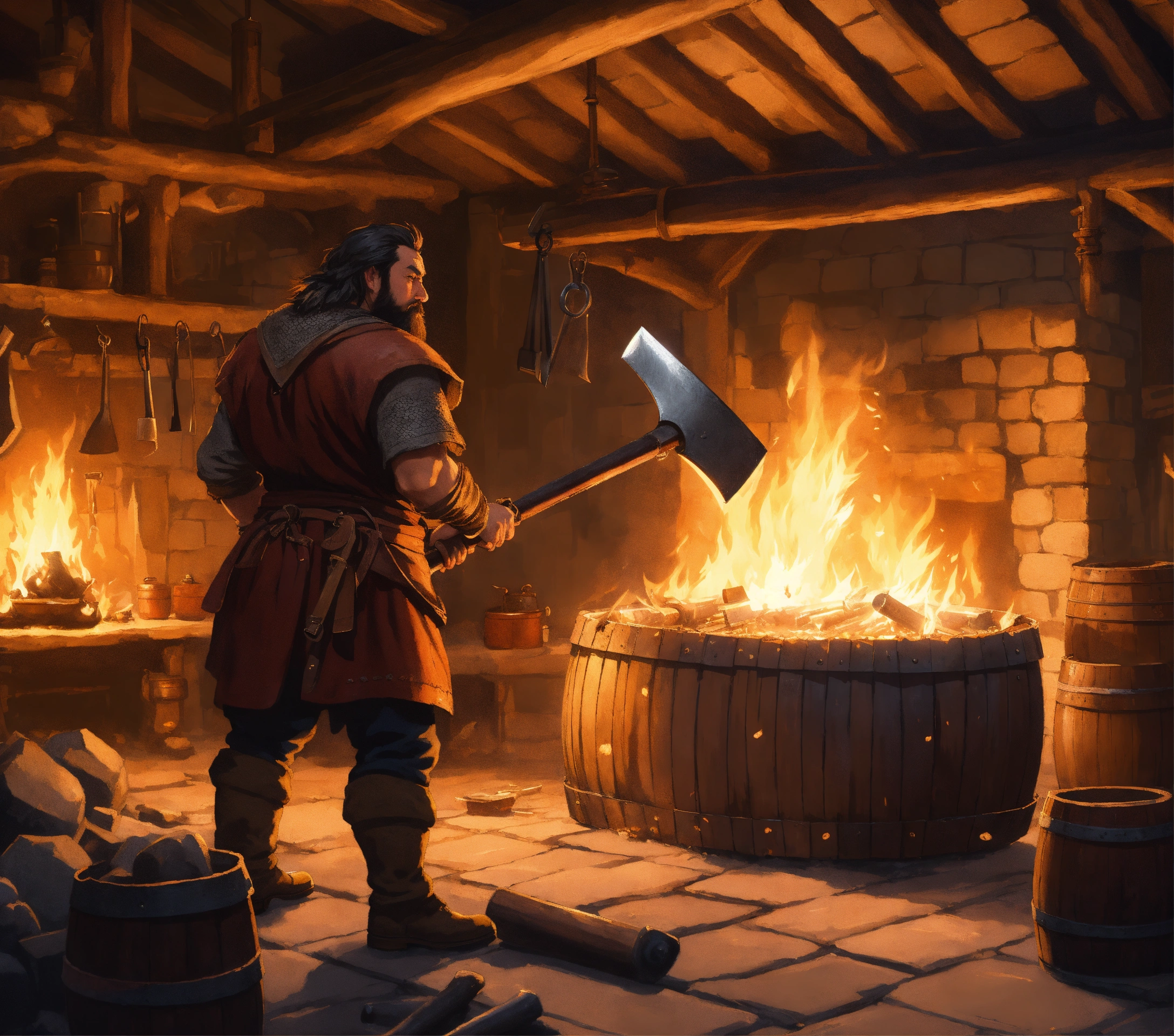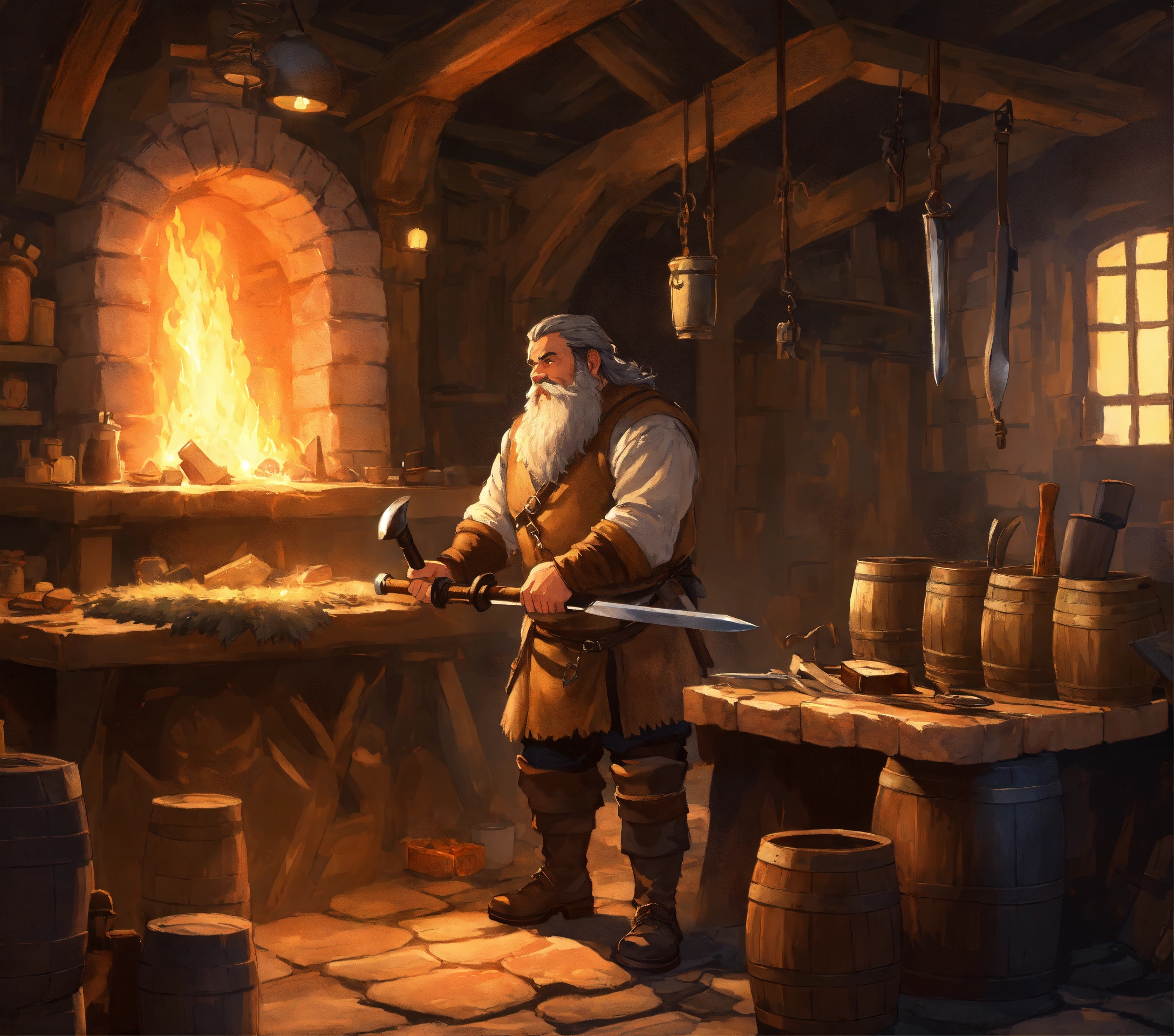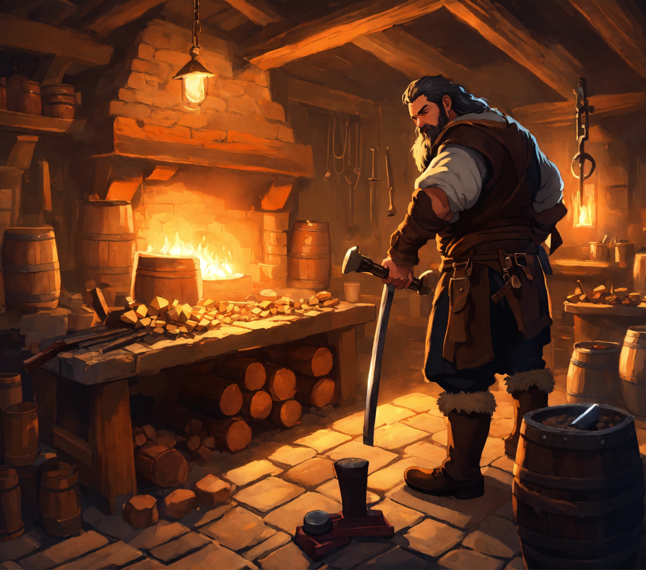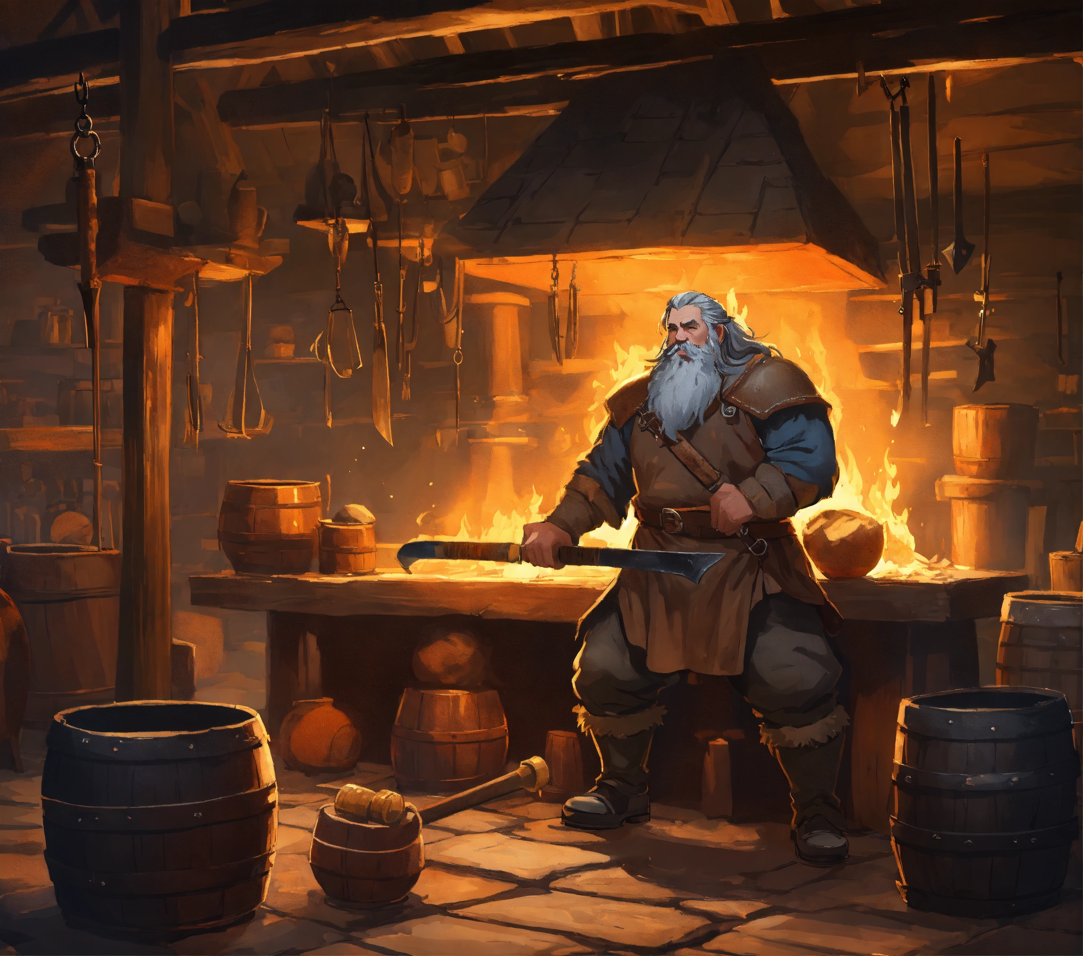 A dwarven blacksmith with a huge hammerin right hand and leather apron in front of a huge iron anvil, black hair, muscular, standing in the middle of a secret forge with swords and axes placed on tables, a large stove behind, a few barrels, oil painting, greg rutkowski makoto shinkai takashi takeuchi studio ghibli, 8k, medieval tavern atmosphere, fine detail, dwarf whith one hand huge hammer, dirty, low contrast, low saturation