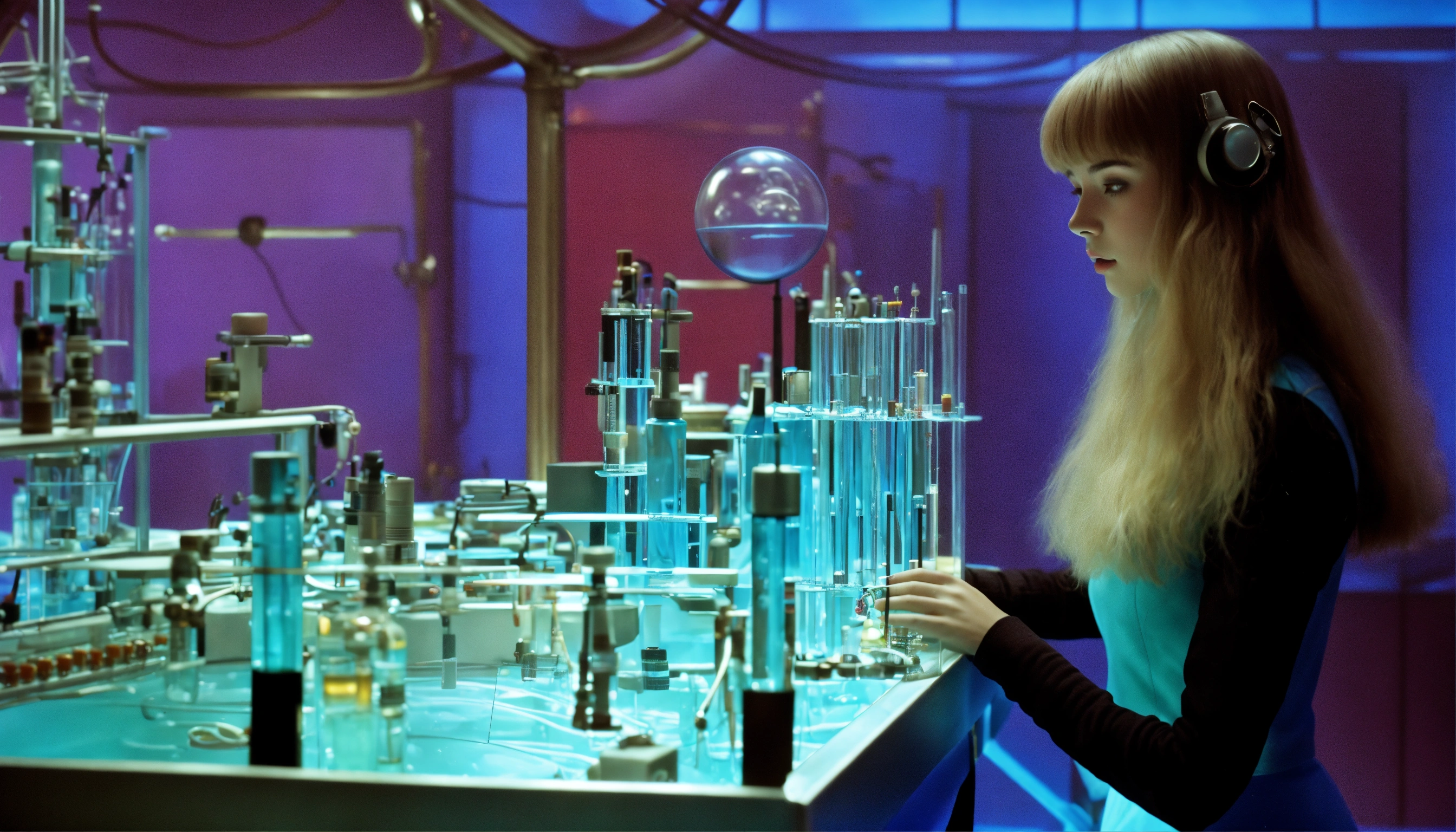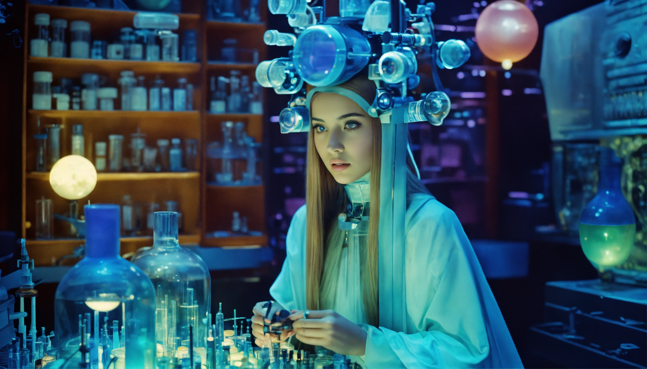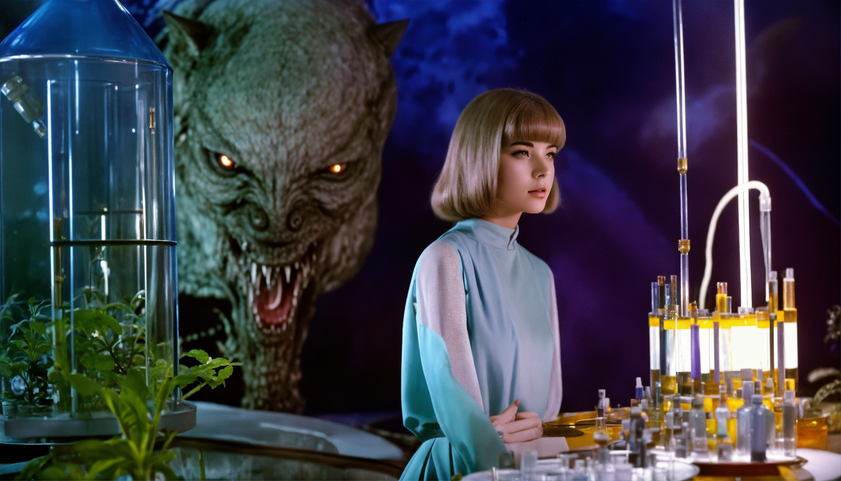 1964, old photography, kodak film colour, surreal sci fi, old film, unknown beautiful 16 years old futuristic fortune teller girl with a big unknown fantasy beast monster, futuristic glass lab with myriad of research instruments, a myriad of futuristic test tubes, pale cyan blue and pale purple, regenerative plants and ai and big unknown magic beast