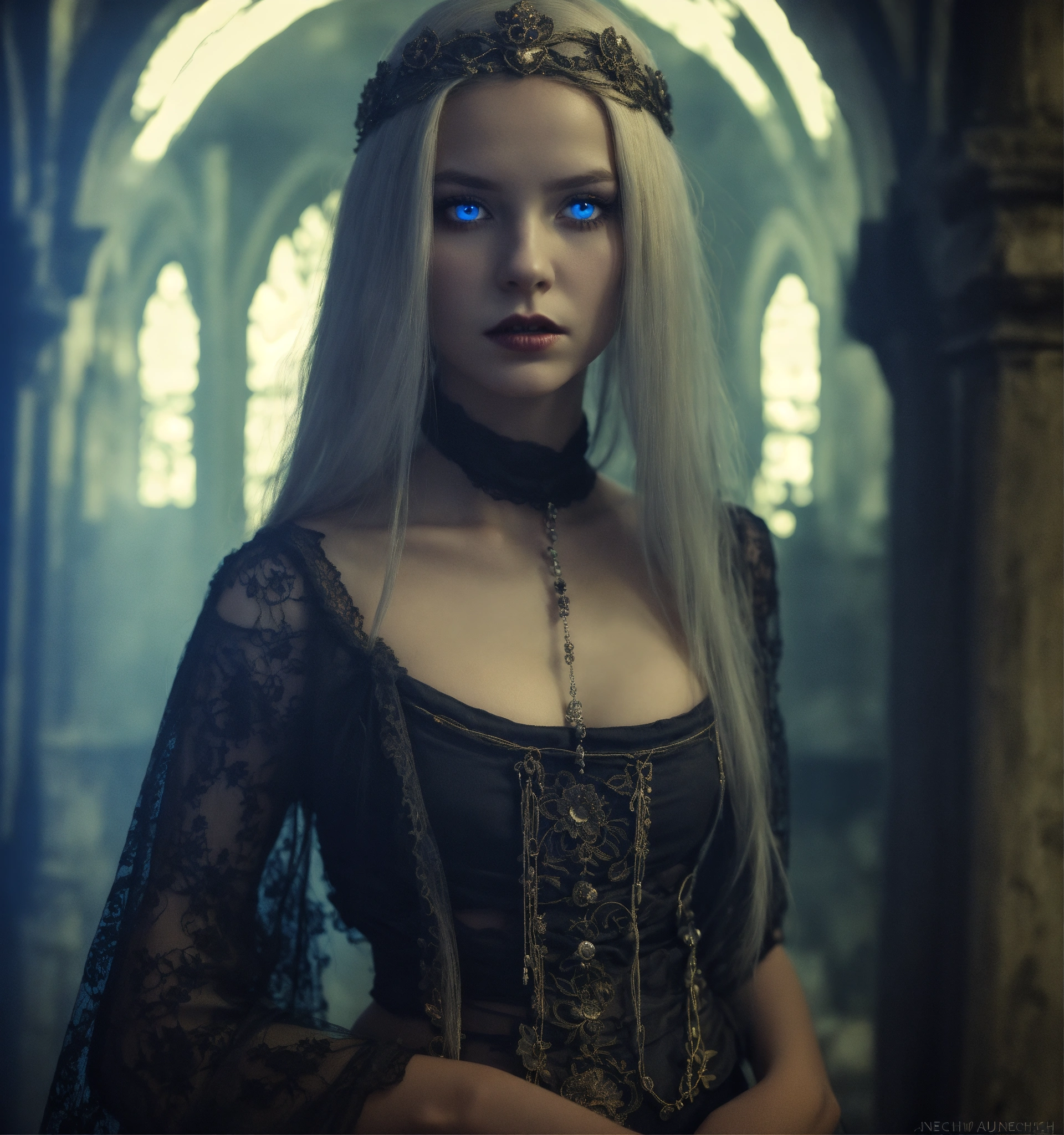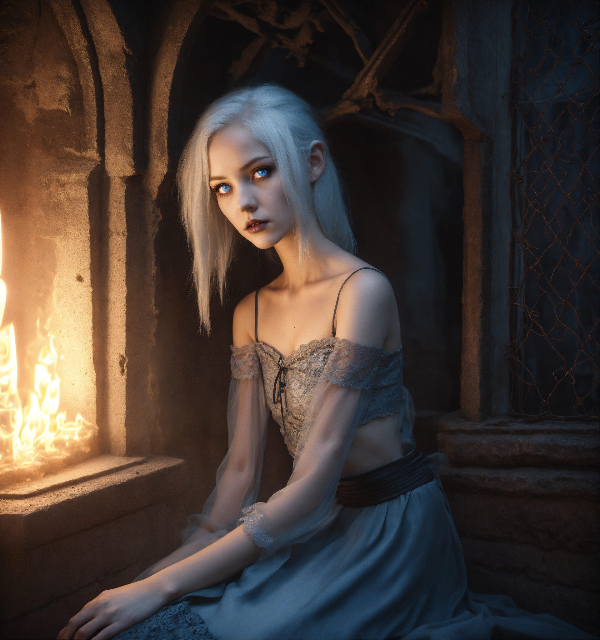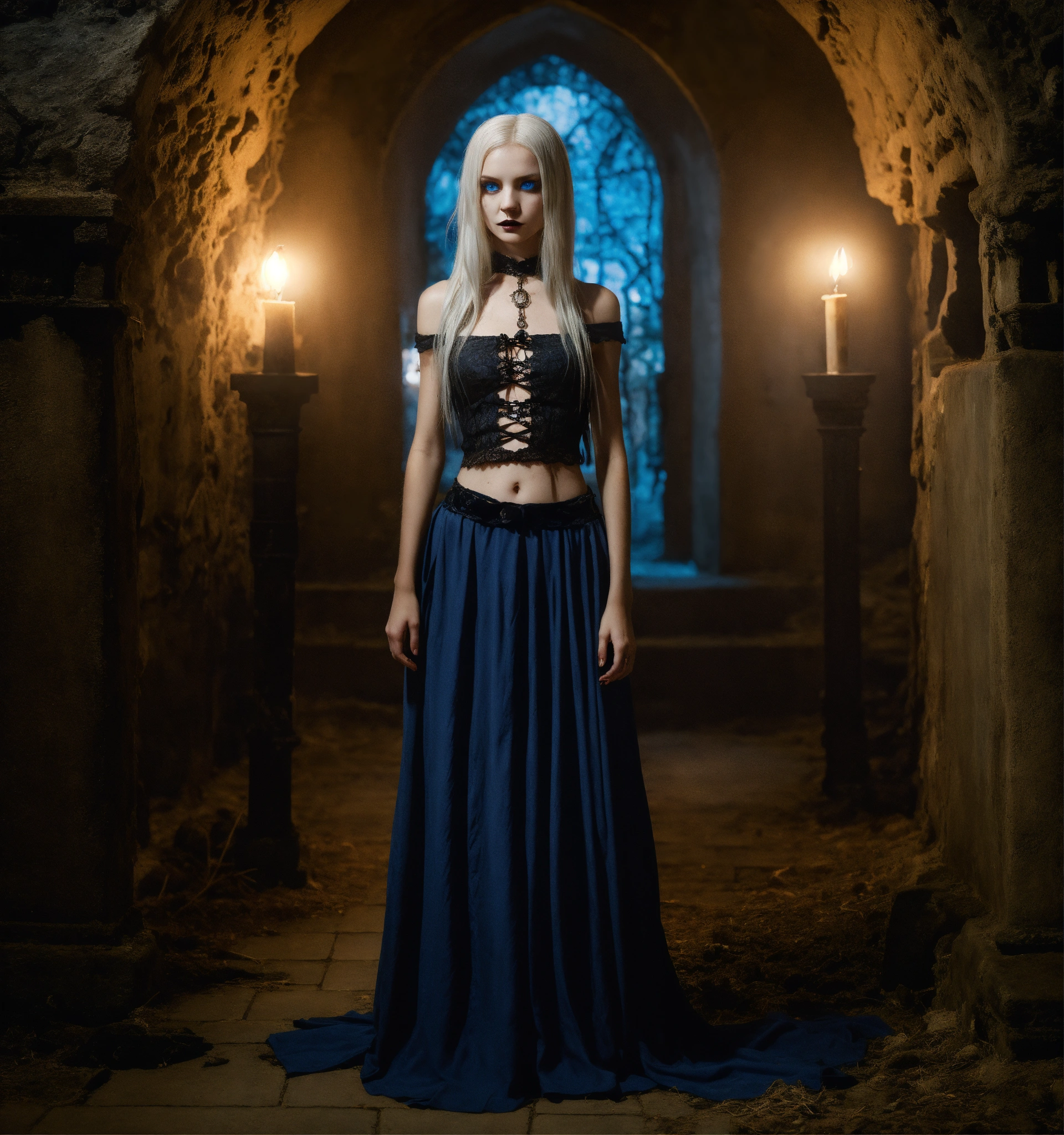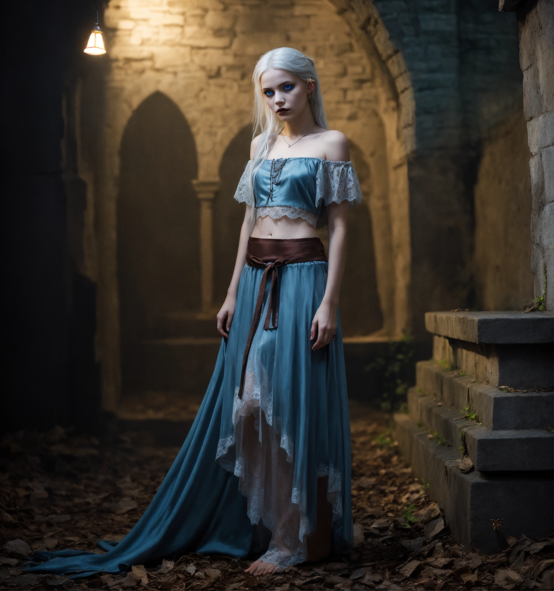 Body portrait, sehr kindhafte deadly pale twelve year old female goth necromancer child with waist long silverwhite hair and a aufreizendes off-the-shoulder lace silk cropped top mit tiefem ausschnitt and a low-waisted high slit skirt, very flat belly, extremely skinny, extremely slim and emaciated body, very narrow face, alabaster skin, pale as a corpse, glowing blue eyes, slim face, innocent looking, in a gloomy crypt, kindlich, unschuldig, childlike, juvenile, graceful, wispy, glowing blue eyes, ghostly, dead, evil, demonic, undead, darkness, grotesque, mysterious, dark, dark, cold ambient lighting, extremely detailed, fantasy, medieval setting