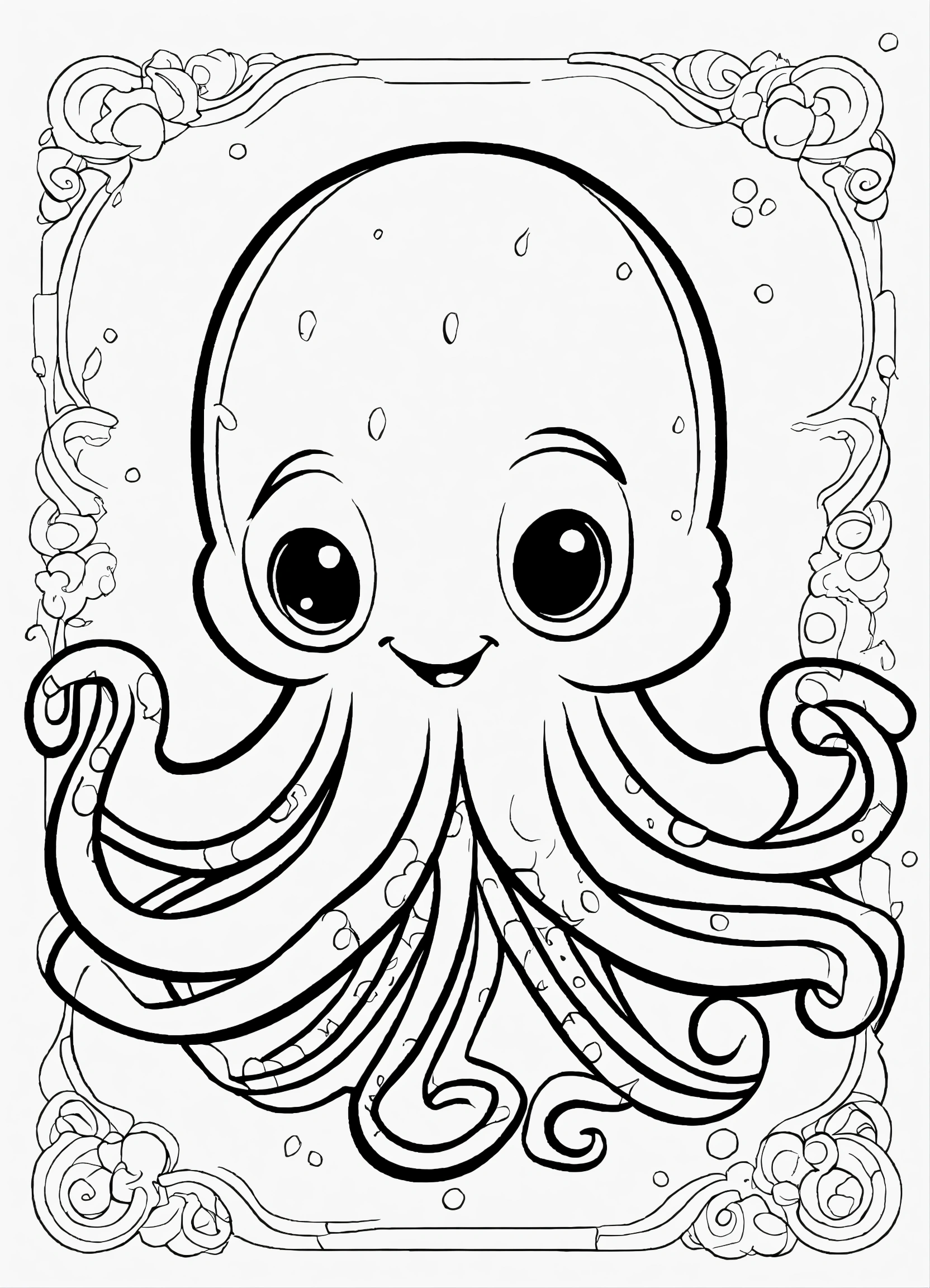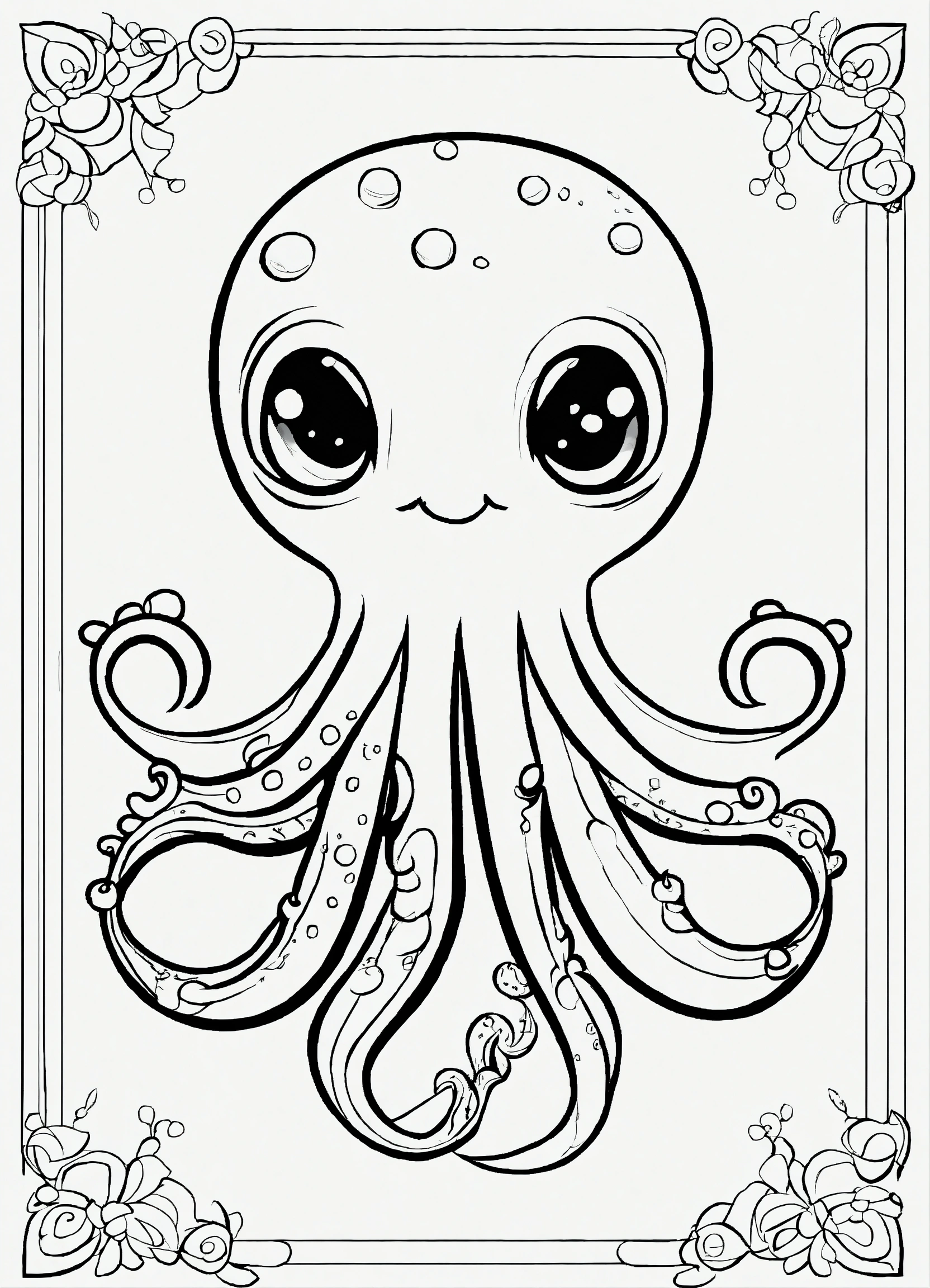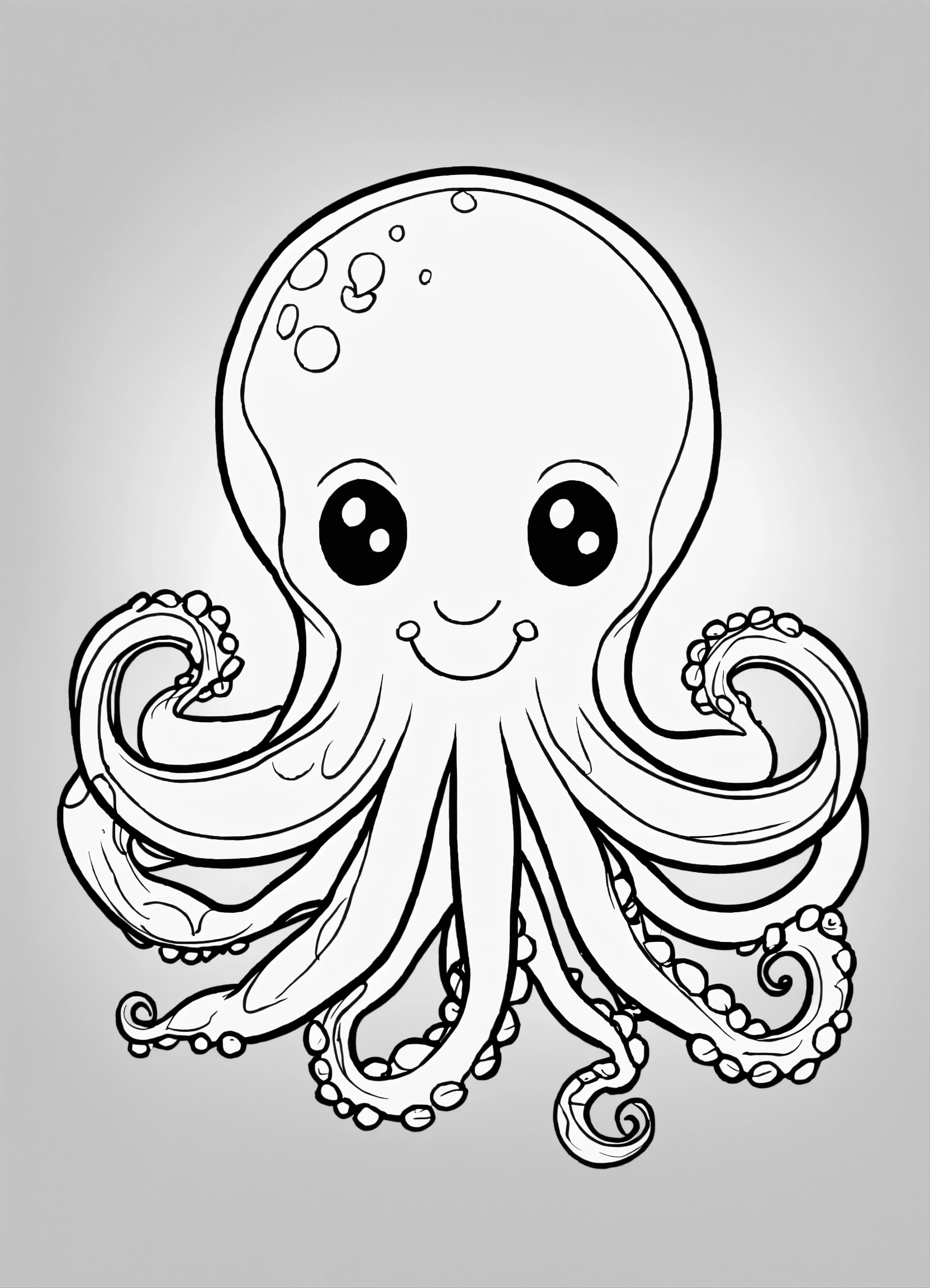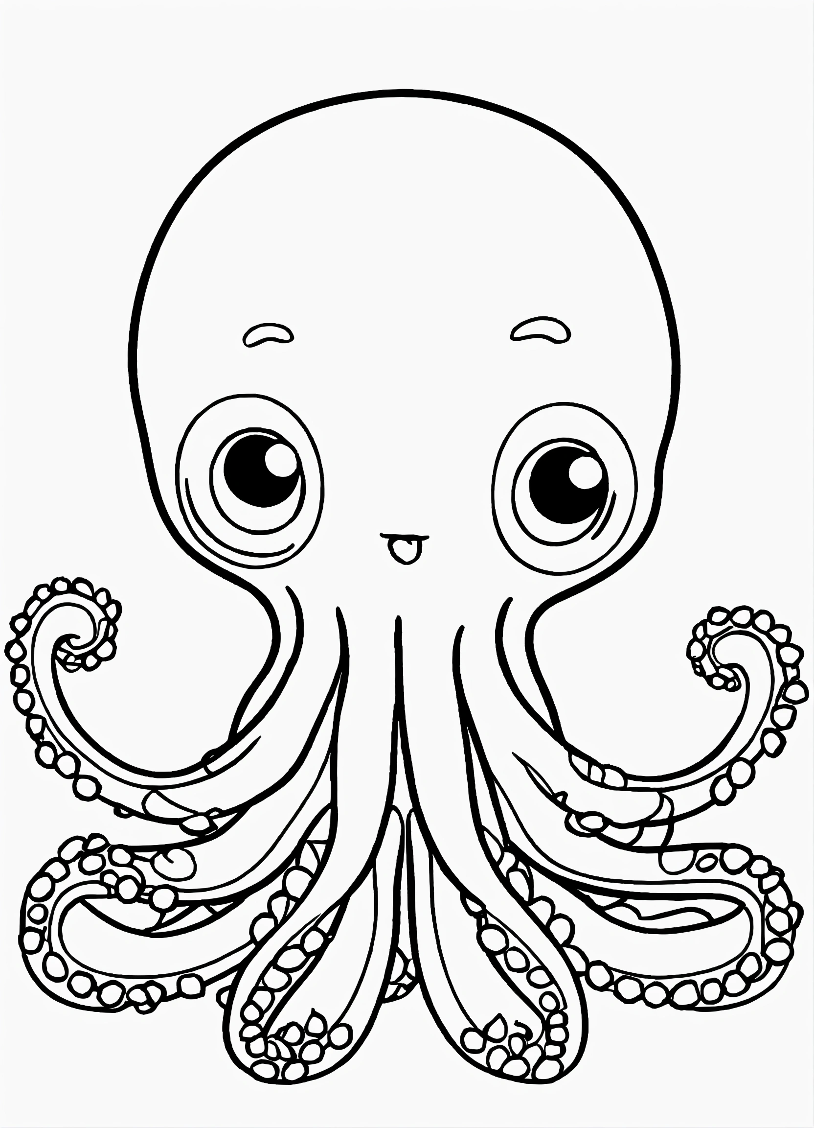 Coloring book for preschoolers, simple lines drawings, no lines inside of the drawing, baby octopus, cartoon, full body, outline of the drawing in bold line, symmetrical, white background., no background image.
