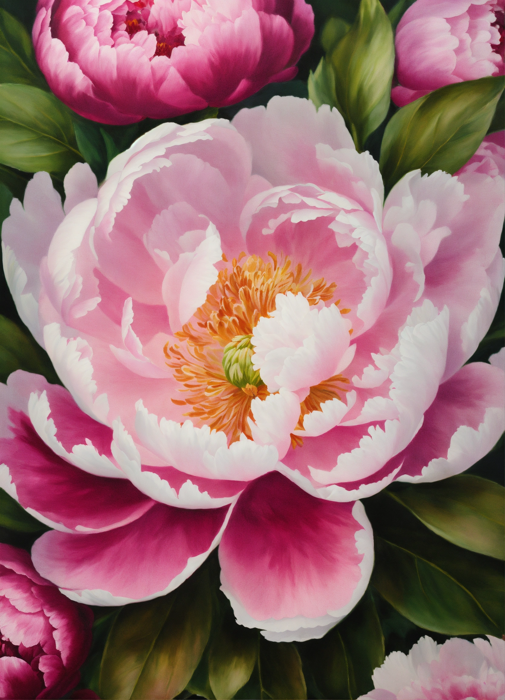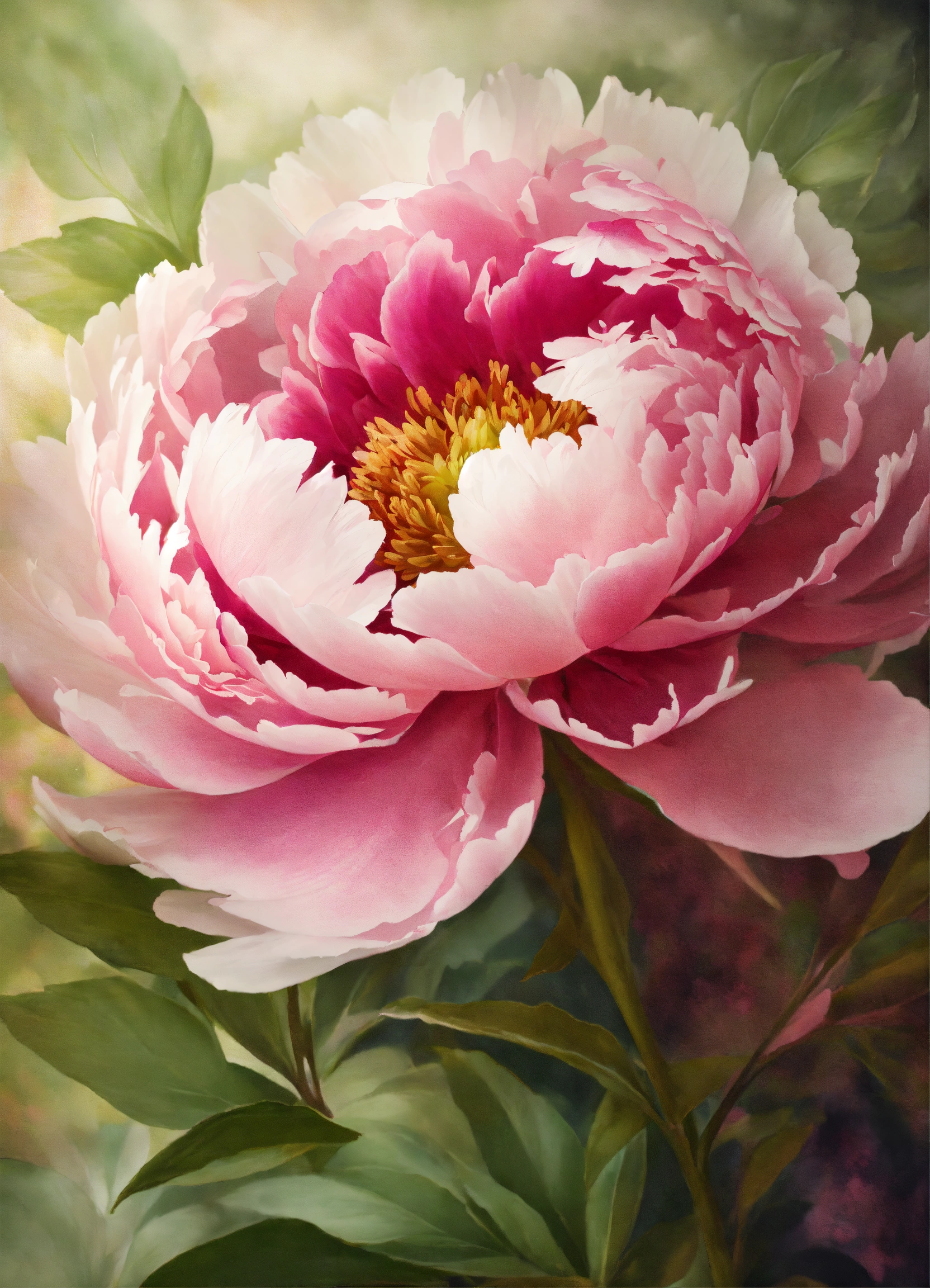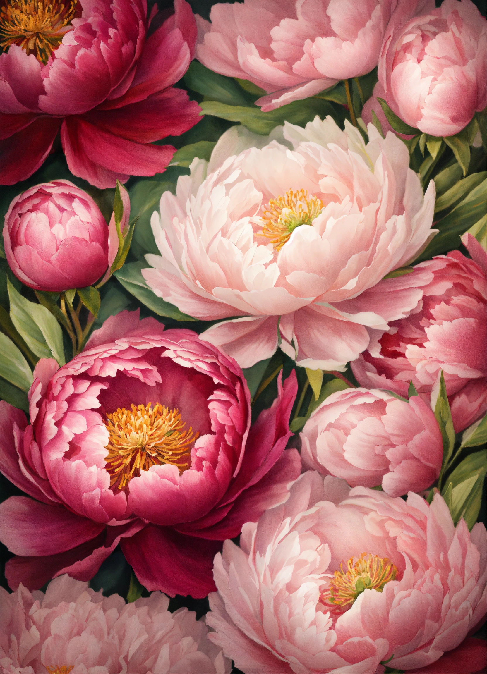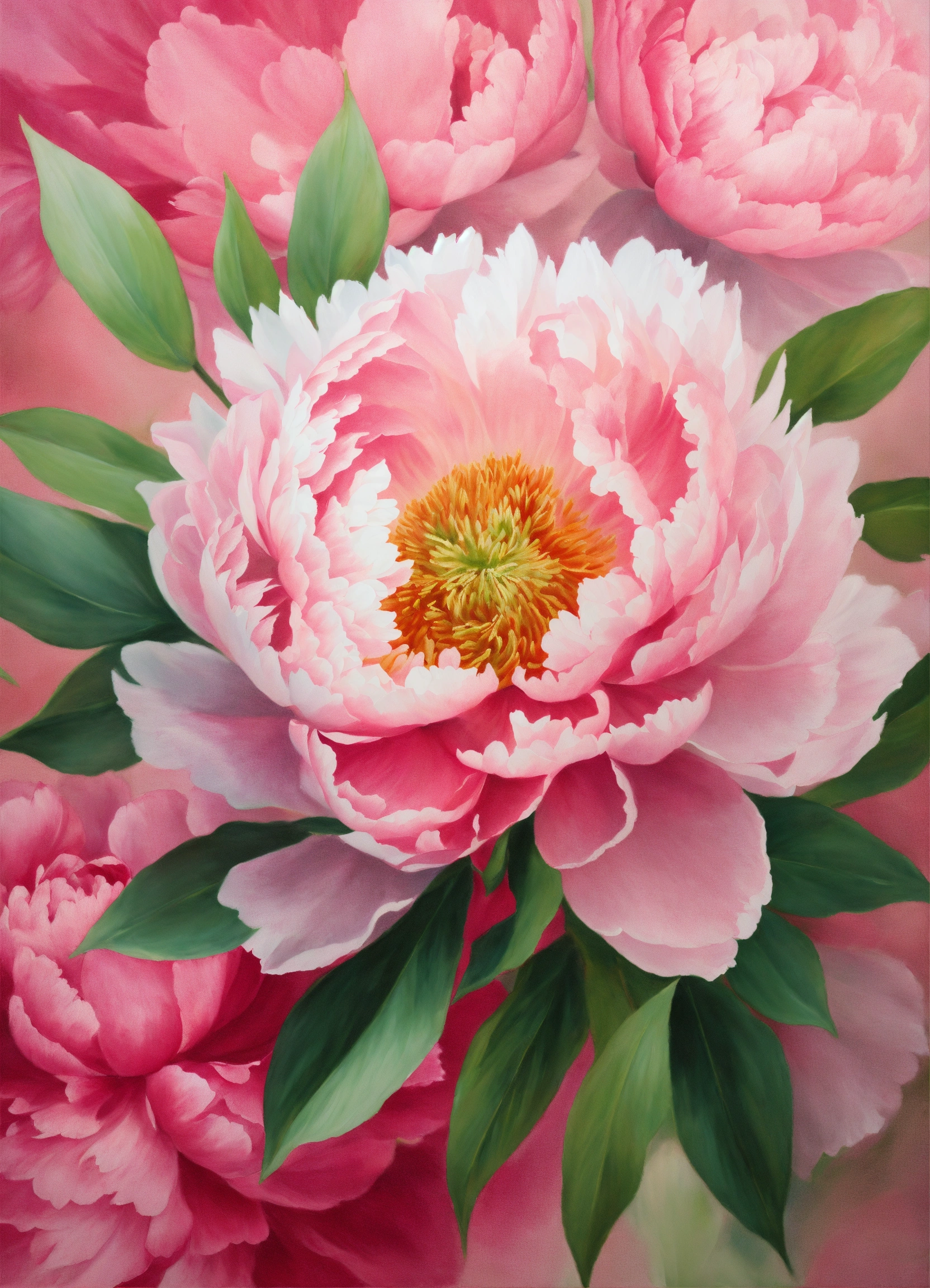 Create a background painted in canvas texture a peony flower background with white soft pink and dark pink petals and green leaves, super detailed, with a texture from canvas paint