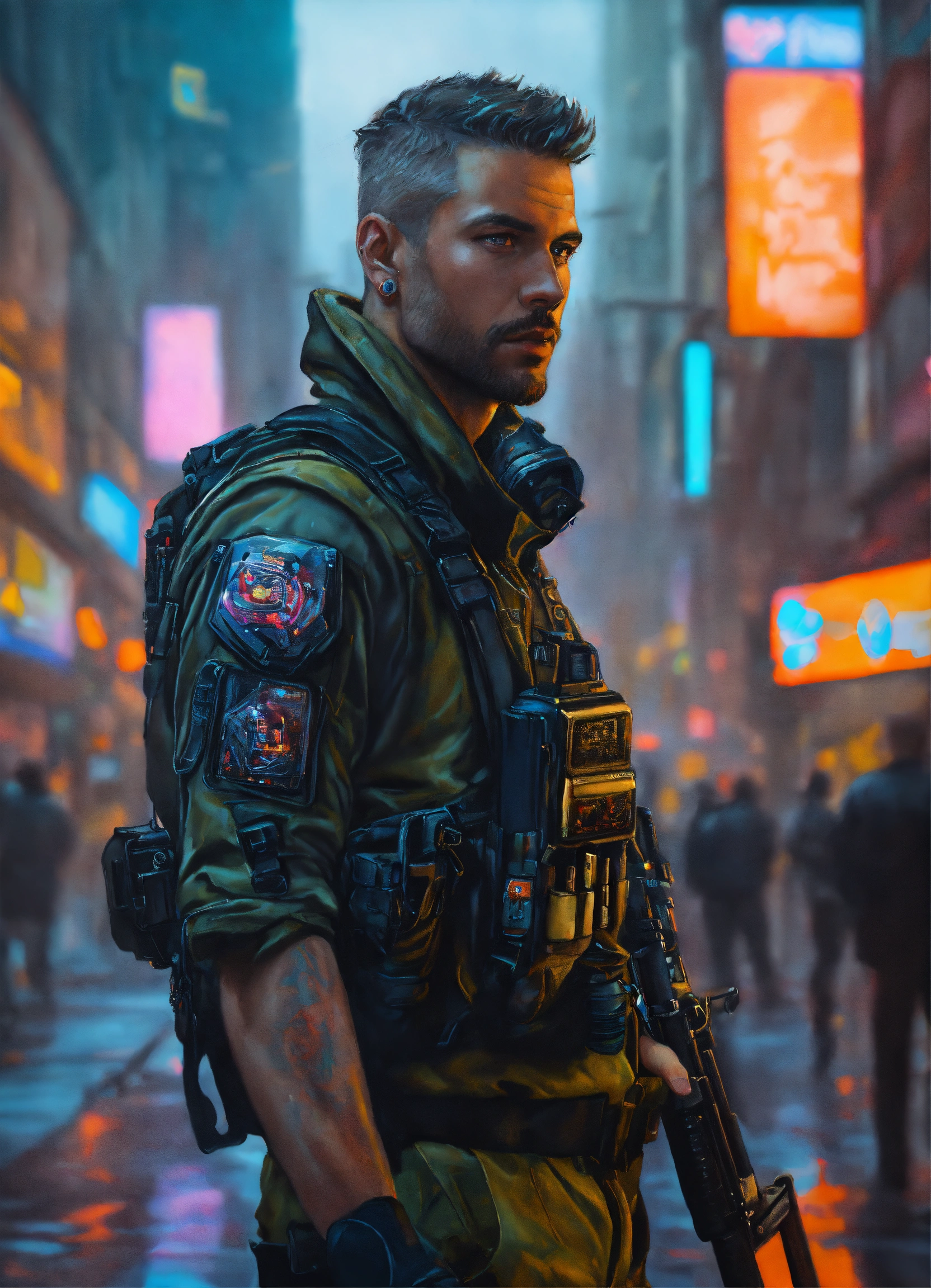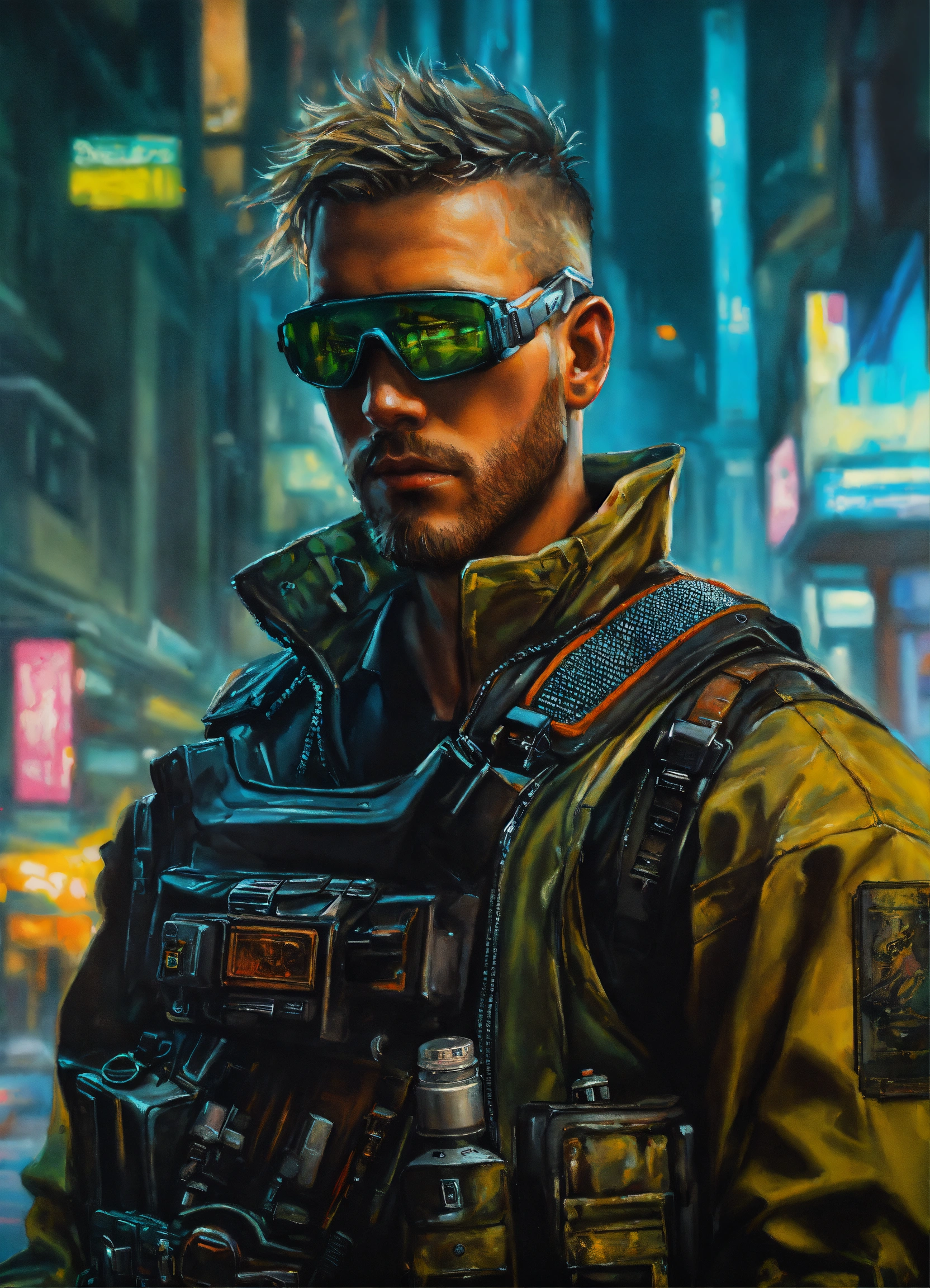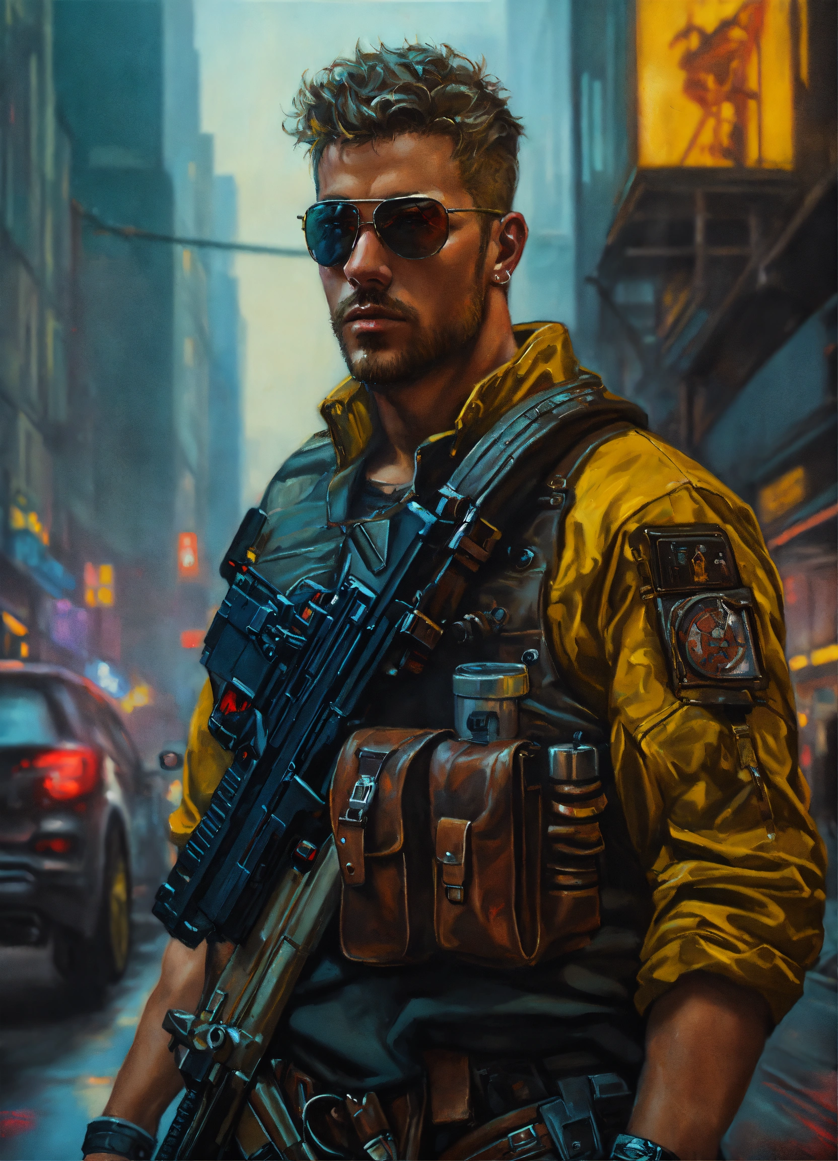 High tech cyberpunk male mercenary in gritty city hyper realistic oil painting
