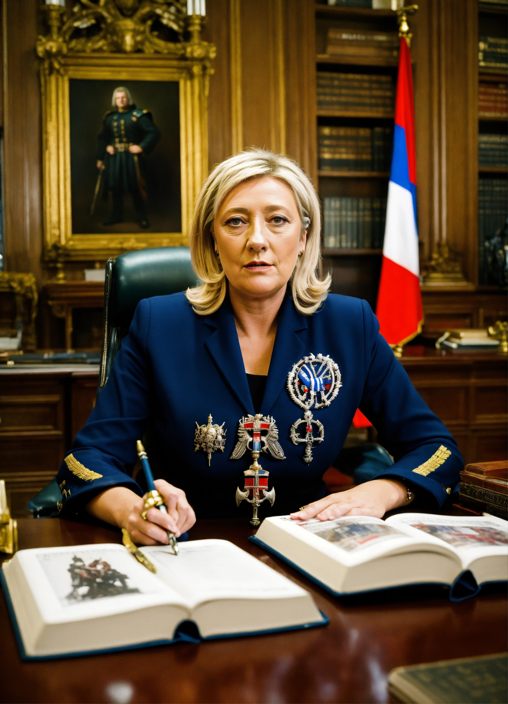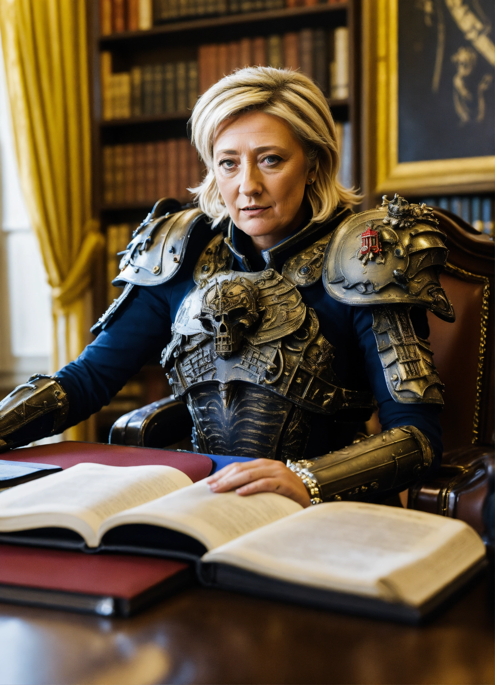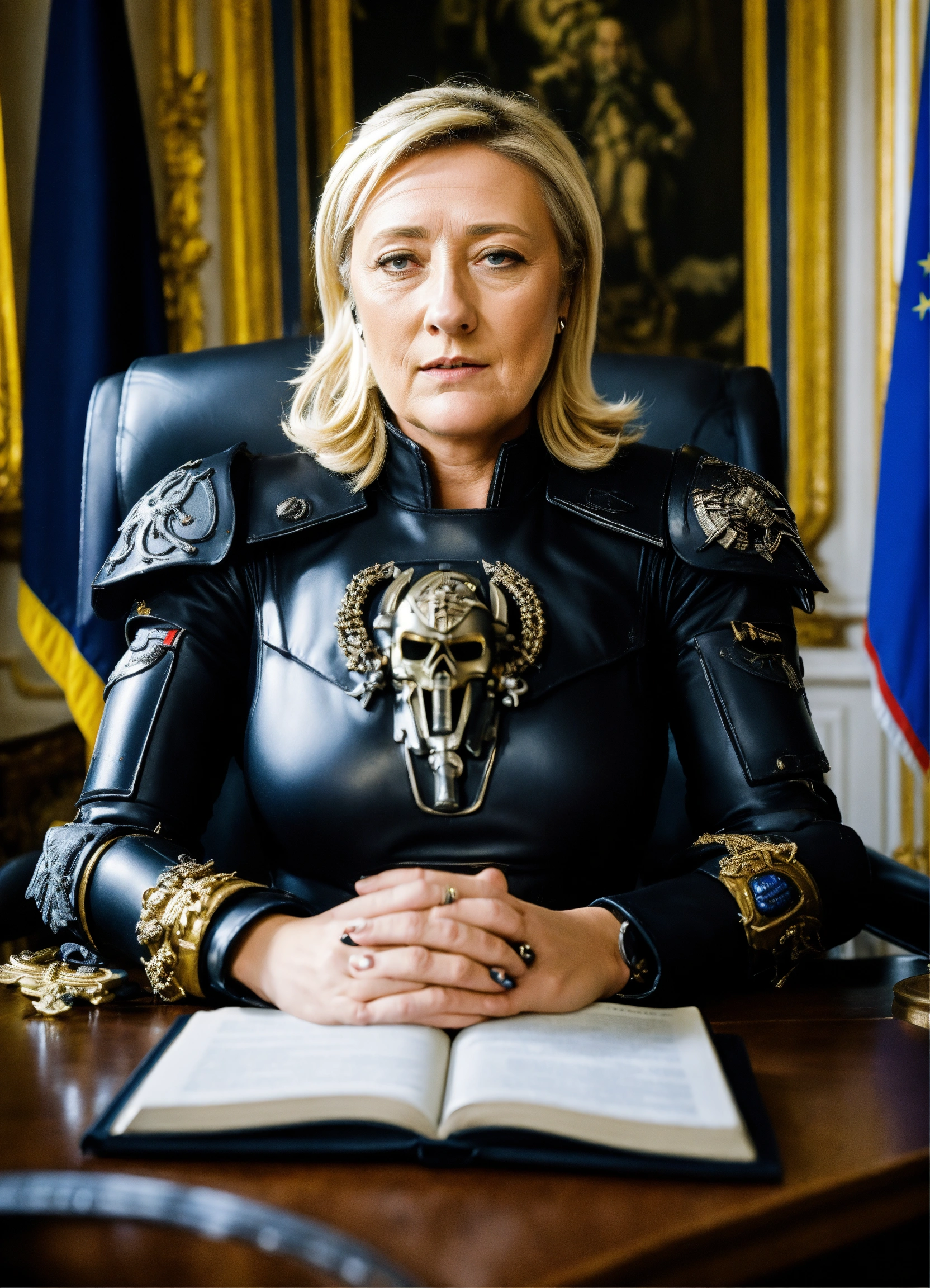 Marine le pen in her president office, wearing a warhammer 40k battle sister armor and a bible, hr giger style, flag of france in the background