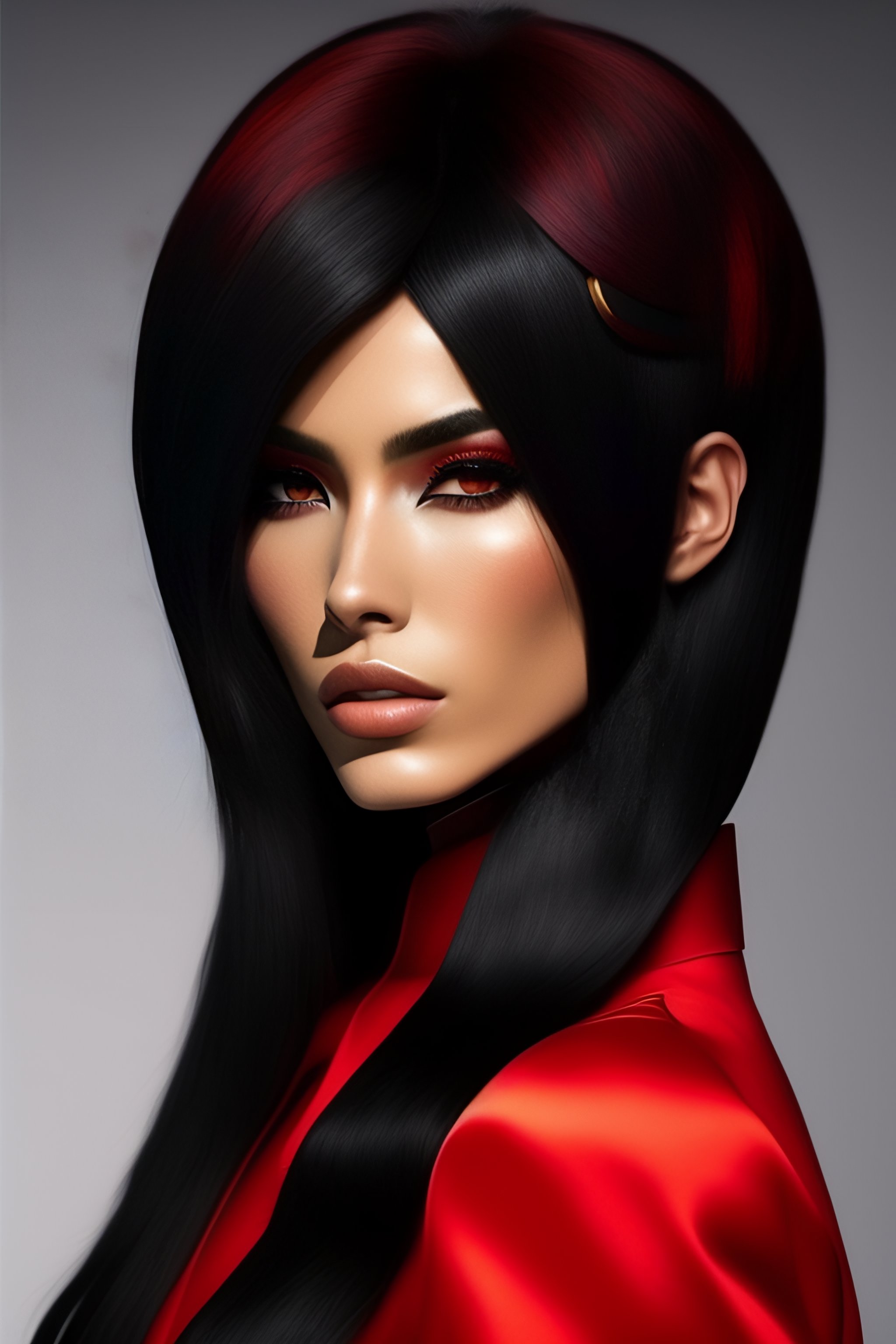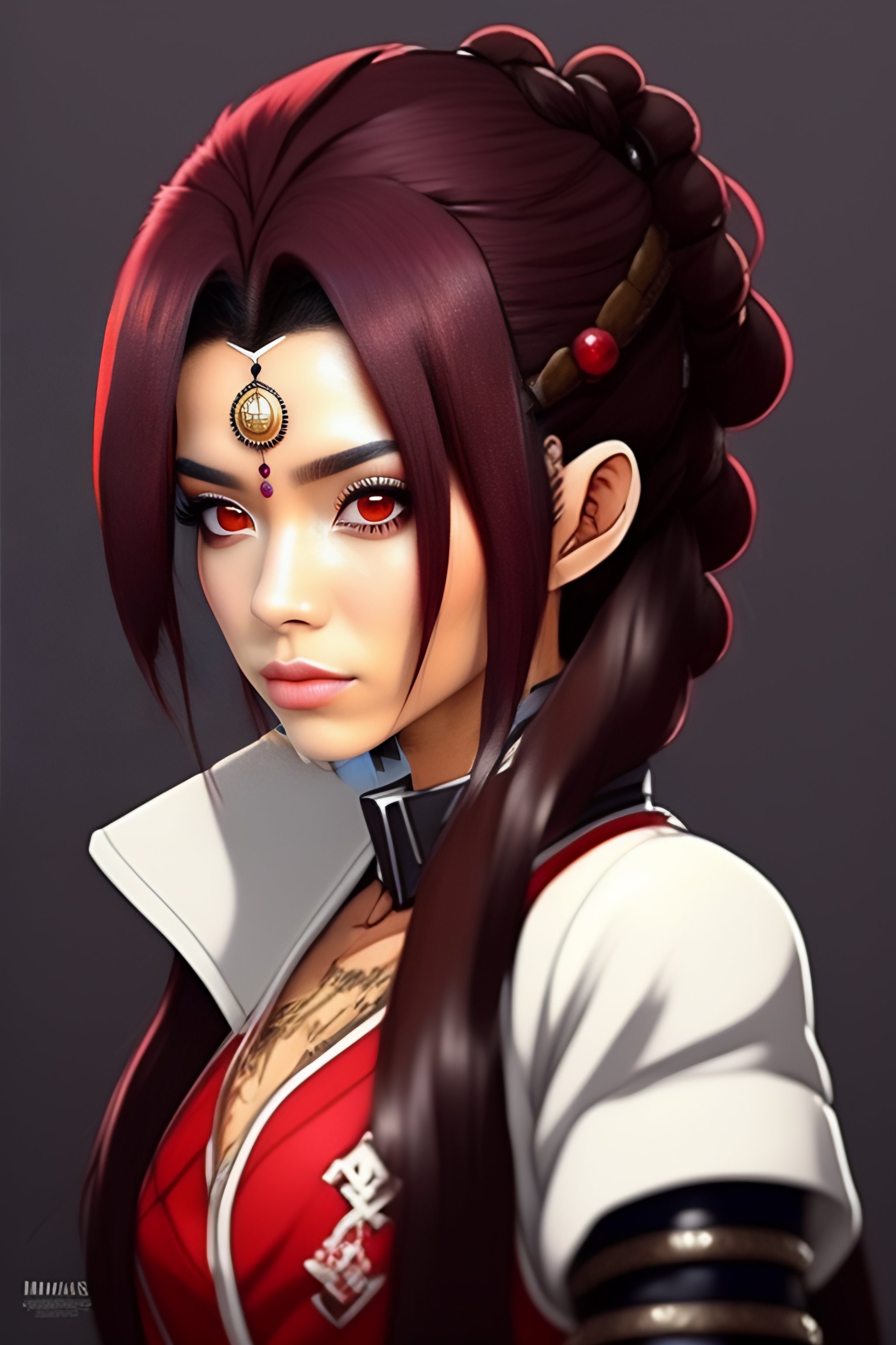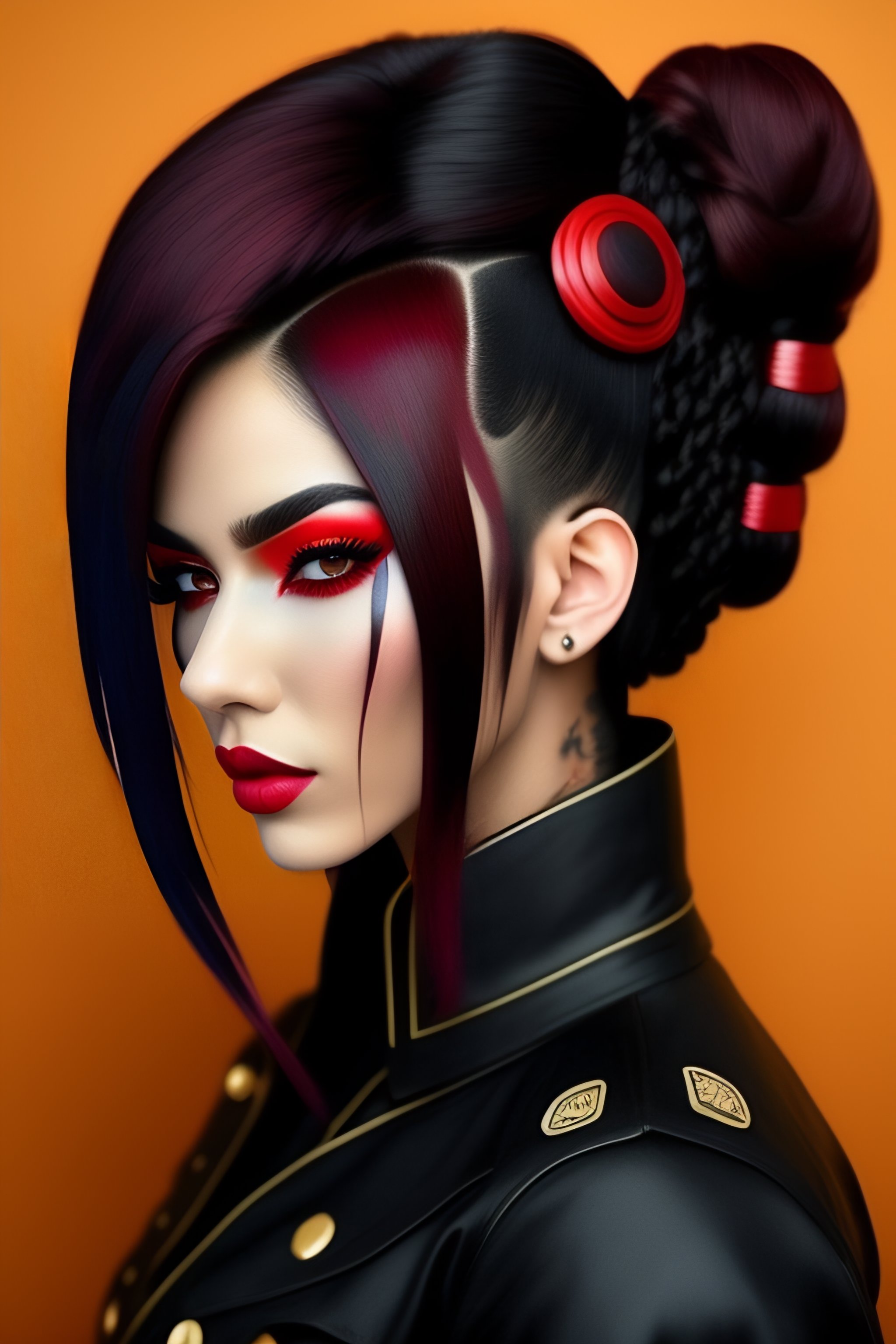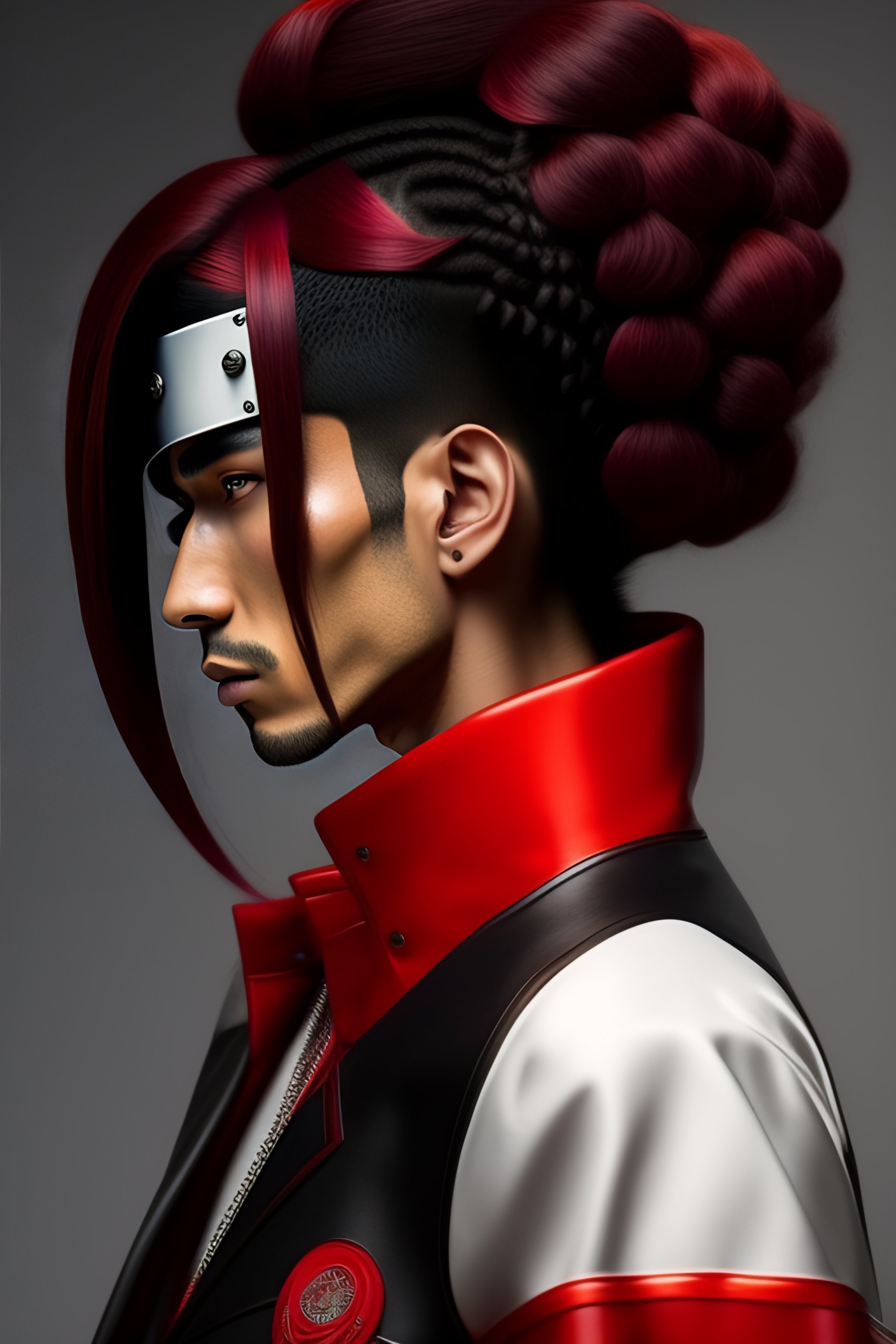 Hombre de cabello negro con mechas rojas y una pequeña trenza morada cerca de una oreja, pantalones y botas militares negras, camisa blanca con corbata roja, chaqueta americana negra, portando una gran guadaña, mascara que le tapa la boca con patrones como de runas nórdicas, pelo largo al estilo de madera uchiha de naruto, un mechón de pelo tapando un ojo, ojos rojos, complexión atlética