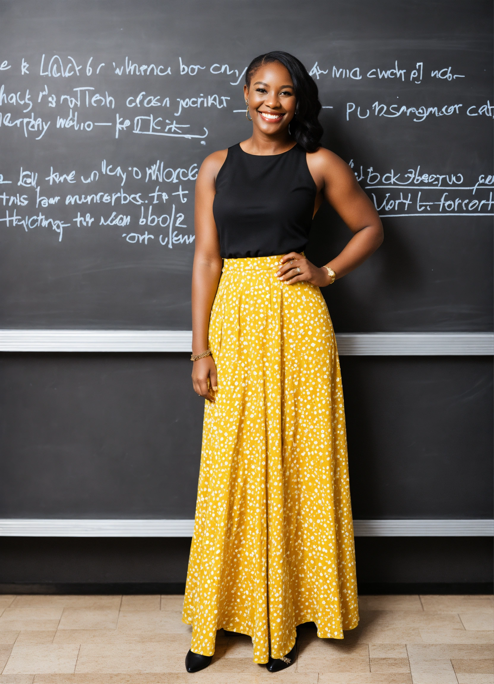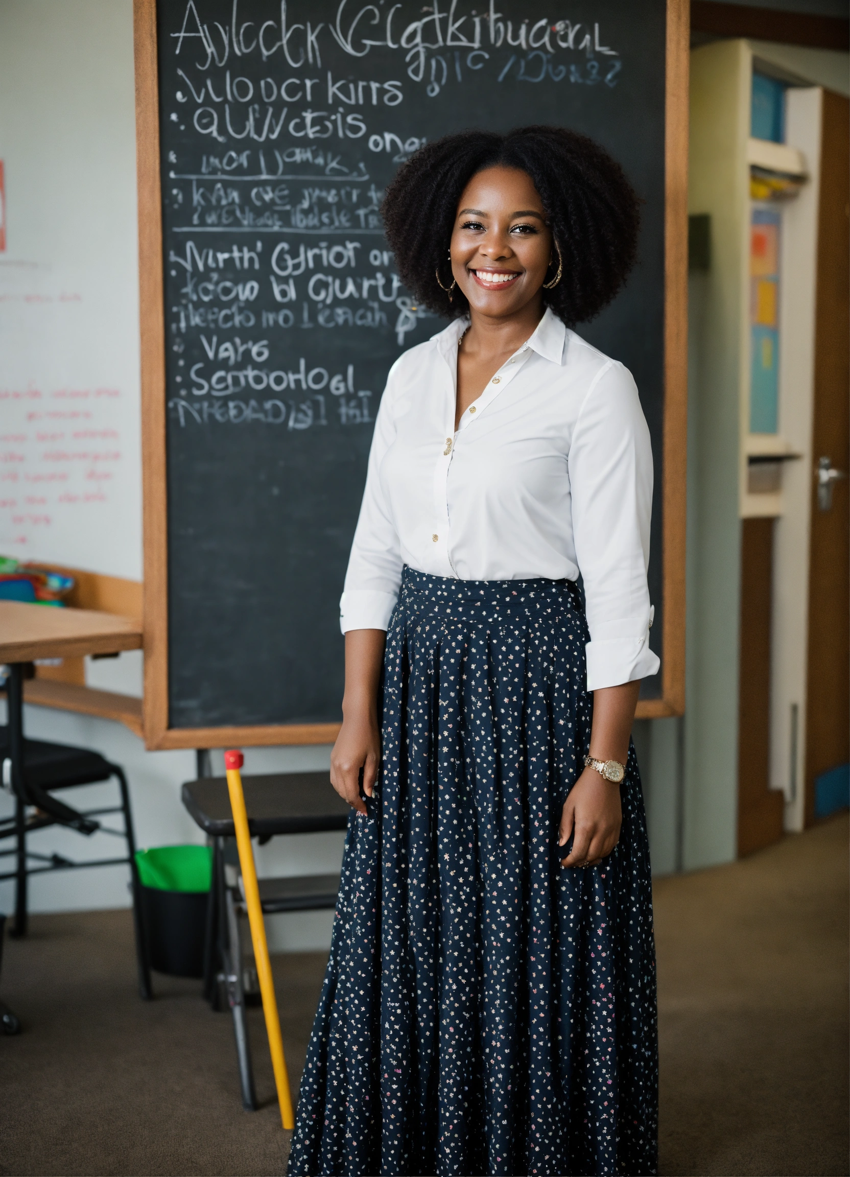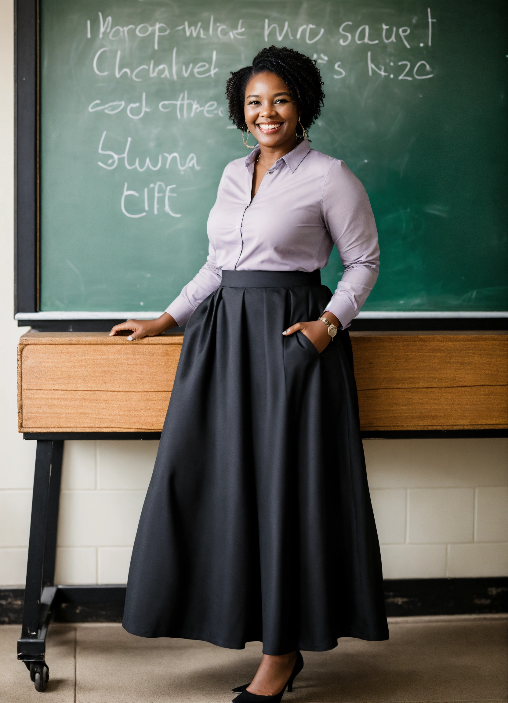 Black teacher smiling next to black board wearing floor length skirt with one