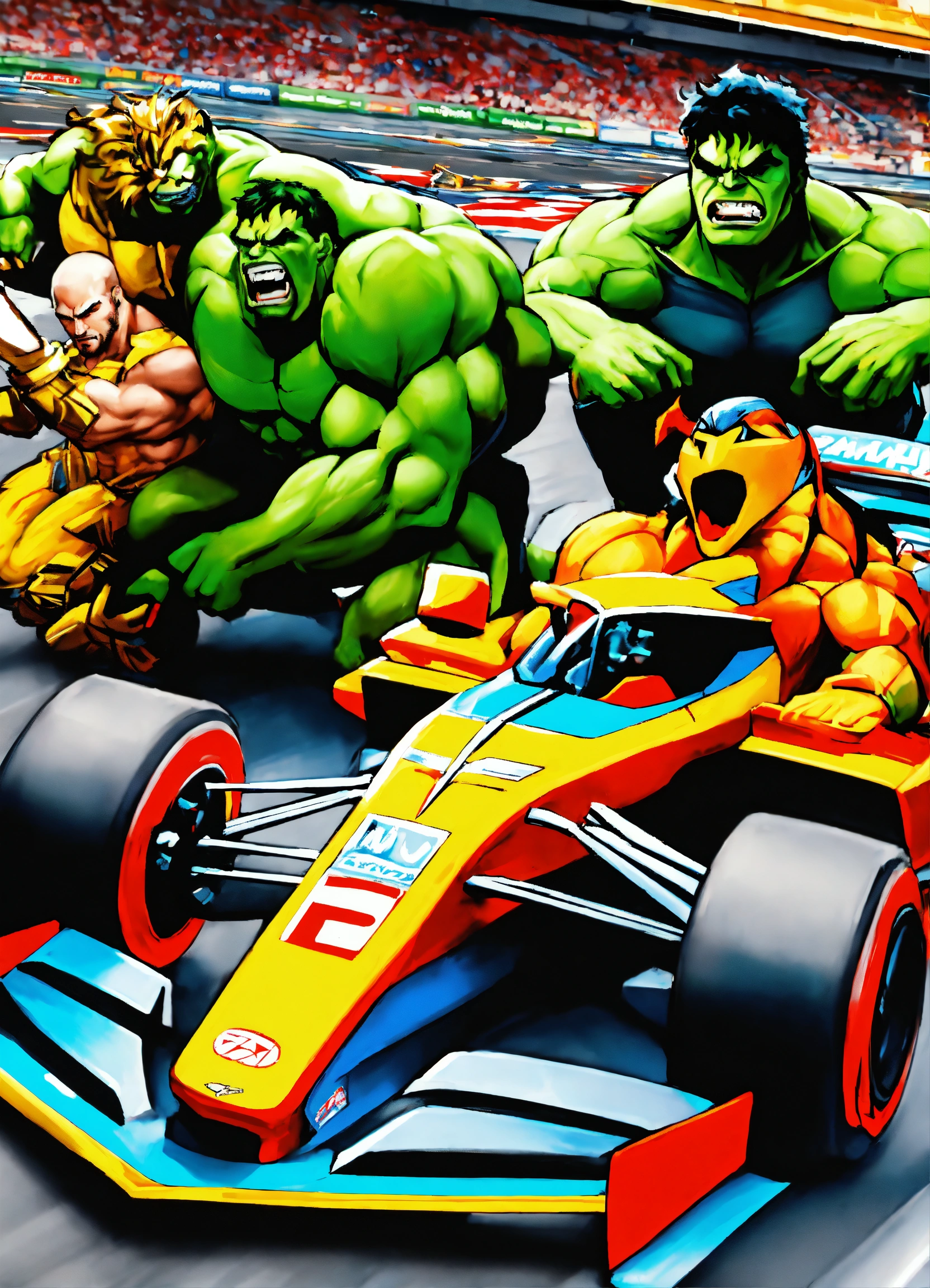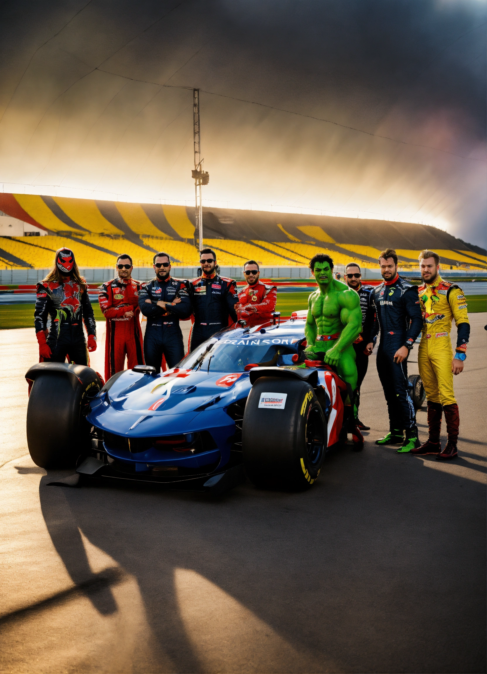 Homem aranha, hulk, super homem, pantera negra, e thor, posando para foto em volta de um carro de corrida, em uma pista de formula 1