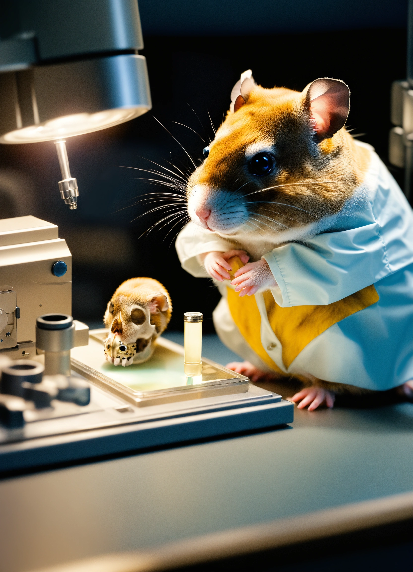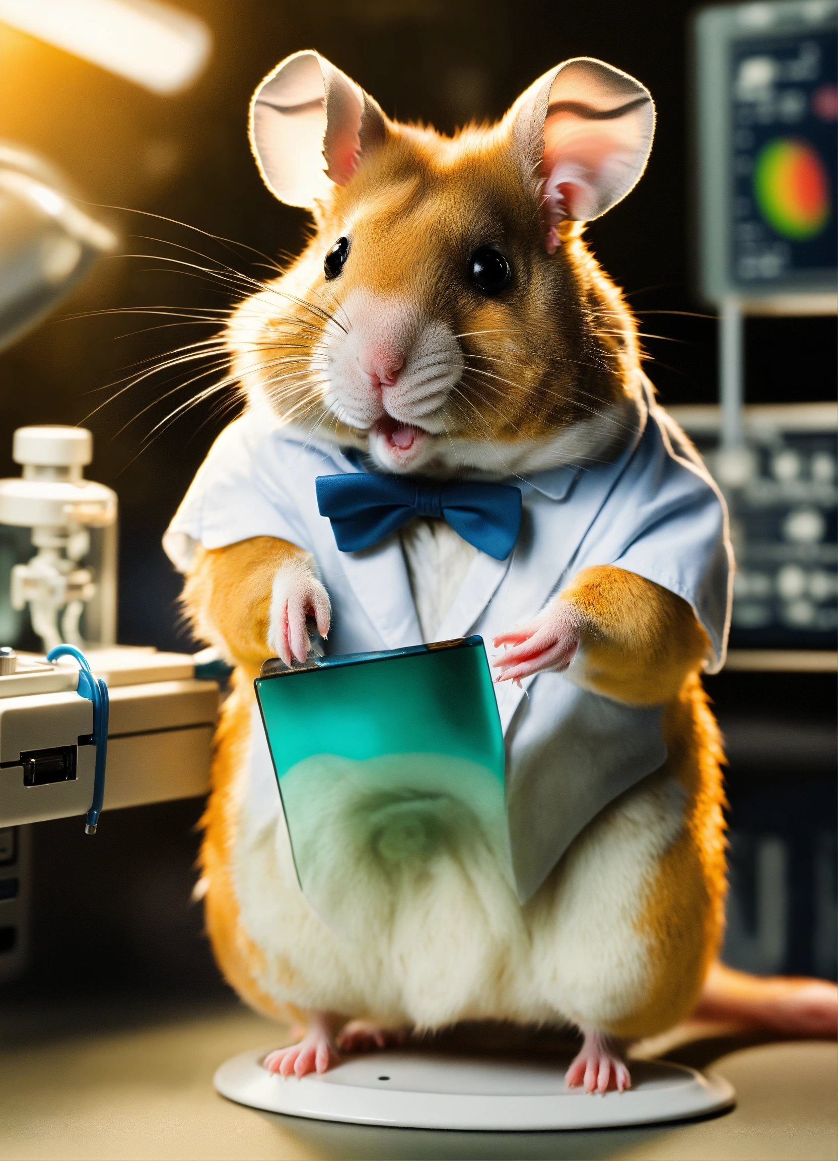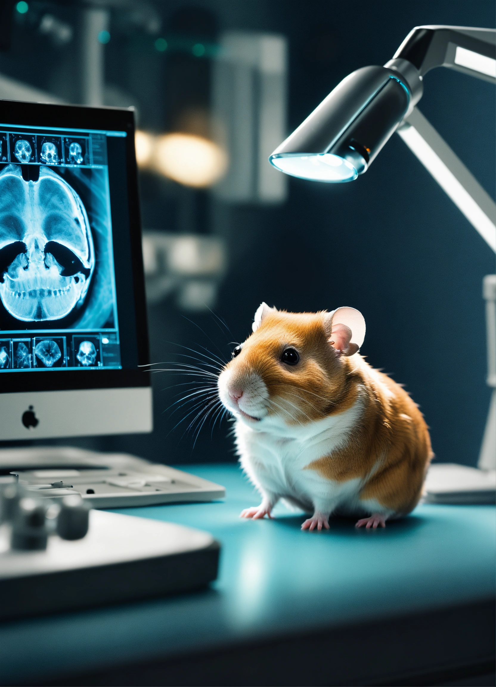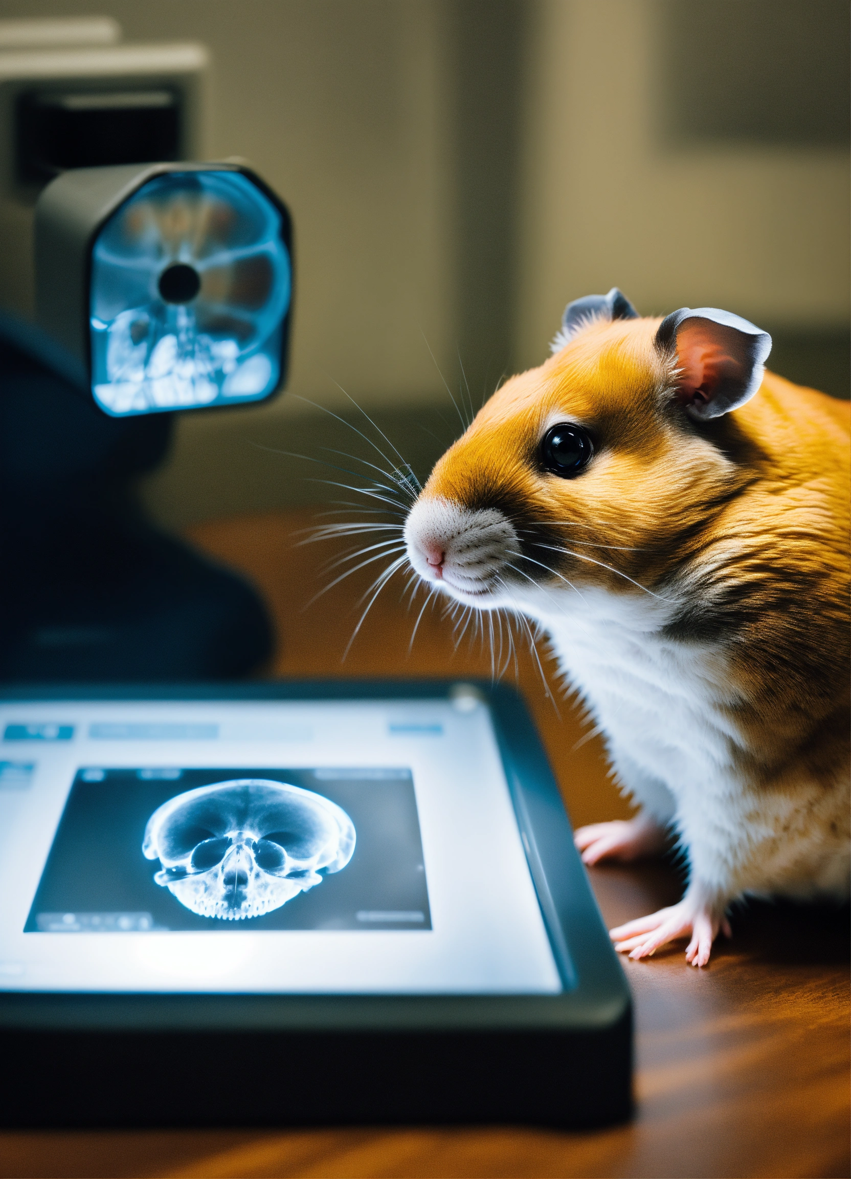 A photo-realistic hamster with a monocle working as a radiologist at a radiology workstation looking at a lateral skull x-ray